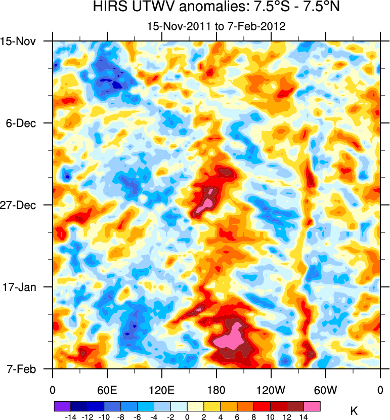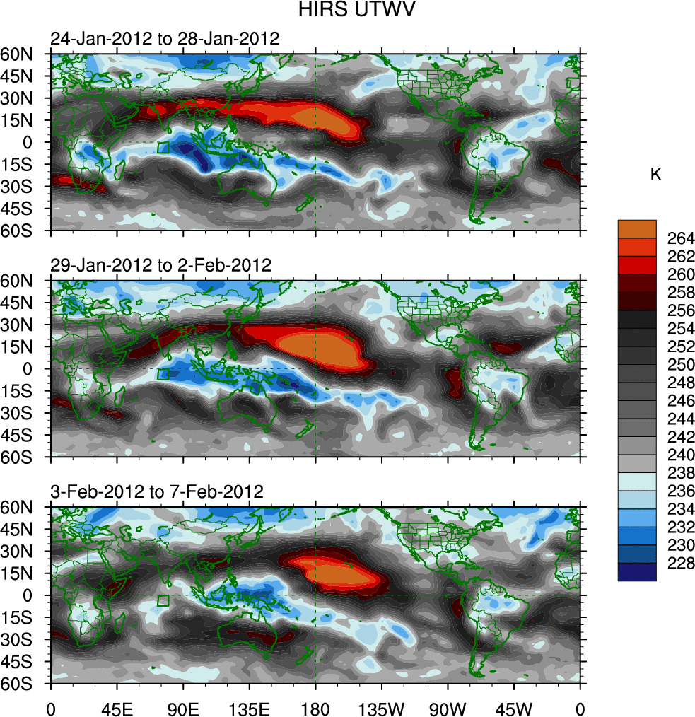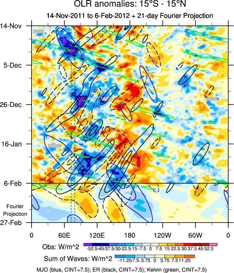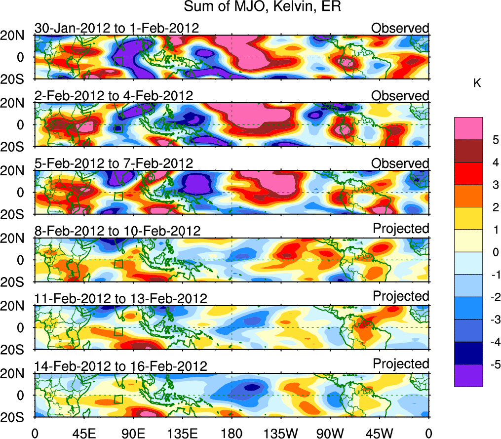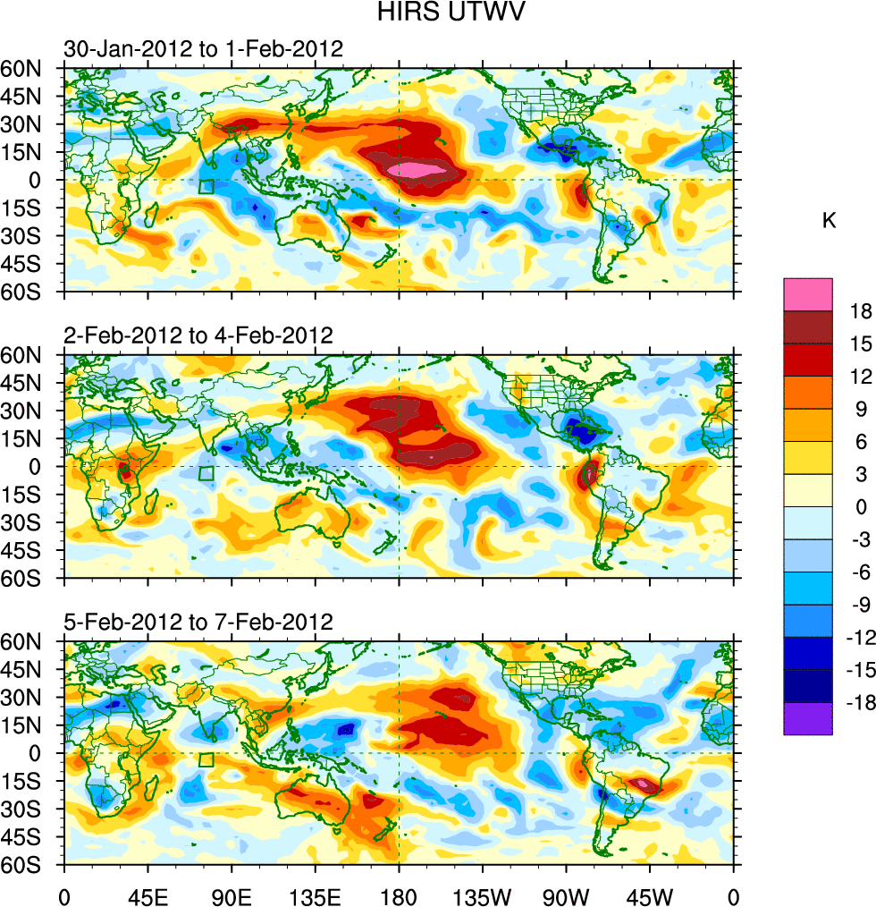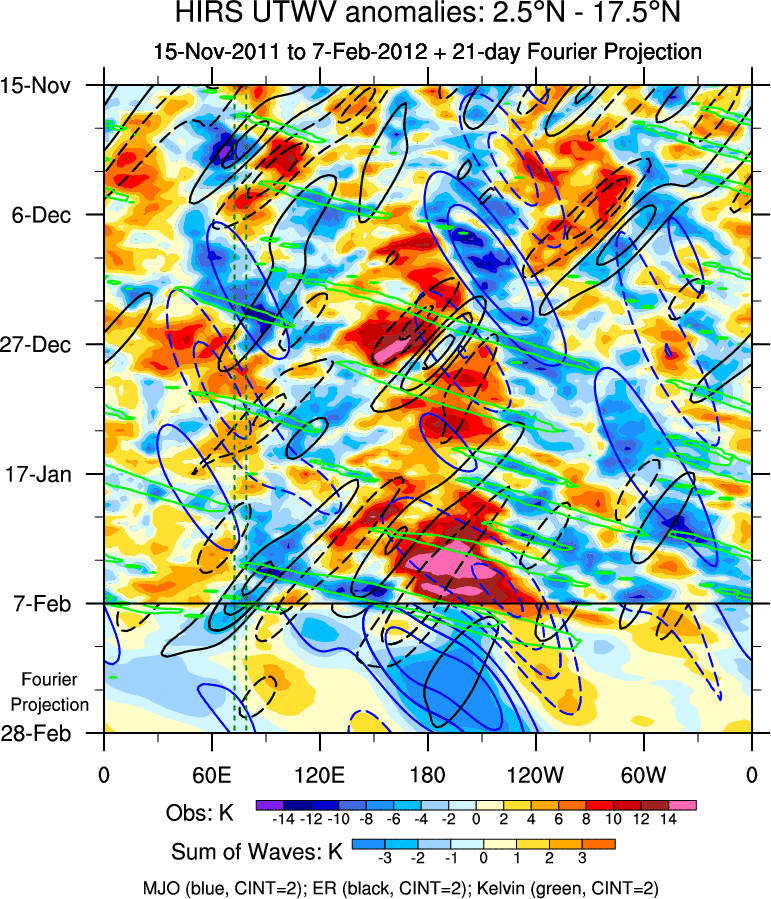 To identify tropical waves in near real-time, the OLR and UTWV data are filtered following Wheeler & Weickmann (2001 MWR). The daily anomalies are calculated using the first 3 harmonics of the seasonal cycle for 1979–2009. Missing values are then filled using linear interpolation in space and time. The most recent 365 days of anomalies are padded with 659 days of zeroes, and the result is filtered for each wave type.