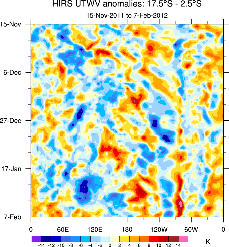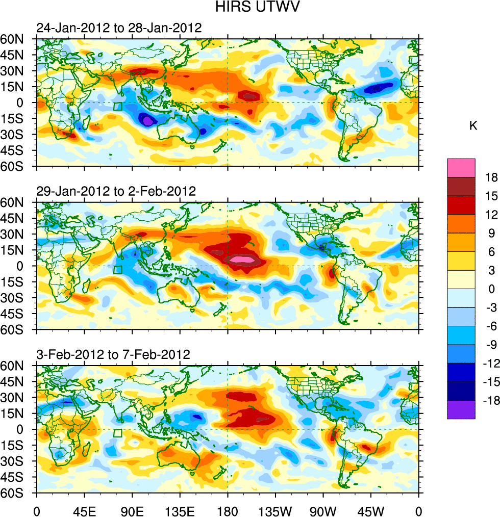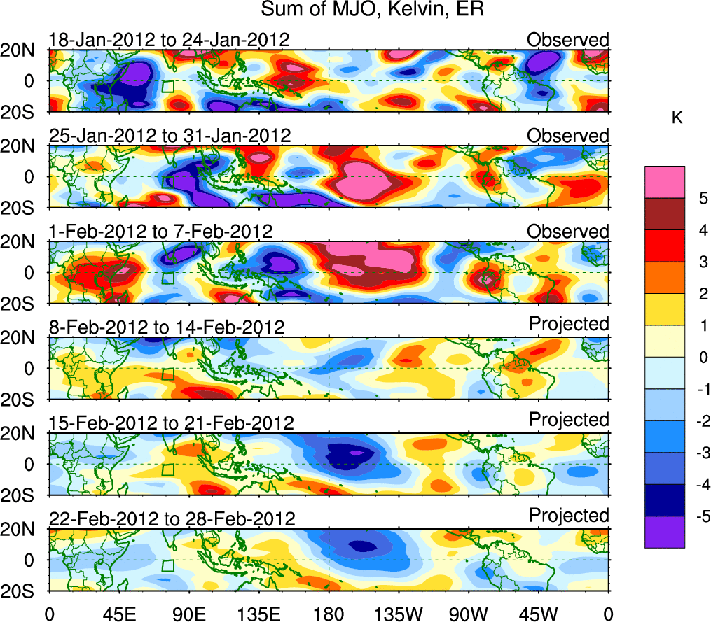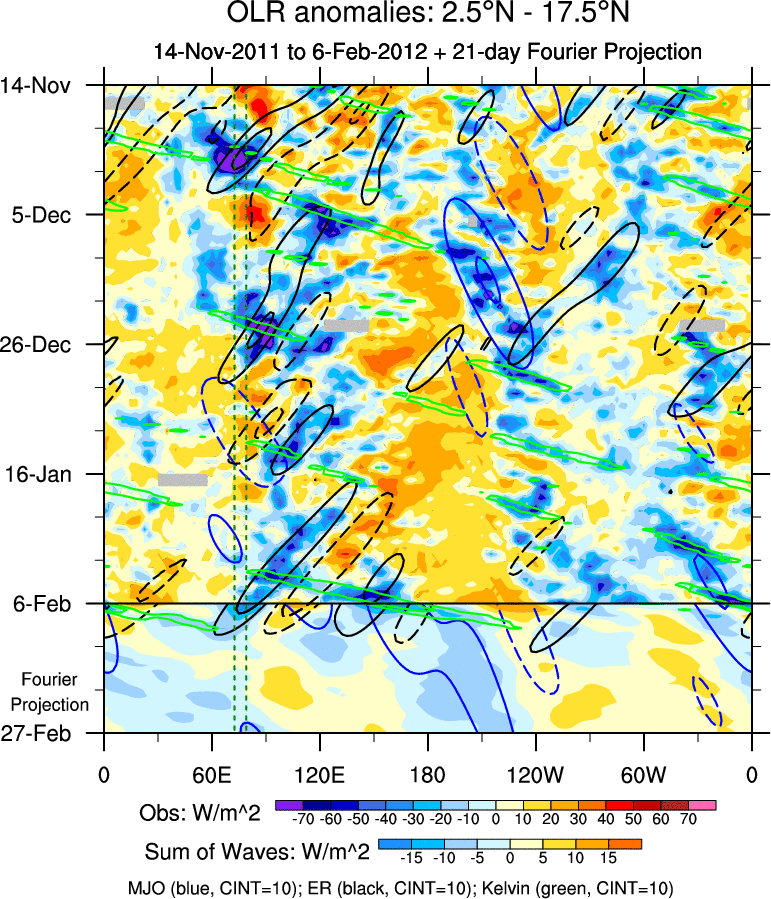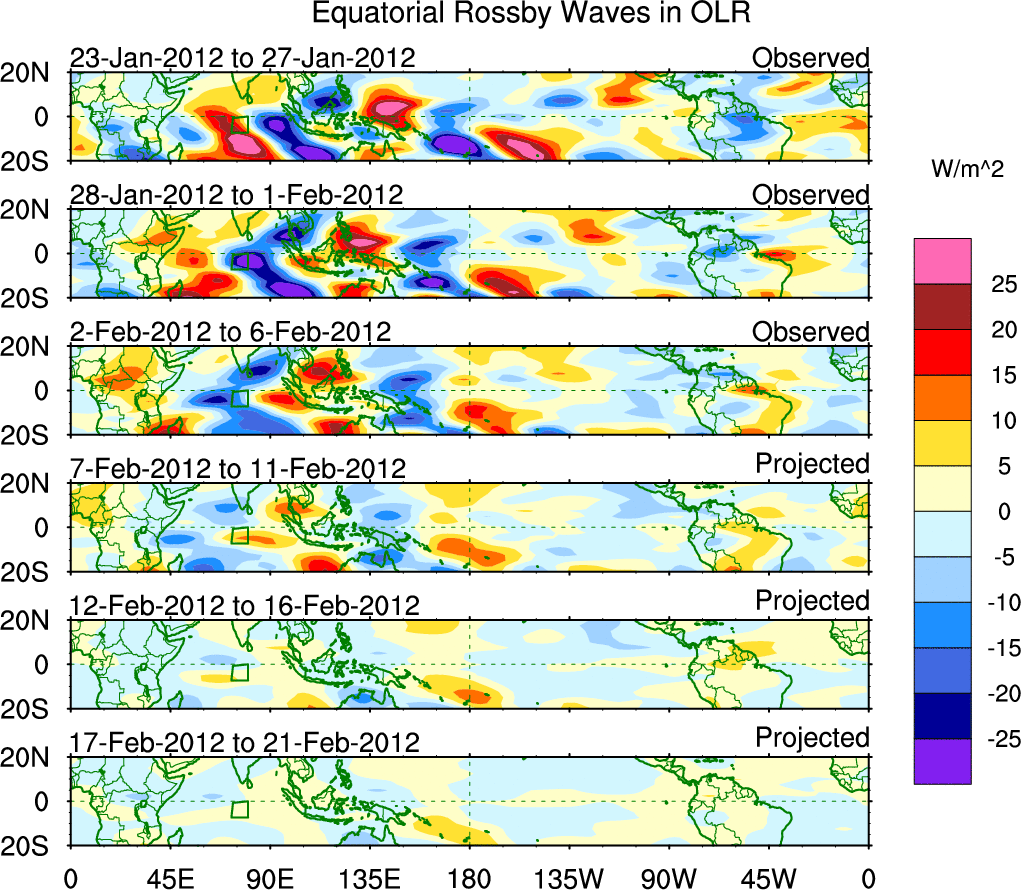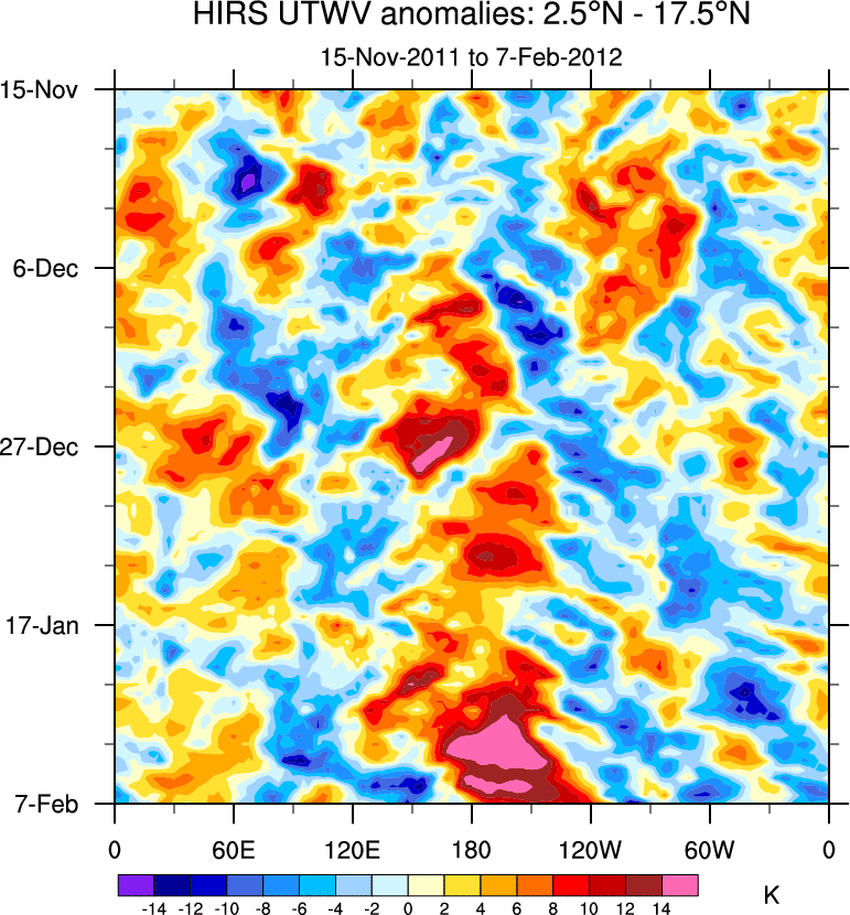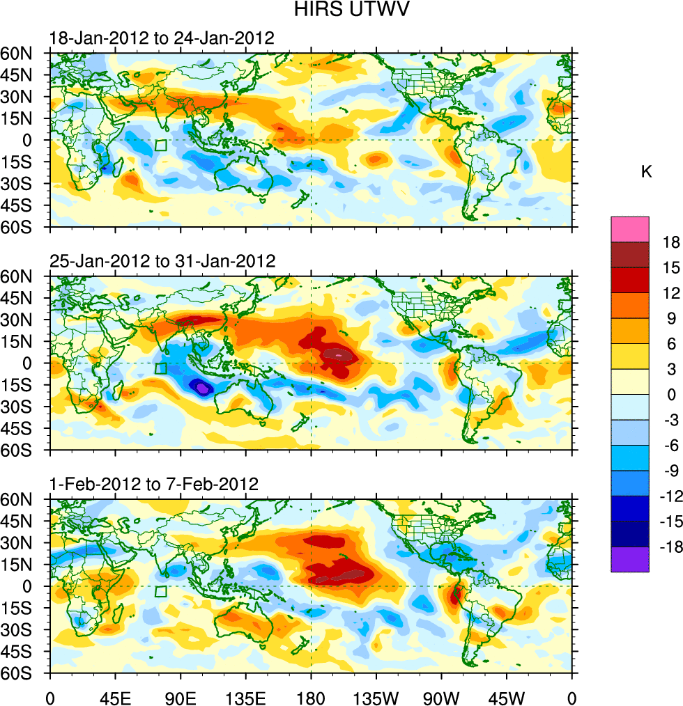 To identify tropical waves in near real-time, the OLR and UTWV data are filtered following Wheeler & Weickmann (2001 MWR). The daily anomalies are calculated using the first 3 harmonics of the seasonal cycle for 1979–2009. Missing values are then filled using linear interpolation in space and time. The most recent 365 days of anomalies are padded with 659 days of zeroes, and the result is filtered for each wave type.