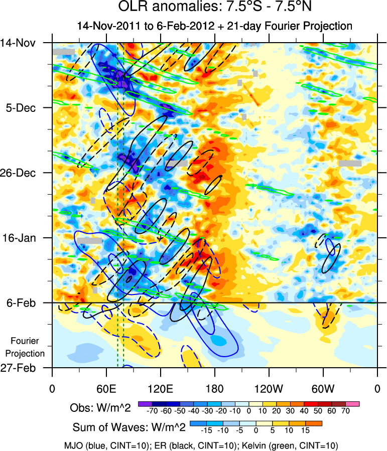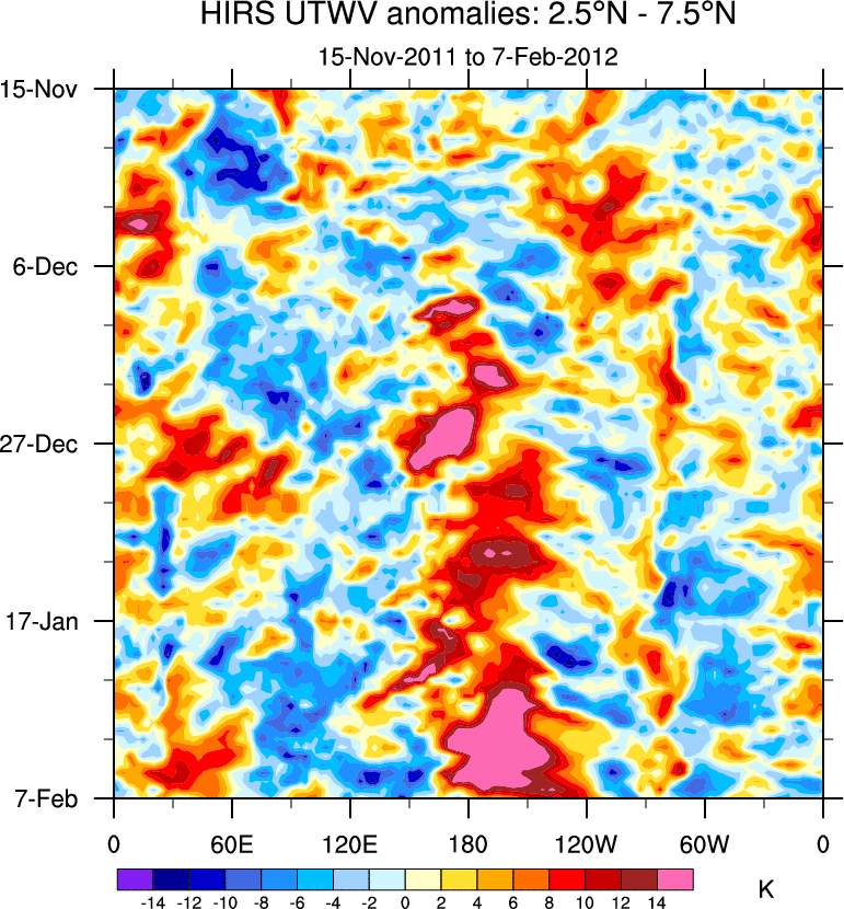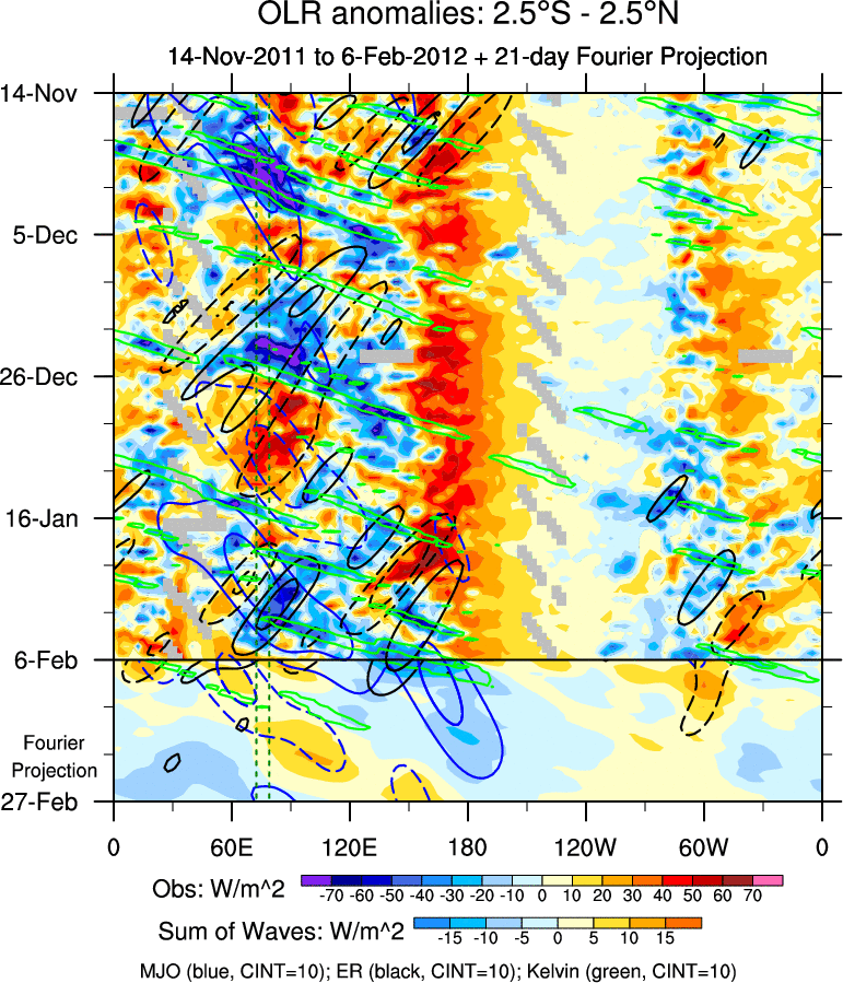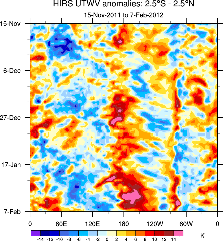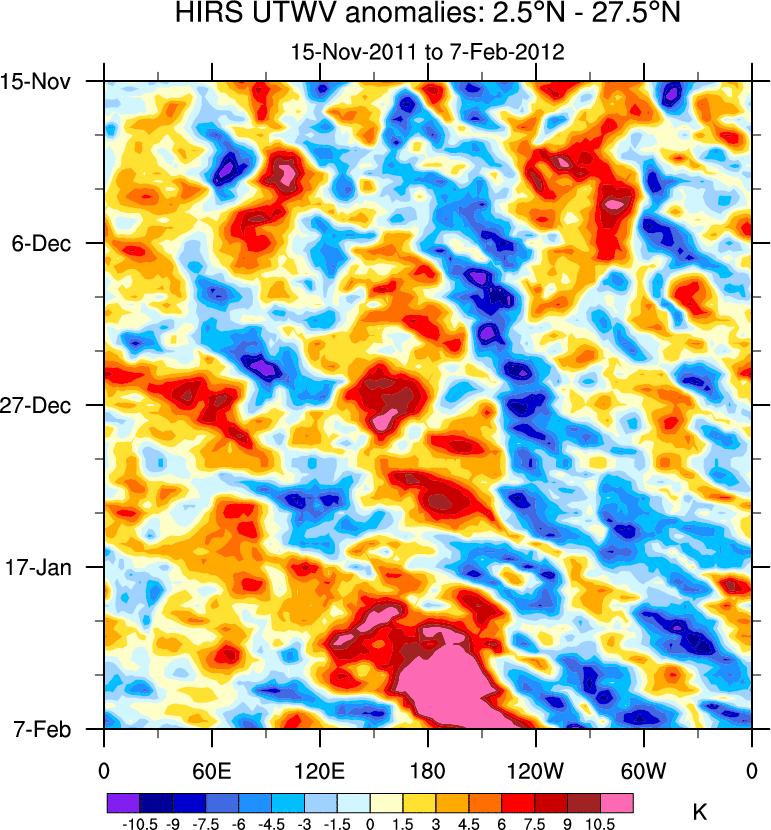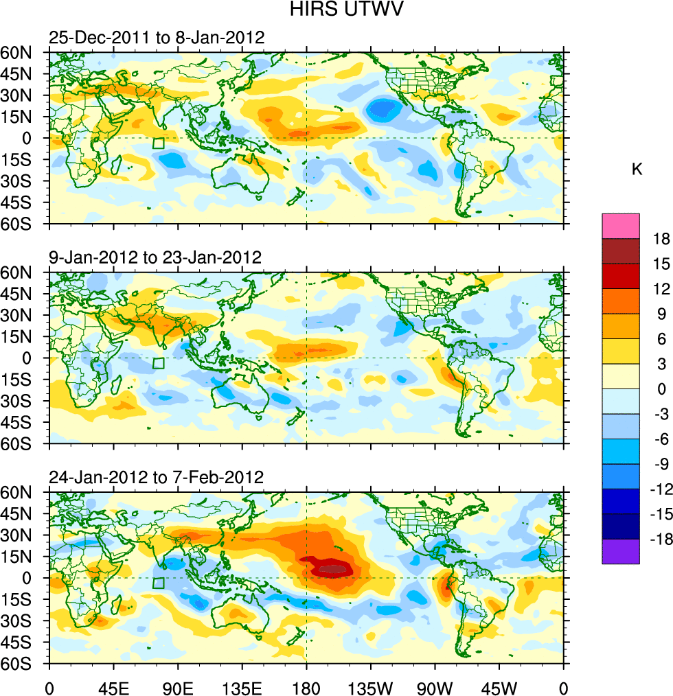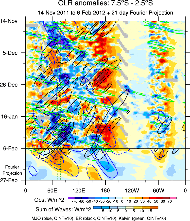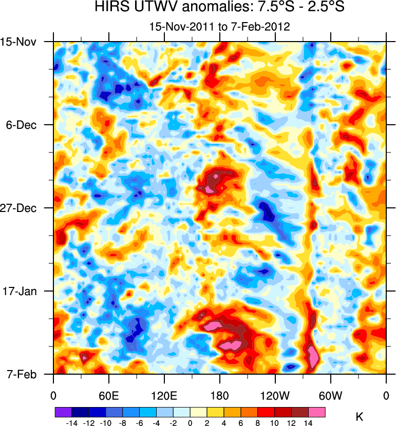 To identify tropical waves in near real-time, the OLR and UTWV data are filtered following Wheeler & Weickmann (2001 MWR). The daily anomalies are calculated using the first 3 harmonics of the seasonal cycle for 1979–2009. Missing values are then filled using linear interpolation in space and time. The most recent 365 days of anomalies are padded with 659 days of zeroes, and the result is filtered for each wave type.