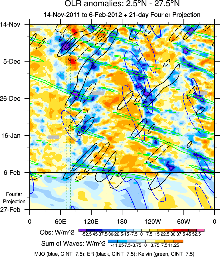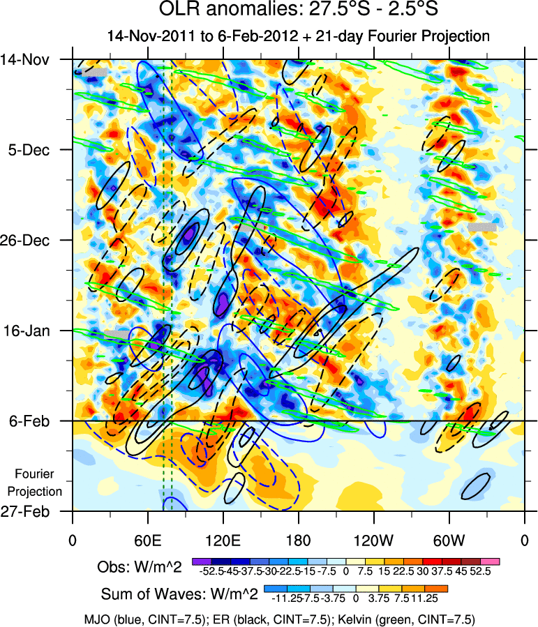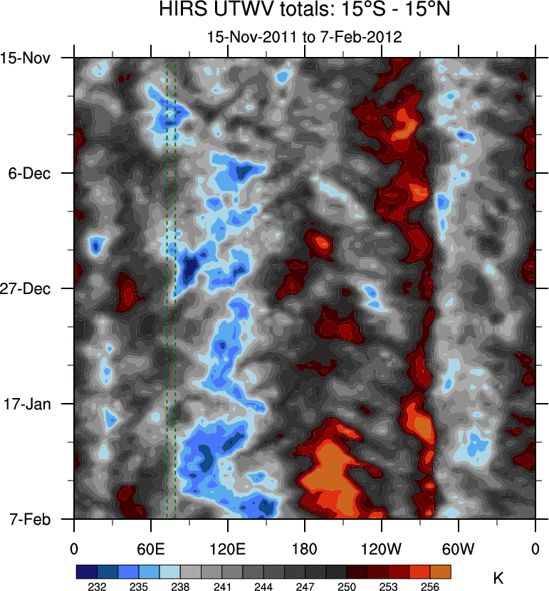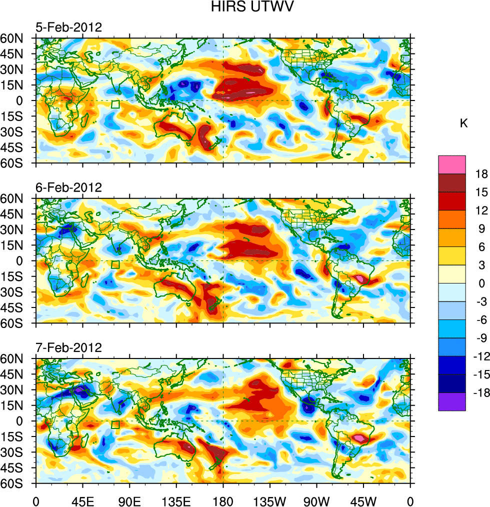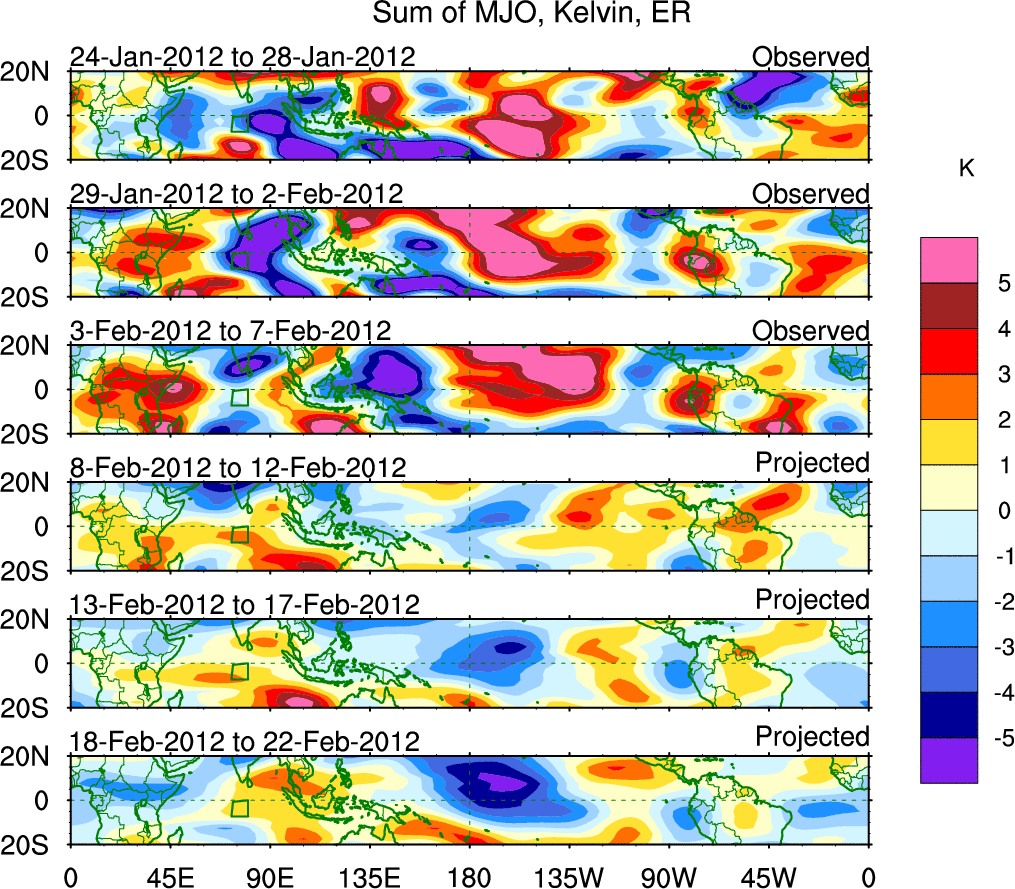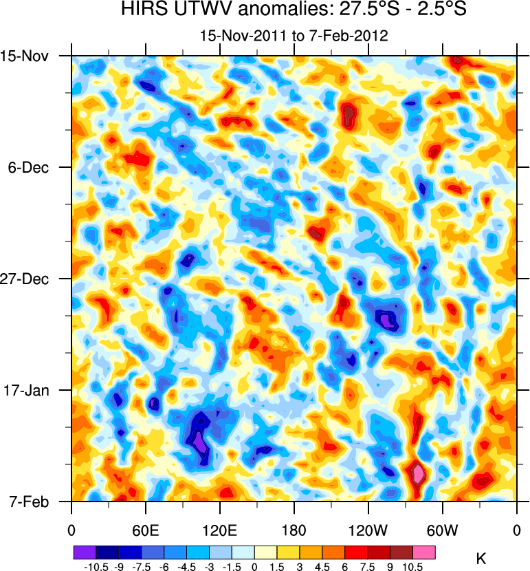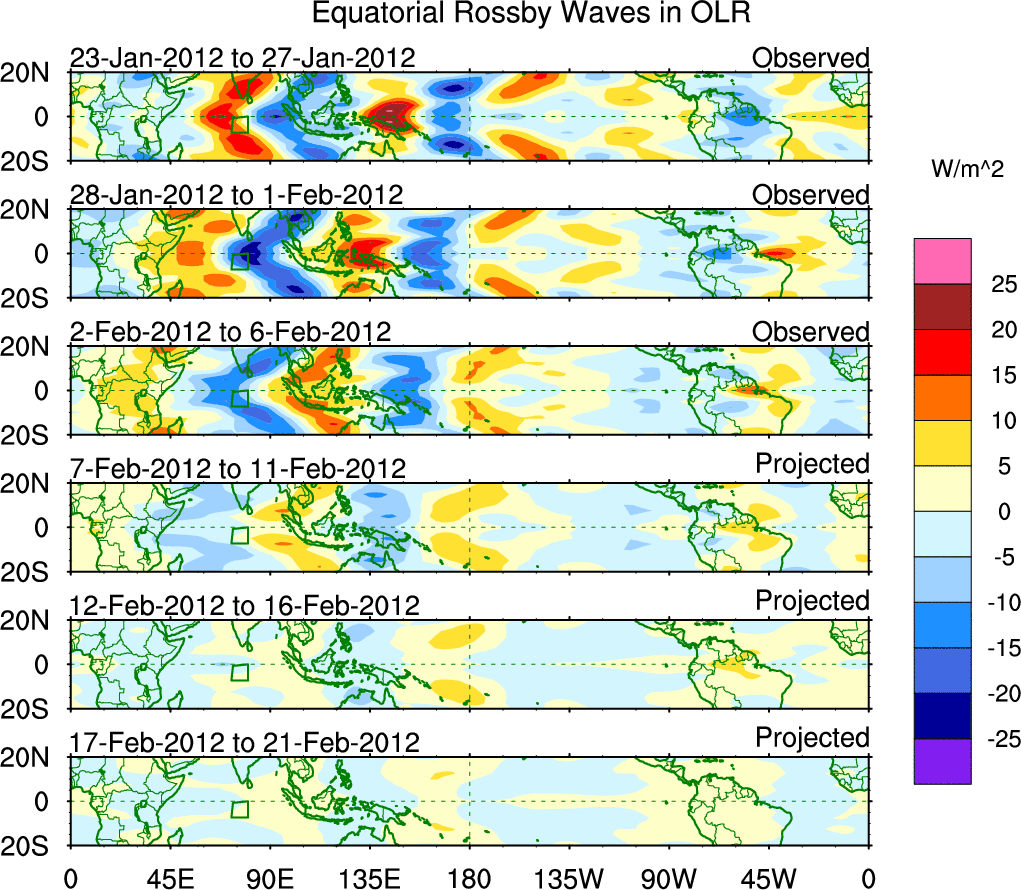 To identify tropical waves in near real-time, the OLR and UTWV data are filtered following Wheeler & Weickmann (2001 MWR). The daily anomalies are calculated using the first 3 harmonics of the seasonal cycle for 1979–2009. Missing values are then filled using linear interpolation in space and time. The most recent 365 days of anomalies are padded with 659 days of zeroes, and the result is filtered for each wave type.