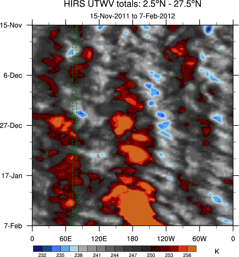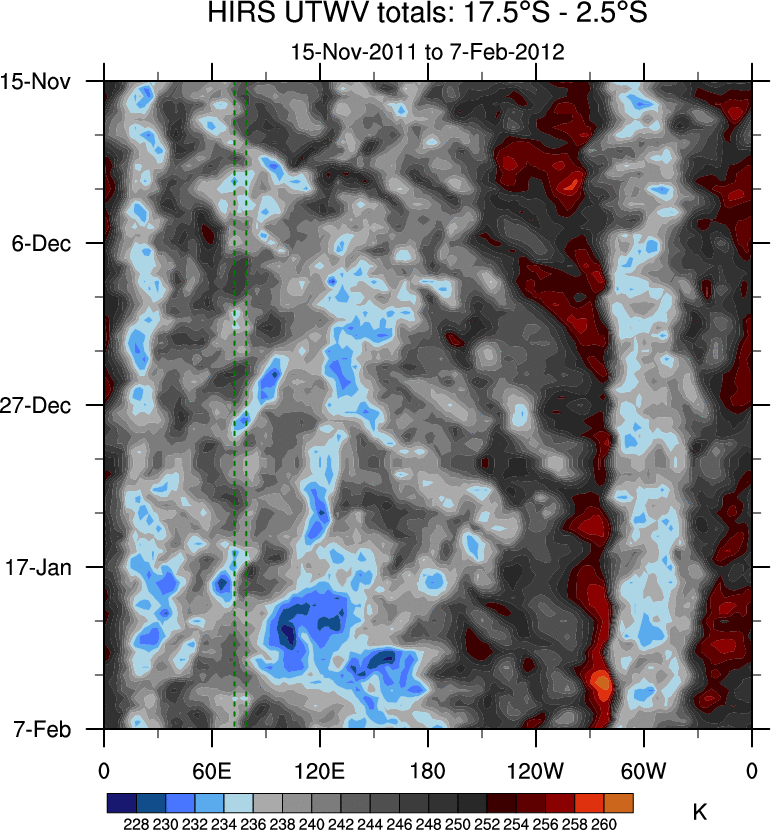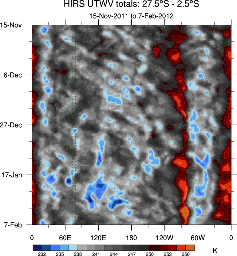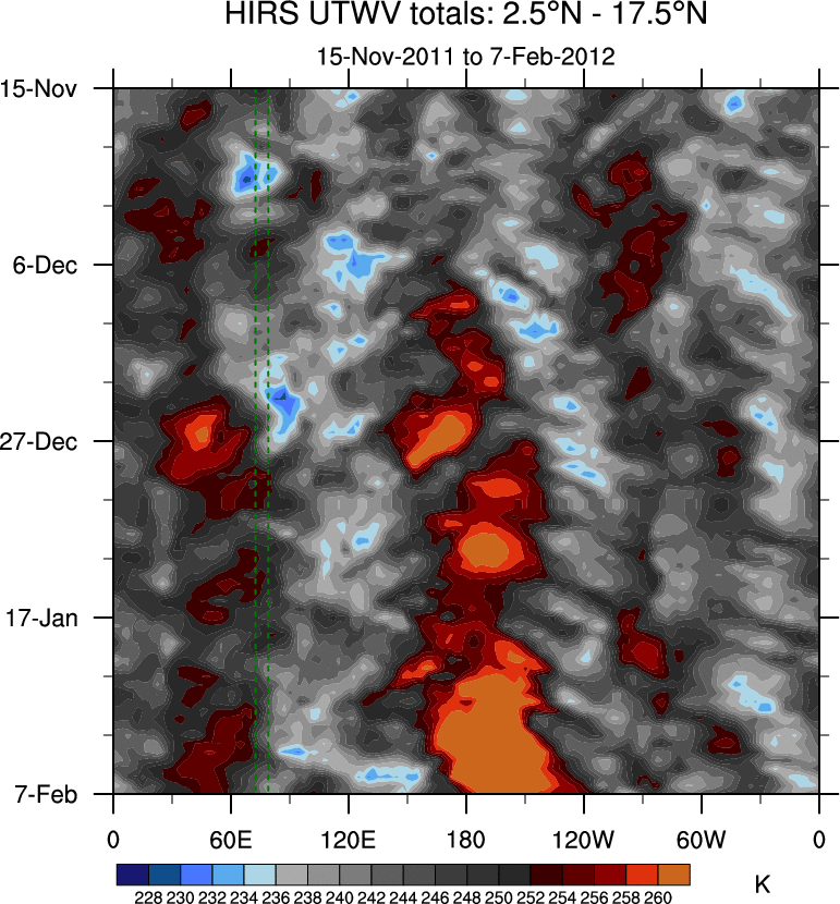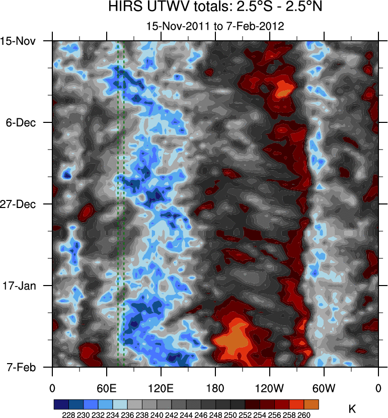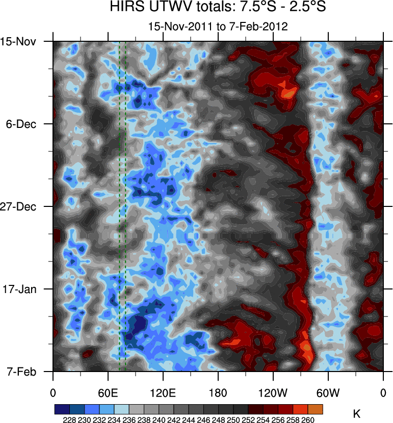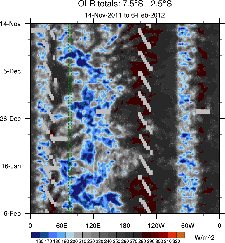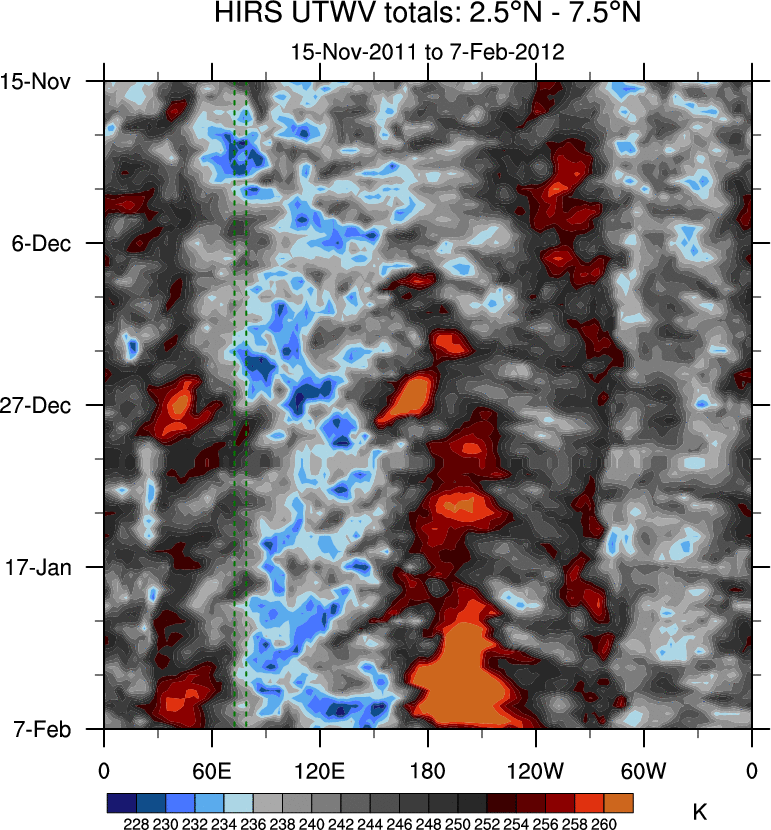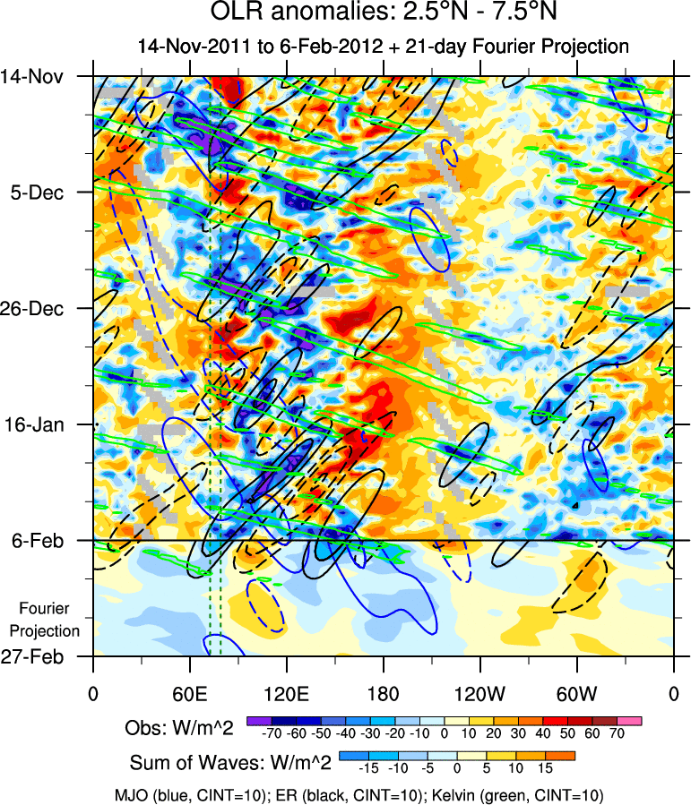 To identify tropical waves in near real-time, the OLR and UTWV data are filtered following Wheeler & Weickmann (2001 MWR). The daily anomalies are calculated using the first 3 harmonics of the seasonal cycle for 1979–2009. Missing values are then filled using linear interpolation in space and time. The most recent 365 days of anomalies are padded with 659 days of zeroes, and the result is filtered for each wave type.