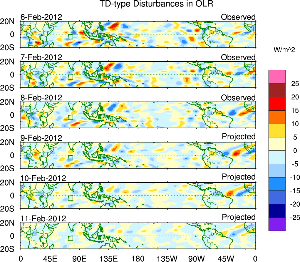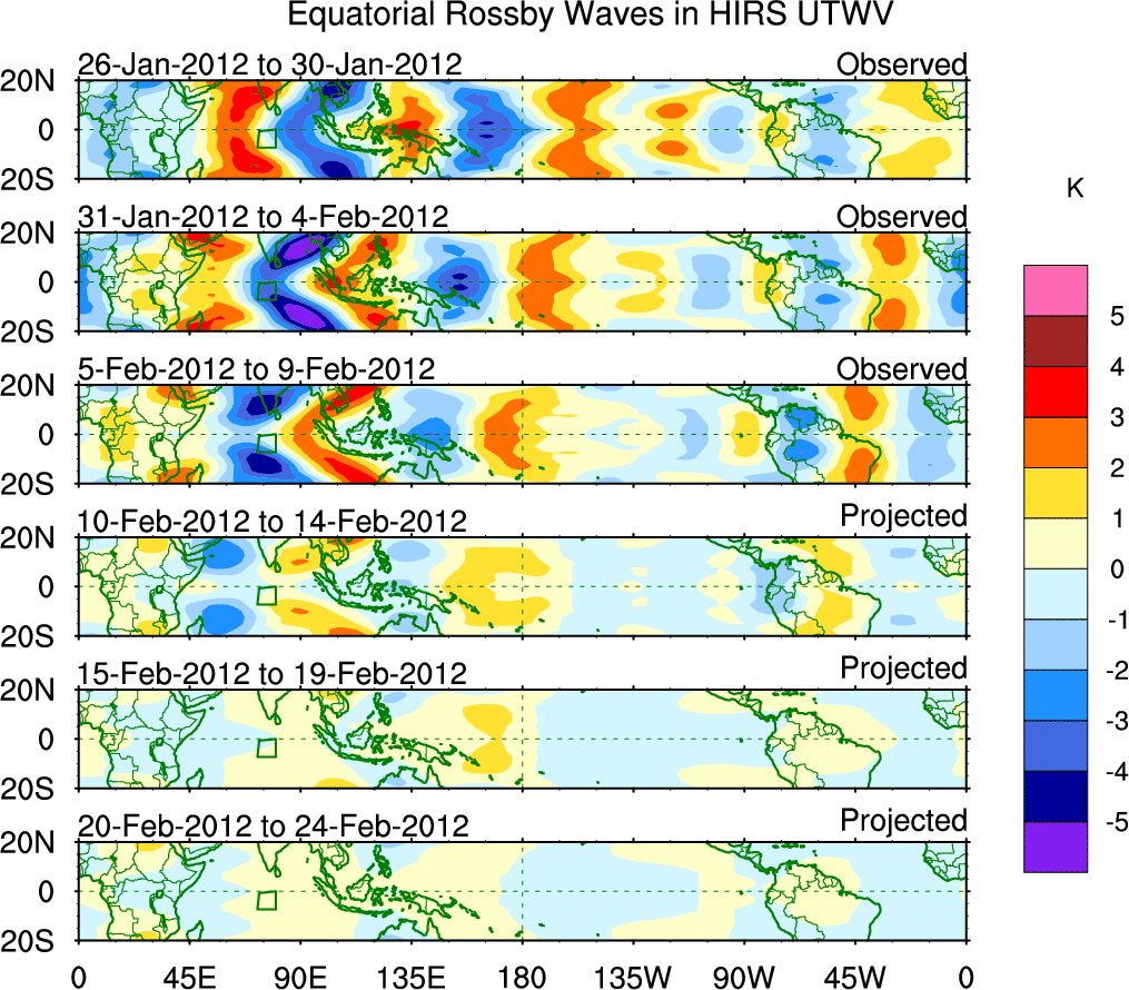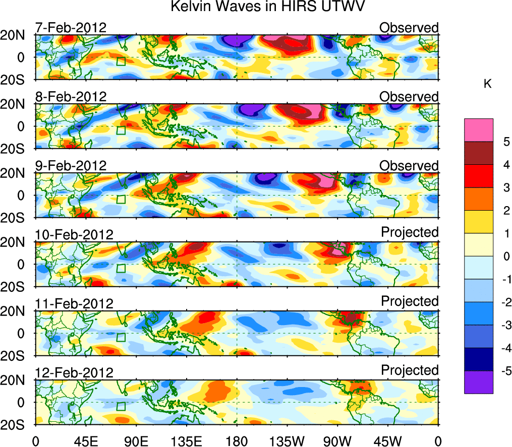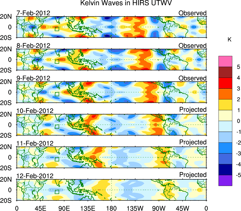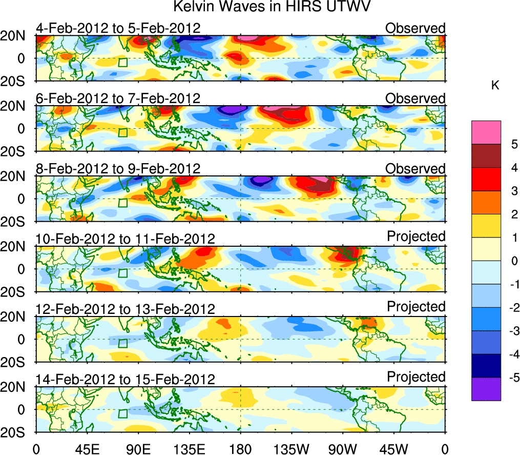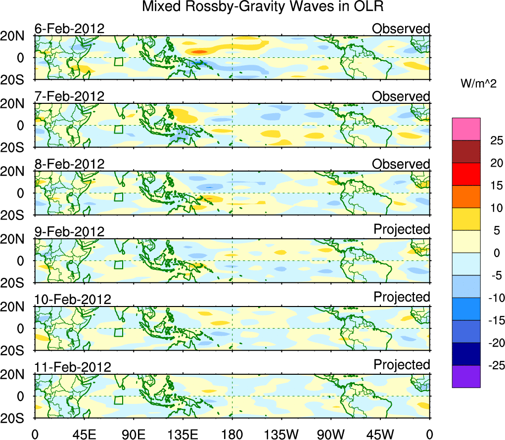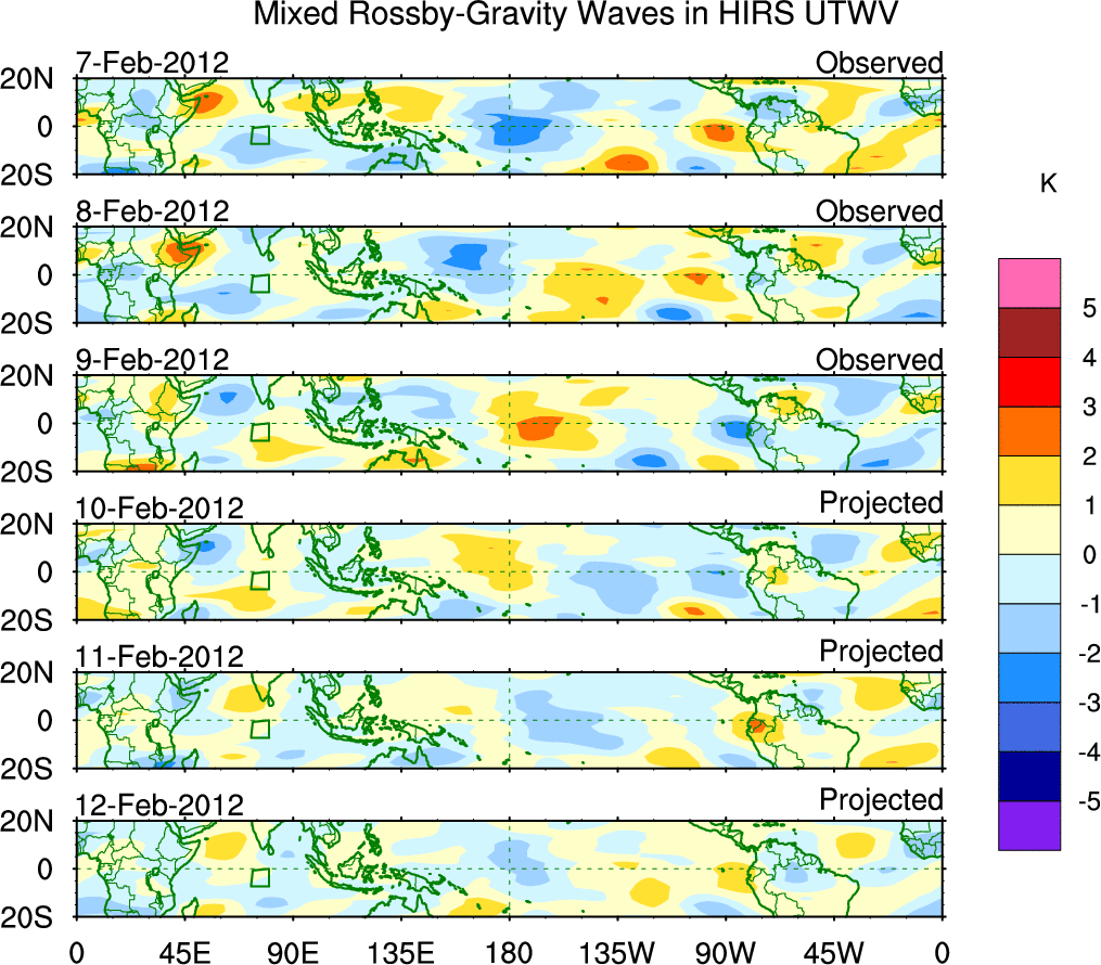 To identify tropical waves in near real-time, the OLR and UTWV data are filtered following Wheeler & Weickmann (2001 MWR). The daily anomalies are calculated using the first 3 harmonics of the seasonal cycle for 1979–2009. Missing values are then filled using linear interpolation in space and time. The most recent 365 days of anomalies are padded with 659 days of zeroes, and the result is filtered for each wave type.