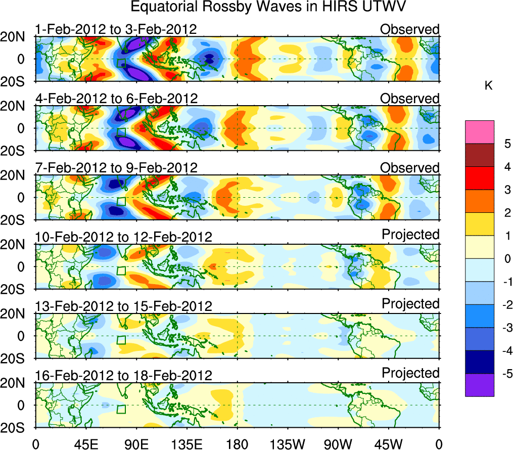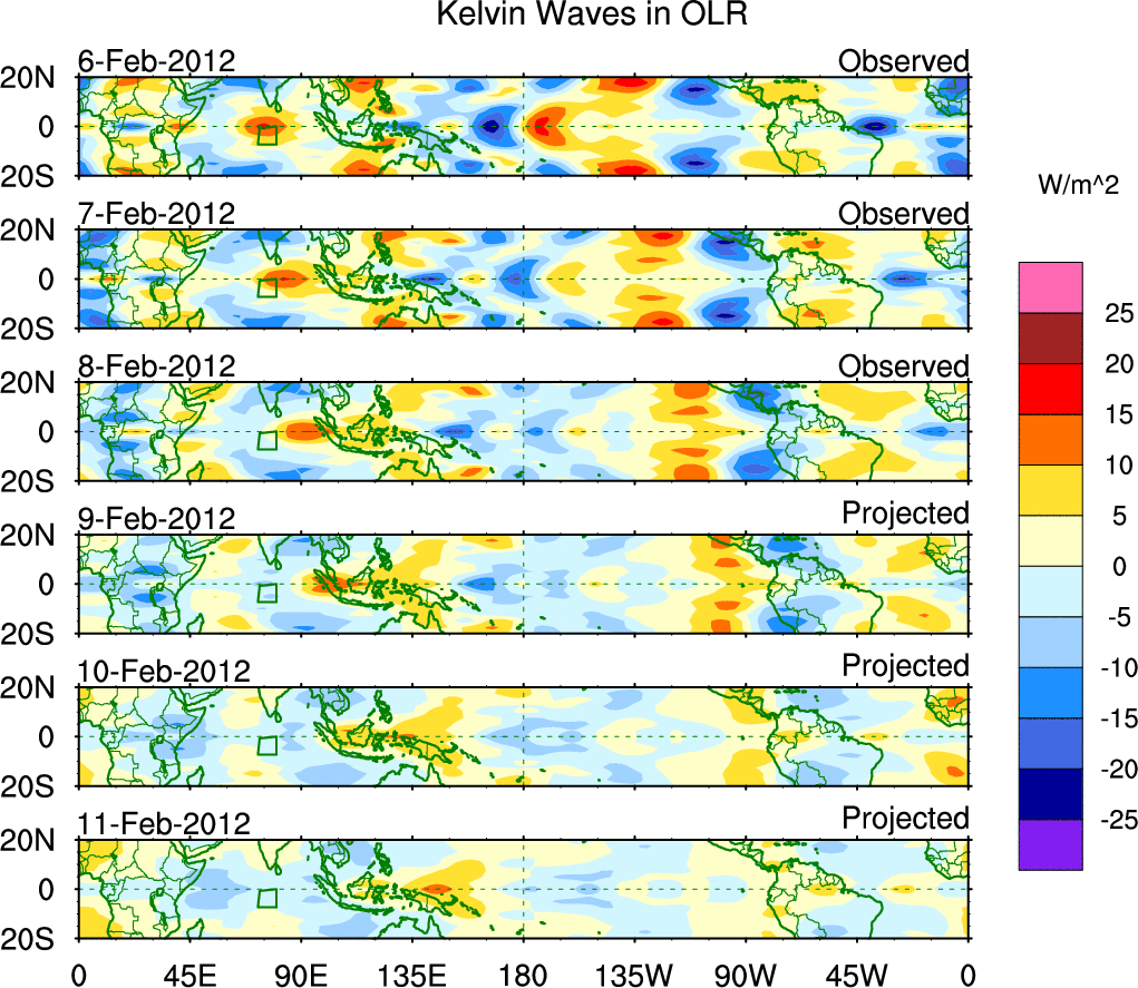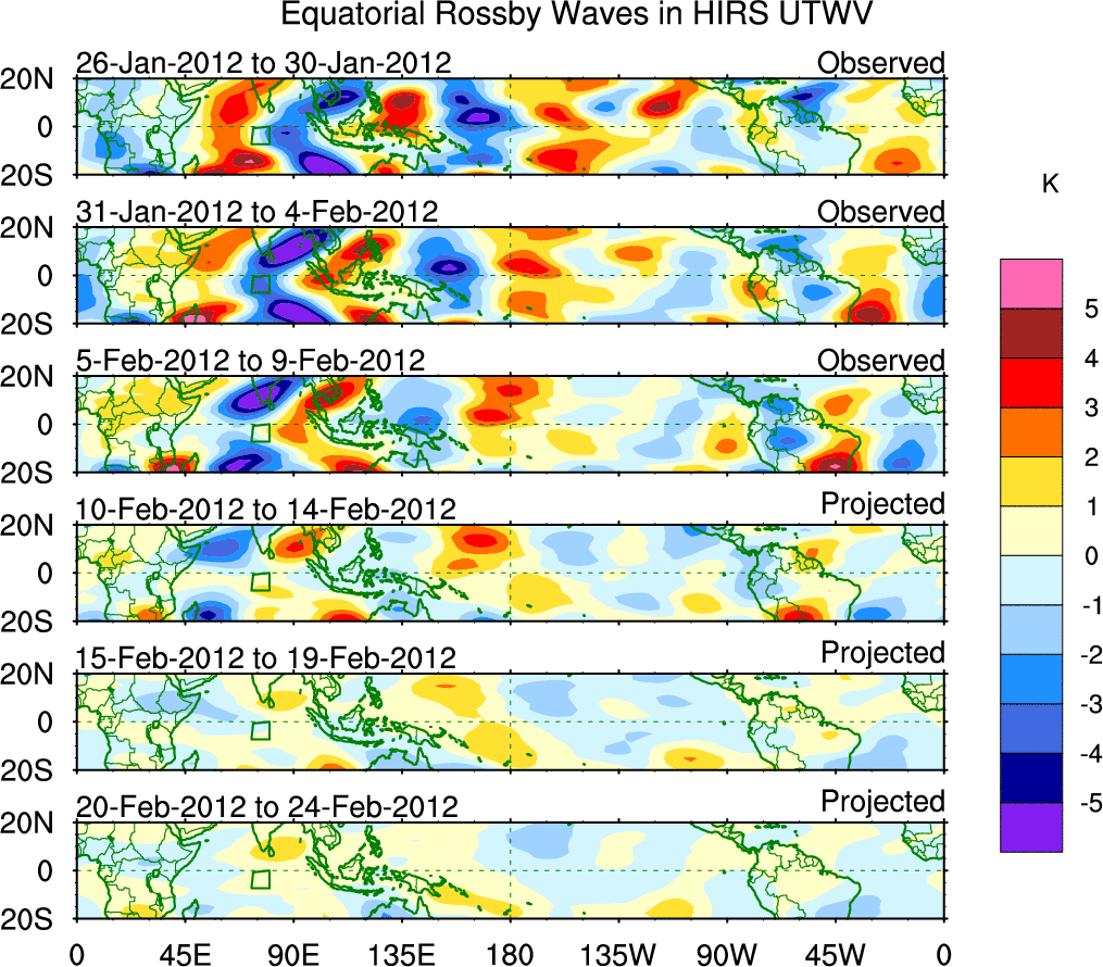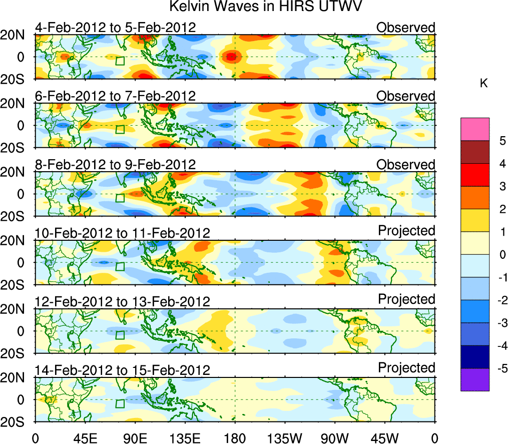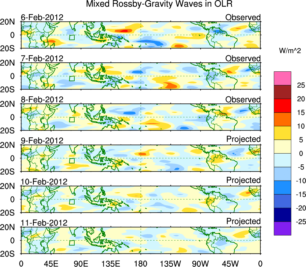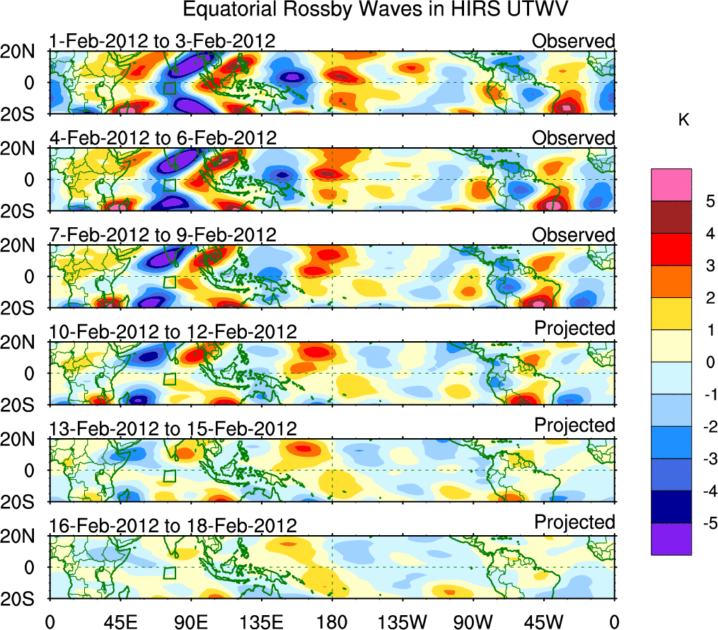 To identify tropical waves in near real-time, the OLR and UTWV data are filtered following Wheeler & Weickmann (2001 MWR). The daily anomalies are calculated using the first 3 harmonics of the seasonal cycle for 1979–2009. Missing values are then filled using linear interpolation in space and time. The most recent 365 days of anomalies are padded with 659 days of zeroes, and the result is filtered for each wave type.