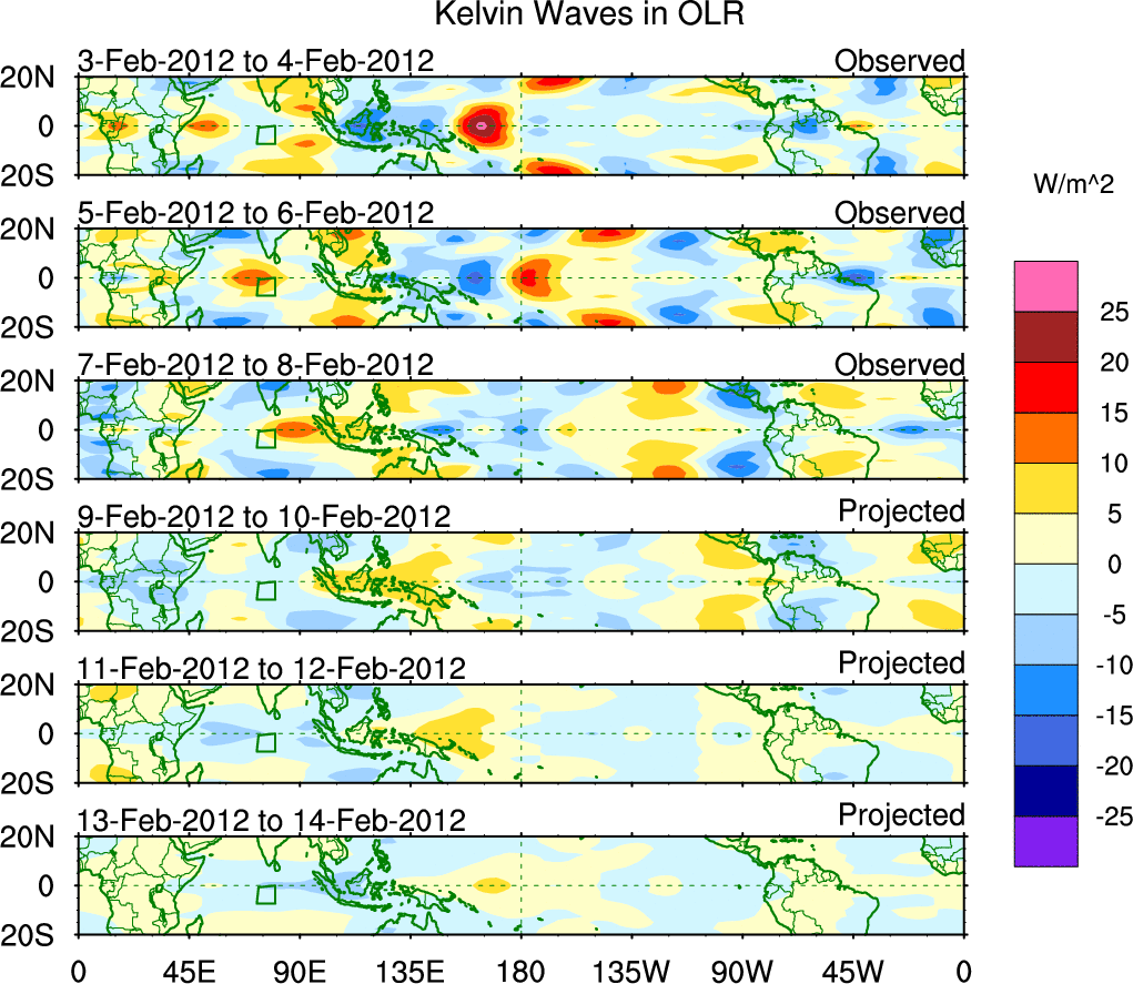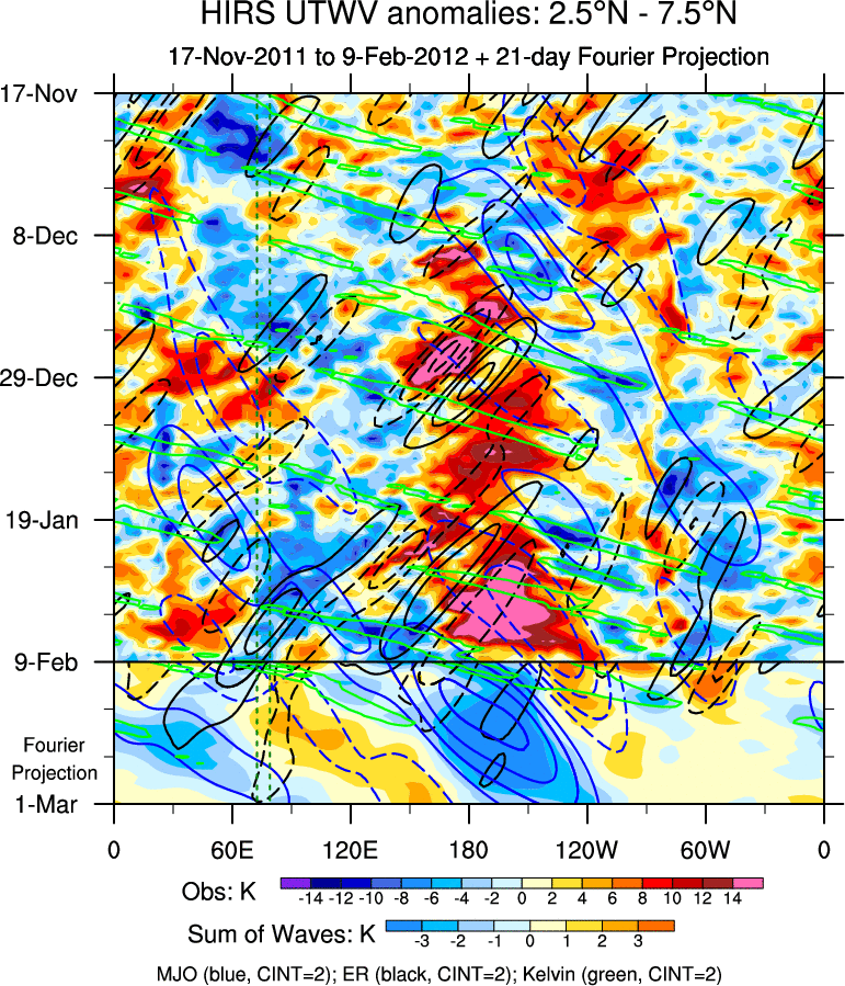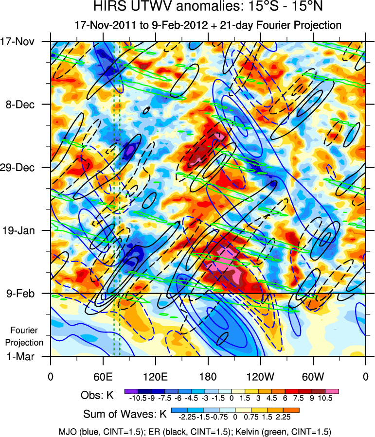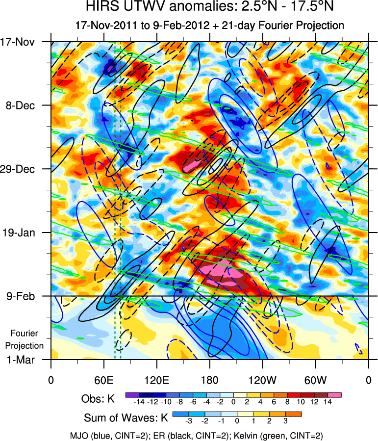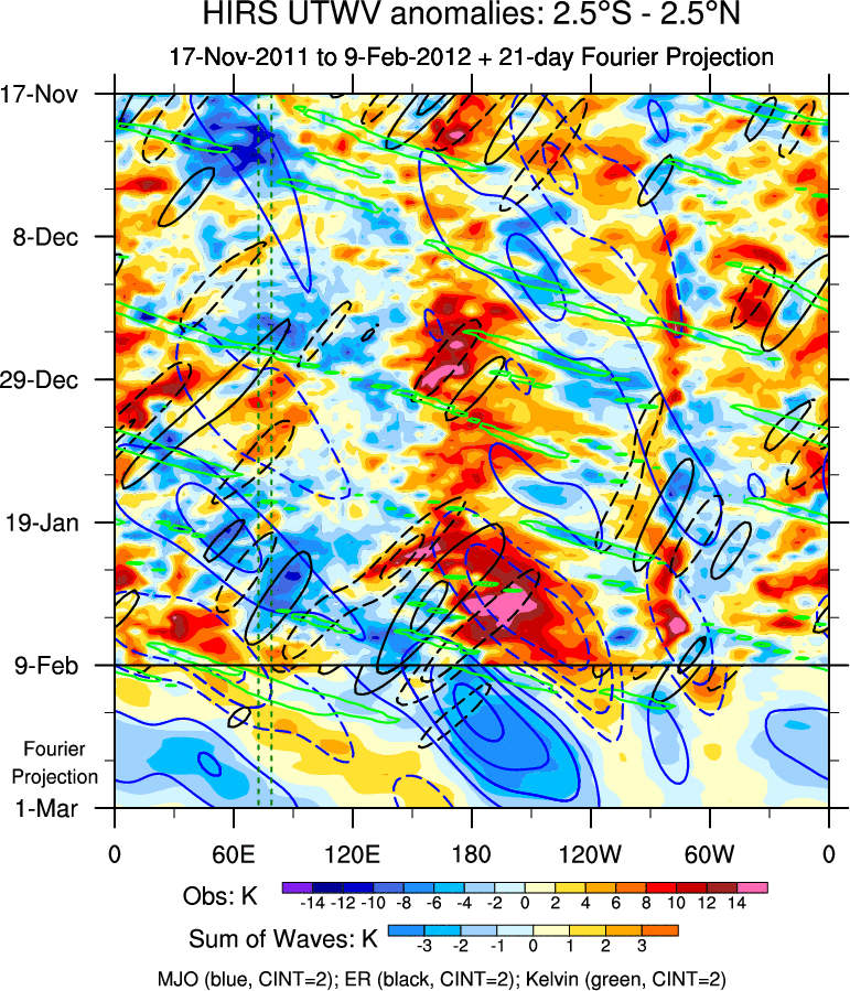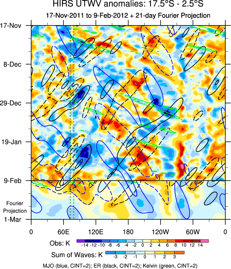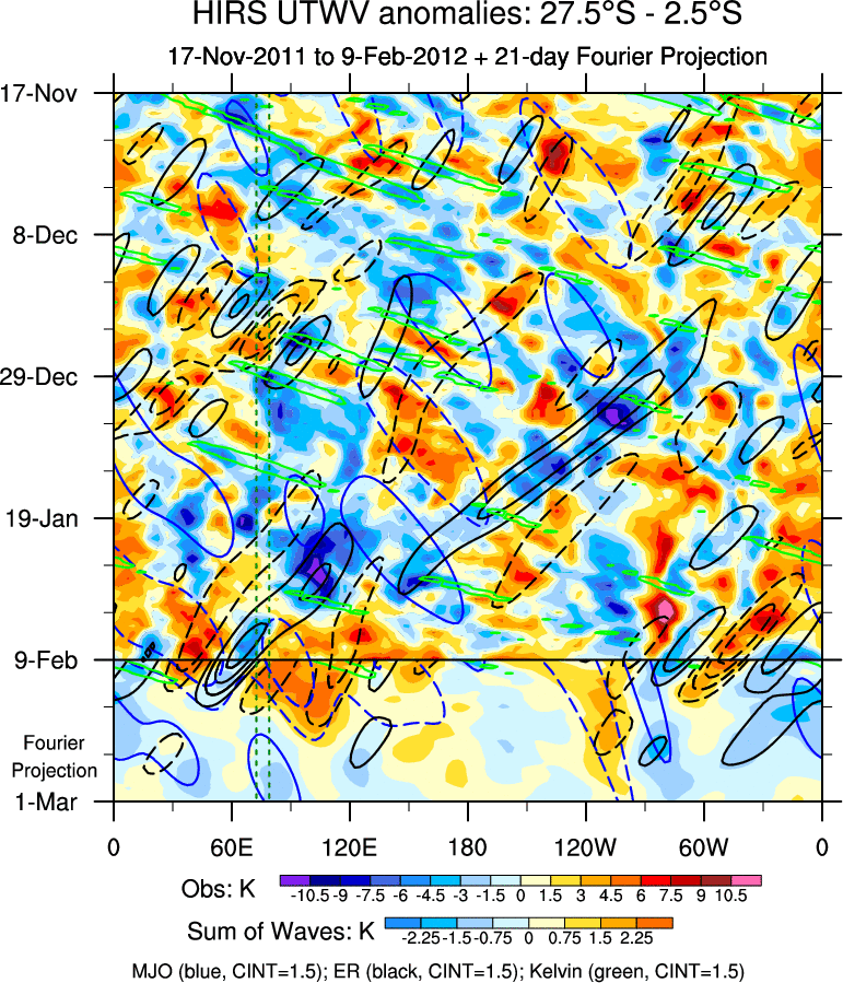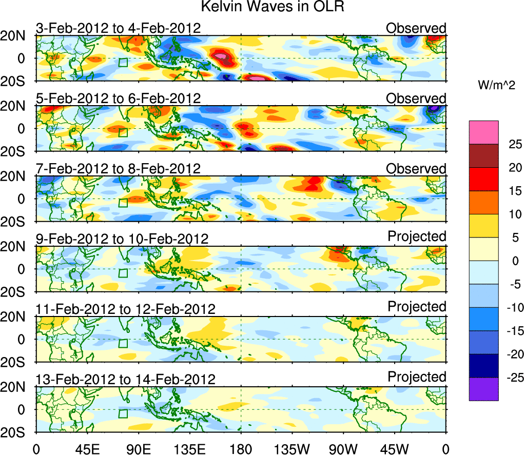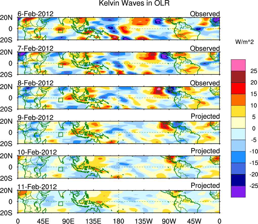 To identify tropical waves in near real-time, the OLR and UTWV data are filtered following Wheeler & Weickmann (2001 MWR). The daily anomalies are calculated using the first 3 harmonics of the seasonal cycle for 1979–2009. Missing values are then filled using linear interpolation in space and time. The most recent 365 days of anomalies are padded with 659 days of zeroes, and the result is filtered for each wave type.