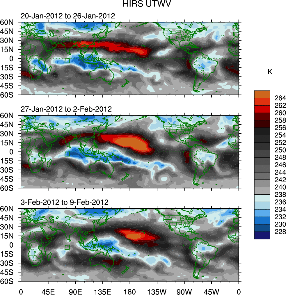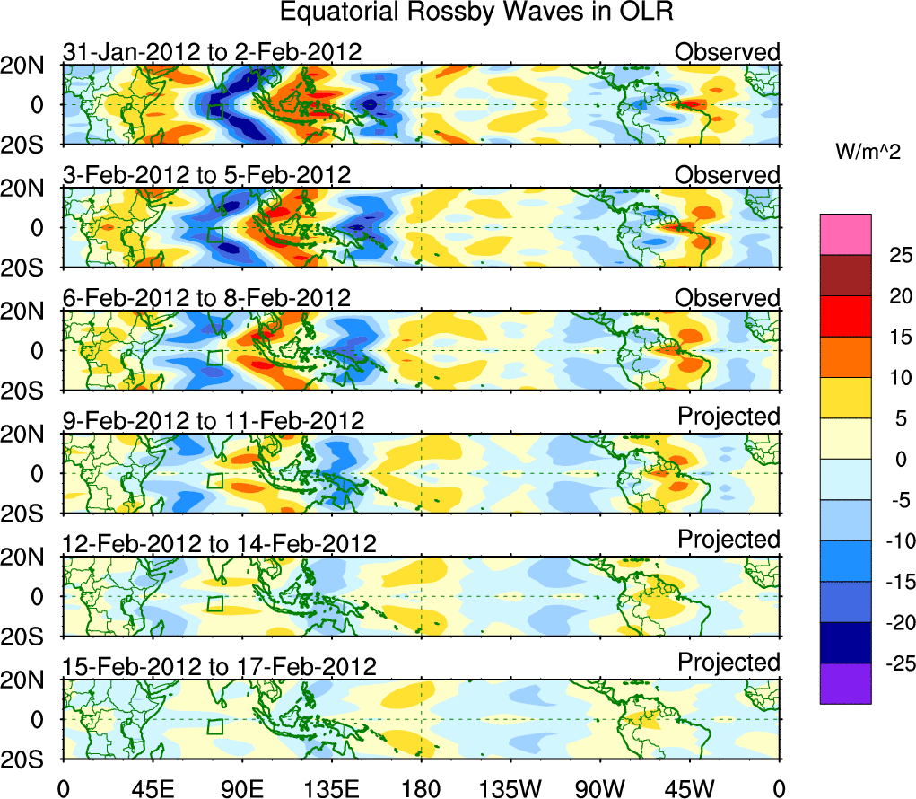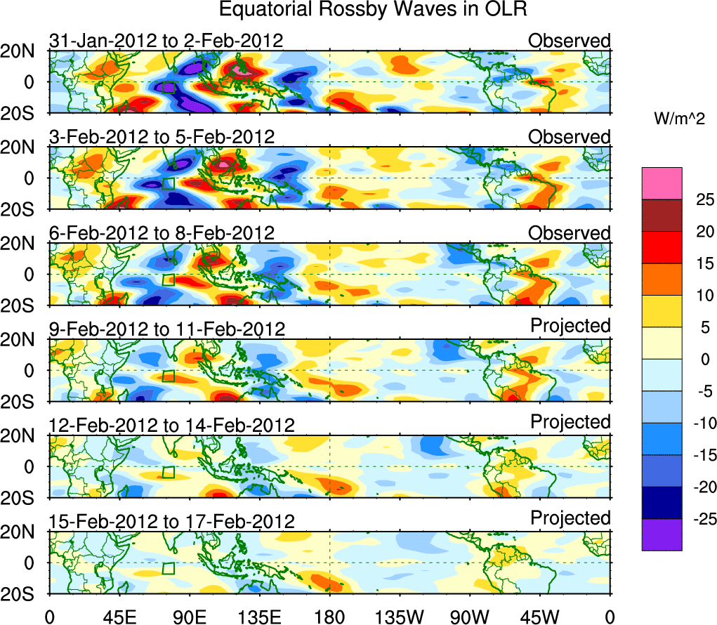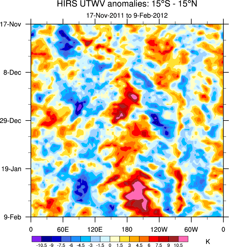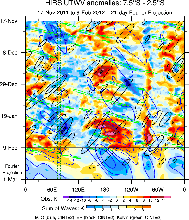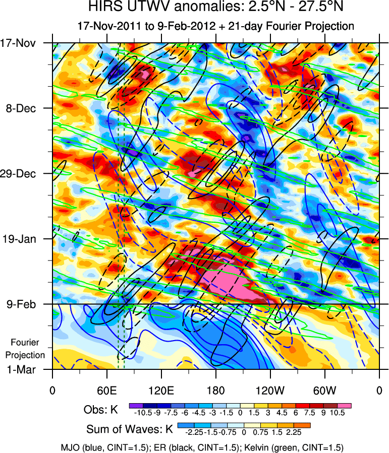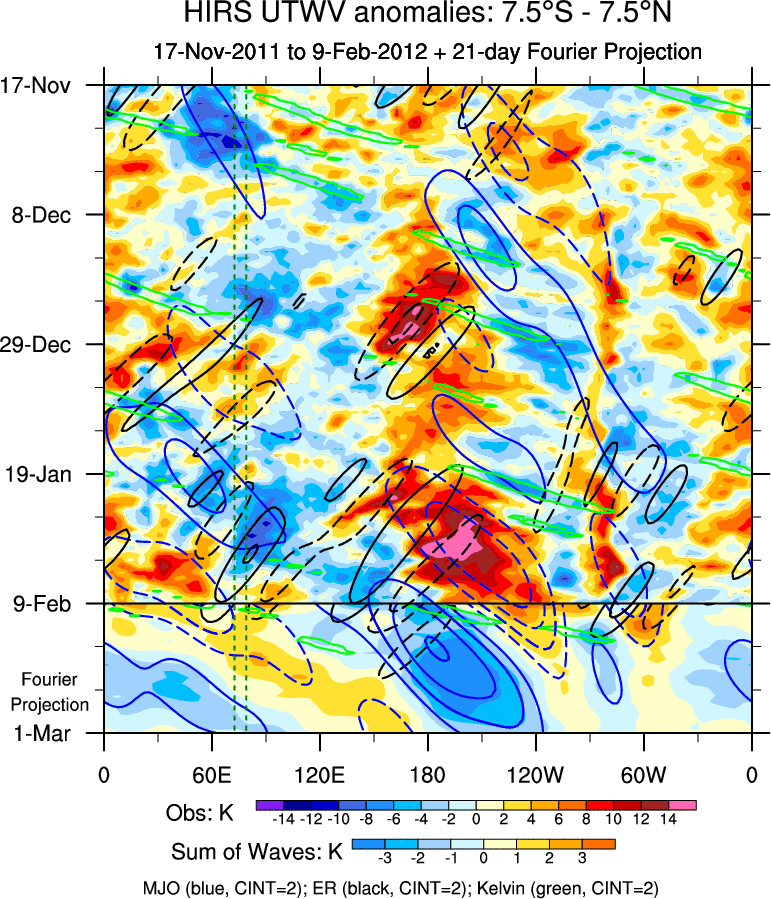 To identify tropical waves in near real-time, the OLR and UTWV data are filtered following Wheeler & Weickmann (2001 MWR). The daily anomalies are calculated using the first 3 harmonics of the seasonal cycle for 1979–2009. Missing values are then filled using linear interpolation in space and time. The most recent 365 days of anomalies are padded with 659 days of zeroes, and the result is filtered for each wave type.