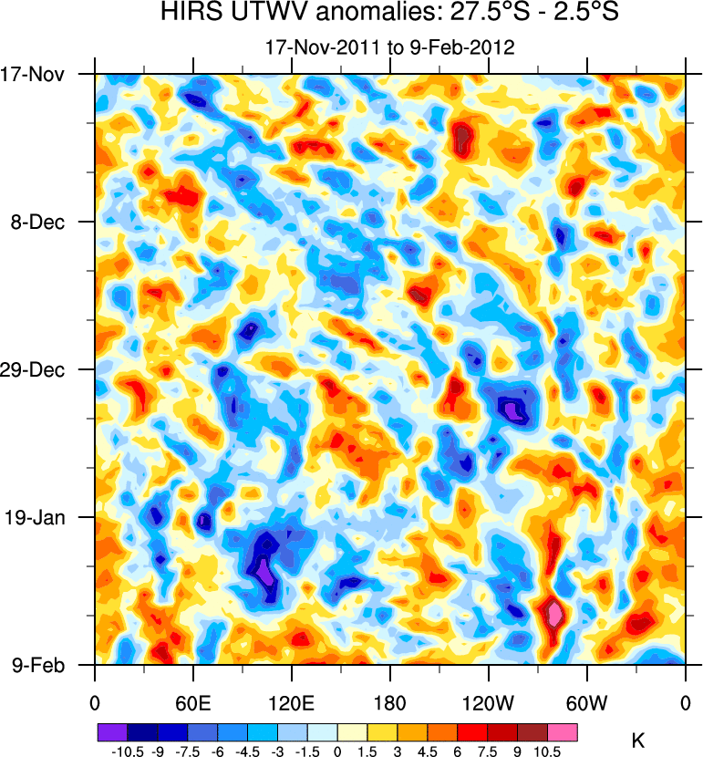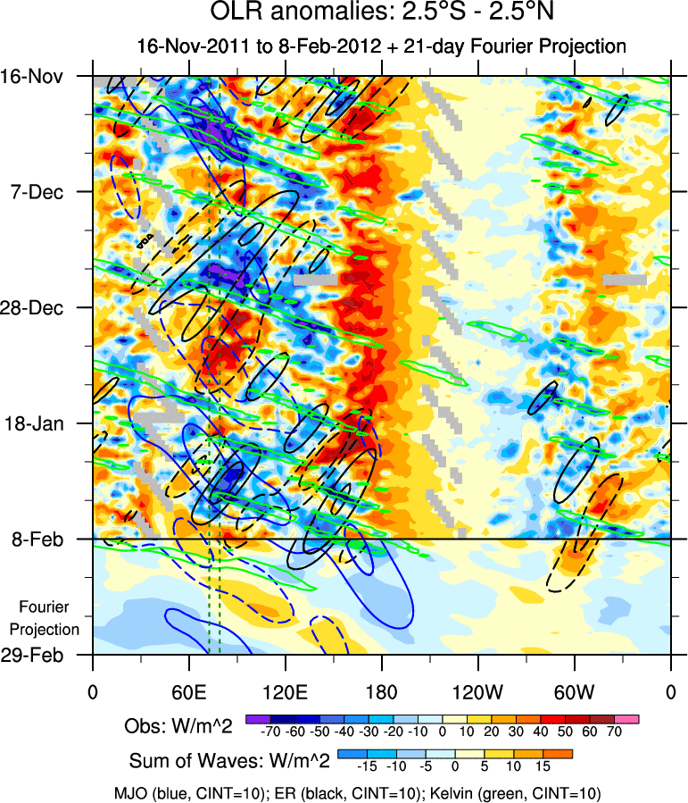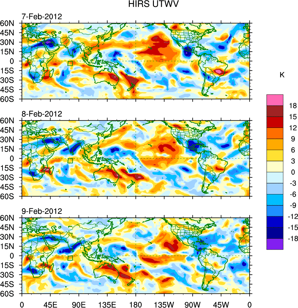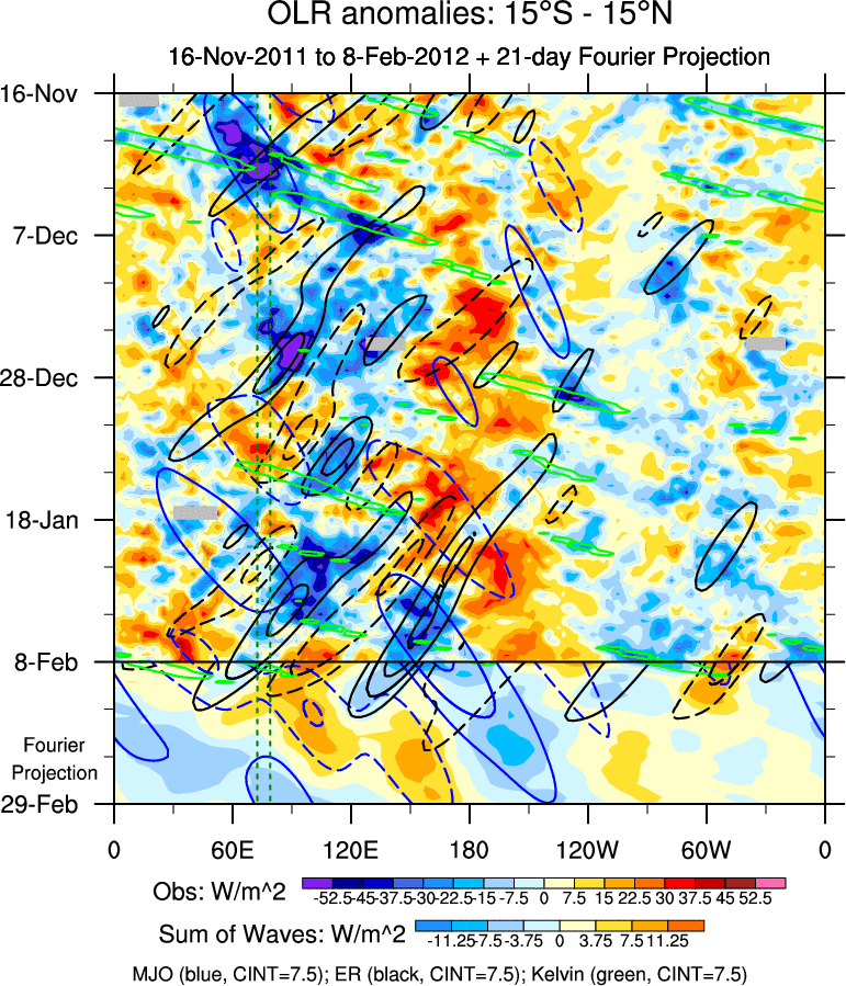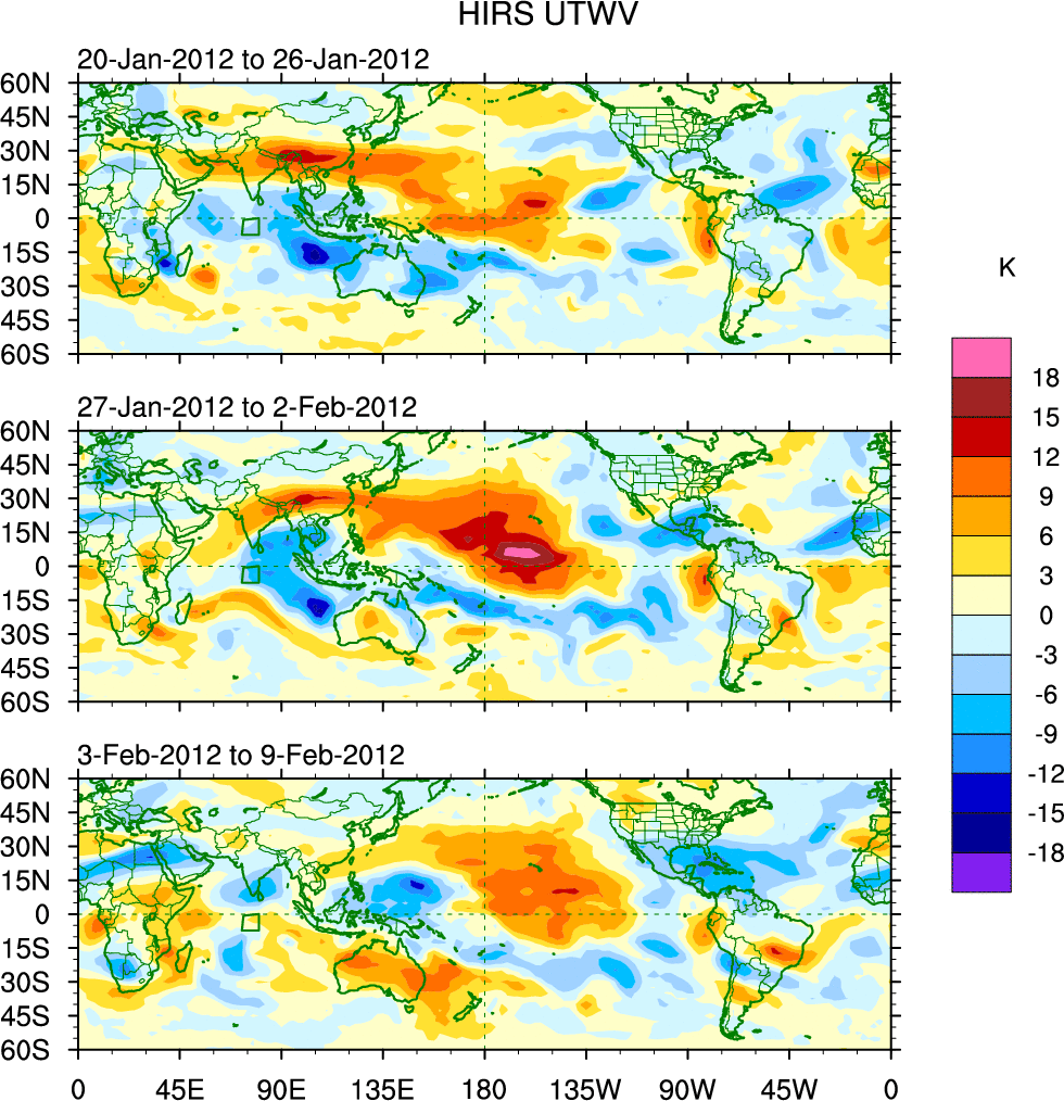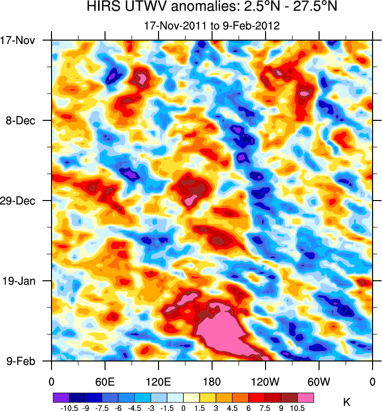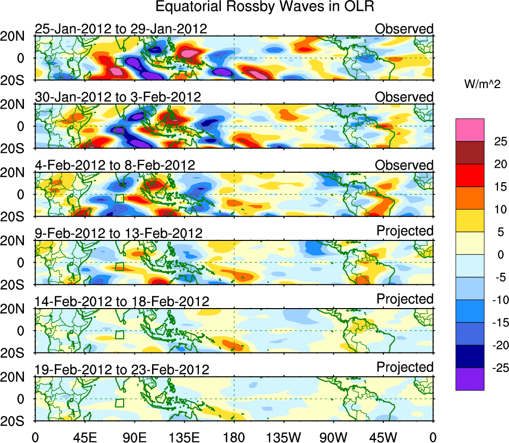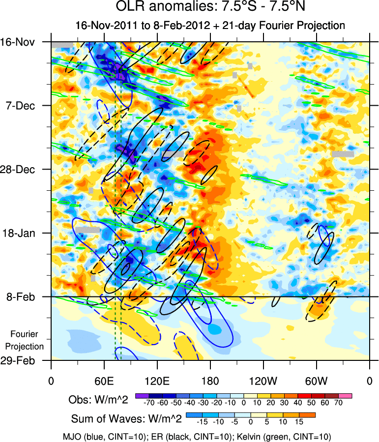 To identify tropical waves in near real-time, the OLR and UTWV data are filtered following Wheeler & Weickmann (2001 MWR). The daily anomalies are calculated using the first 3 harmonics of the seasonal cycle for 1979–2009. Missing values are then filled using linear interpolation in space and time. The most recent 365 days of anomalies are padded with 659 days of zeroes, and the result is filtered for each wave type.