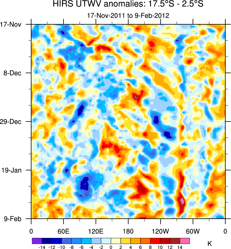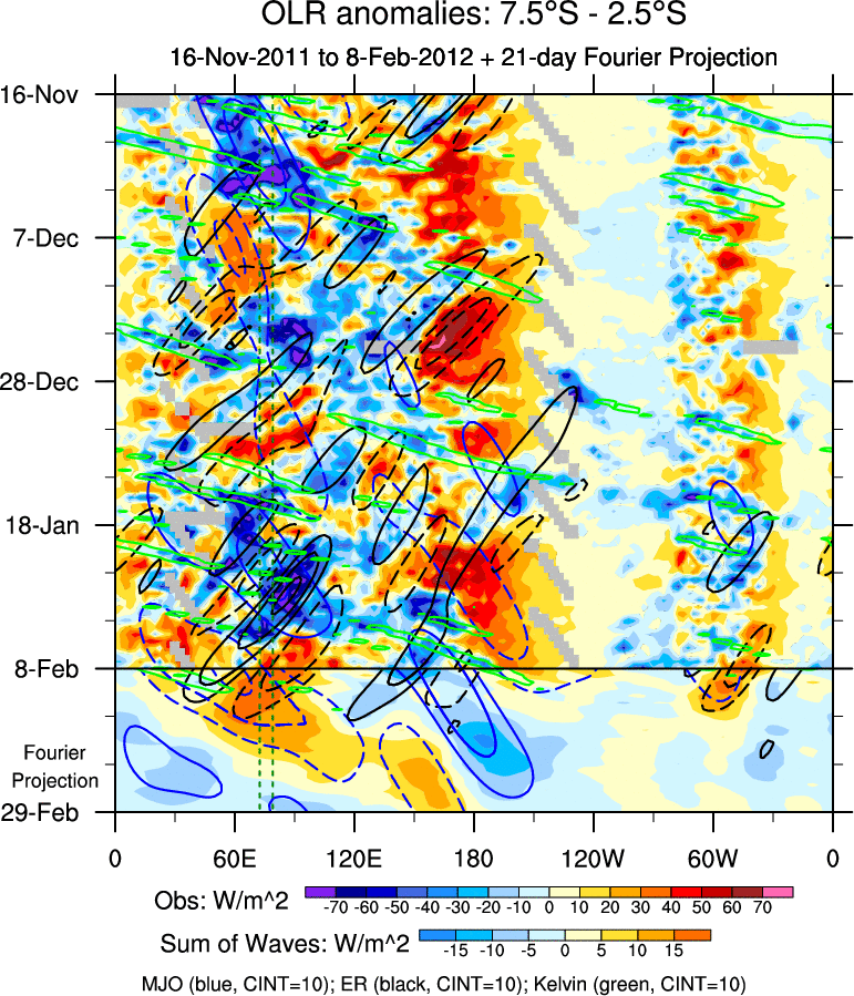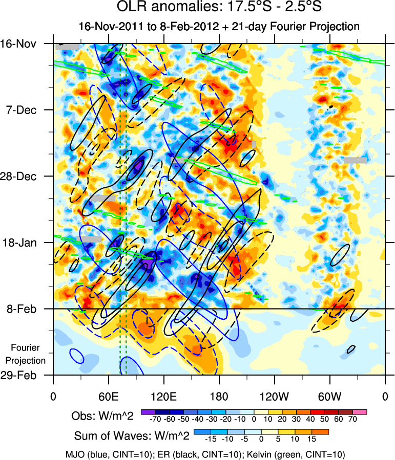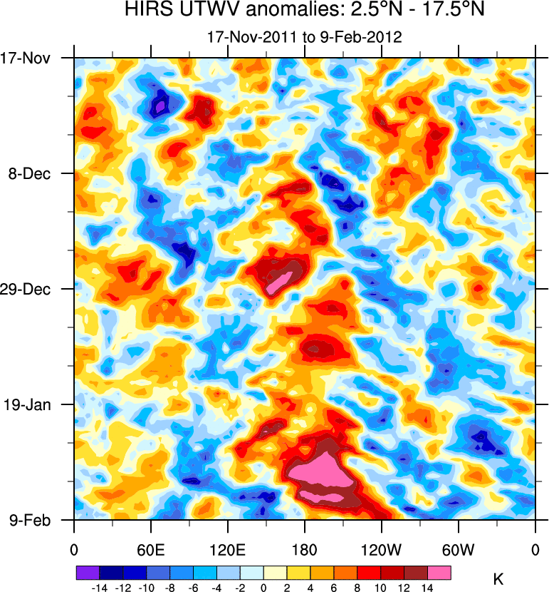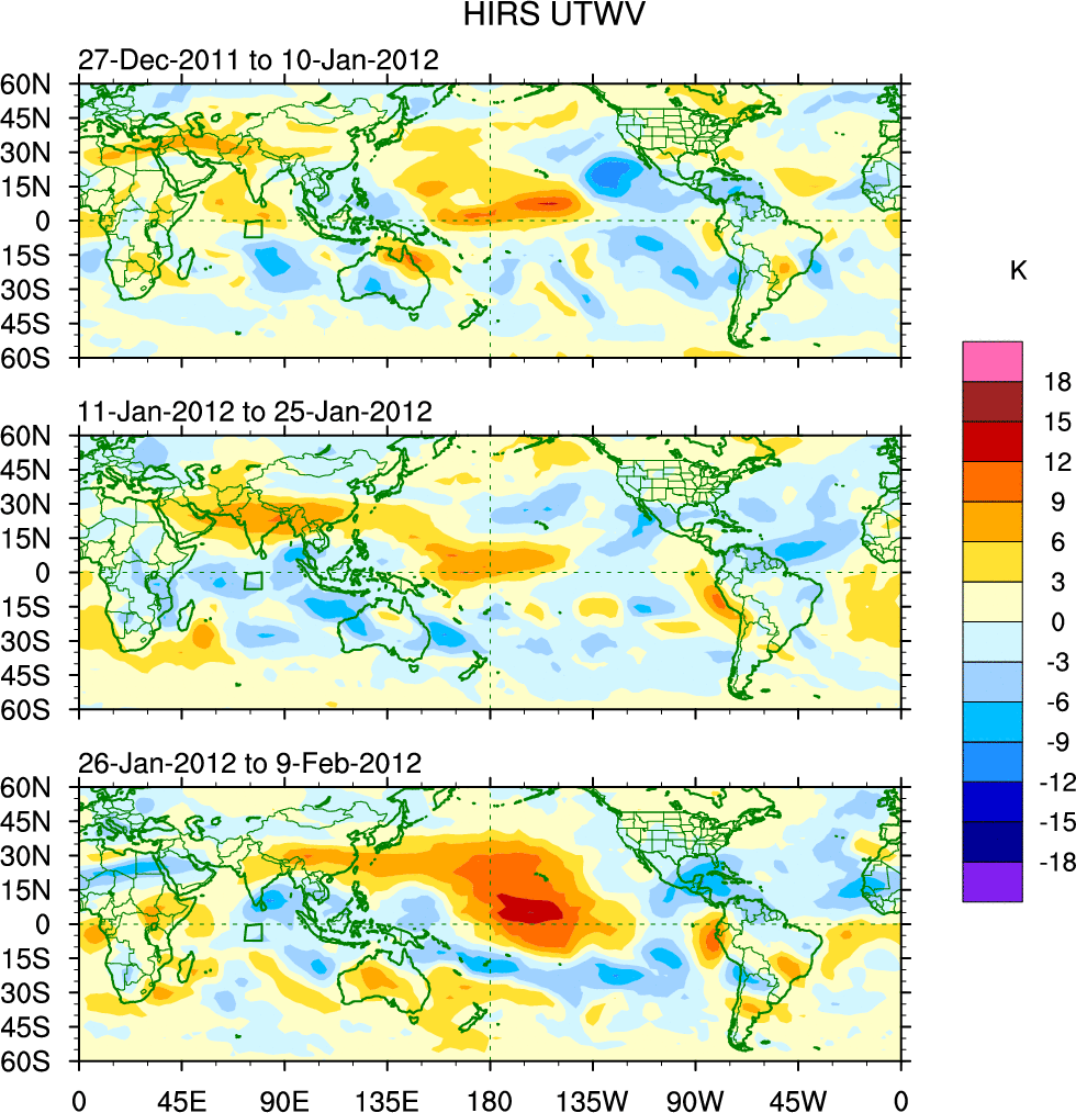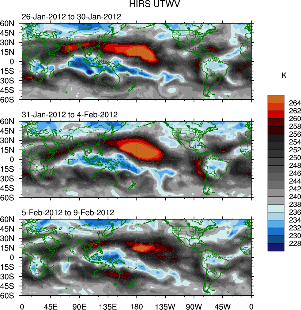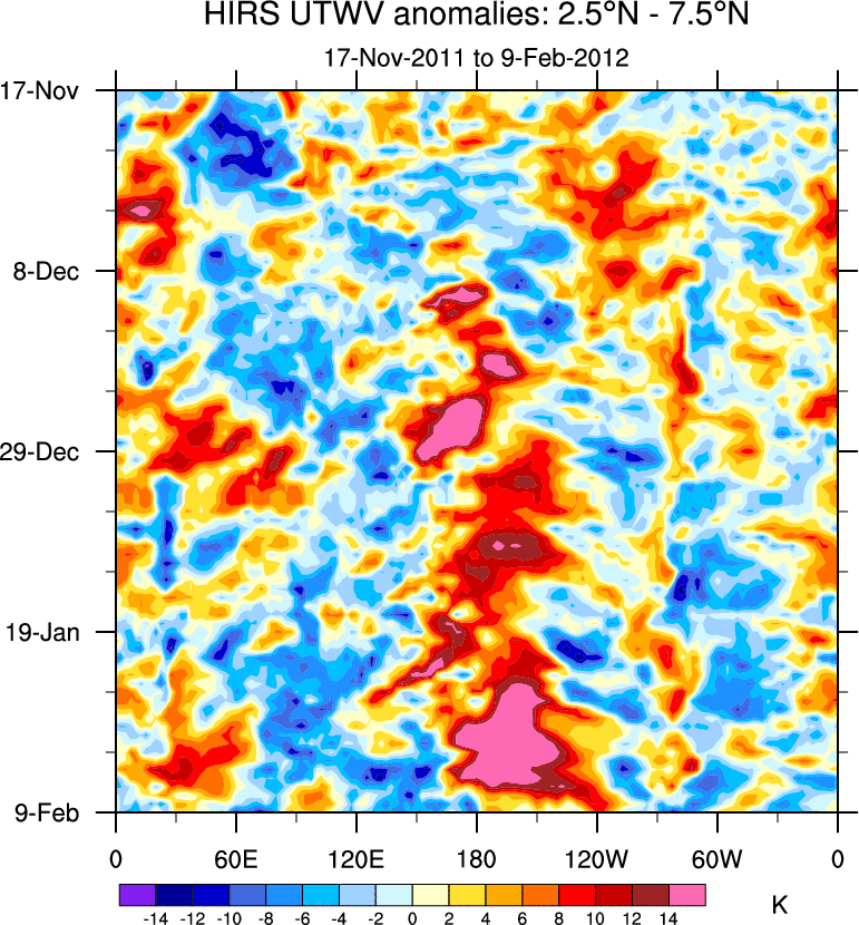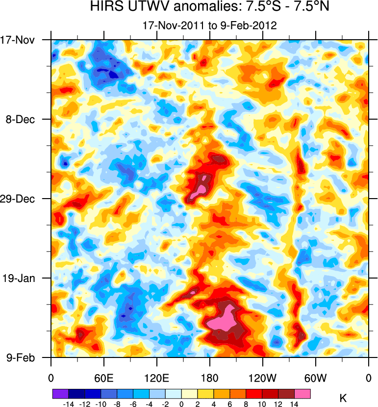 To identify tropical waves in near real-time, the OLR and UTWV data are filtered following Wheeler & Weickmann (2001 MWR). The daily anomalies are calculated using the first 3 harmonics of the seasonal cycle for 1979–2009. Missing values are then filled using linear interpolation in space and time. The most recent 365 days of anomalies are padded with 659 days of zeroes, and the result is filtered for each wave type.