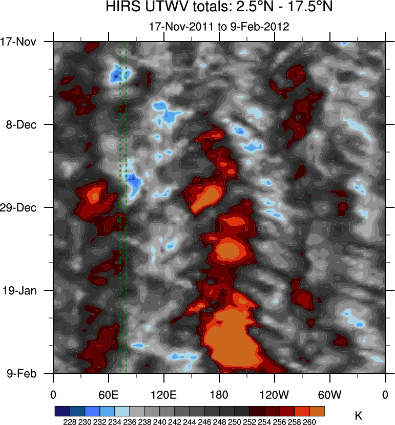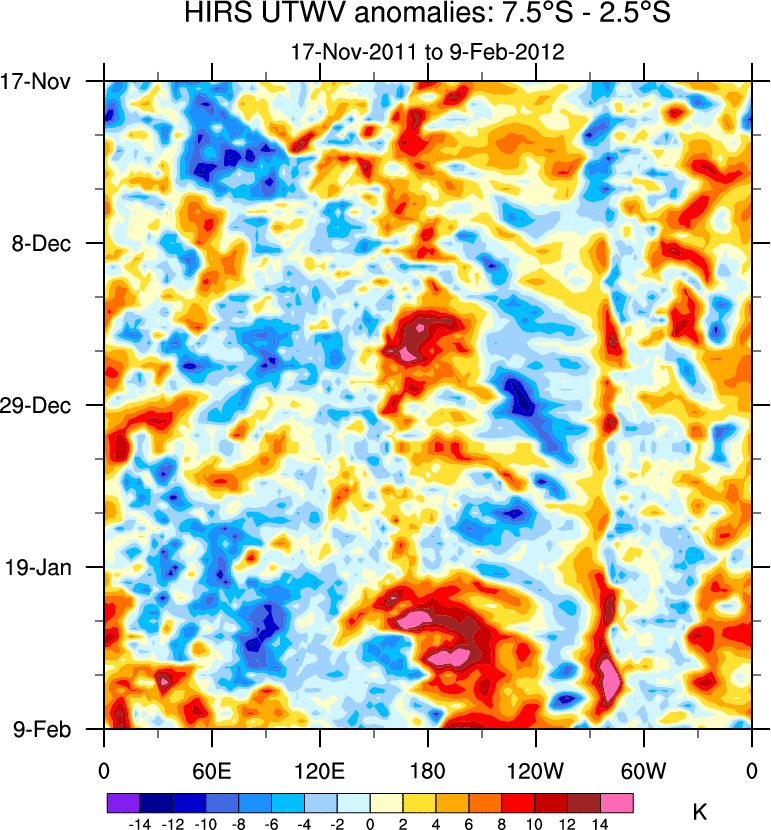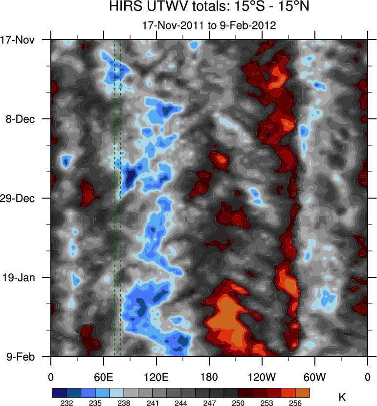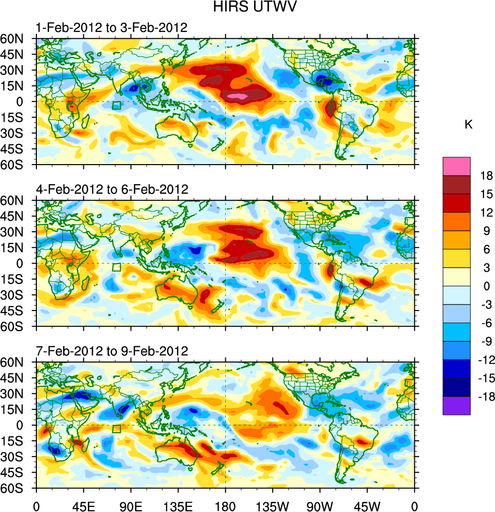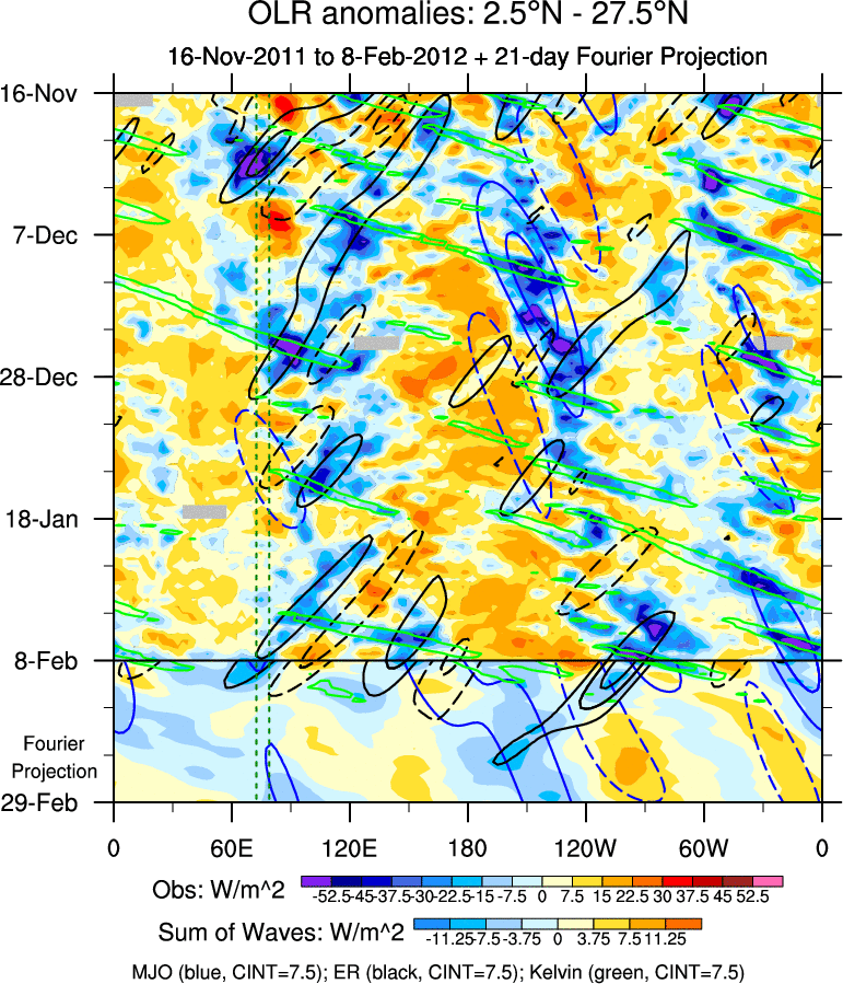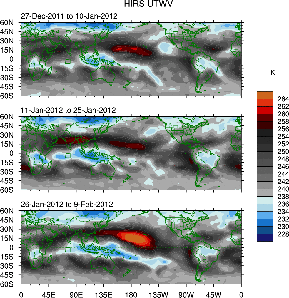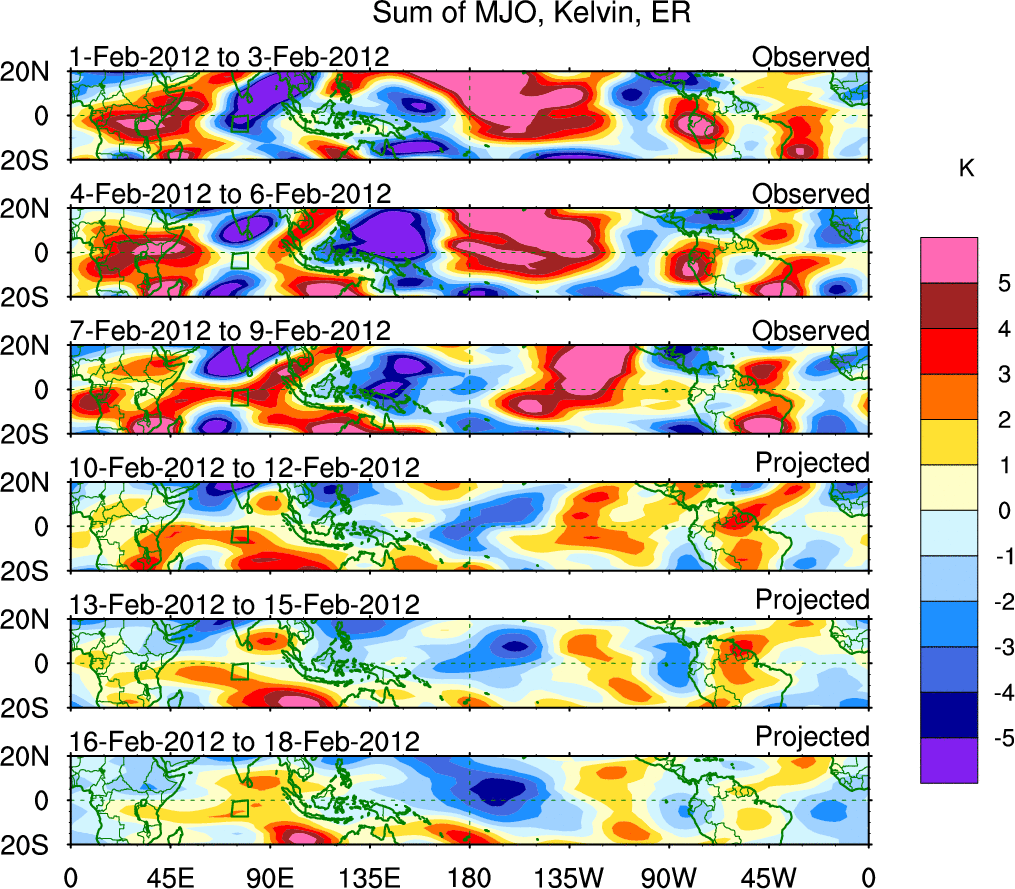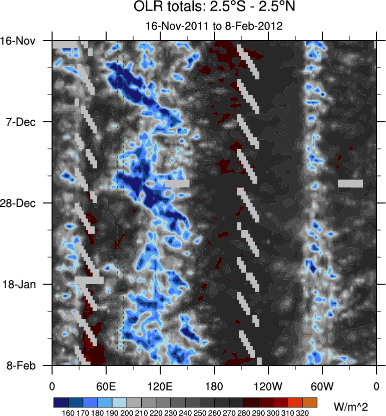 To identify tropical waves in near real-time, the OLR and UTWV data are filtered following Wheeler & Weickmann (2001 MWR). The daily anomalies are calculated using the first 3 harmonics of the seasonal cycle for 1979–2009. Missing values are then filled using linear interpolation in space and time. The most recent 365 days of anomalies are padded with 659 days of zeroes, and the result is filtered for each wave type.