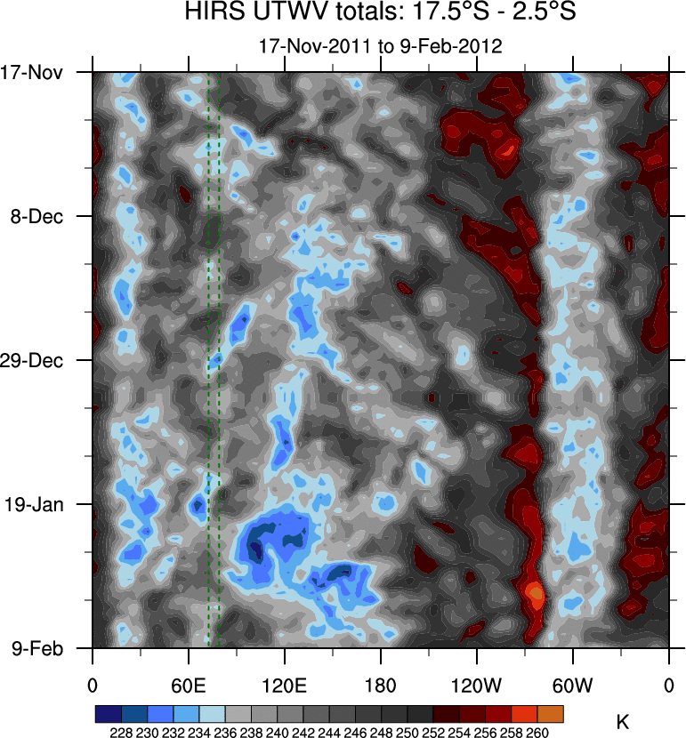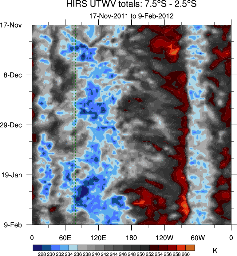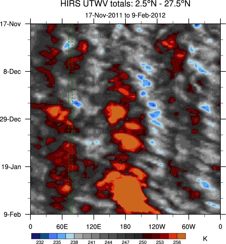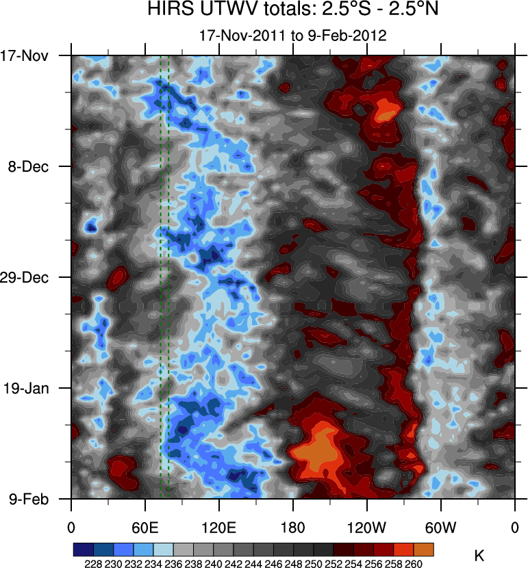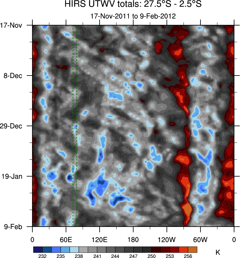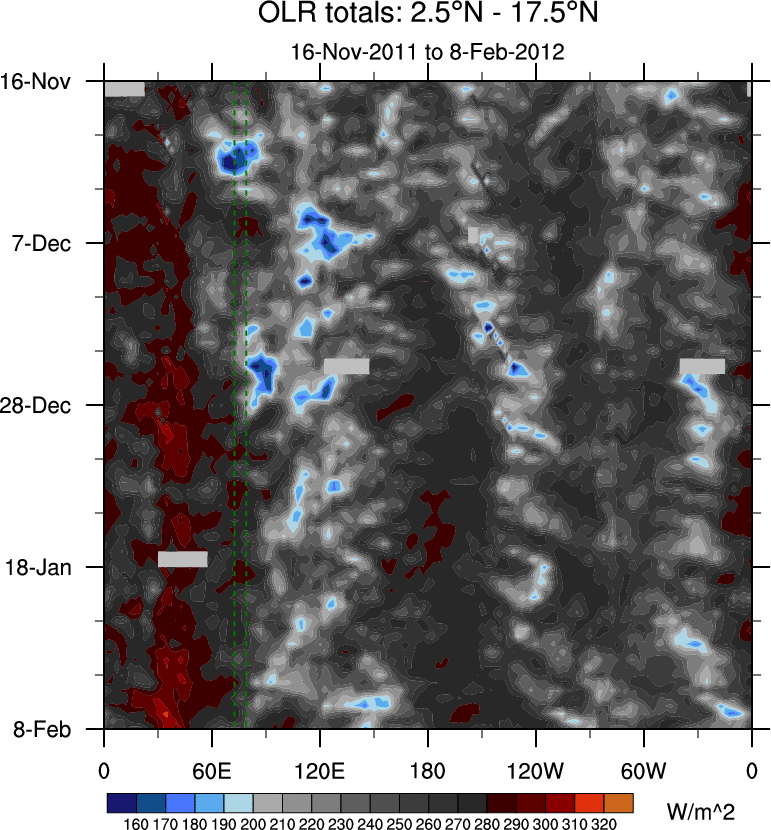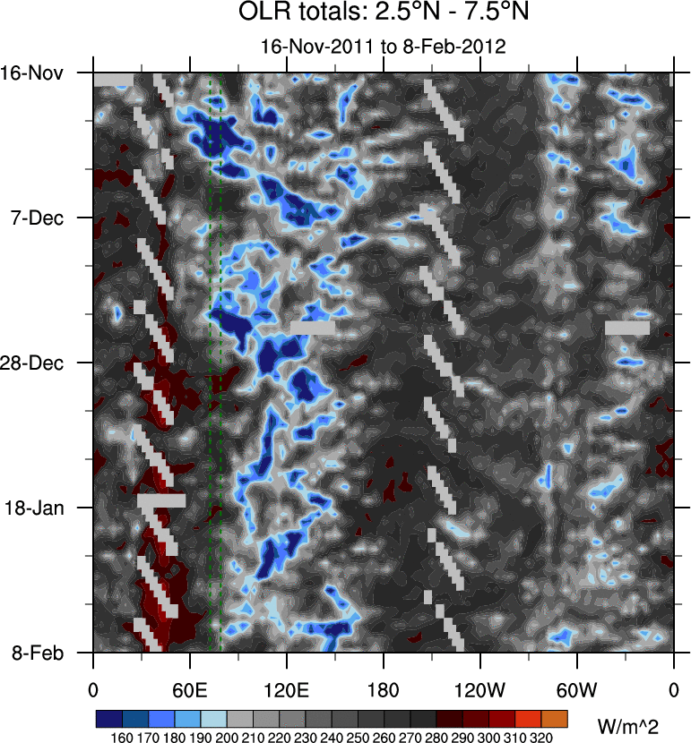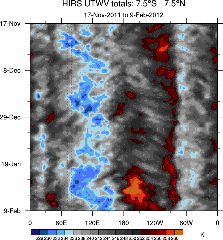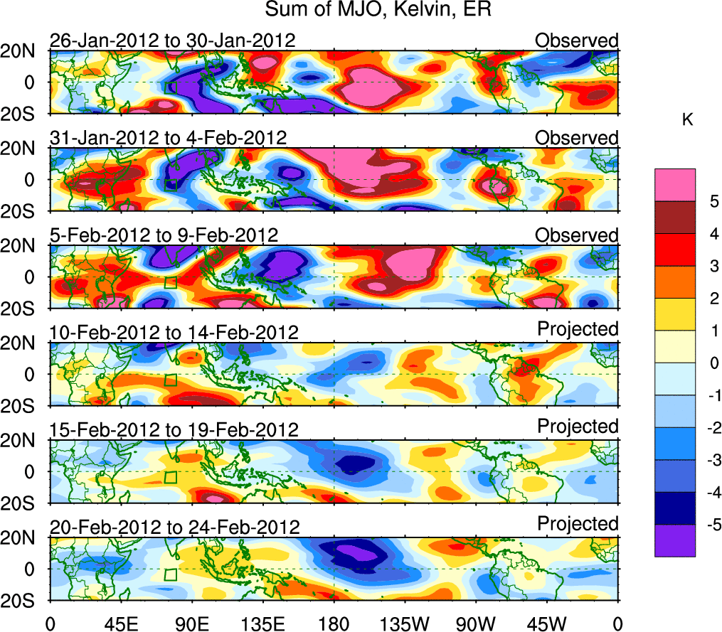 To identify tropical waves in near real-time, the OLR and UTWV data are filtered following Wheeler & Weickmann (2001 MWR). The daily anomalies are calculated using the first 3 harmonics of the seasonal cycle for 1979–2009. Missing values are then filled using linear interpolation in space and time. The most recent 365 days of anomalies are padded with 659 days of zeroes, and the result is filtered for each wave type.