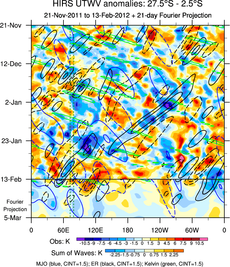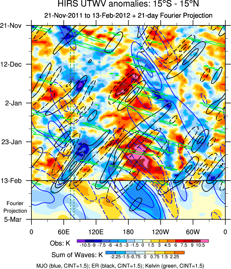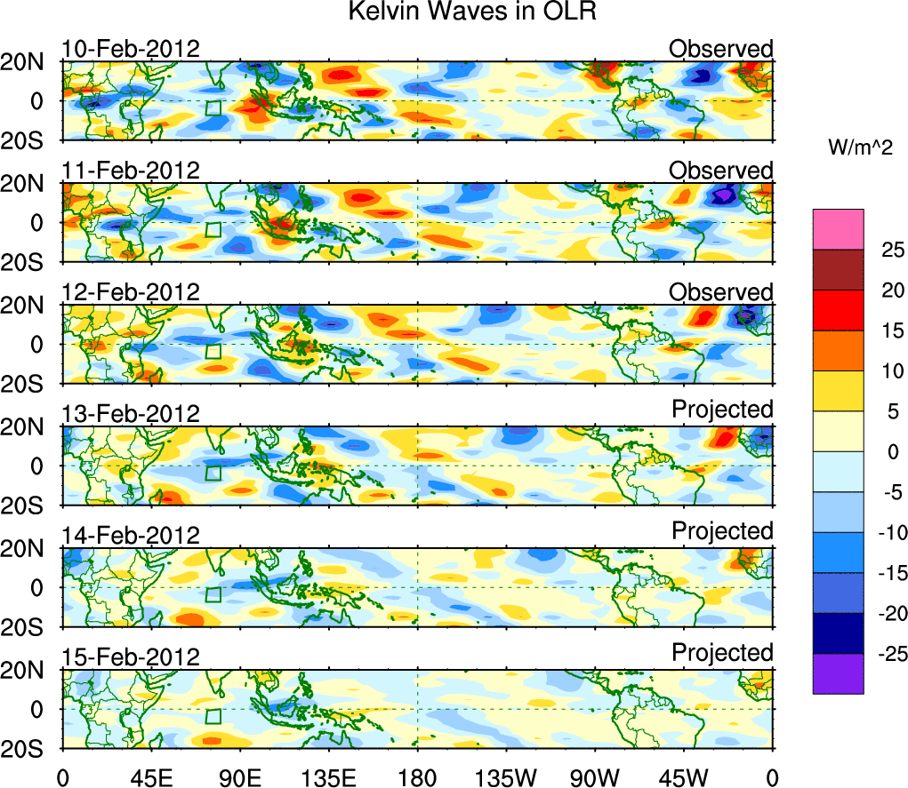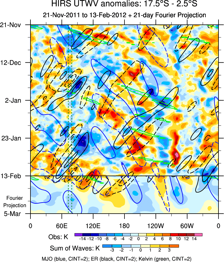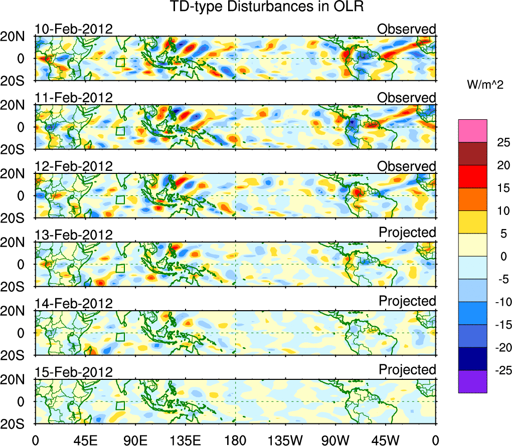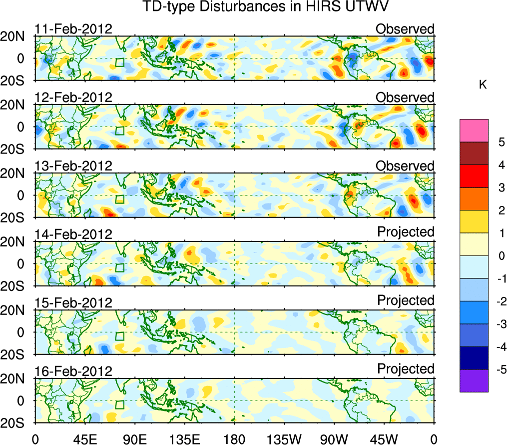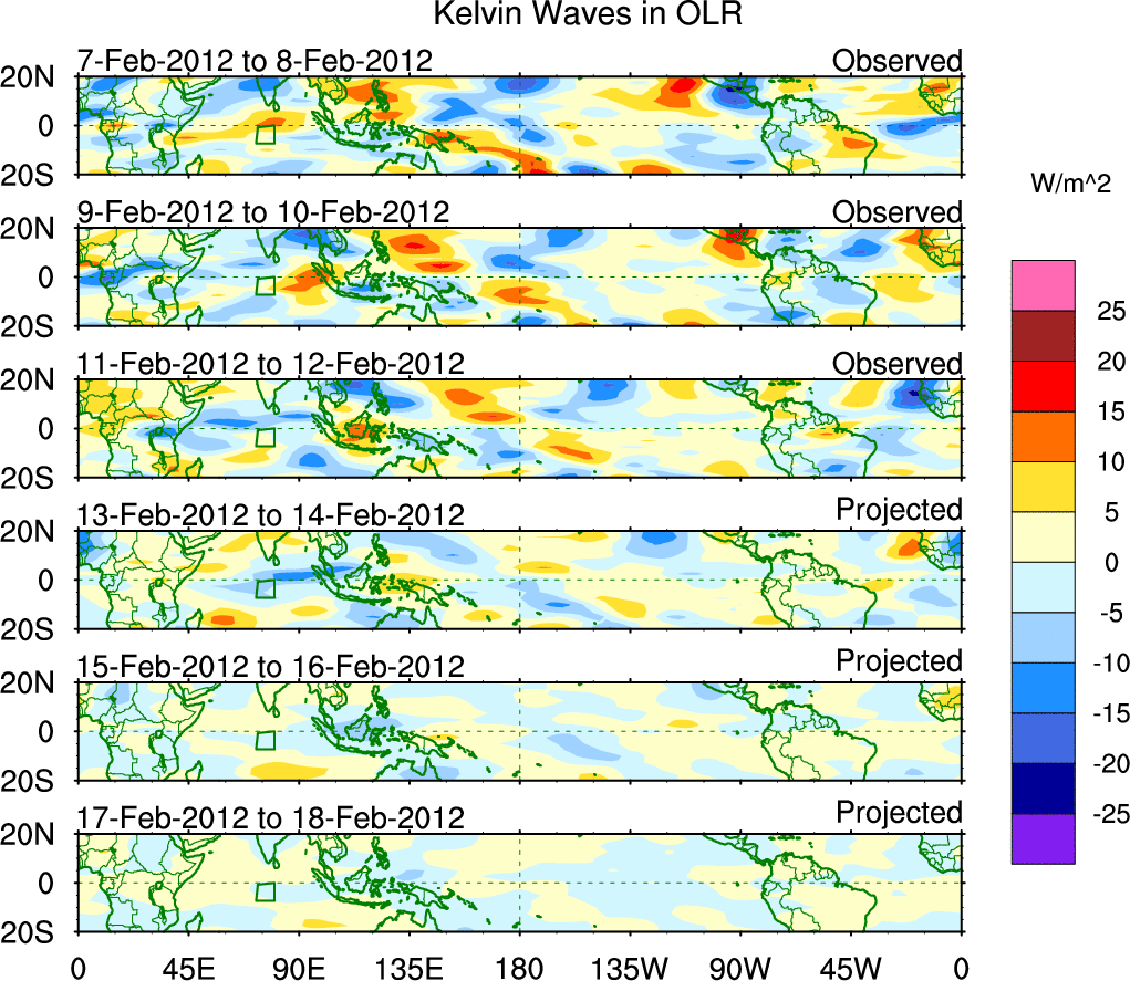 To identify tropical waves in near real-time, the OLR and UTWV data are filtered following Wheeler & Weickmann (2001 MWR). The daily anomalies are calculated using the first 3 harmonics of the seasonal cycle for 1979–2009. Missing values are then filled using linear interpolation in space and time. The most recent 365 days of anomalies are padded with 659 days of zeroes, and the result is filtered for each wave type.