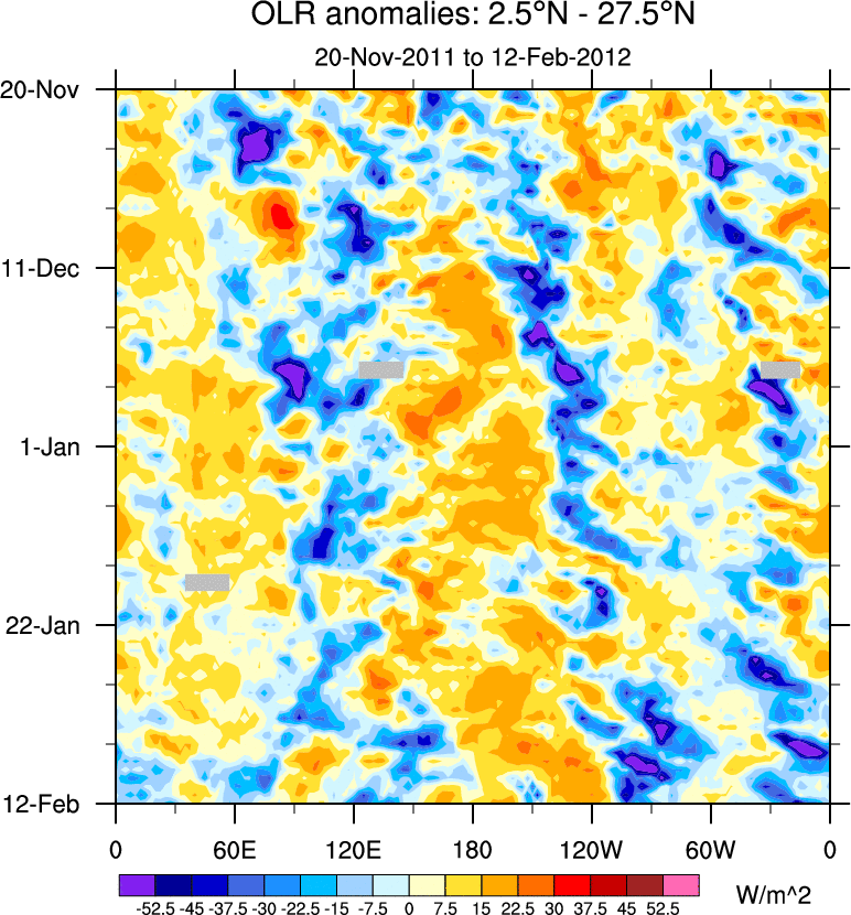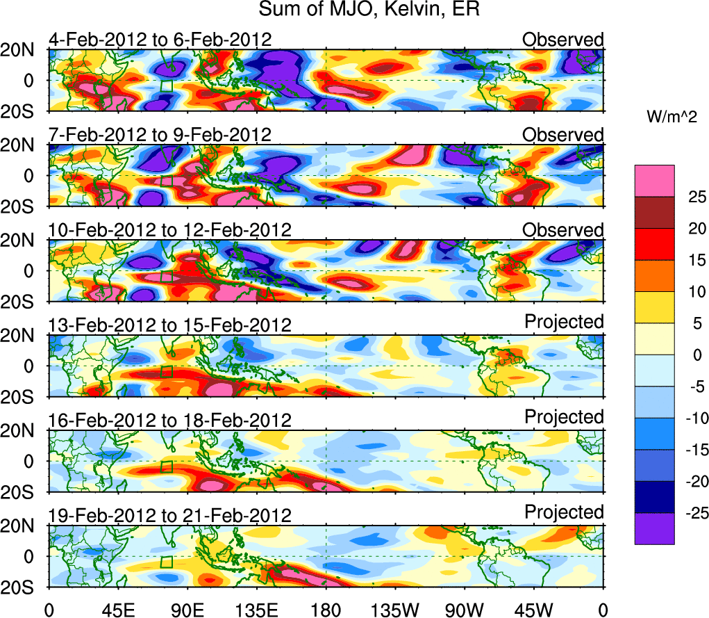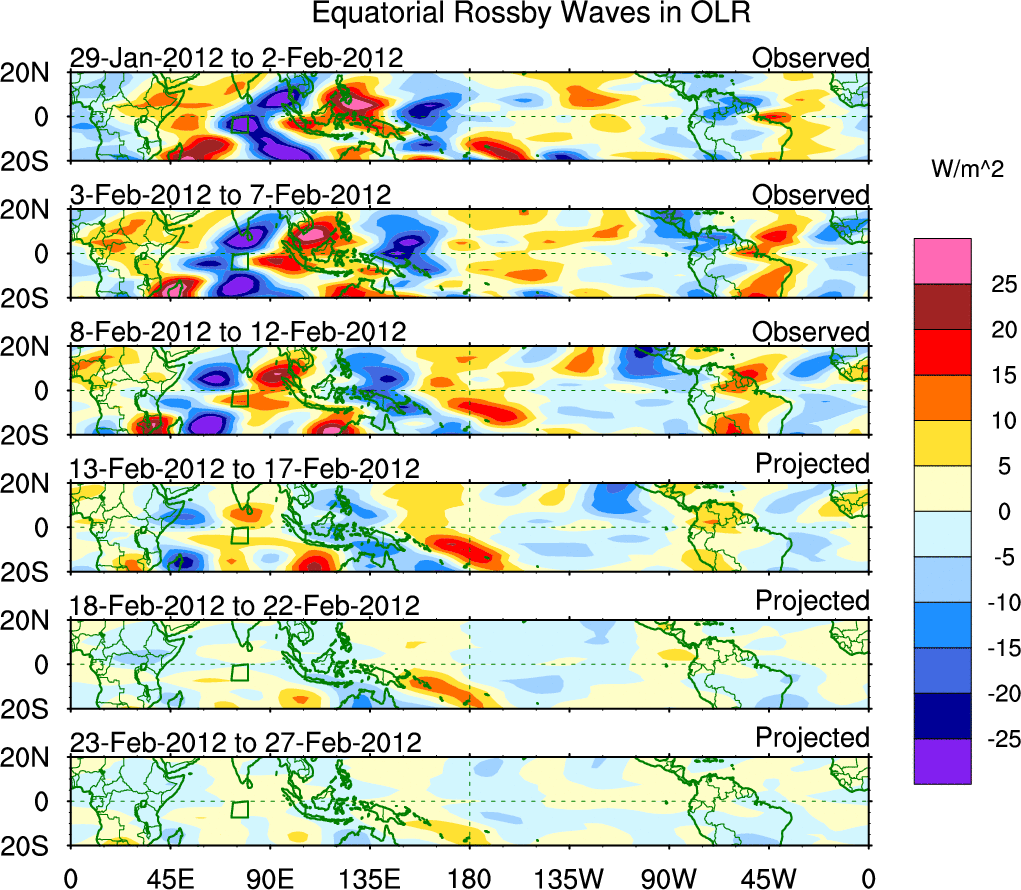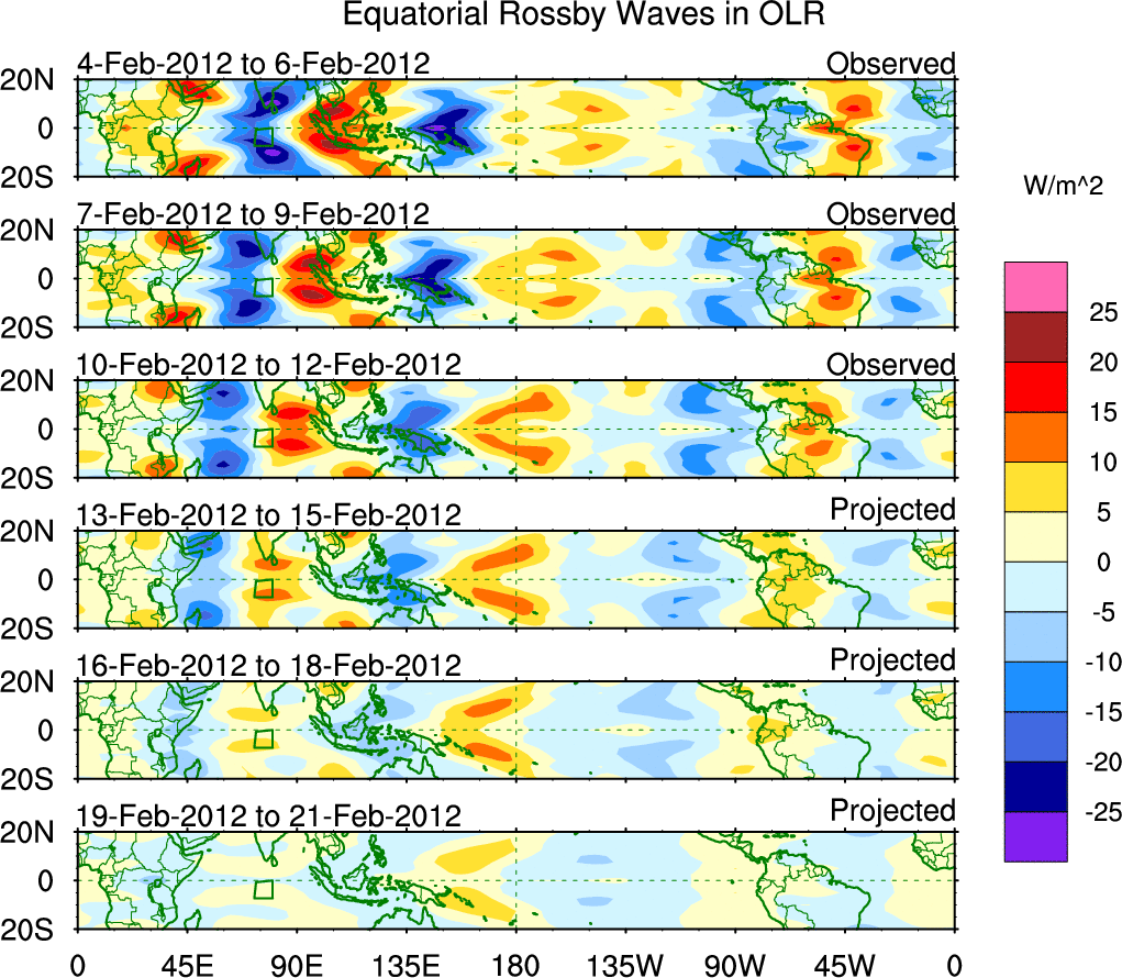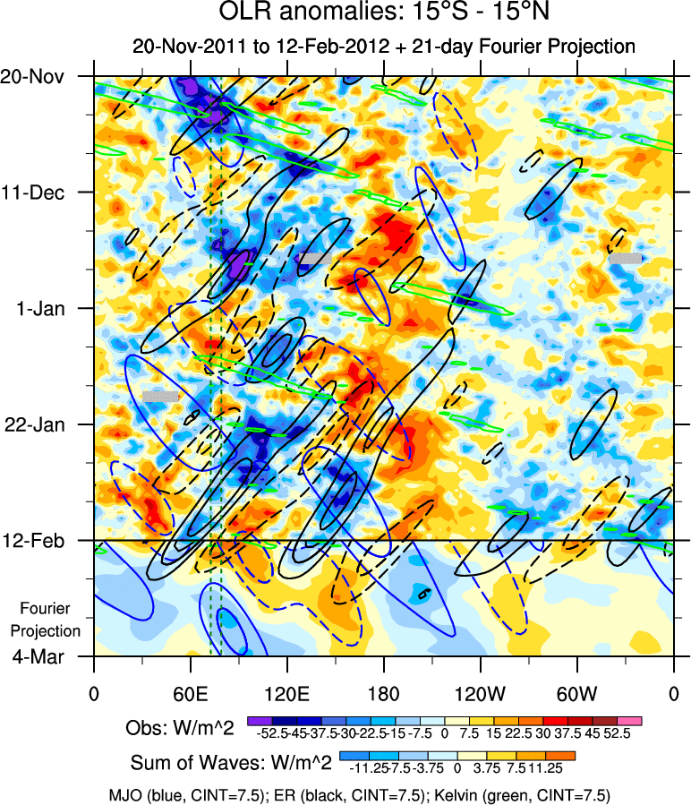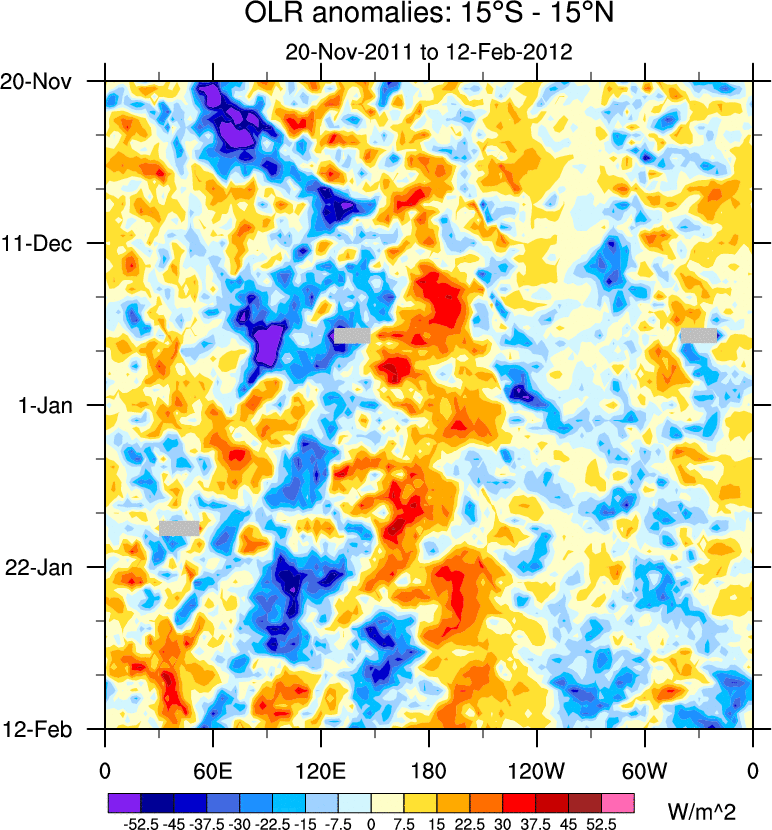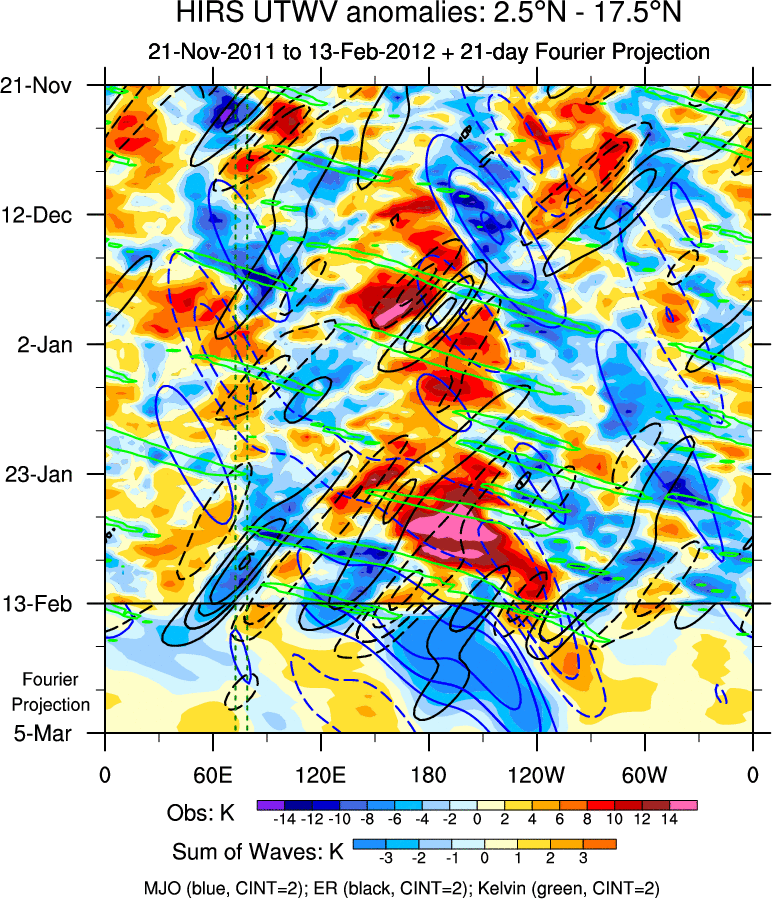 To identify tropical waves in near real-time, the OLR and UTWV data are filtered following Wheeler & Weickmann (2001 MWR). The daily anomalies are calculated using the first 3 harmonics of the seasonal cycle for 1979–2009. Missing values are then filled using linear interpolation in space and time. The most recent 365 days of anomalies are padded with 659 days of zeroes, and the result is filtered for each wave type.