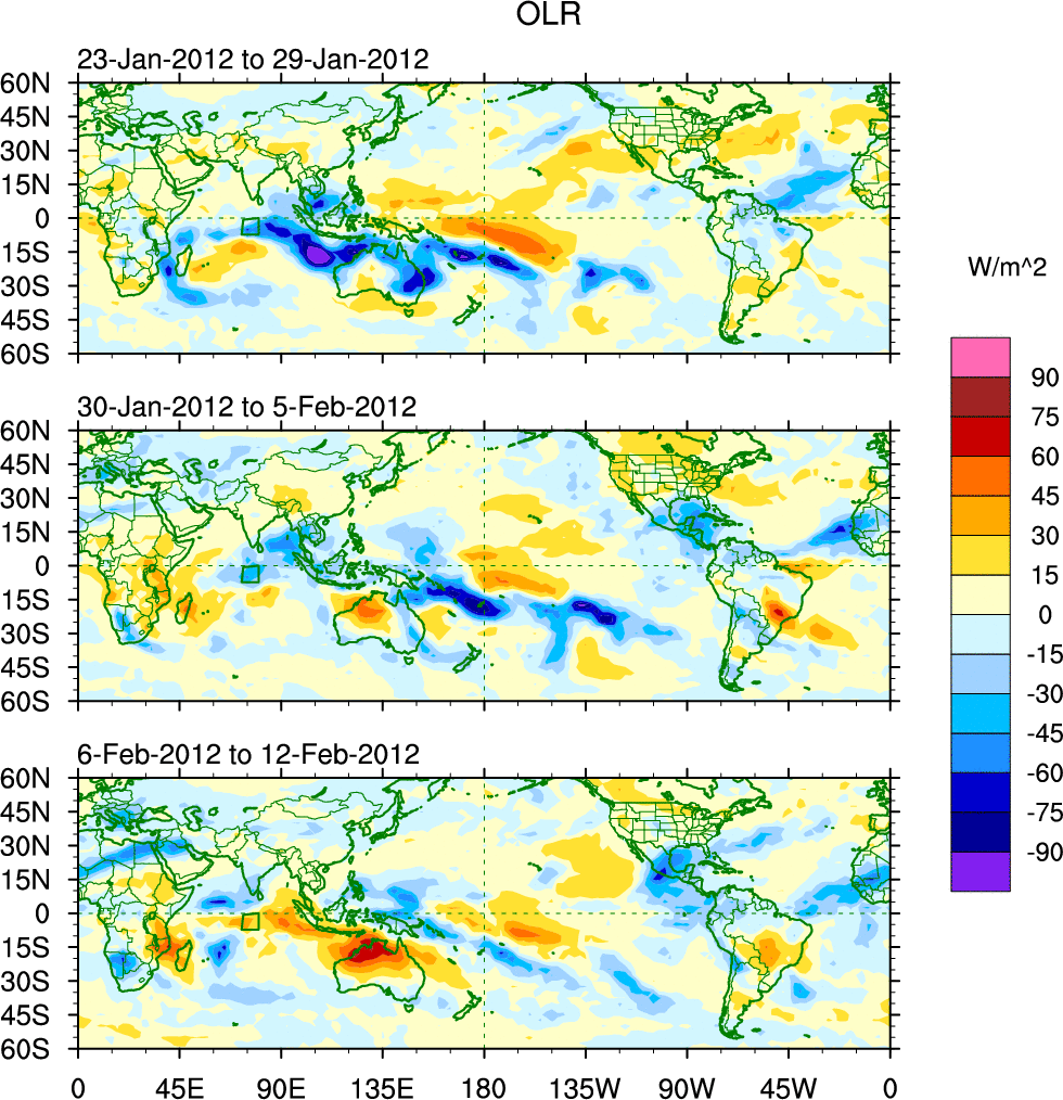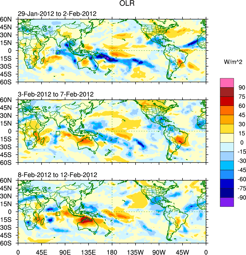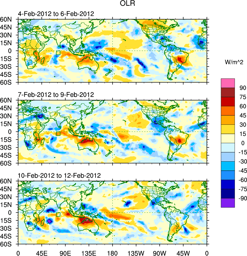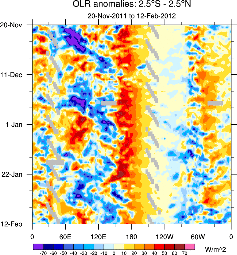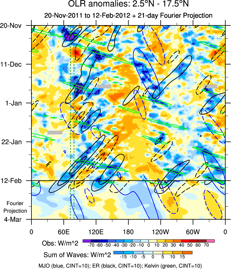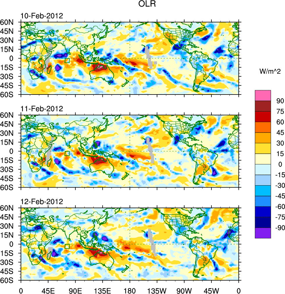 To identify tropical waves in near real-time, the OLR and UTWV data are filtered following Wheeler & Weickmann (2001 MWR). The daily anomalies are calculated using the first 3 harmonics of the seasonal cycle for 1979–2009. Missing values are then filled using linear interpolation in space and time. The most recent 365 days of anomalies are padded with 659 days of zeroes, and the result is filtered for each wave type.