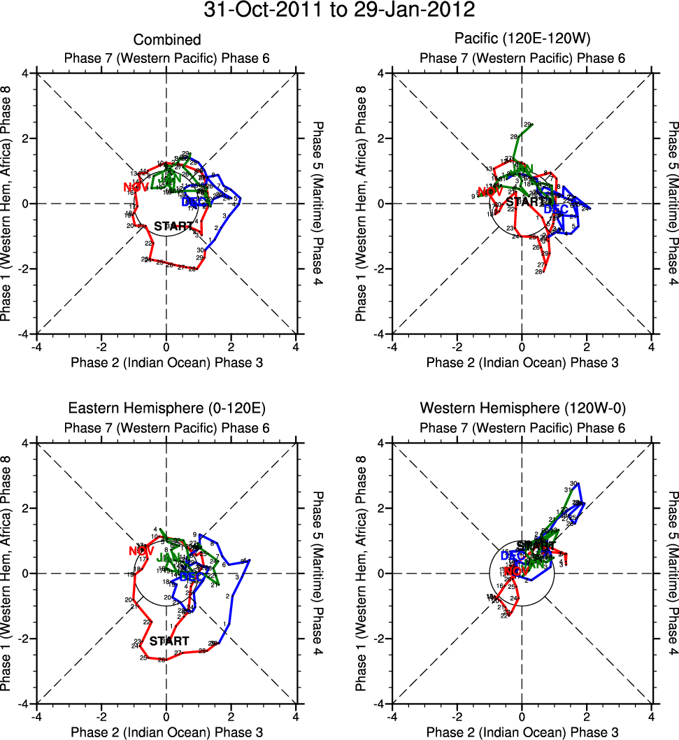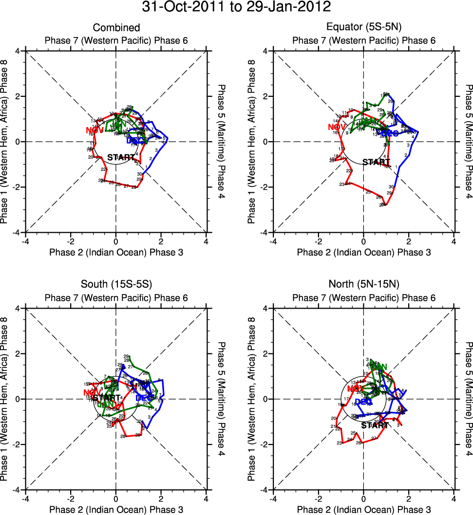 Wheeler and Hendon (2004) constructed the RMM index for monitoring the MJO. This index consists of the first two principal components (PCs) of OLR, 850-hPa zonal wind, and 200-hPa zonal wind averaged 15S-15N.