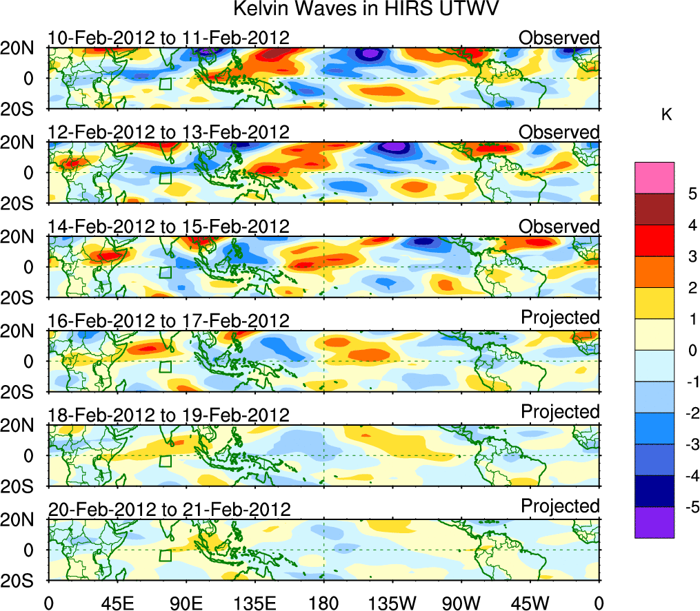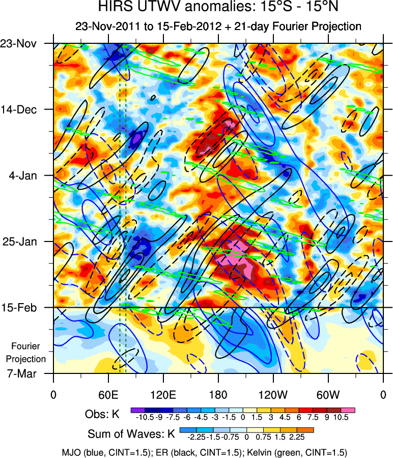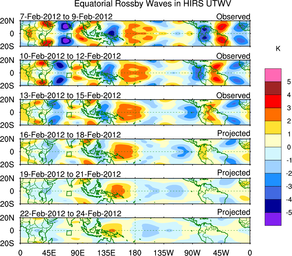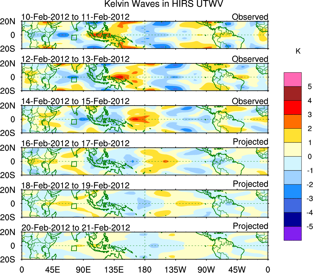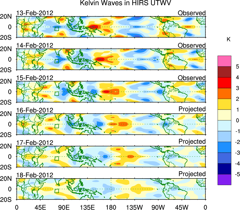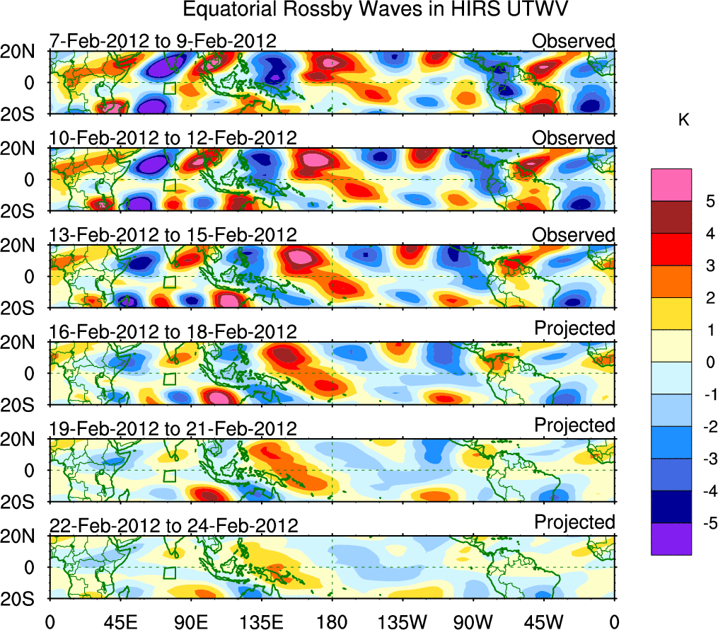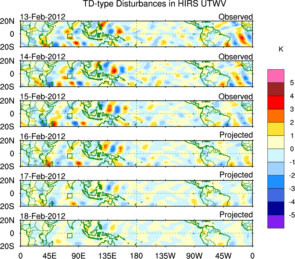 To identify tropical waves in near real-time, the OLR and UTWV data are filtered following Wheeler & Weickmann (2001 MWR). The daily anomalies are calculated using the first 3 harmonics of the seasonal cycle for 1979–2009. Missing values are then filled using linear interpolation in space and time. The most recent 365 days of anomalies are padded with 659 days of zeroes, and the result is filtered for each wave type.