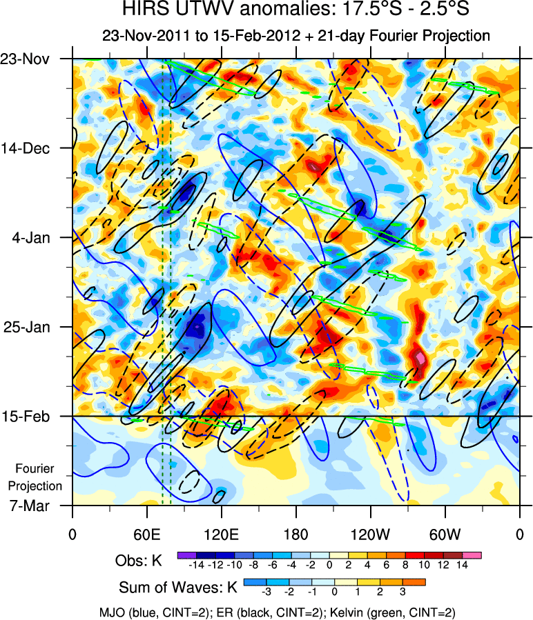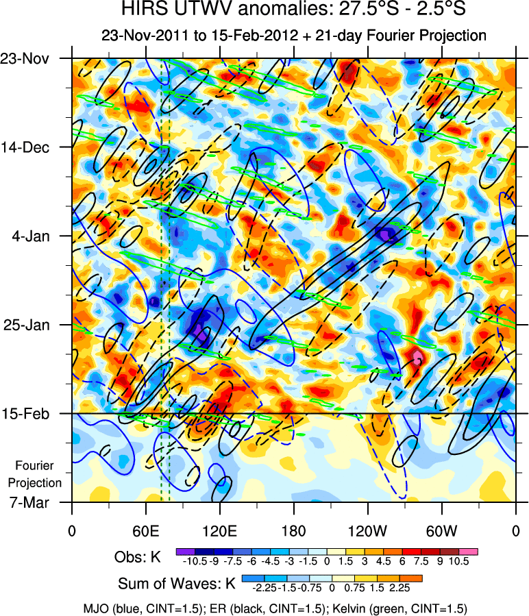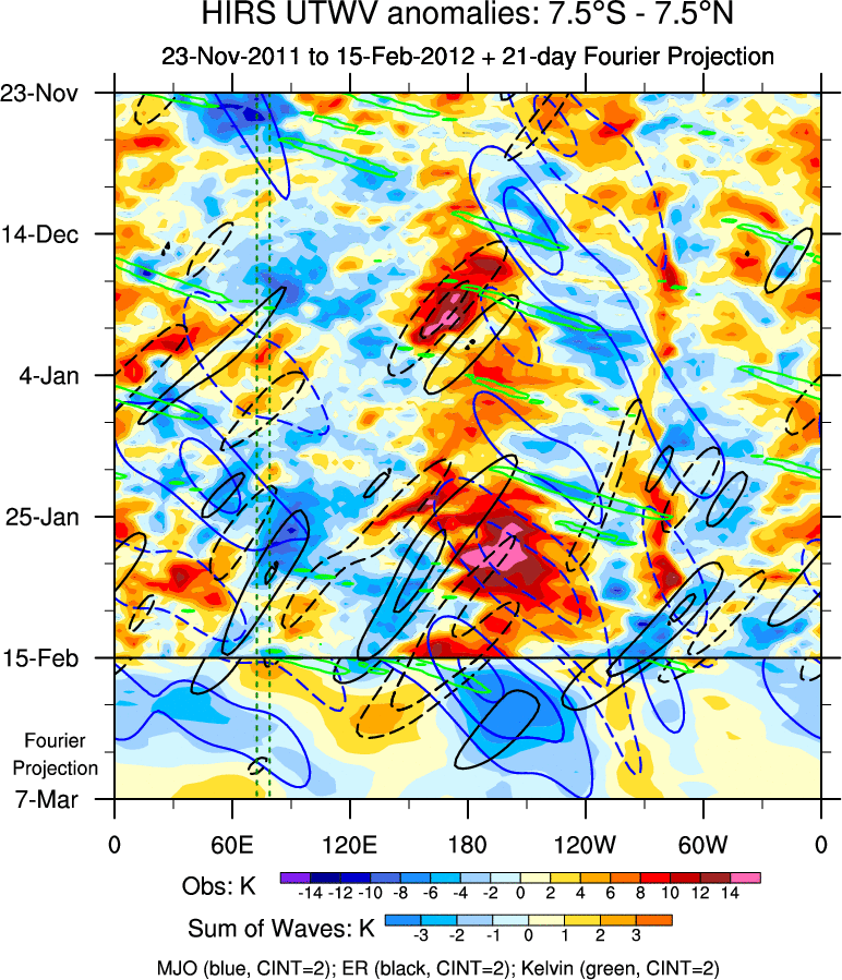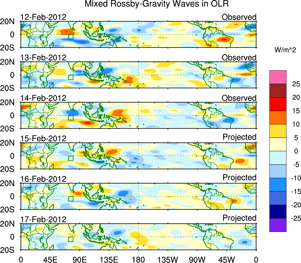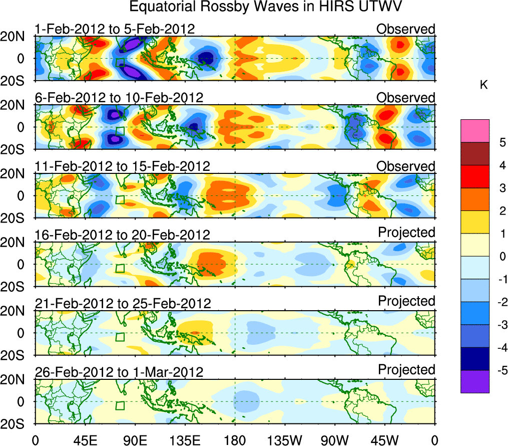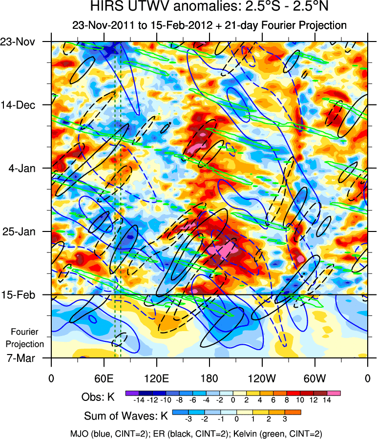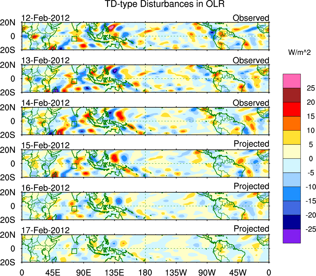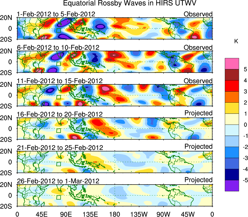To identify tropical waves in near real-time, the OLR and UTWV data are filtered following Wheeler & Weickmann (2001 MWR). The daily anomalies are calculated using the first 3 harmonics of the seasonal cycle for 1979–2009. Missing values are then filled using linear interpolation in space and time. The most recent 365 days of anomalies are padded with 659 days of zeroes, and the result is filtered for each wave type.