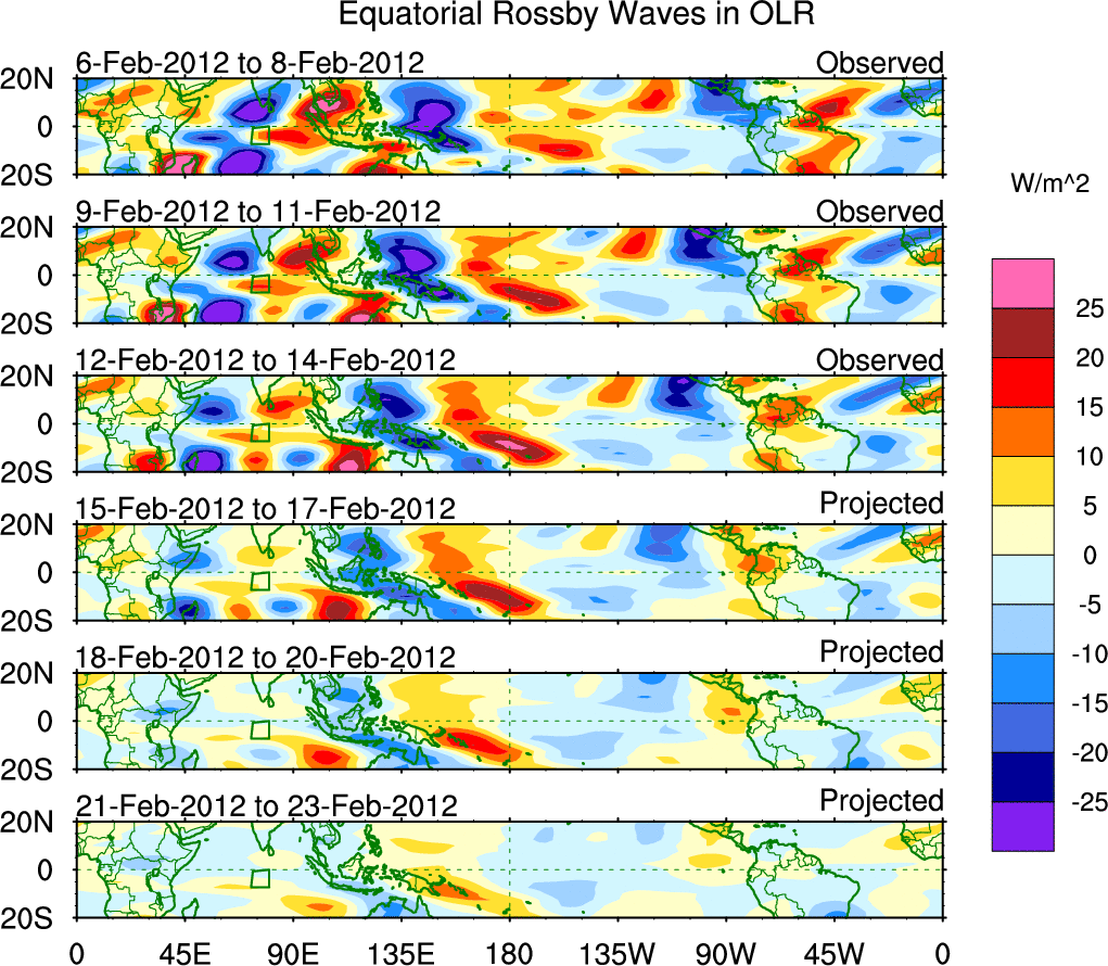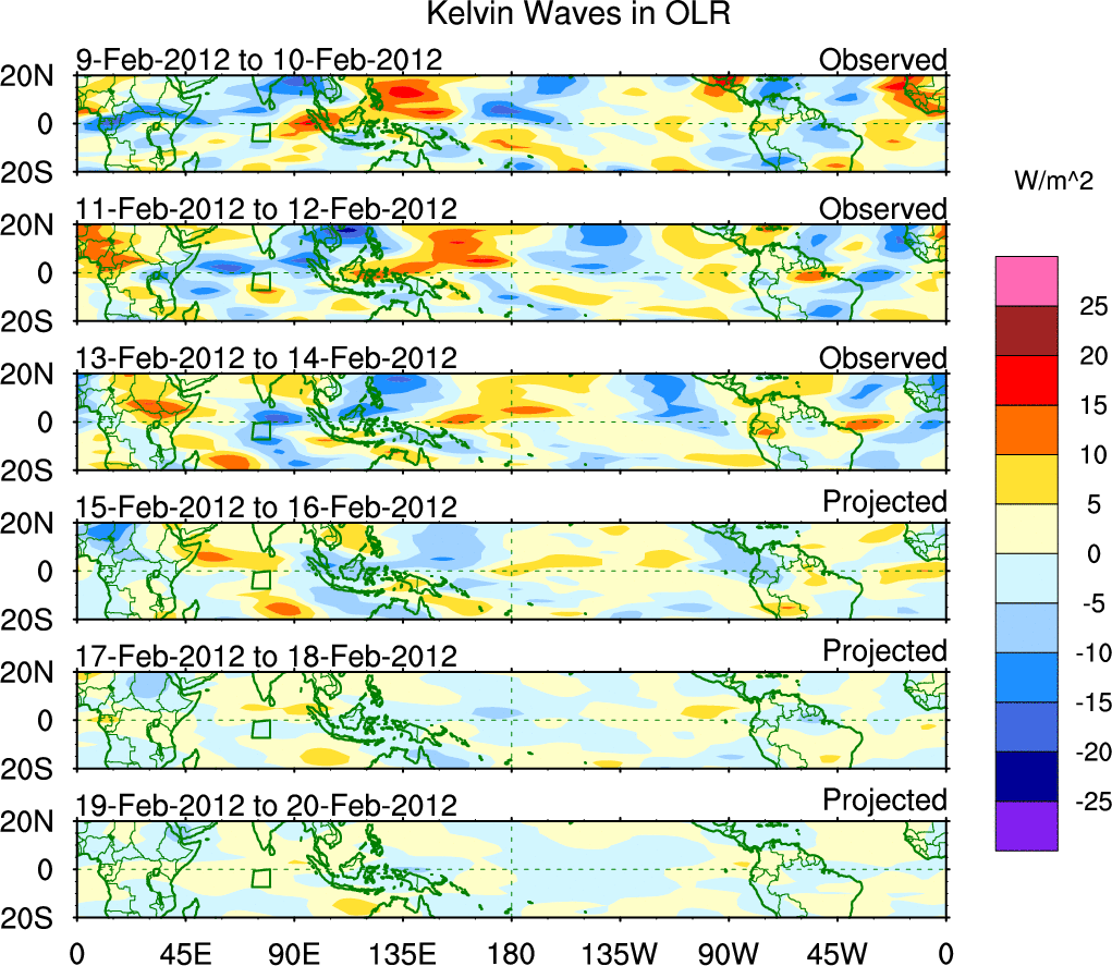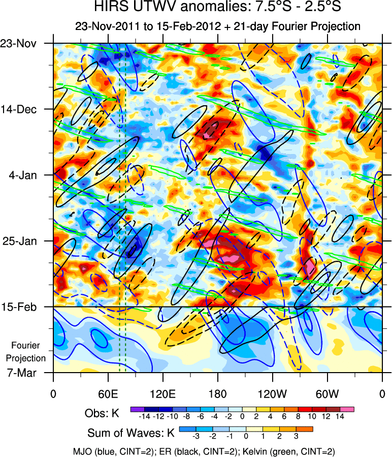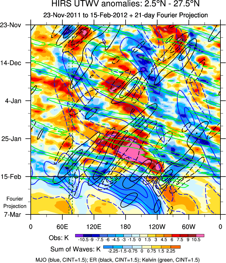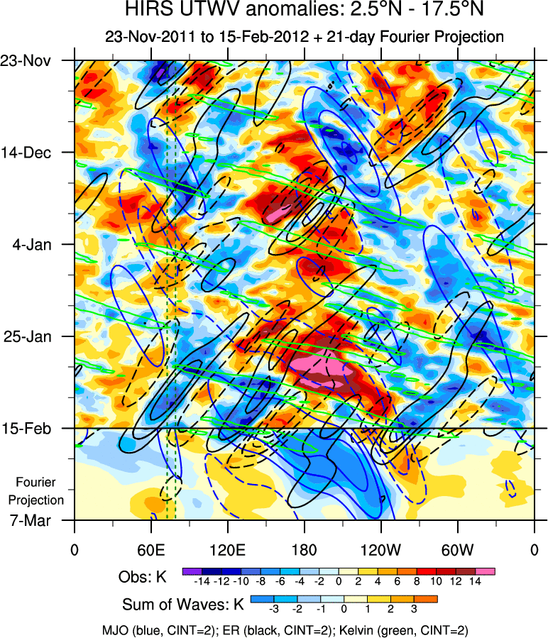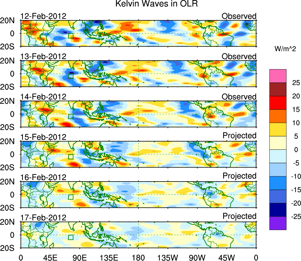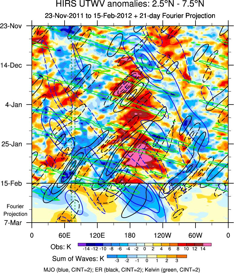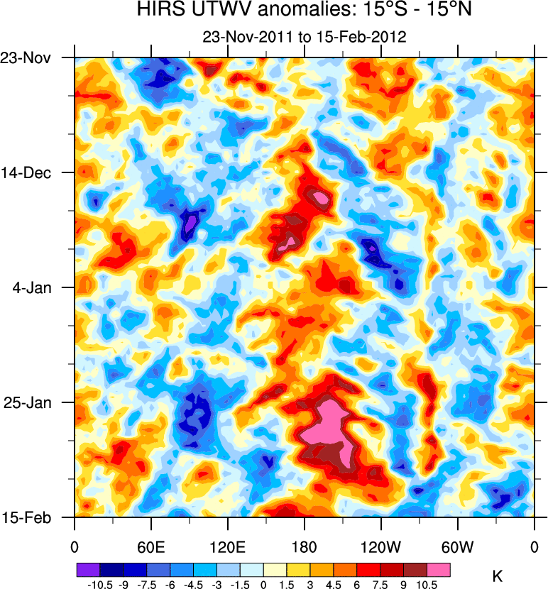 To identify tropical waves in near real-time, the OLR and UTWV data are filtered following Wheeler & Weickmann (2001 MWR). The daily anomalies are calculated using the first 3 harmonics of the seasonal cycle for 1979–2009. Missing values are then filled using linear interpolation in space and time. The most recent 365 days of anomalies are padded with 659 days of zeroes, and the result is filtered for each wave type.