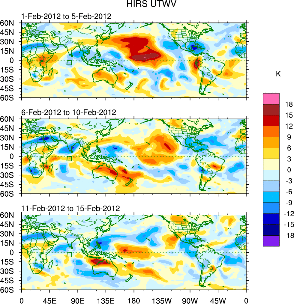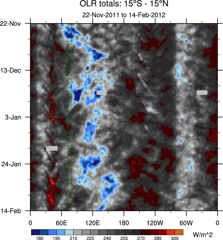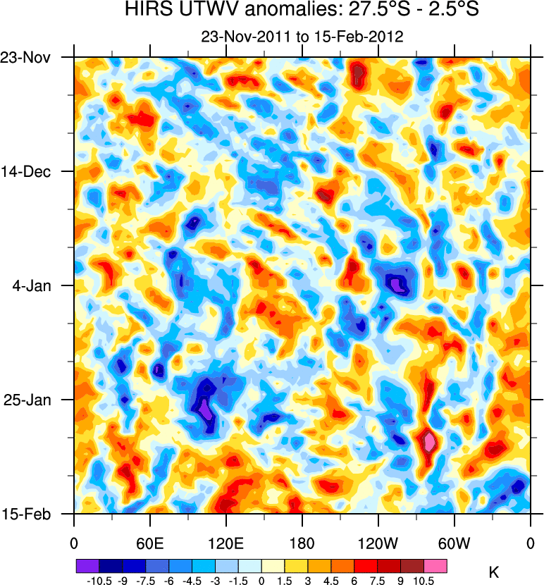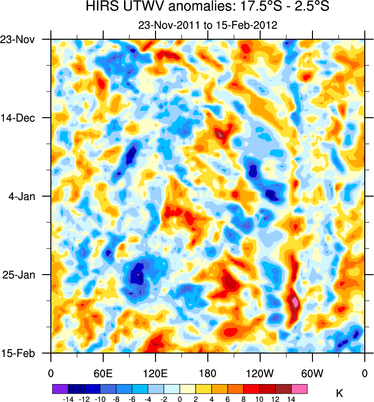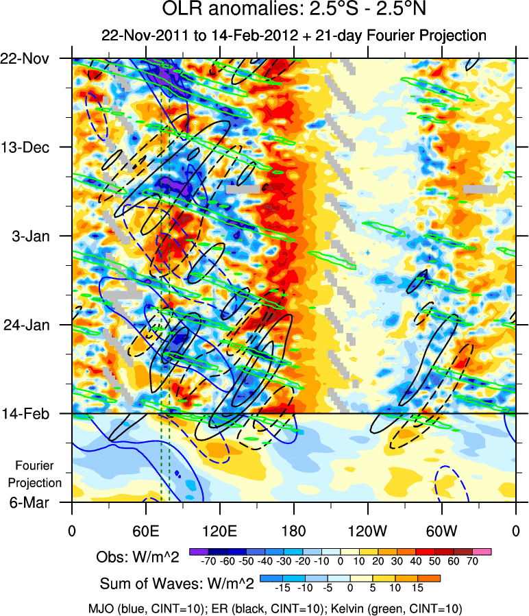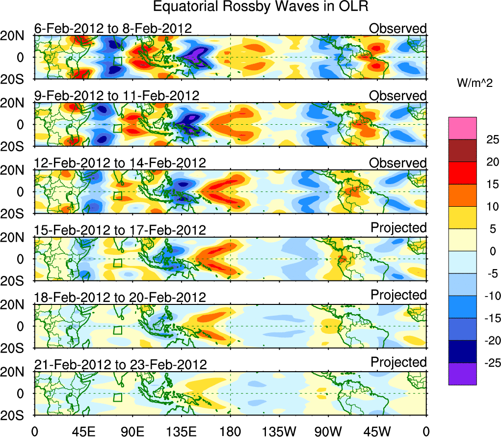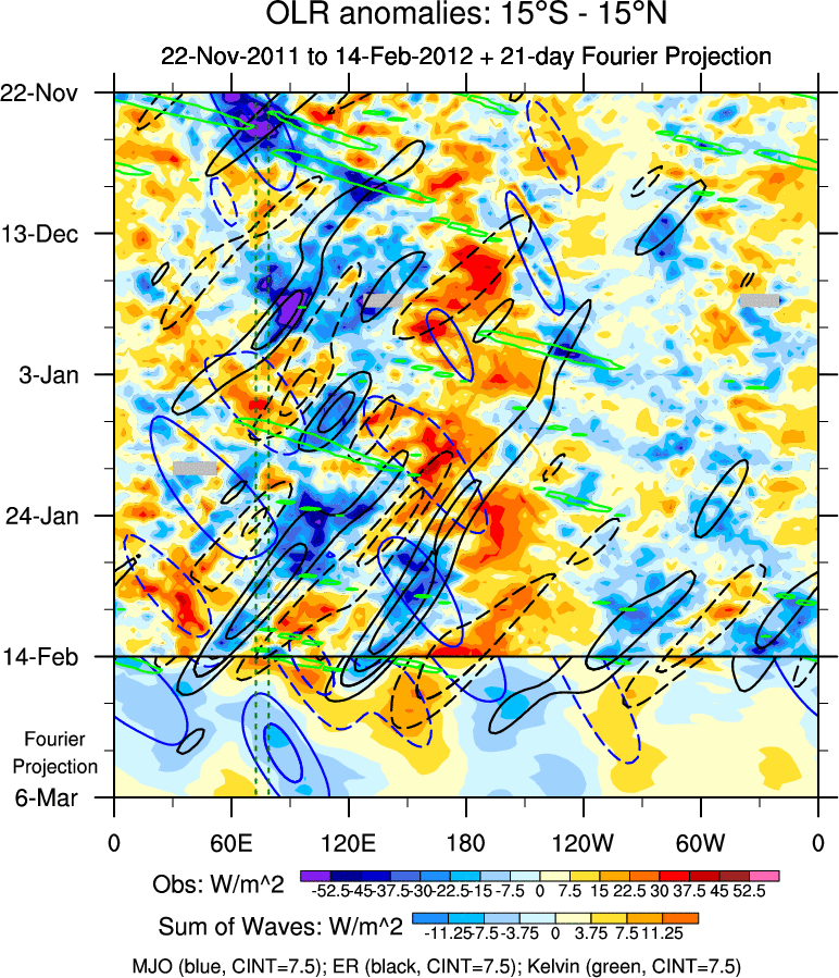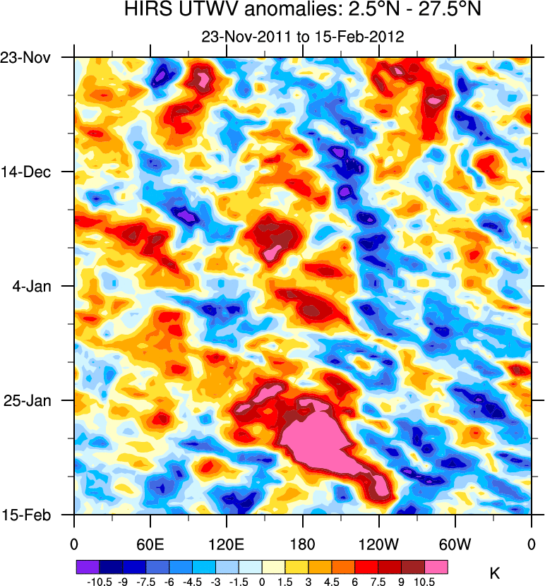 To identify tropical waves in near real-time, the OLR and UTWV data are filtered following Wheeler & Weickmann (2001 MWR). The daily anomalies are calculated using the first 3 harmonics of the seasonal cycle for 1979–2009. Missing values are then filled using linear interpolation in space and time. The most recent 365 days of anomalies are padded with 659 days of zeroes, and the result is filtered for each wave type.