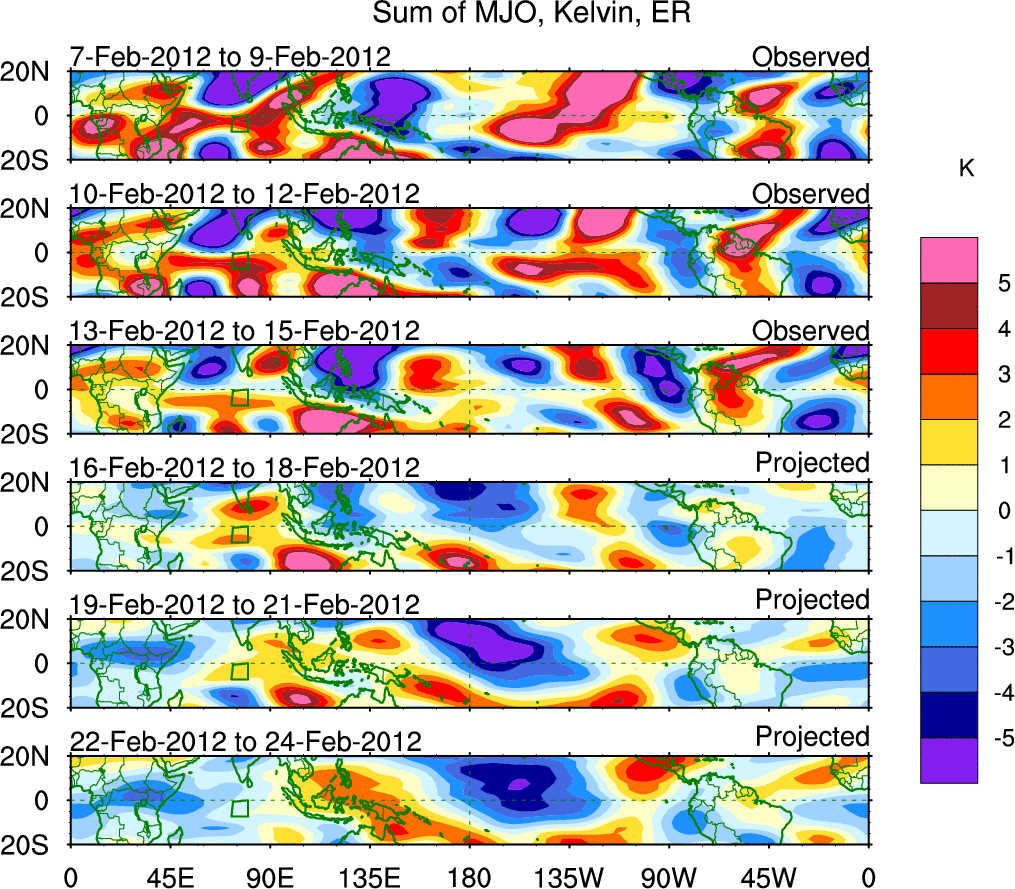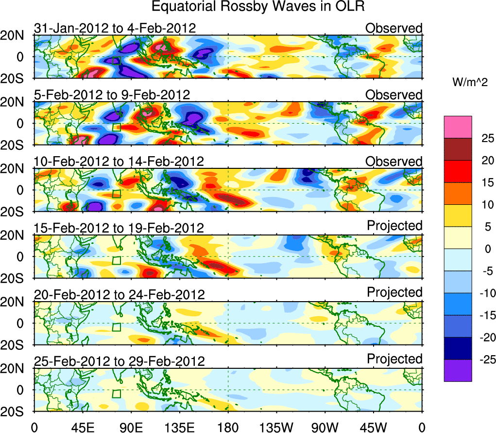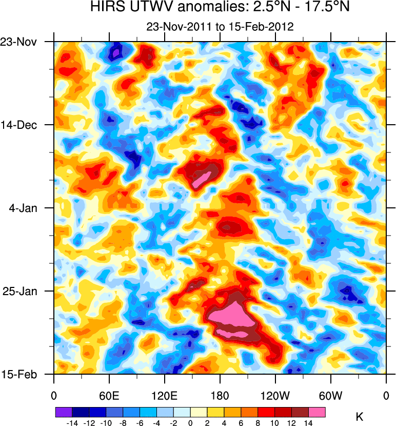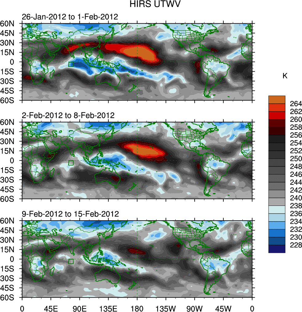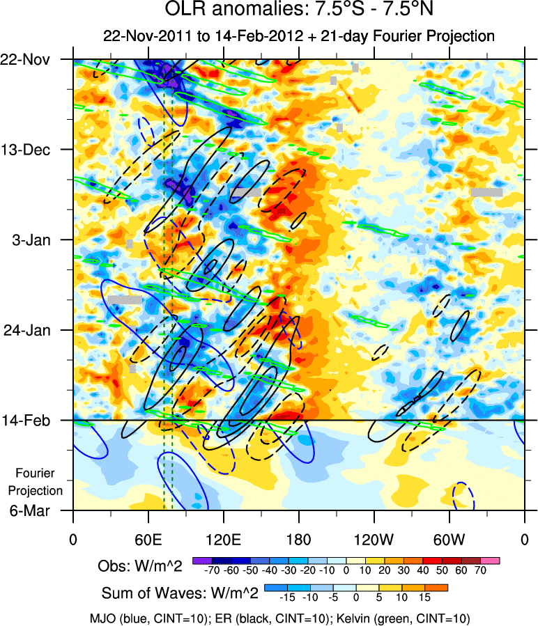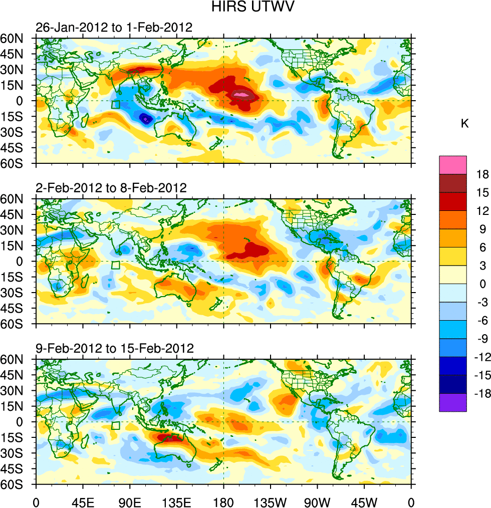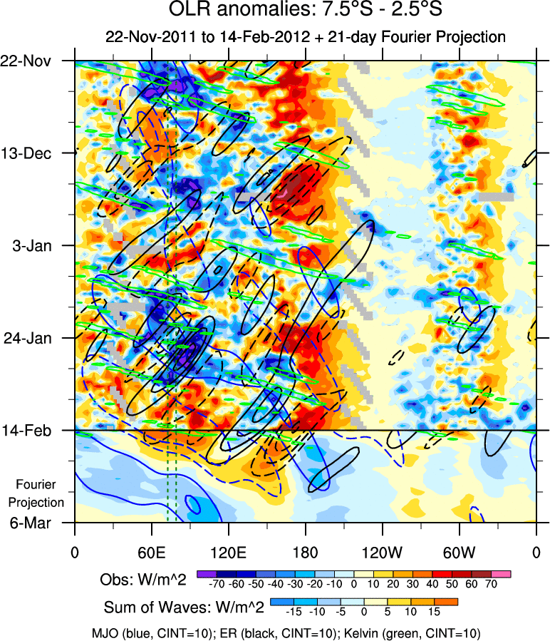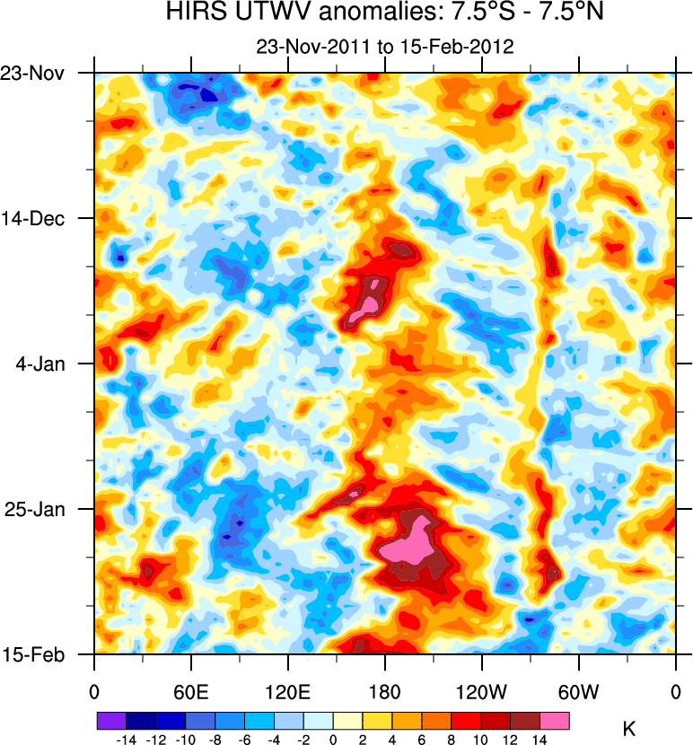 To identify tropical waves in near real-time, the OLR and UTWV data are filtered following Wheeler & Weickmann (2001 MWR). The daily anomalies are calculated using the first 3 harmonics of the seasonal cycle for 1979–2009. Missing values are then filled using linear interpolation in space and time. The most recent 365 days of anomalies are padded with 659 days of zeroes, and the result is filtered for each wave type.