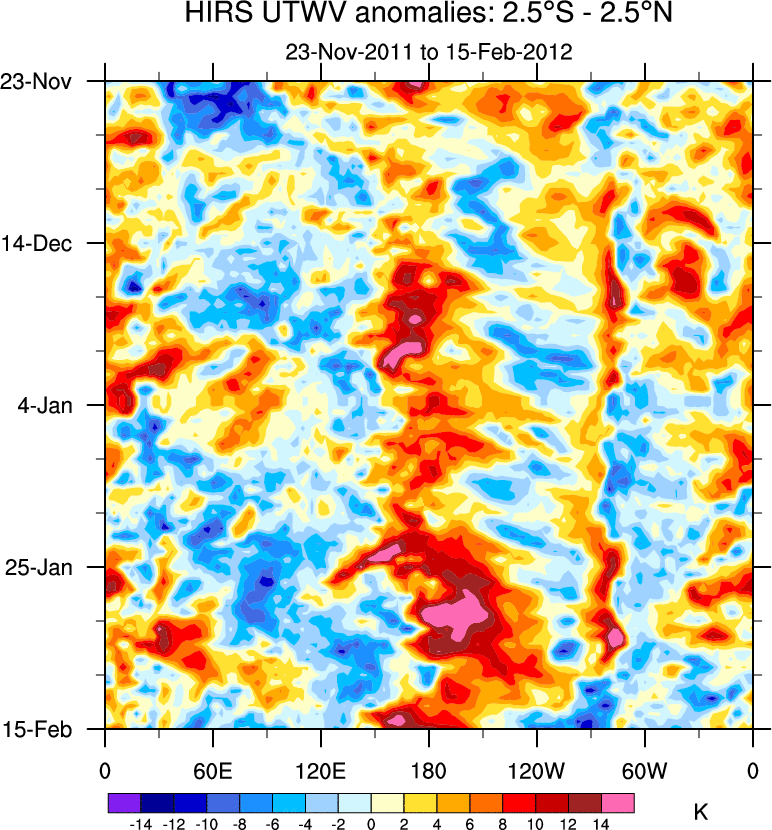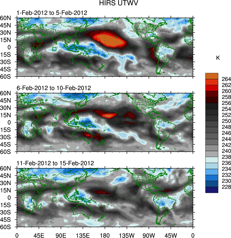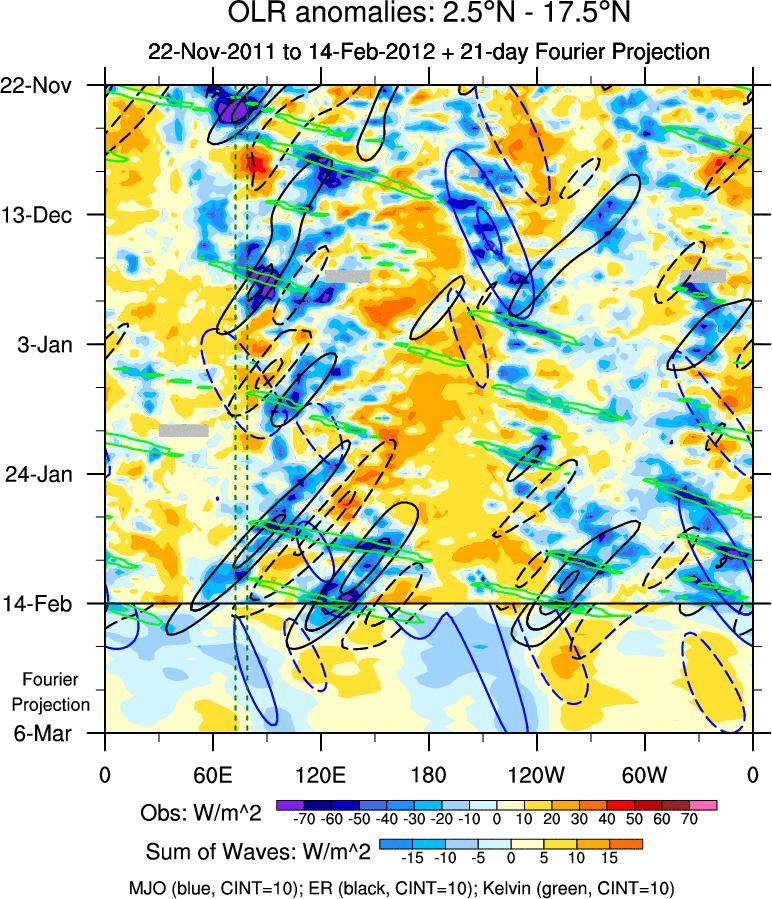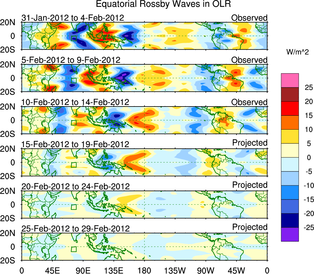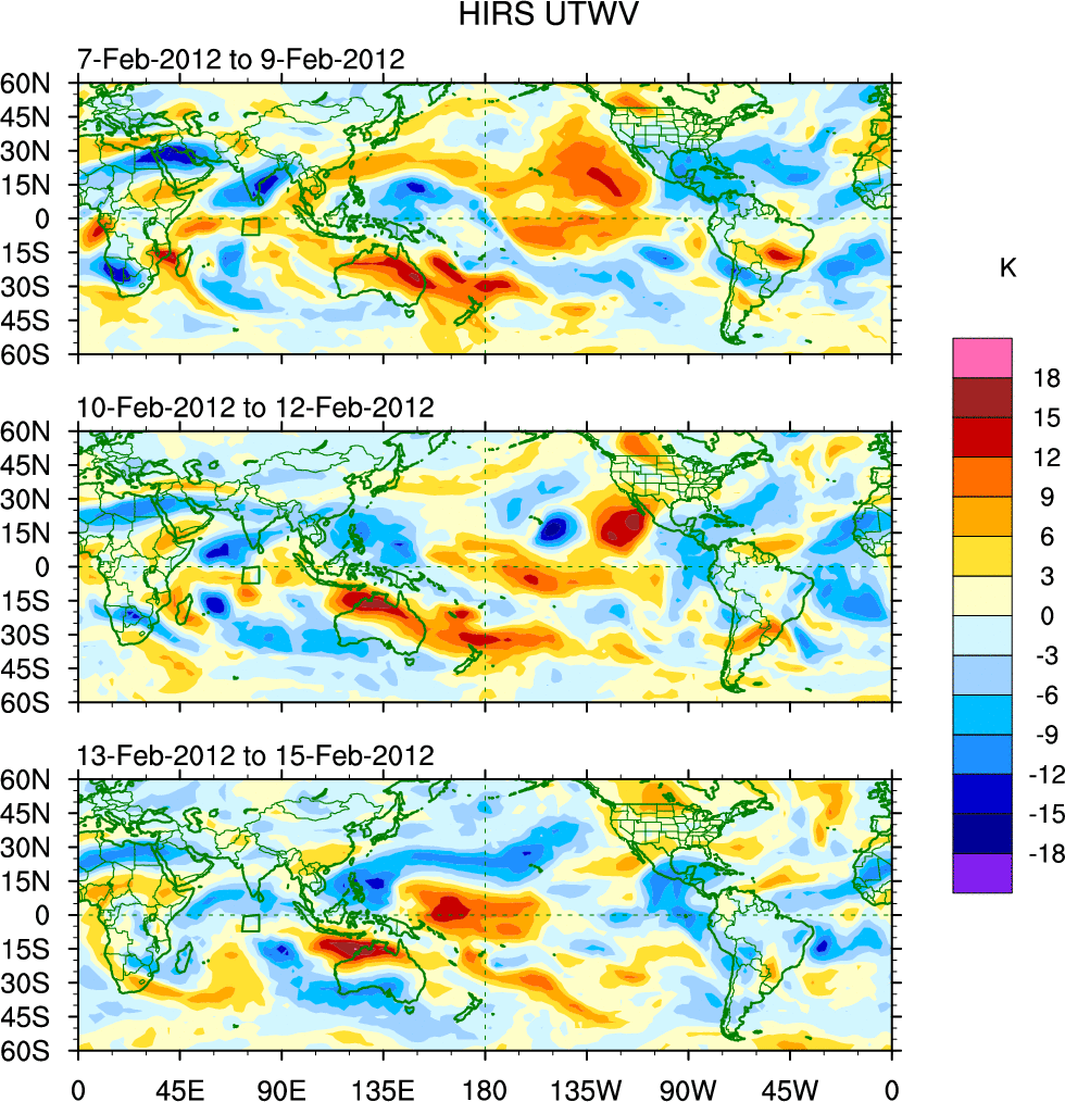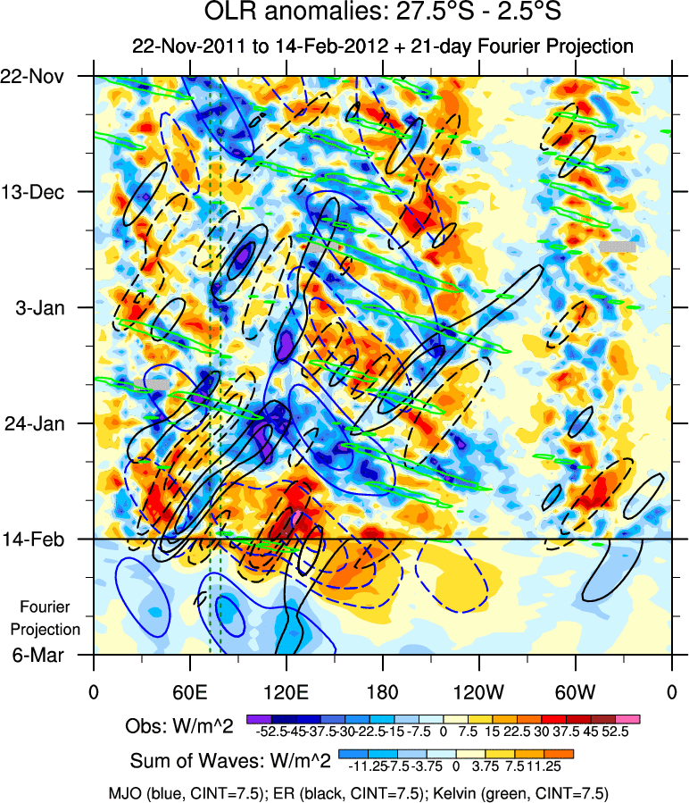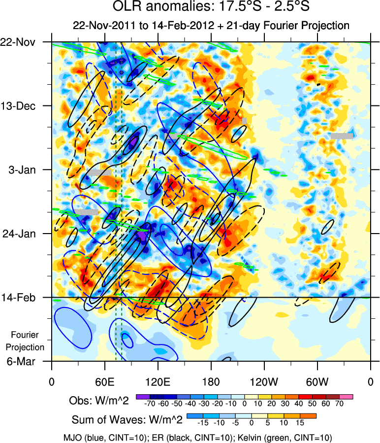 To identify tropical waves in near real-time, the OLR and UTWV data are filtered following Wheeler & Weickmann (2001 MWR). The daily anomalies are calculated using the first 3 harmonics of the seasonal cycle for 1979–2009. Missing values are then filled using linear interpolation in space and time. The most recent 365 days of anomalies are padded with 659 days of zeroes, and the result is filtered for each wave type.