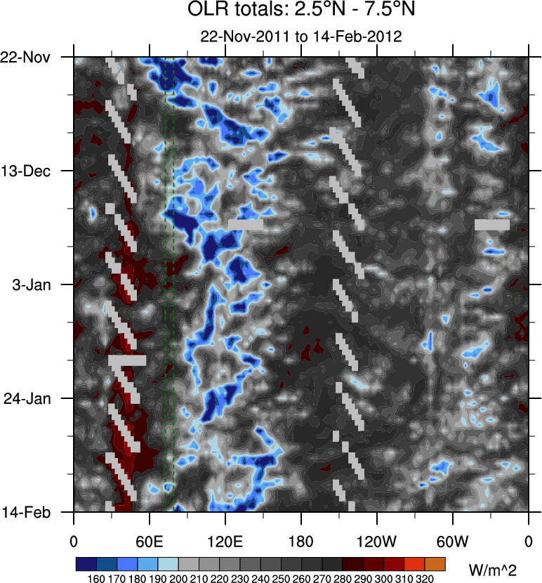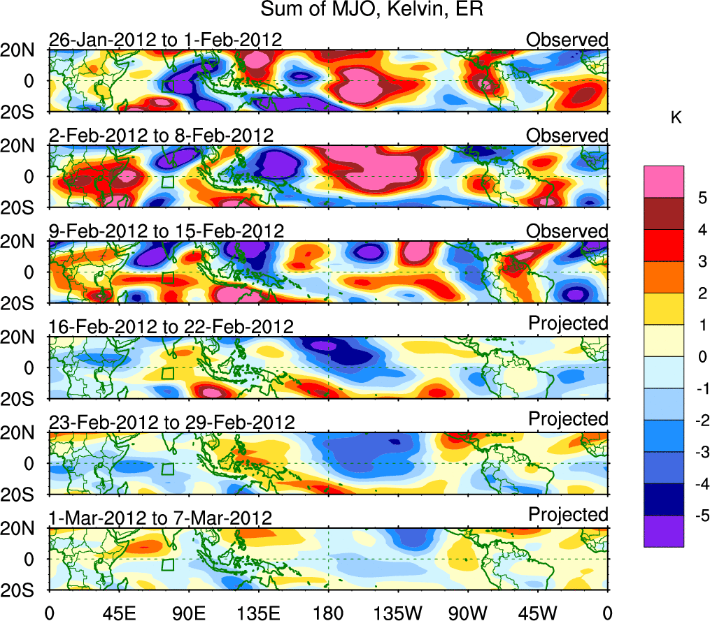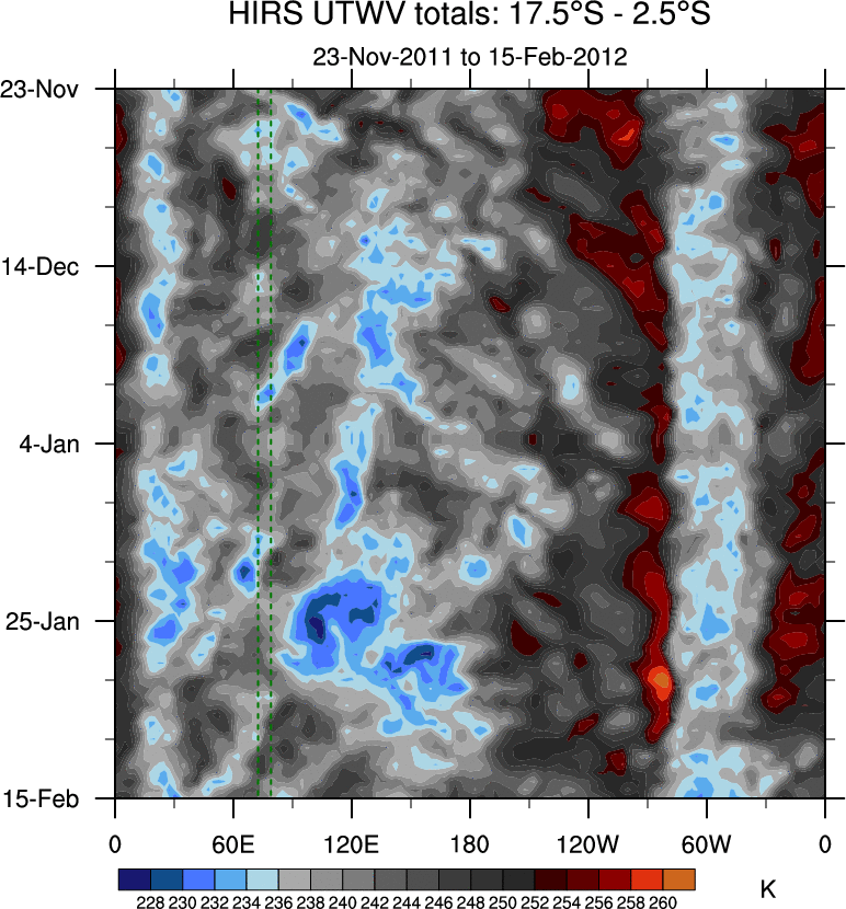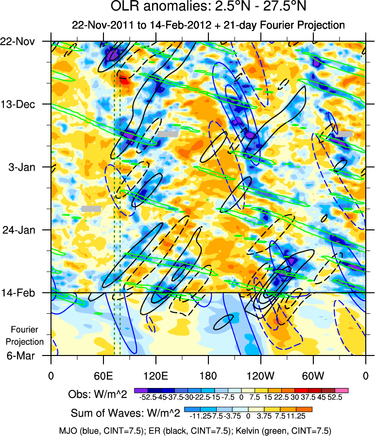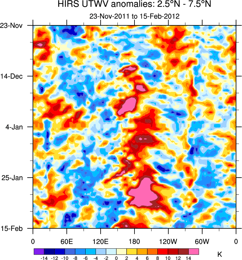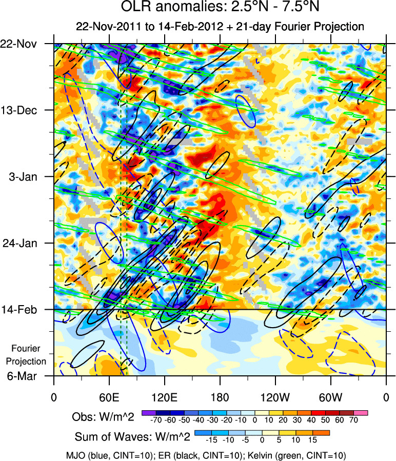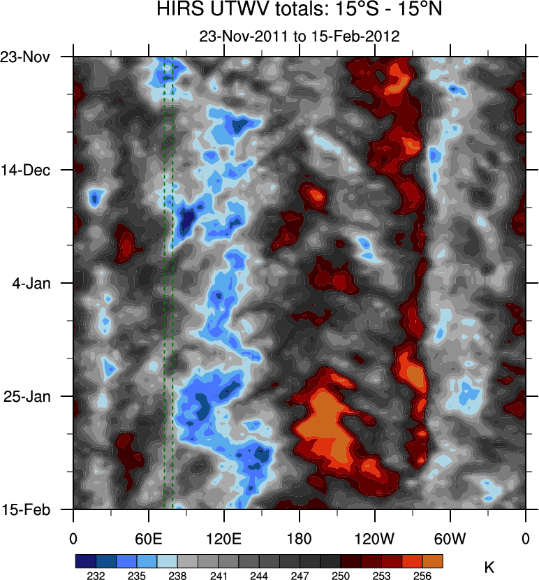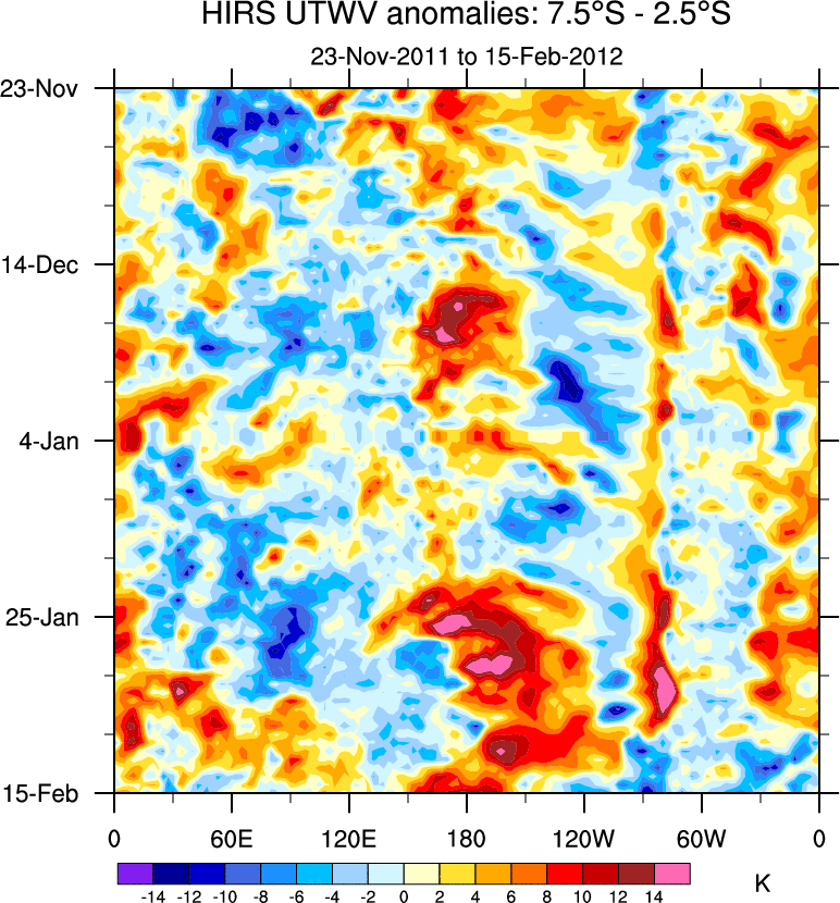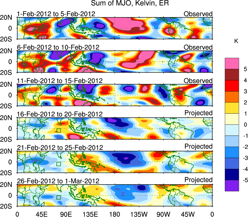 To identify tropical waves in near real-time, the OLR and UTWV data are filtered following Wheeler & Weickmann (2001 MWR). The daily anomalies are calculated using the first 3 harmonics of the seasonal cycle for 1979–2009. Missing values are then filled using linear interpolation in space and time. The most recent 365 days of anomalies are padded with 659 days of zeroes, and the result is filtered for each wave type.