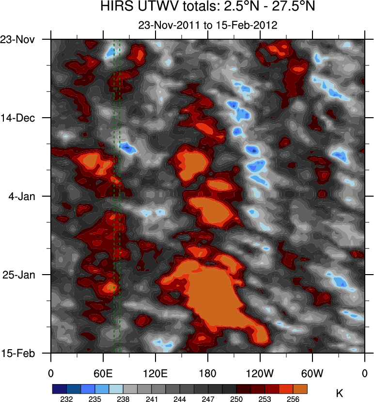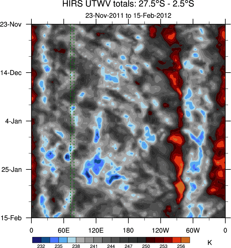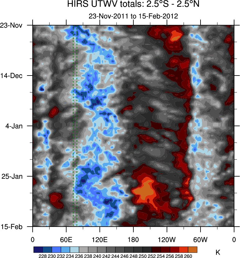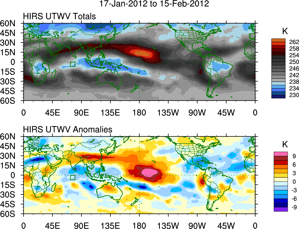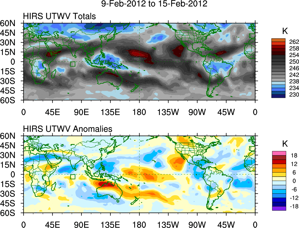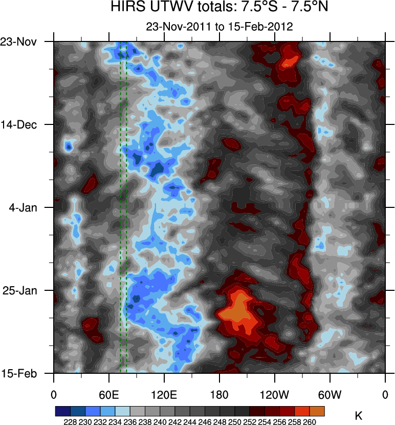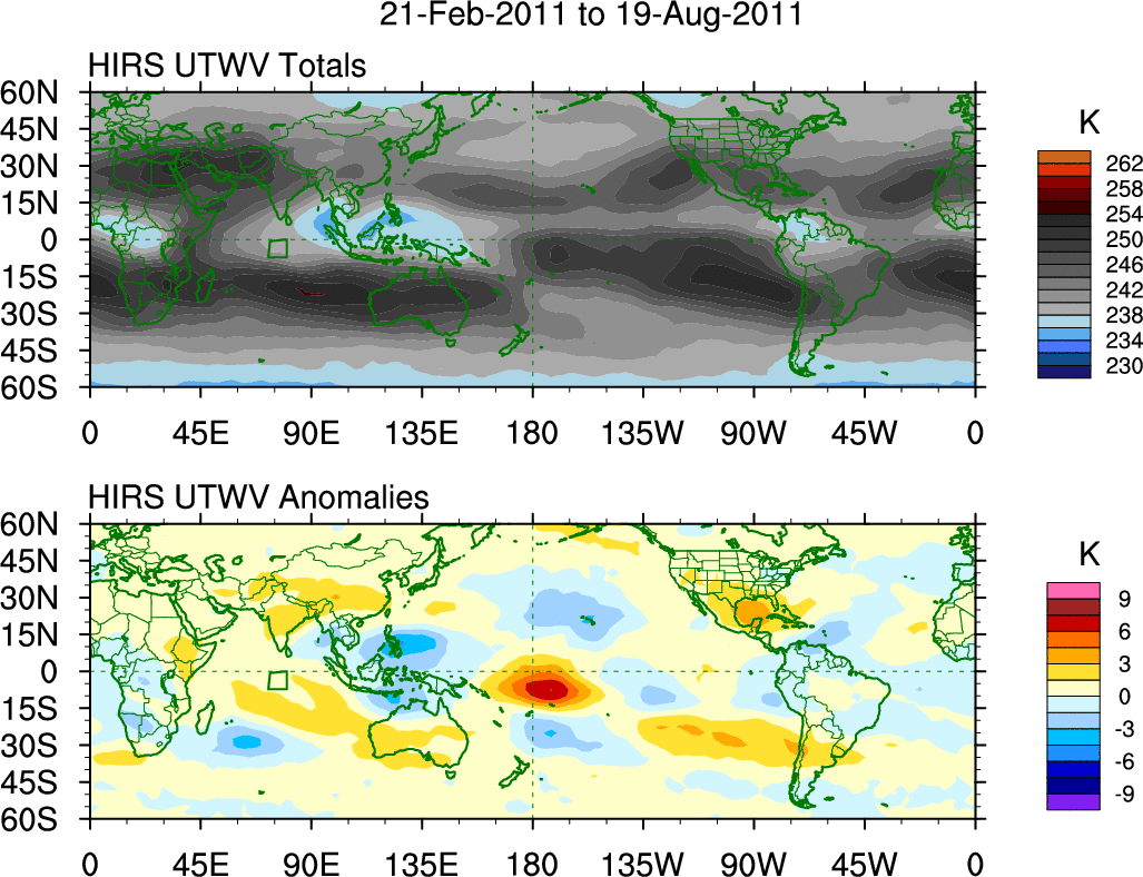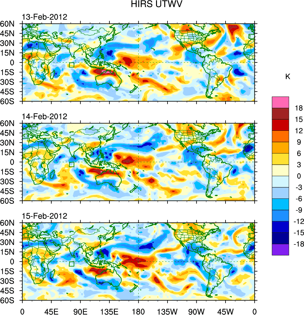 To identify tropical waves in near real-time, the OLR and UTWV data are filtered following Wheeler & Weickmann (2001 MWR). The daily anomalies are calculated using the first 3 harmonics of the seasonal cycle for 1979–2009. Missing values are then filled using linear interpolation in space and time. The most recent 365 days of anomalies are padded with 659 days of zeroes, and the result is filtered for each wave type.