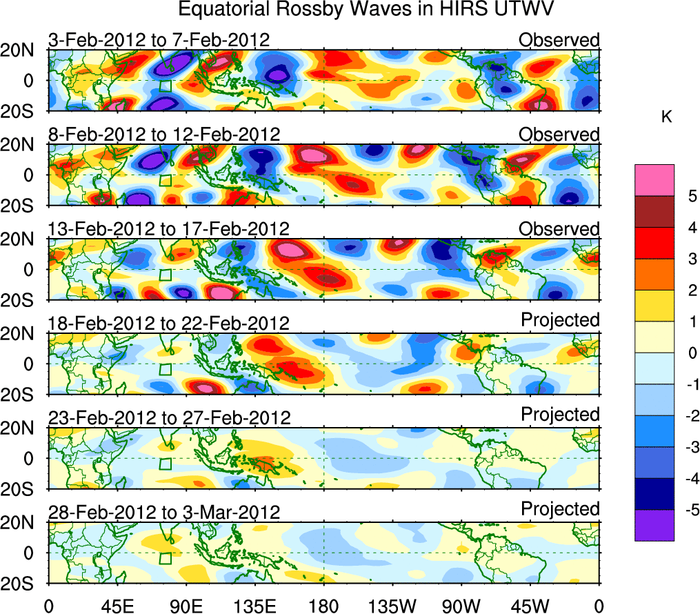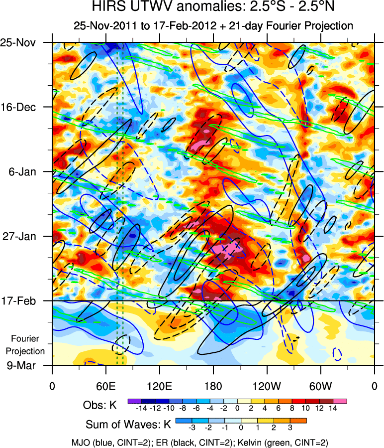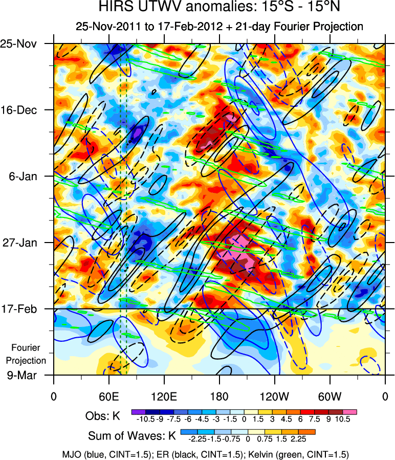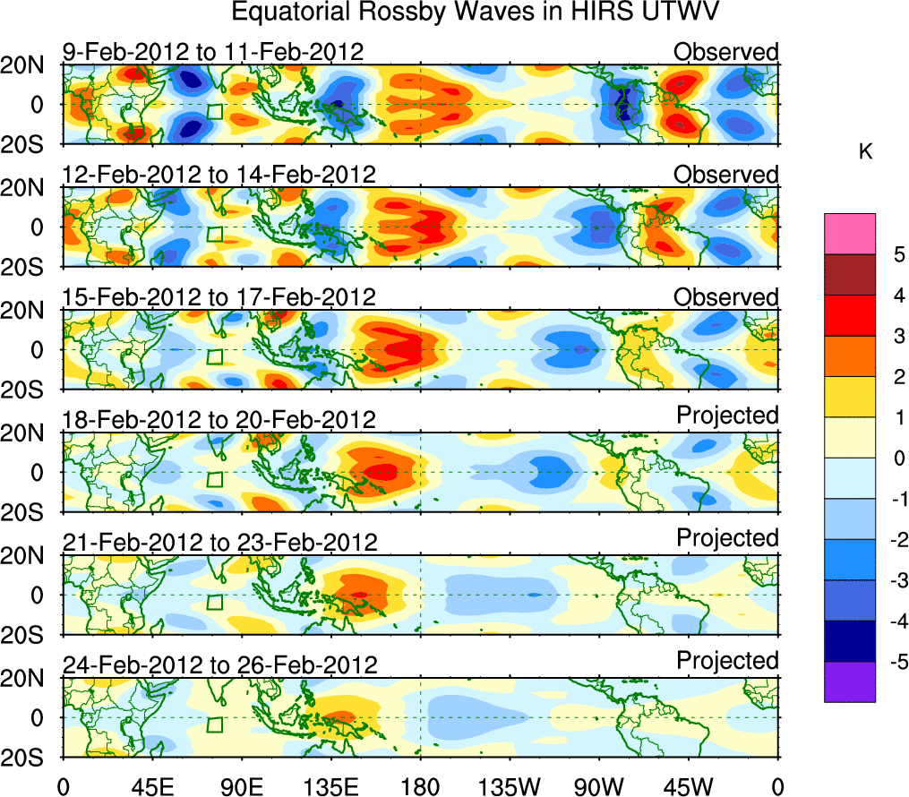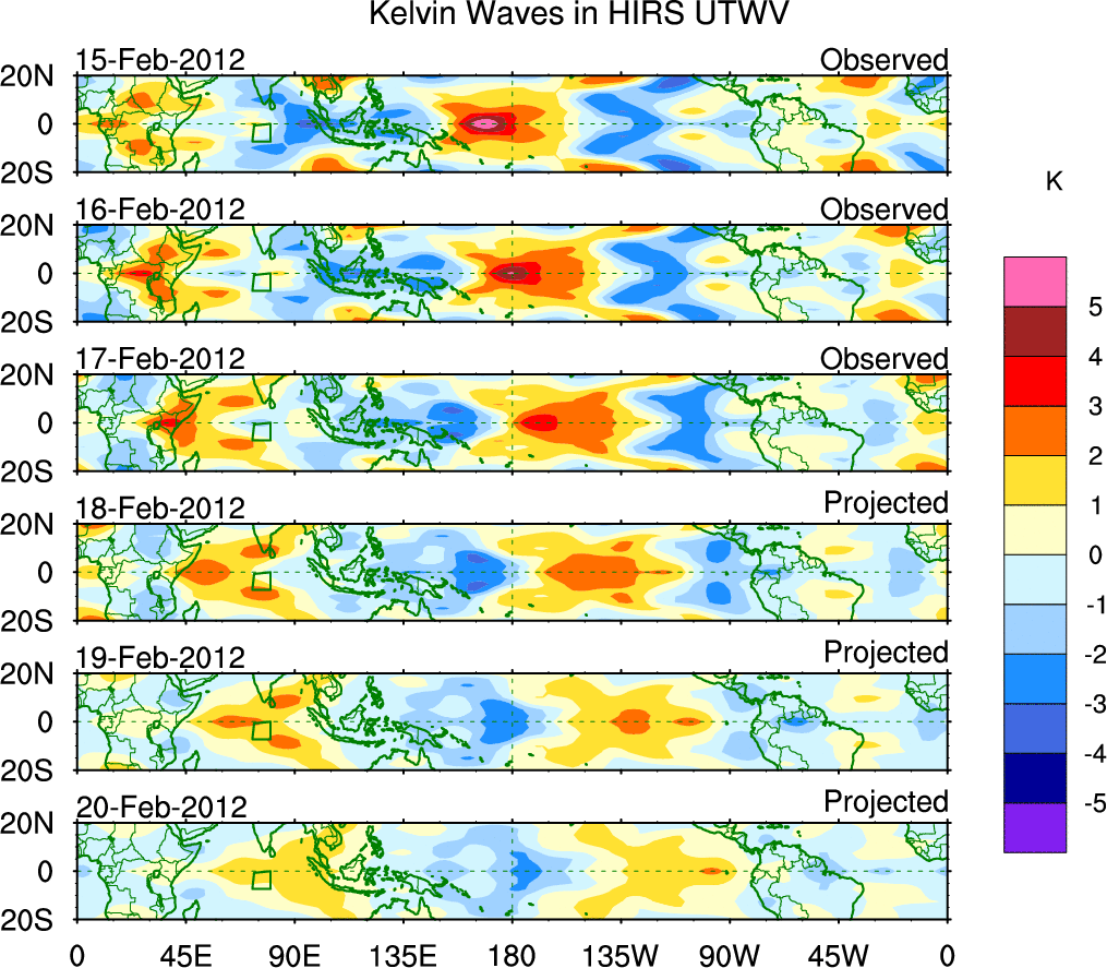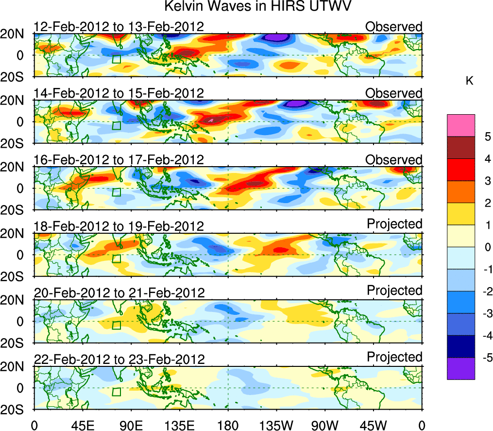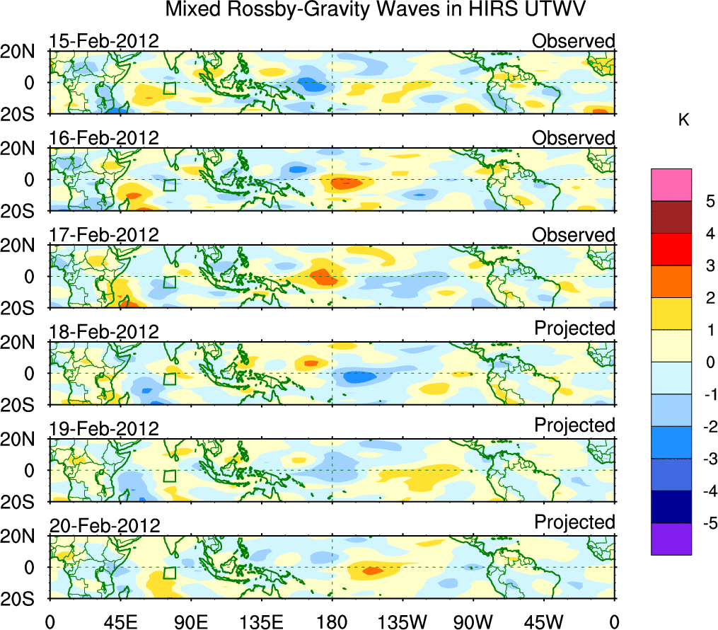 To identify tropical waves in near real-time, the OLR and UTWV data are filtered following Wheeler & Weickmann (2001 MWR). The daily anomalies are calculated using the first 3 harmonics of the seasonal cycle for 1979–2009. Missing values are then filled using linear interpolation in space and time. The most recent 365 days of anomalies are padded with 659 days of zeroes, and the result is filtered for each wave type.