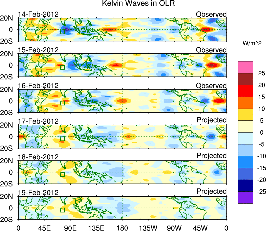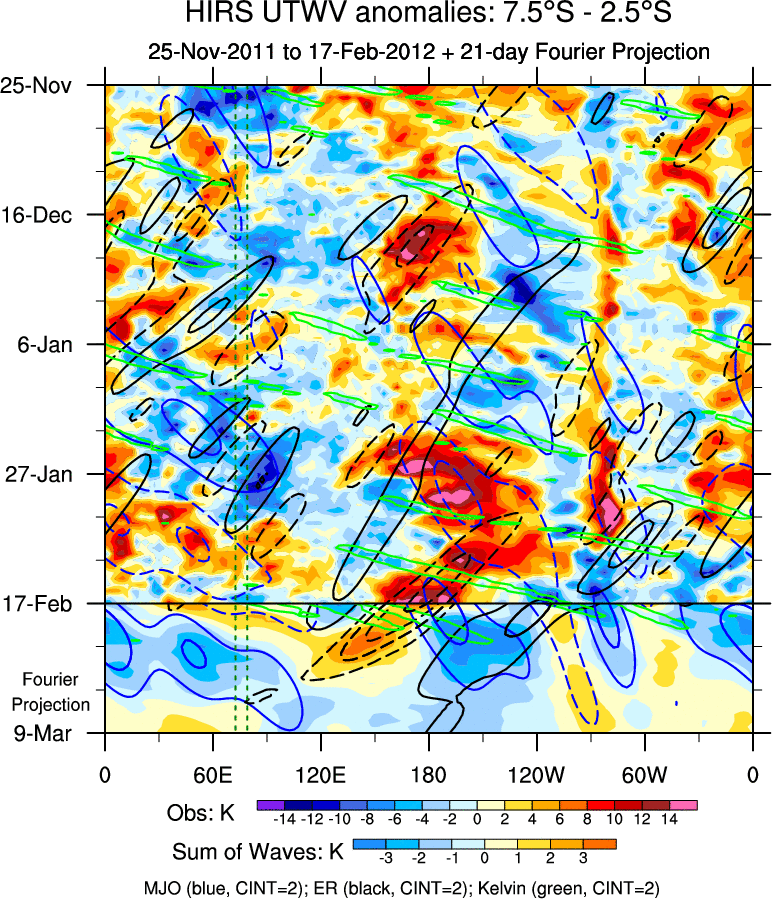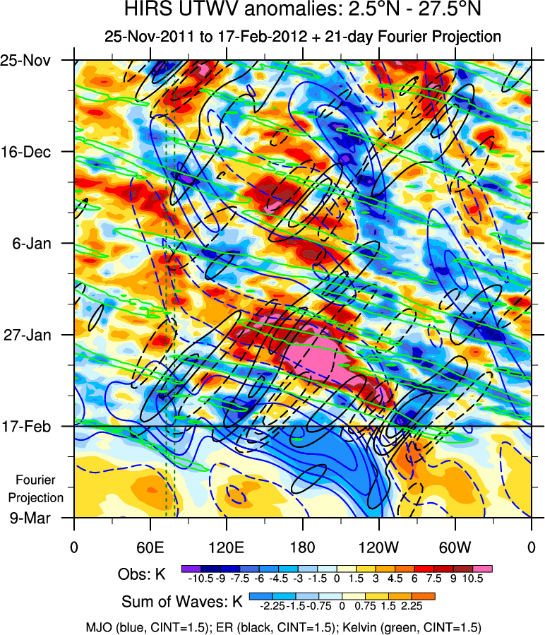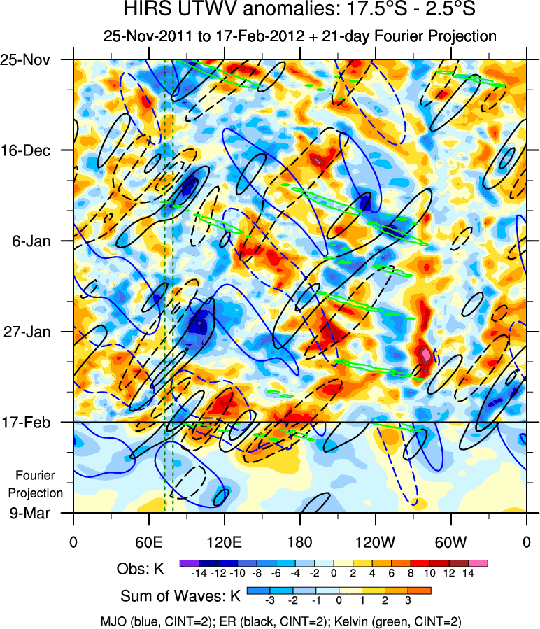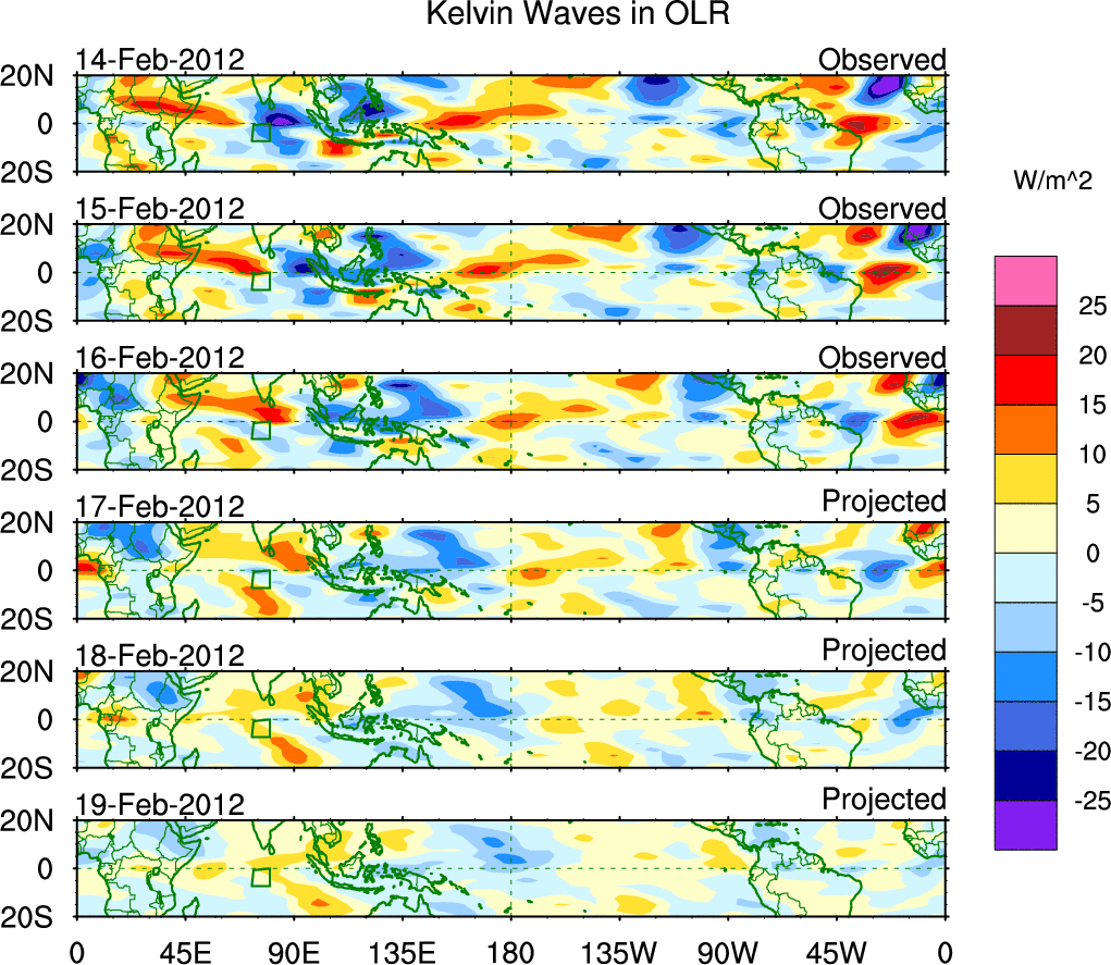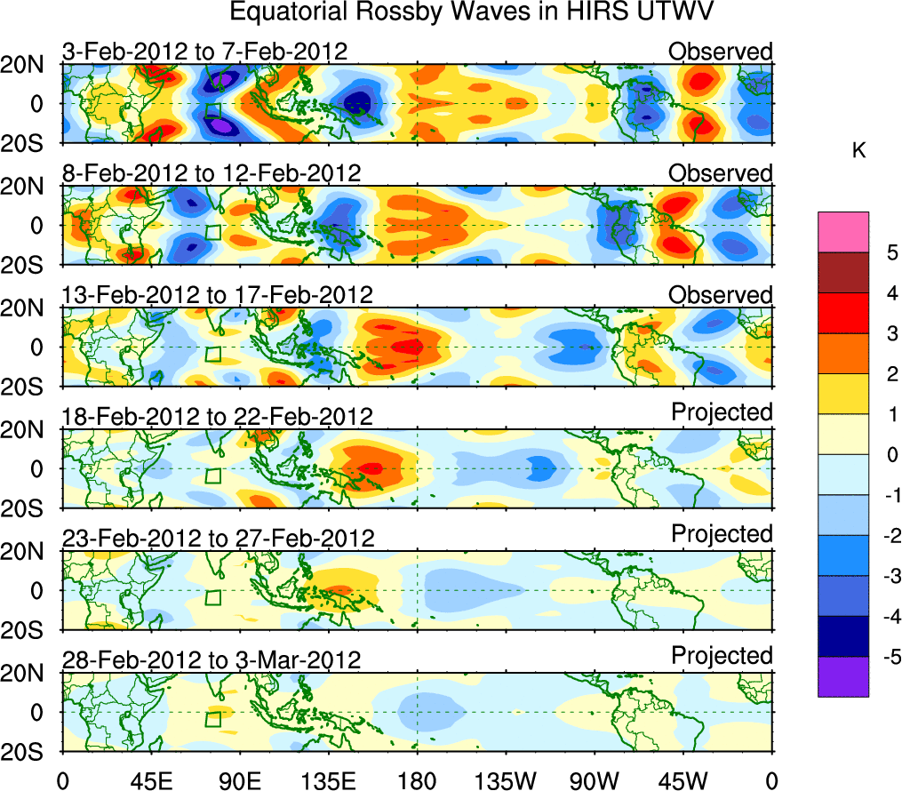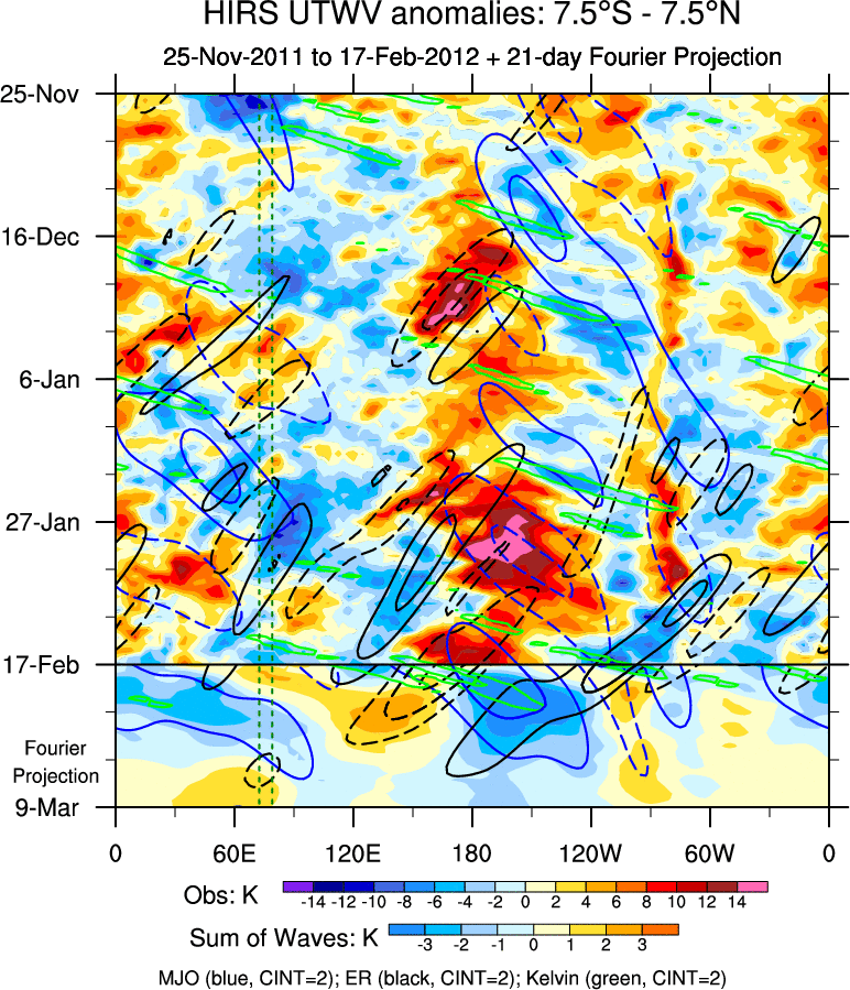 To identify tropical waves in near real-time, the OLR and UTWV data are filtered following Wheeler & Weickmann (2001 MWR). The daily anomalies are calculated using the first 3 harmonics of the seasonal cycle for 1979–2009. Missing values are then filled using linear interpolation in space and time. The most recent 365 days of anomalies are padded with 659 days of zeroes, and the result is filtered for each wave type.