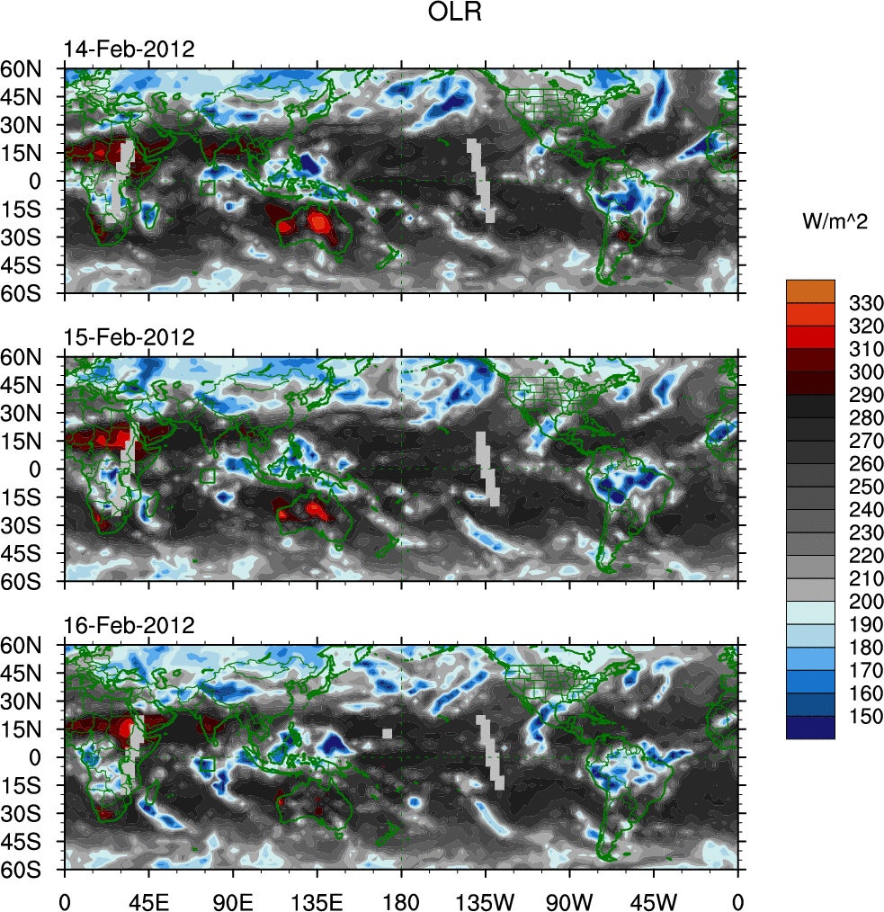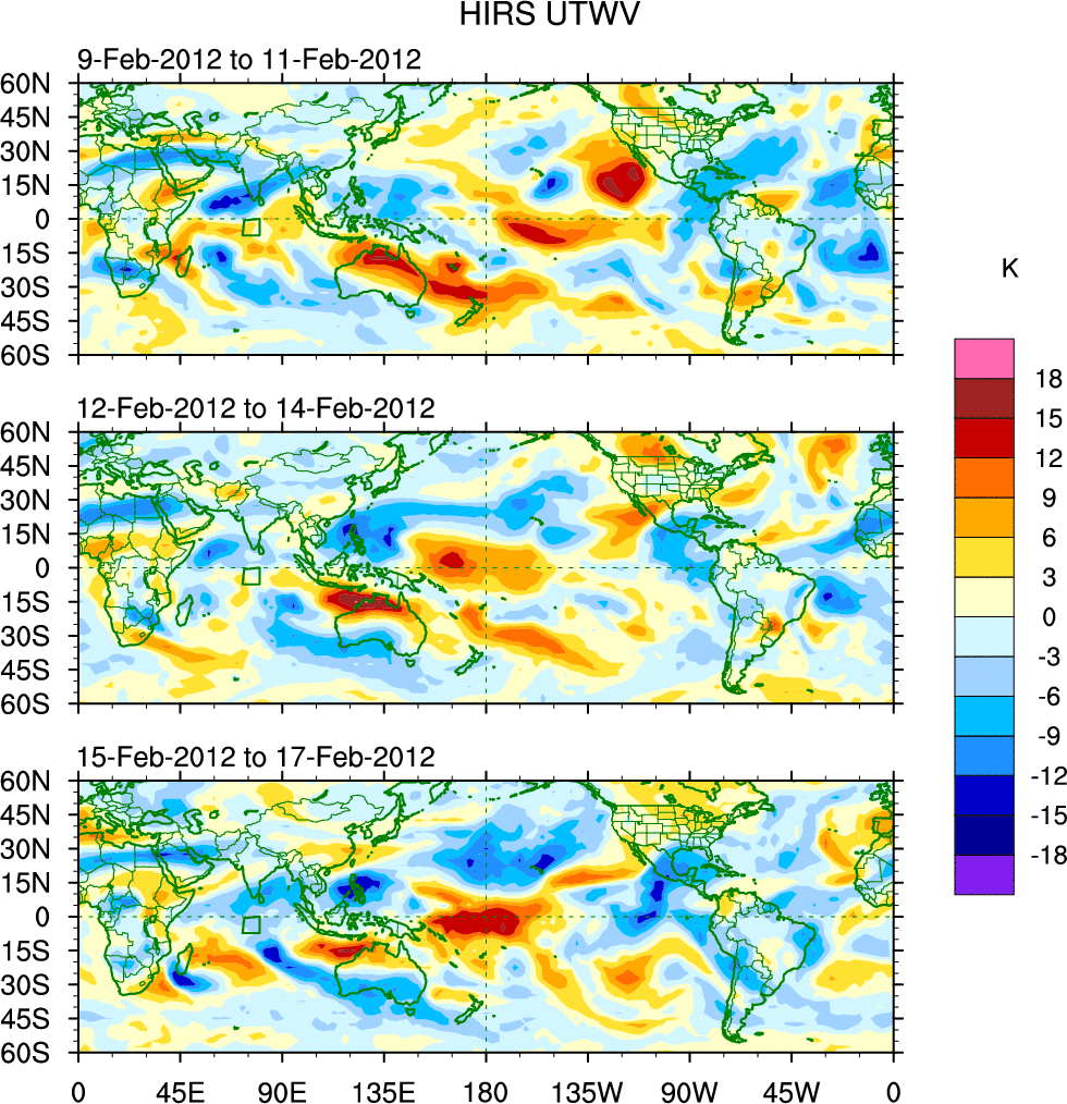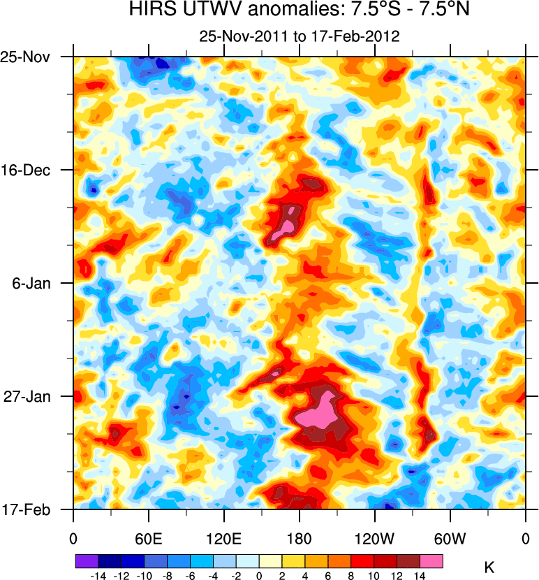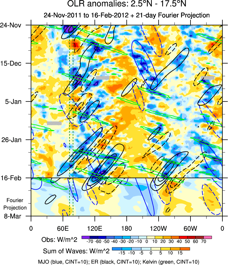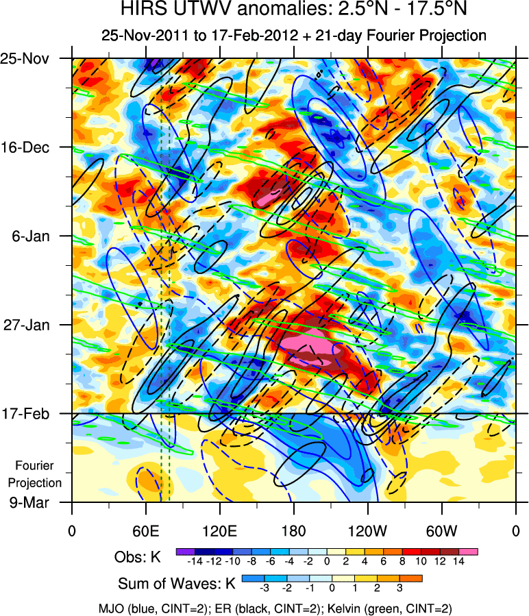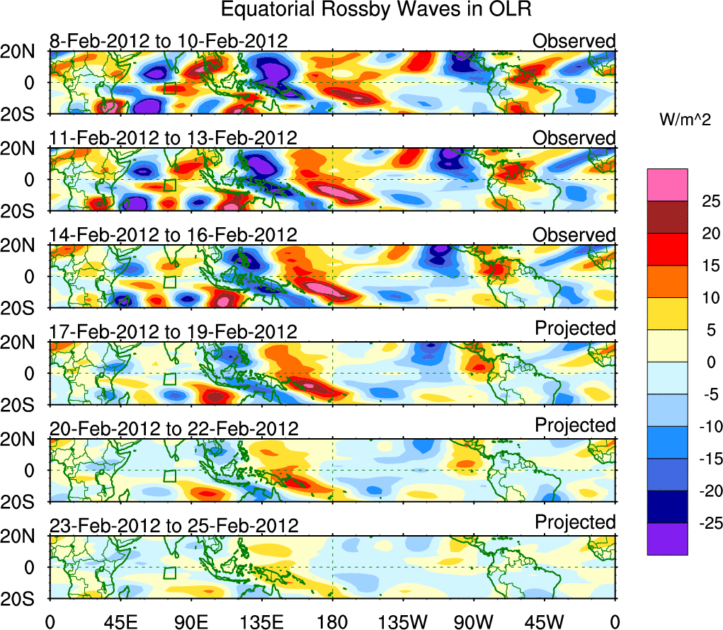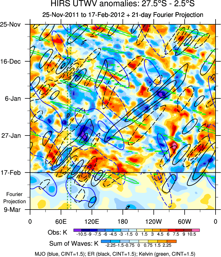 To identify tropical waves in near real-time, the OLR and UTWV data are filtered following Wheeler & Weickmann (2001 MWR). The daily anomalies are calculated using the first 3 harmonics of the seasonal cycle for 1979–2009. Missing values are then filled using linear interpolation in space and time. The most recent 365 days of anomalies are padded with 659 days of zeroes, and the result is filtered for each wave type.