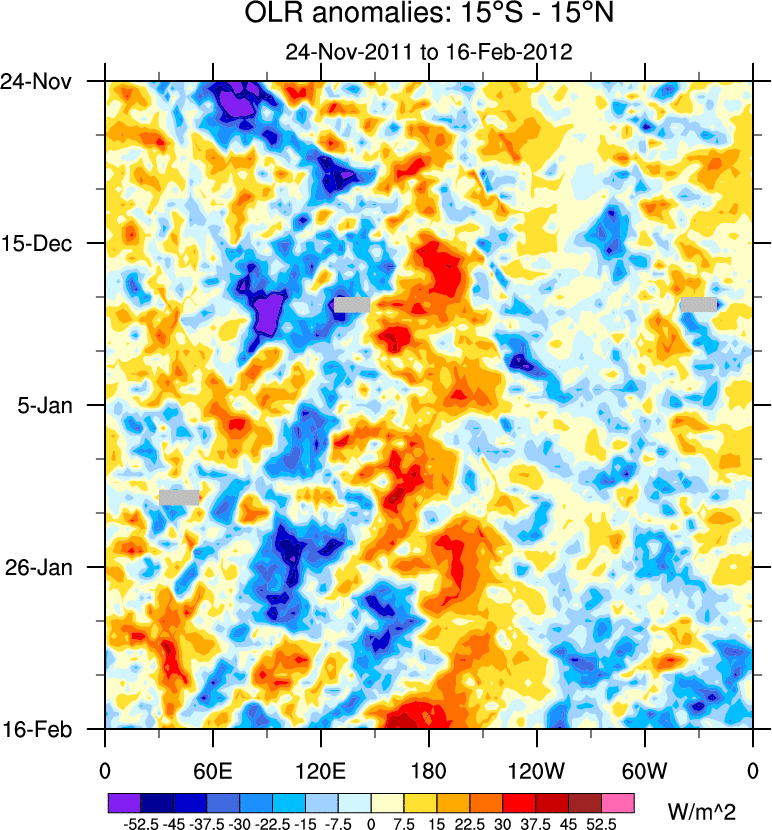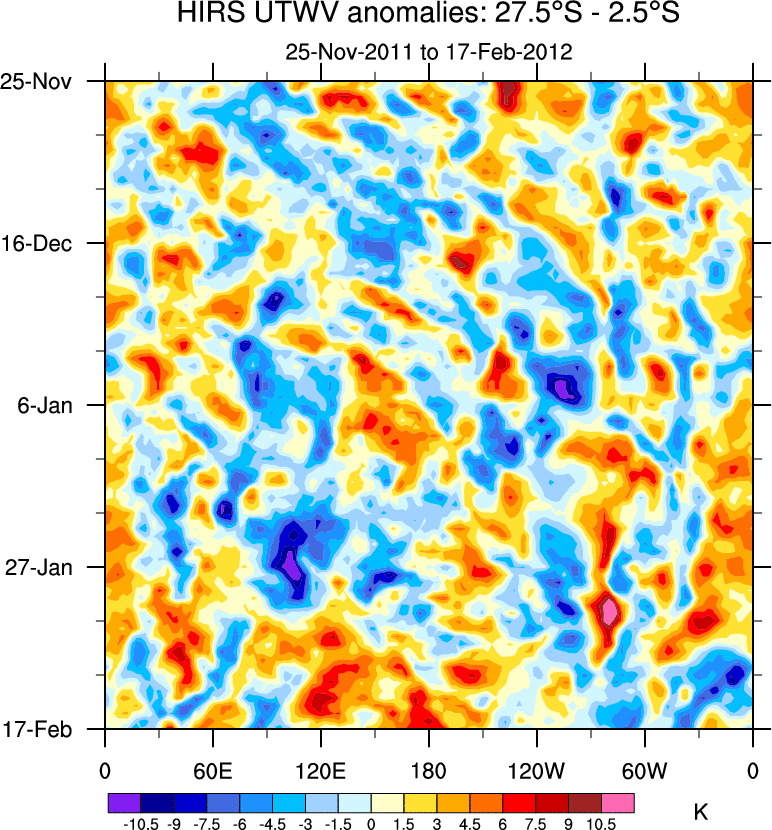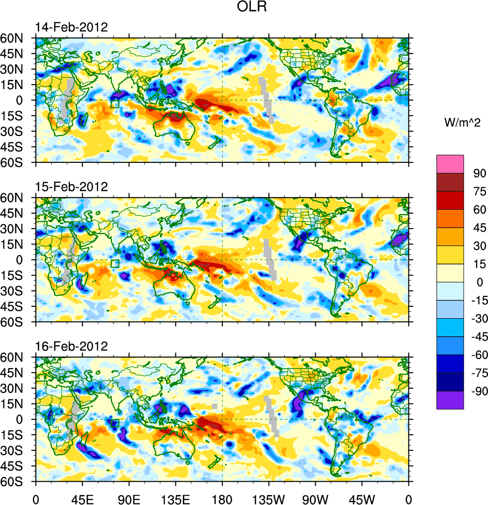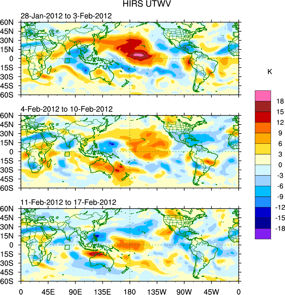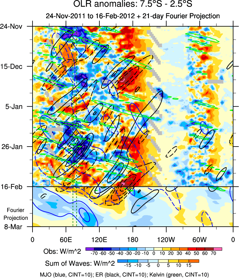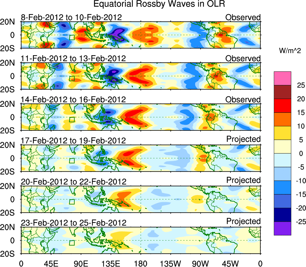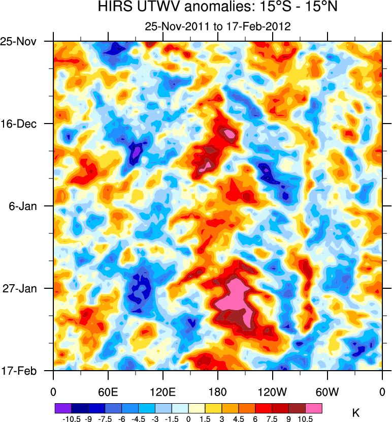 To identify tropical waves in near real-time, the OLR and UTWV data are filtered following Wheeler & Weickmann (2001 MWR). The daily anomalies are calculated using the first 3 harmonics of the seasonal cycle for 1979–2009. Missing values are then filled using linear interpolation in space and time. The most recent 365 days of anomalies are padded with 659 days of zeroes, and the result is filtered for each wave type.