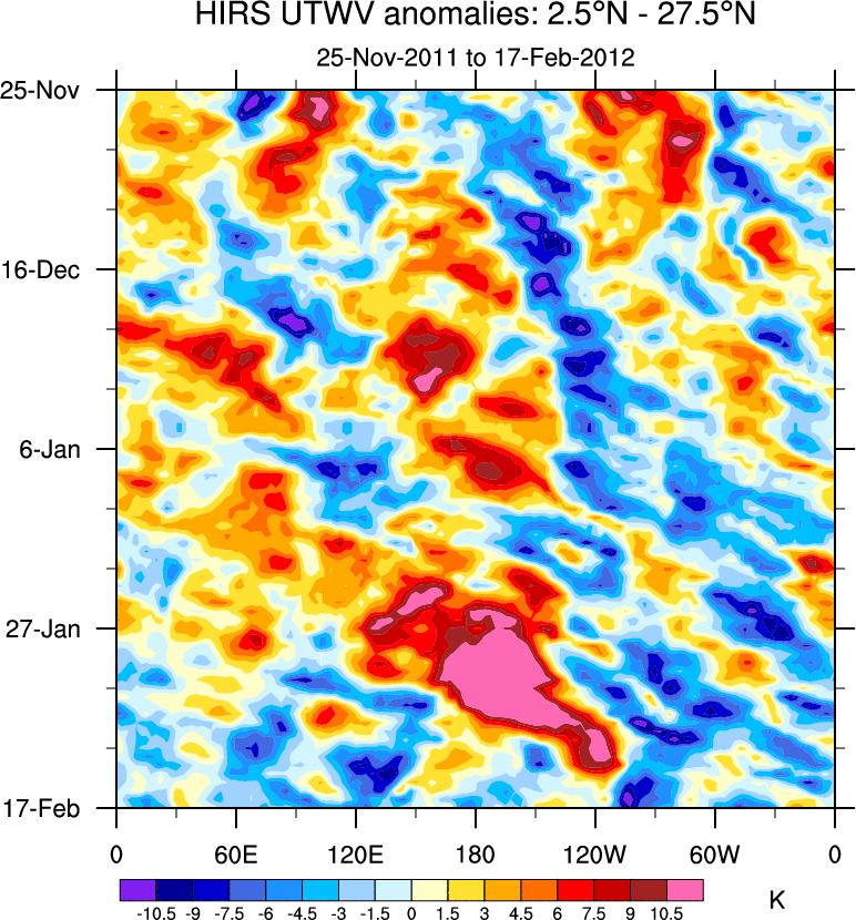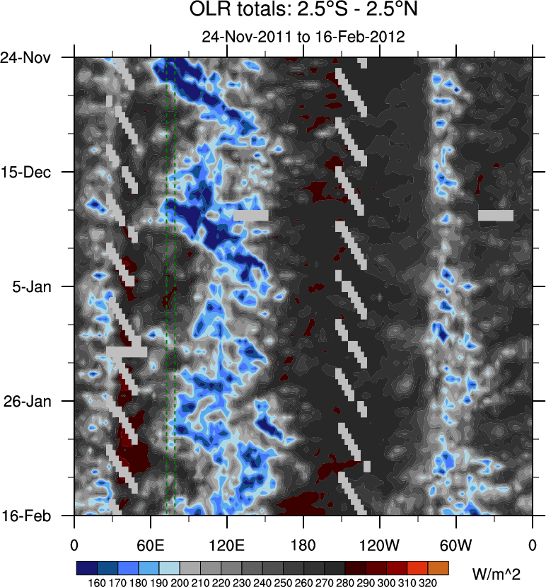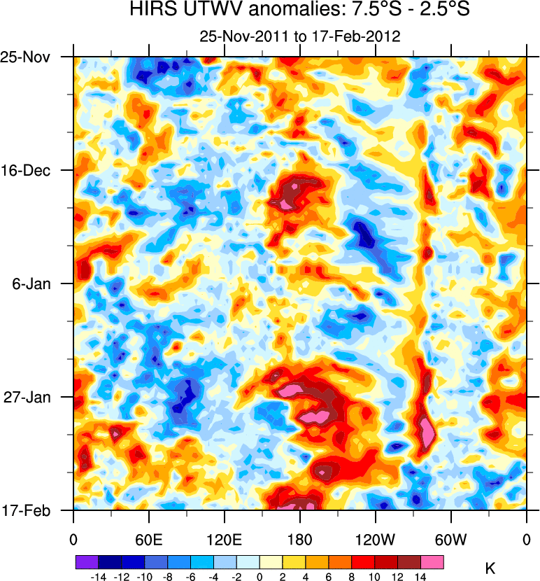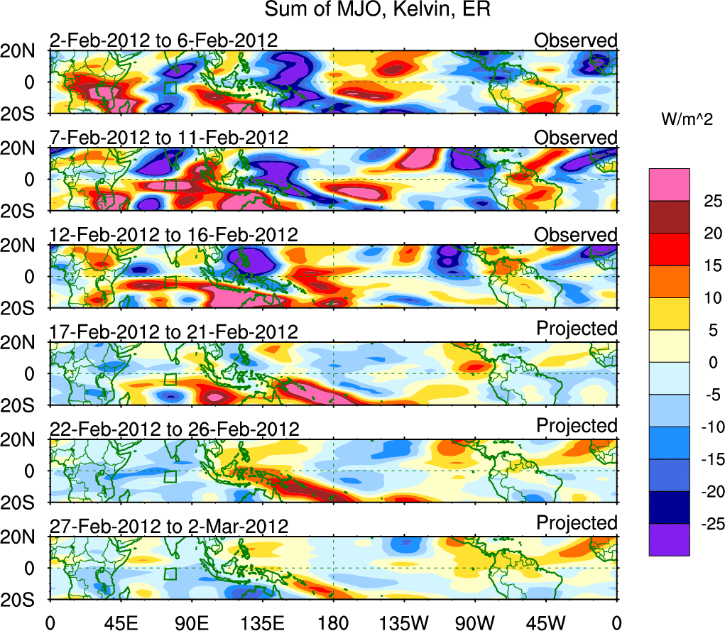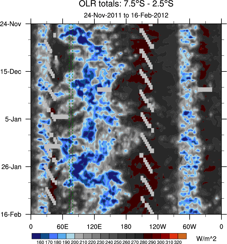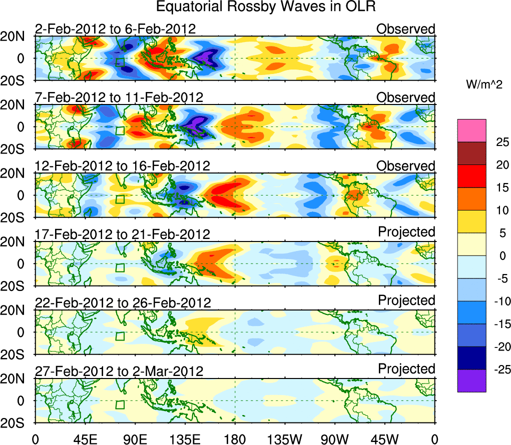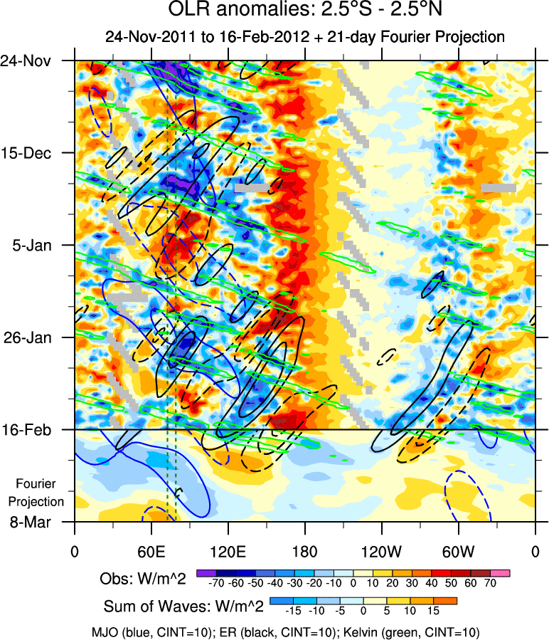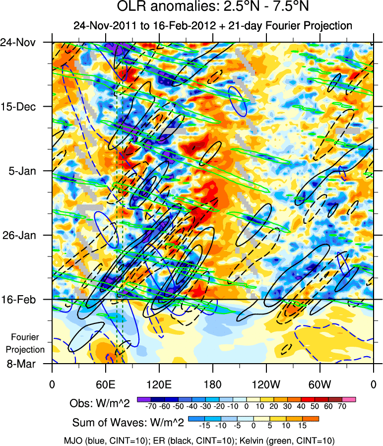 To identify tropical waves in near real-time, the OLR and UTWV data are filtered following Wheeler & Weickmann (2001 MWR). The daily anomalies are calculated using the first 3 harmonics of the seasonal cycle for 1979–2009. Missing values are then filled using linear interpolation in space and time. The most recent 365 days of anomalies are padded with 659 days of zeroes, and the result is filtered for each wave type.