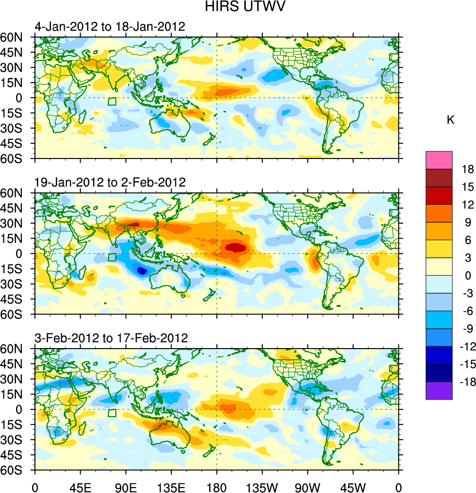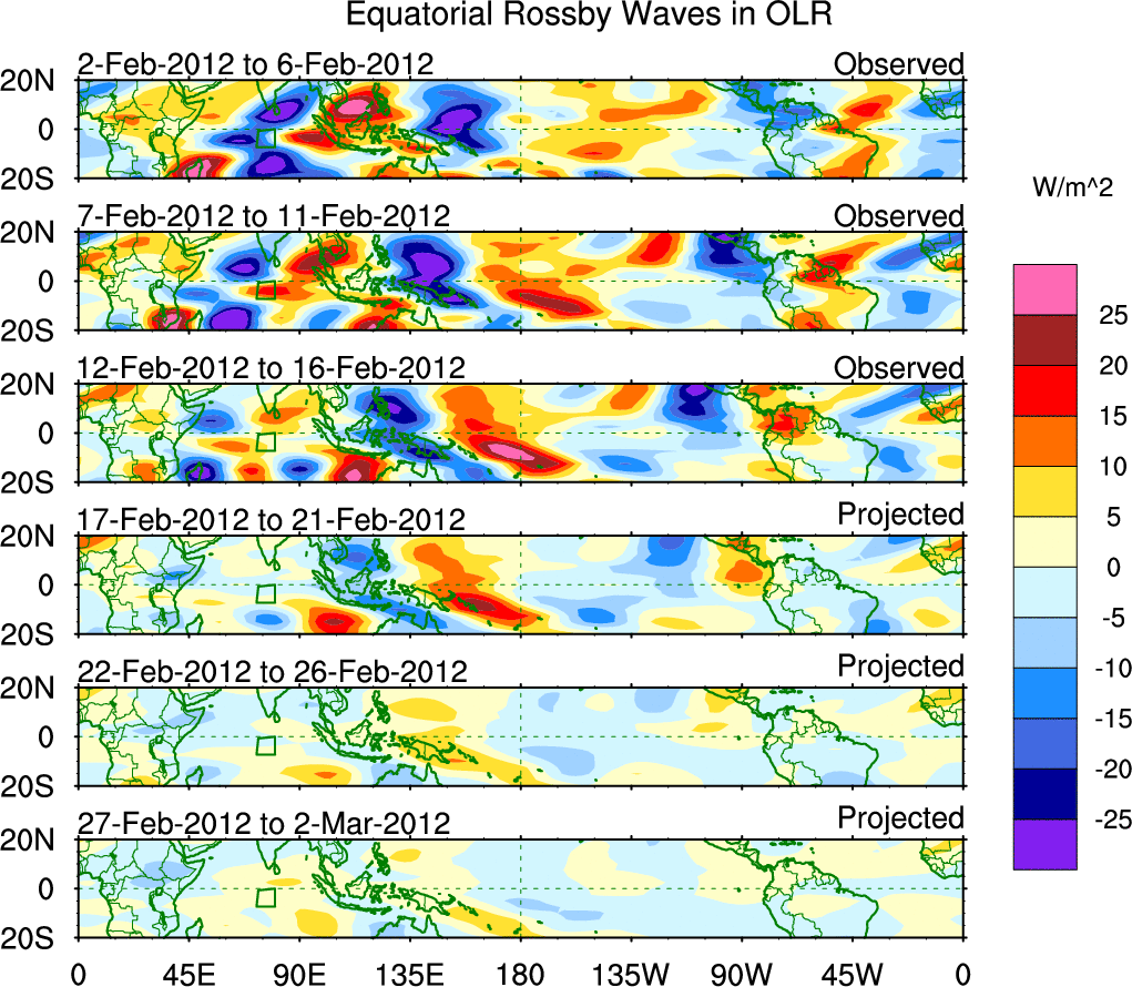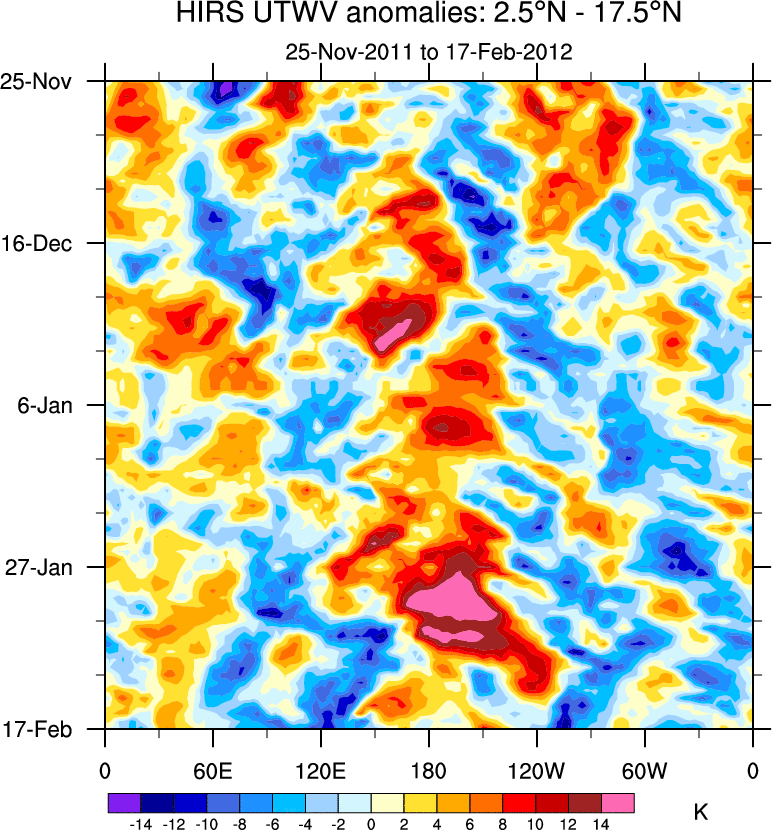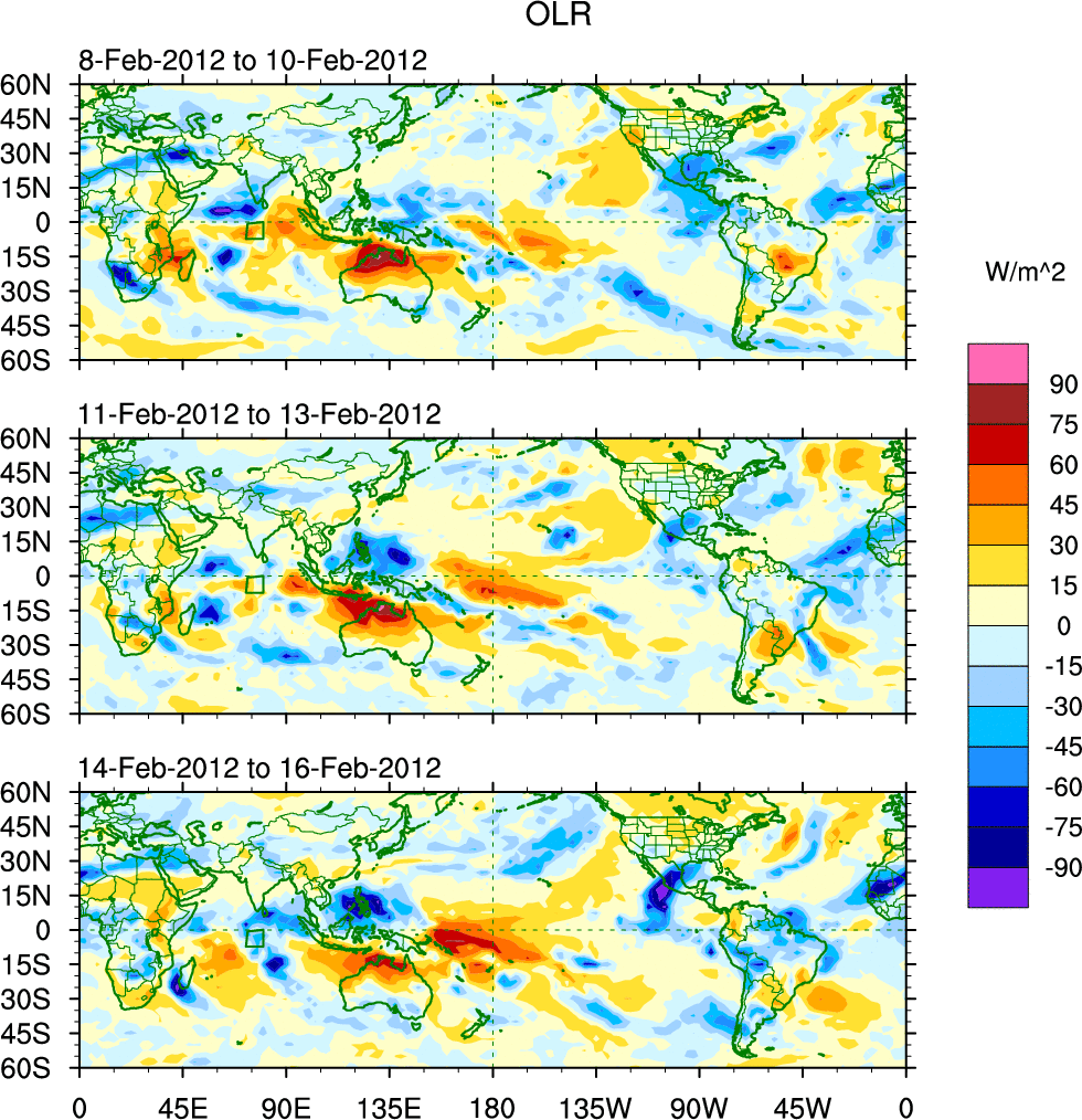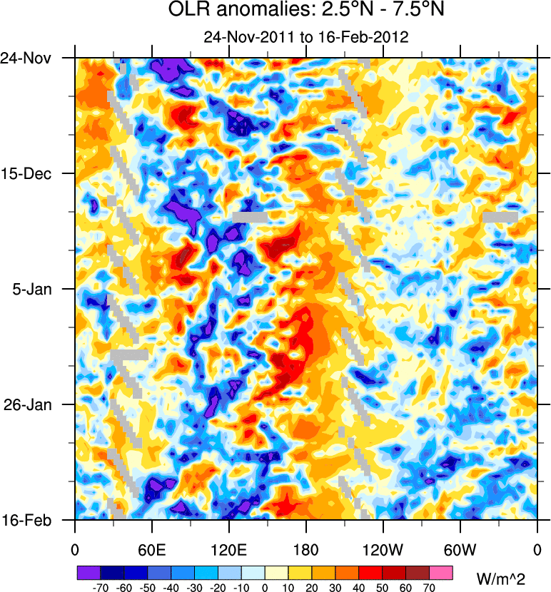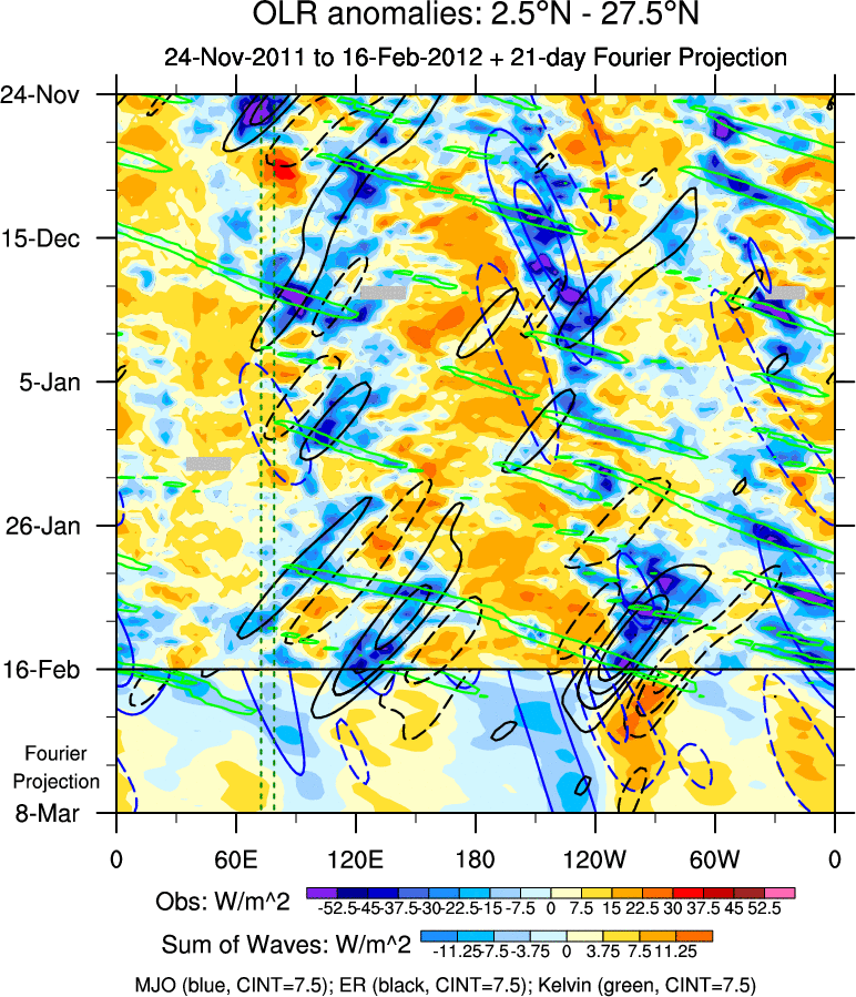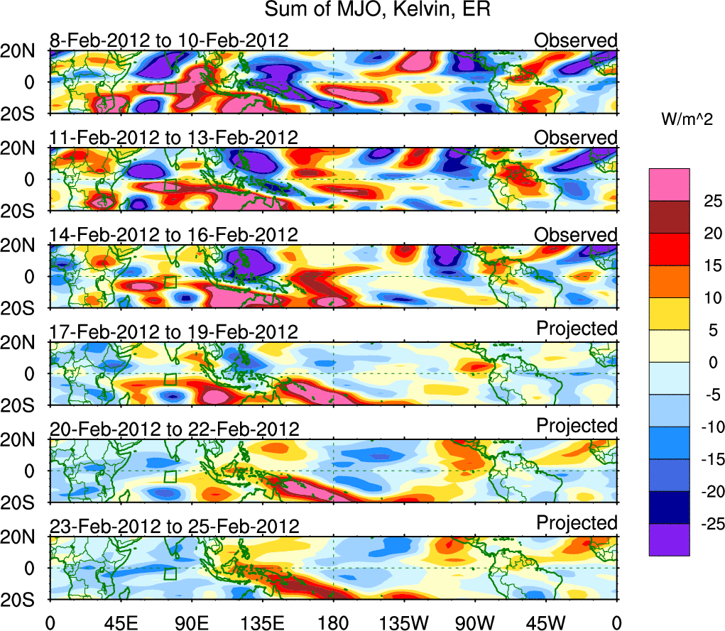 To identify tropical waves in near real-time, the OLR and UTWV data are filtered following Wheeler & Weickmann (2001 MWR). The daily anomalies are calculated using the first 3 harmonics of the seasonal cycle for 1979–2009. Missing values are then filled using linear interpolation in space and time. The most recent 365 days of anomalies are padded with 659 days of zeroes, and the result is filtered for each wave type.