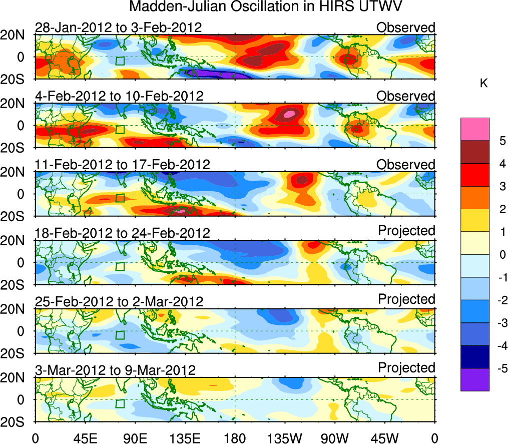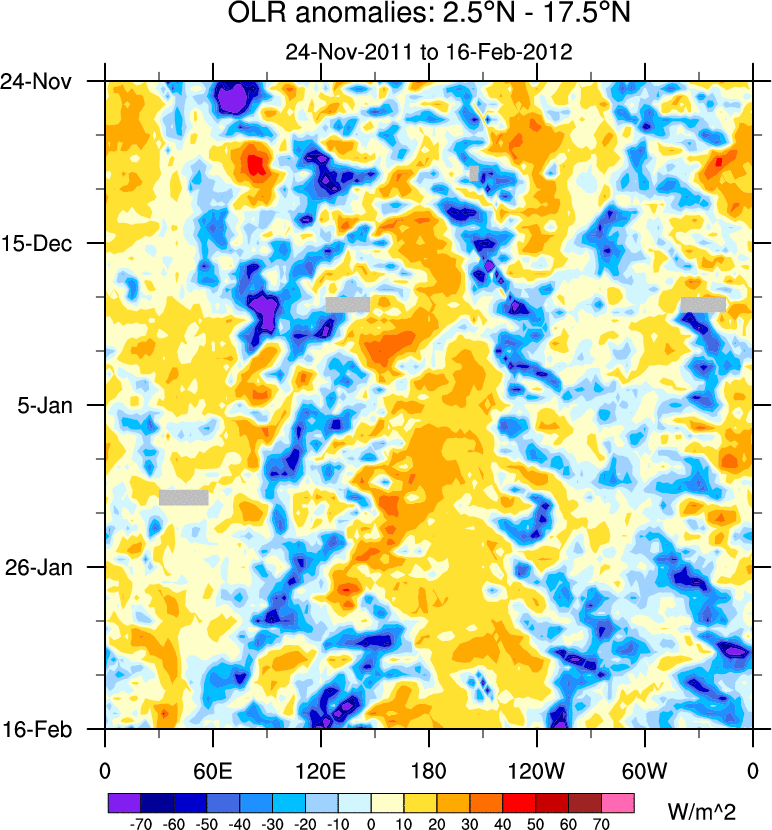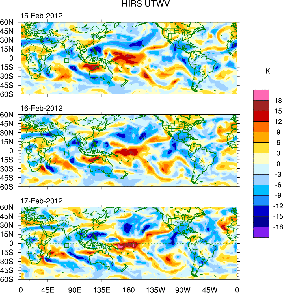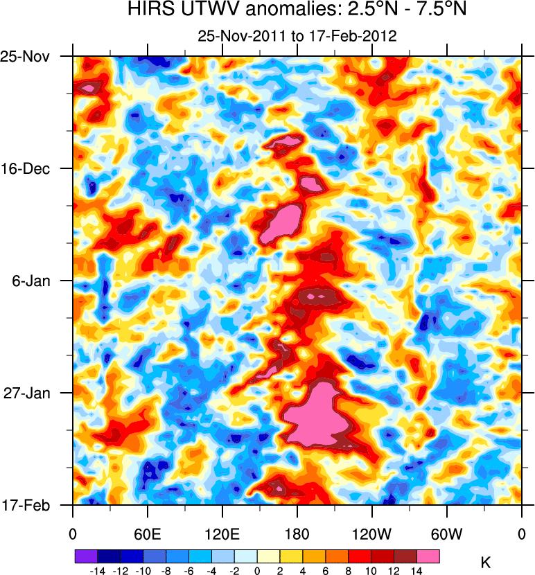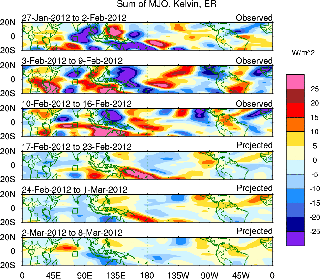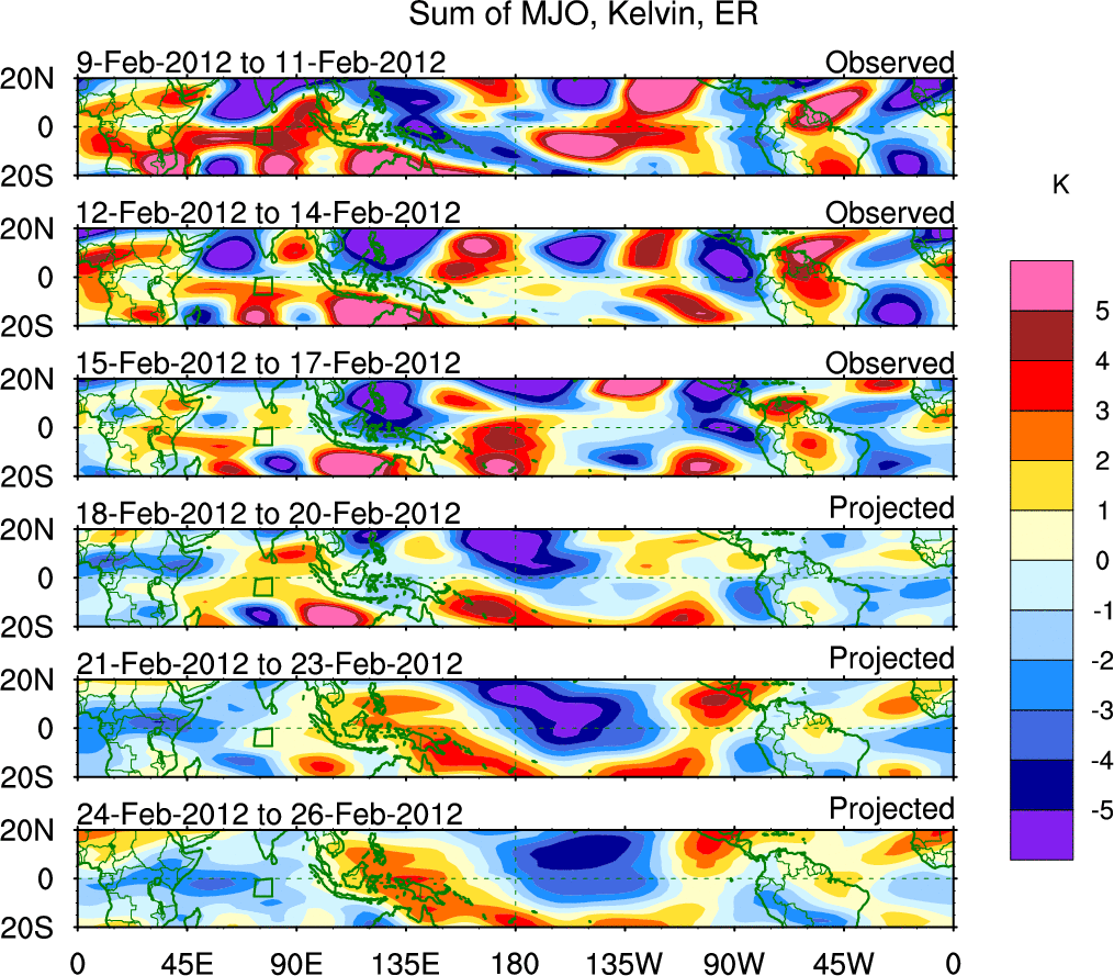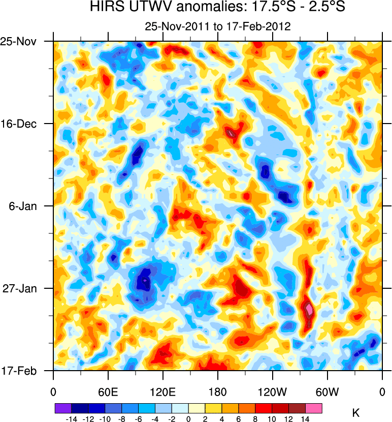 To identify tropical waves in near real-time, the OLR and UTWV data are filtered following Wheeler & Weickmann (2001 MWR). The daily anomalies are calculated using the first 3 harmonics of the seasonal cycle for 1979–2009. Missing values are then filled using linear interpolation in space and time. The most recent 365 days of anomalies are padded with 659 days of zeroes, and the result is filtered for each wave type.
