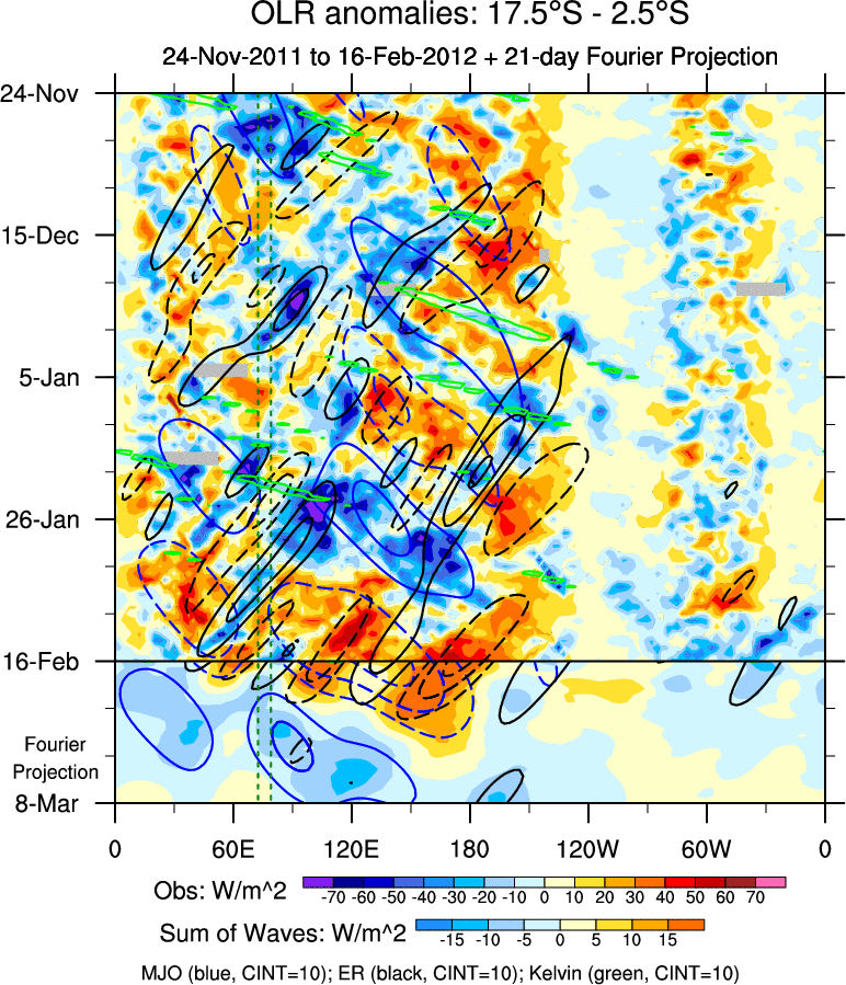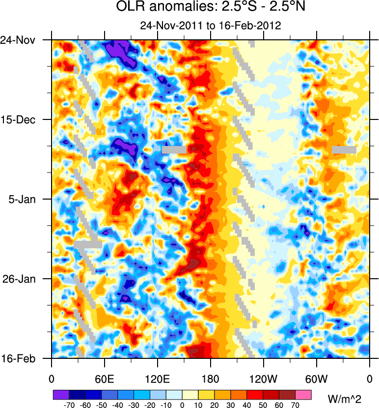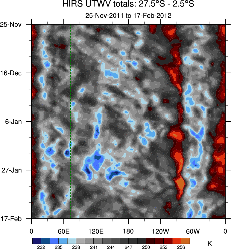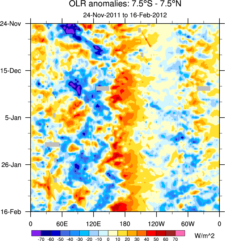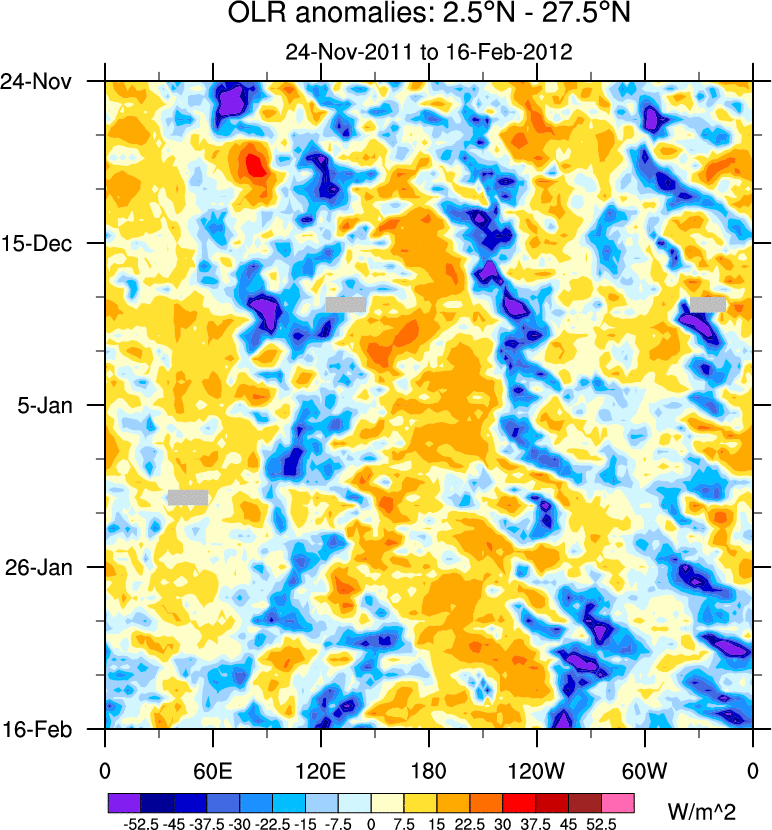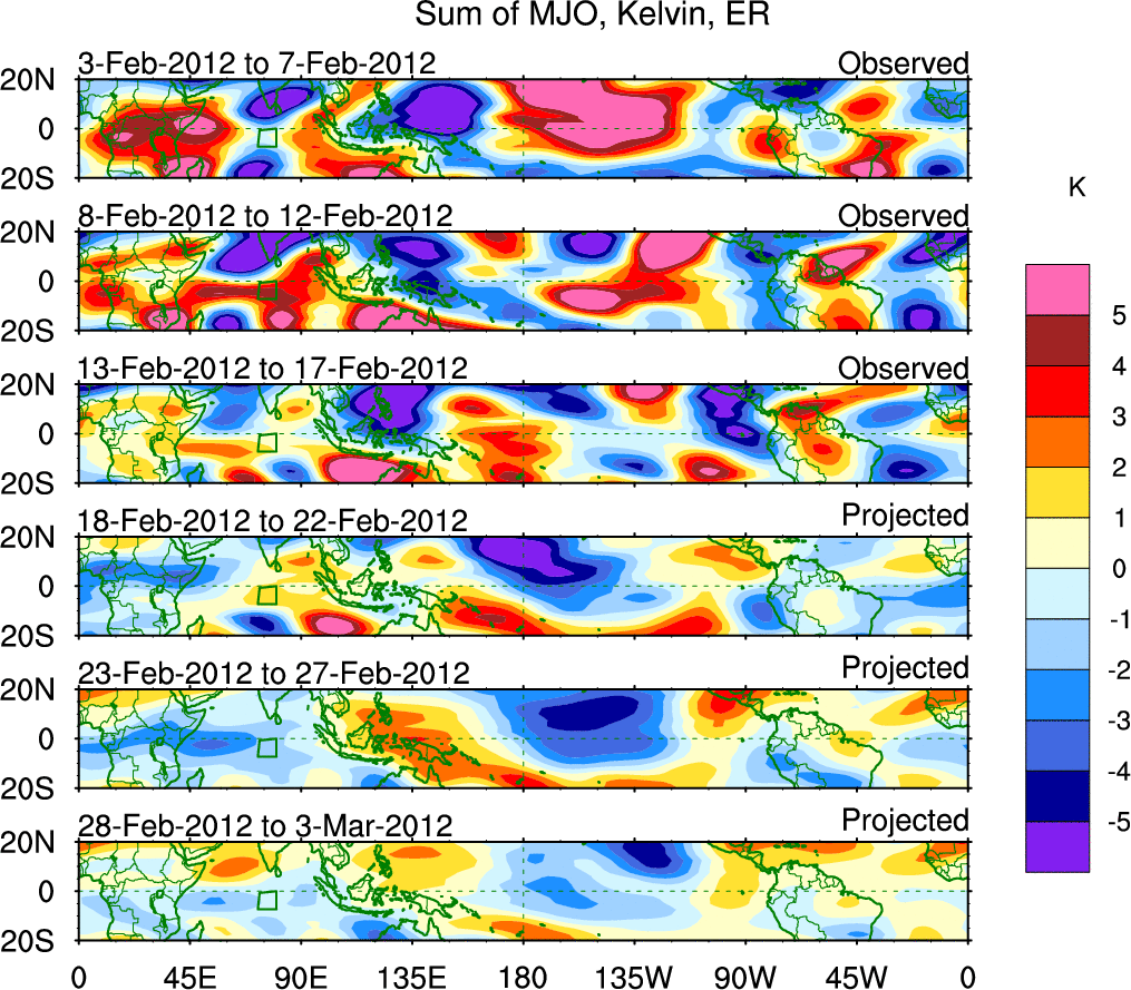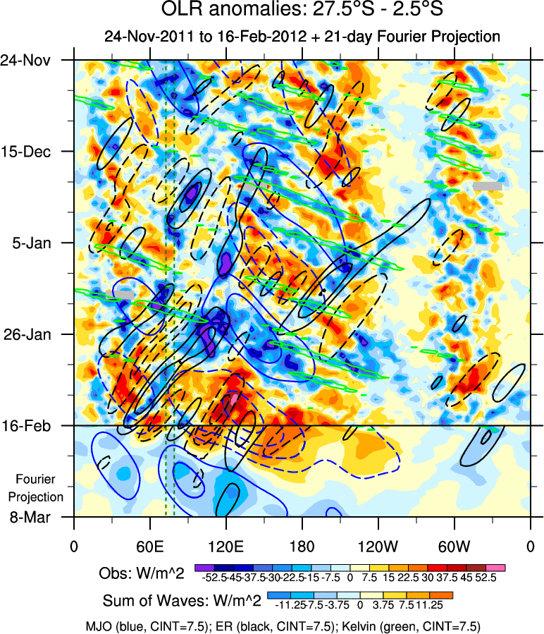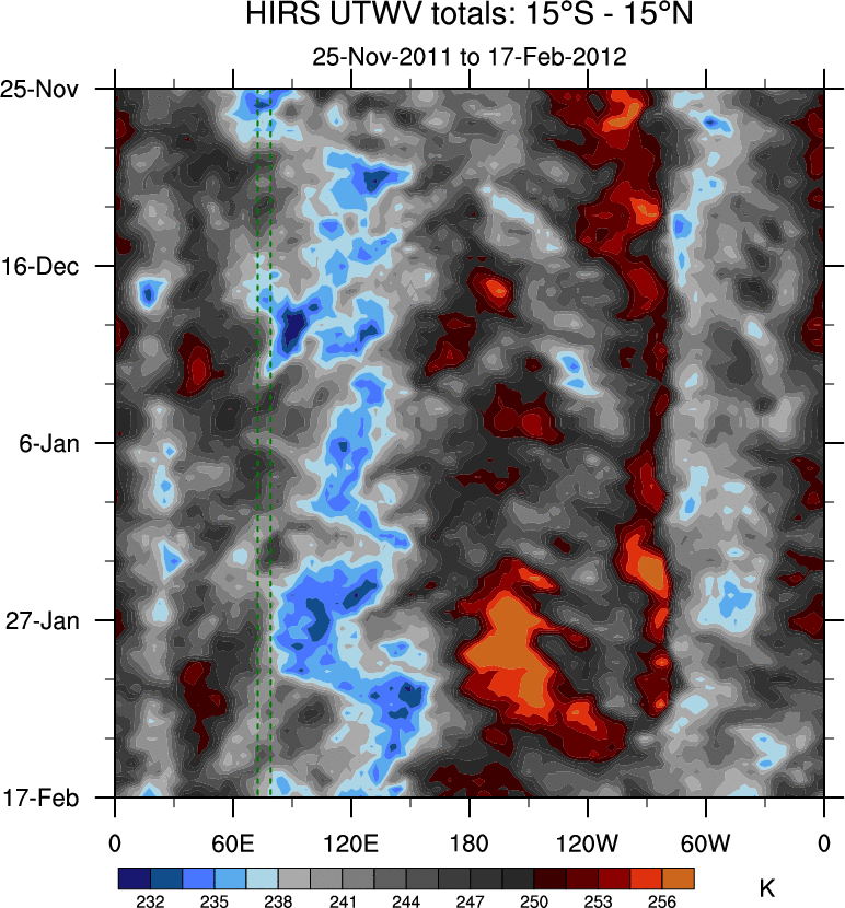 To identify tropical waves in near real-time, the OLR and UTWV data are filtered following Wheeler & Weickmann (2001 MWR). The daily anomalies are calculated using the first 3 harmonics of the seasonal cycle for 1979–2009. Missing values are then filled using linear interpolation in space and time. The most recent 365 days of anomalies are padded with 659 days of zeroes, and the result is filtered for each wave type.