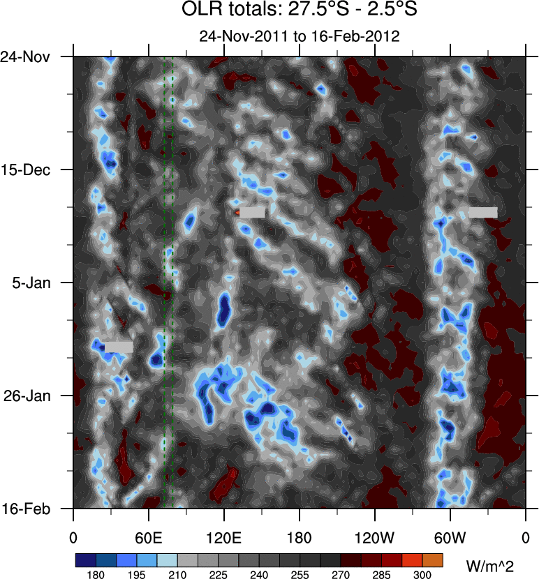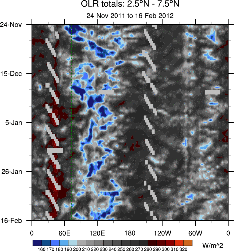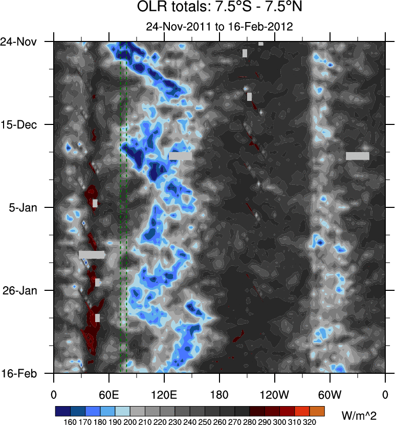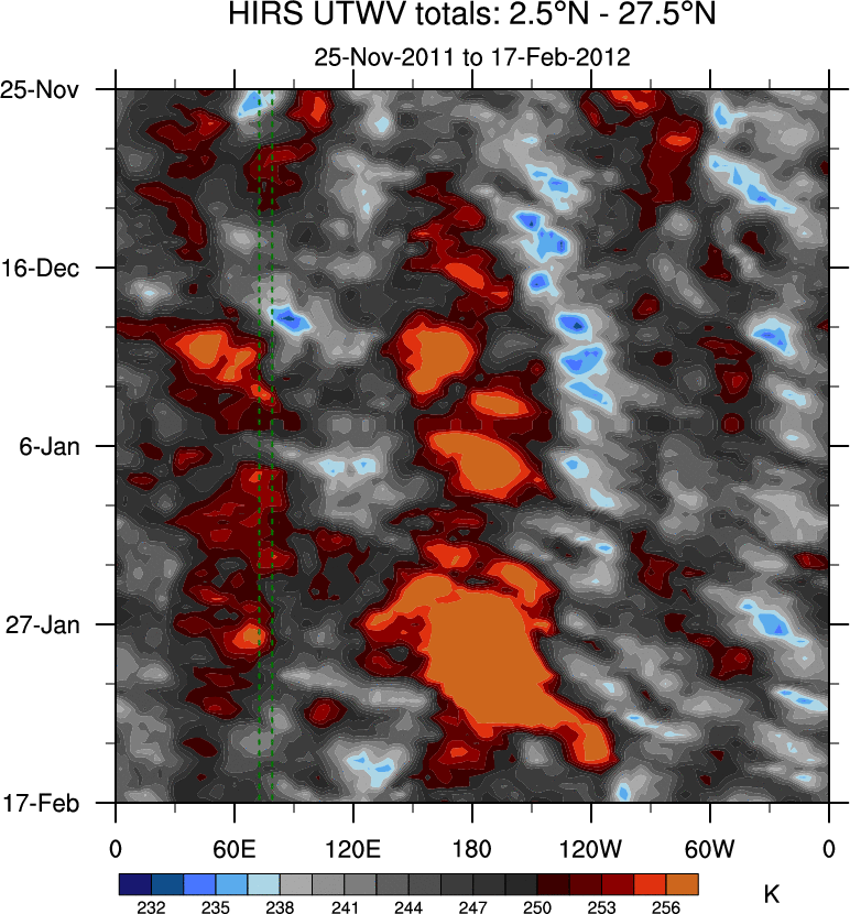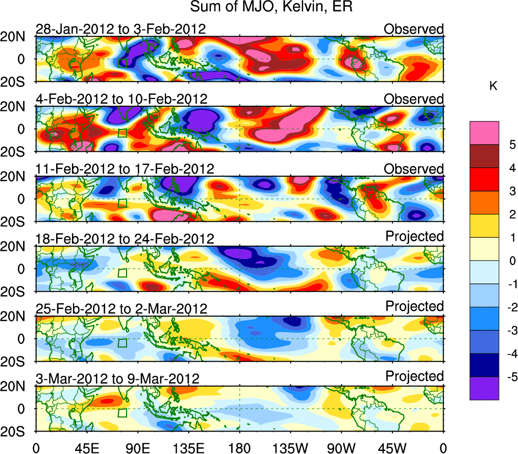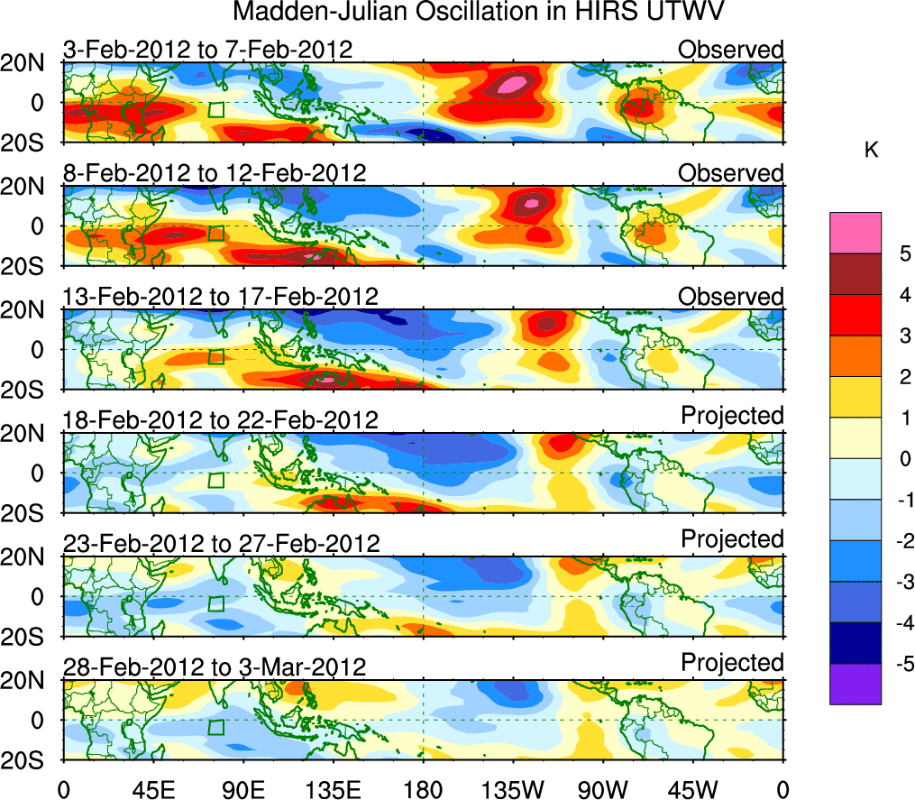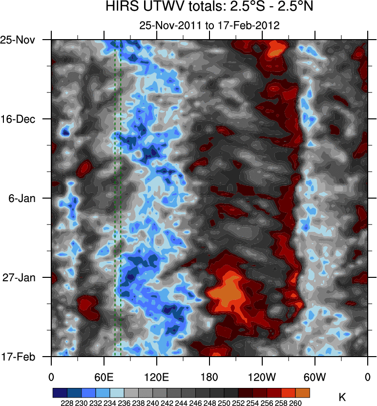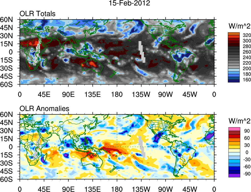 To identify tropical waves in near real-time, the OLR and UTWV data are filtered following Wheeler & Weickmann (2001 MWR). The daily anomalies are calculated using the first 3 harmonics of the seasonal cycle for 1979–2009. Missing values are then filled using linear interpolation in space and time. The most recent 365 days of anomalies are padded with 659 days of zeroes, and the result is filtered for each wave type.