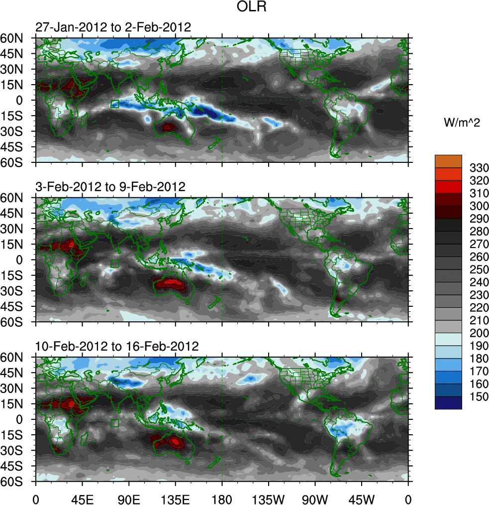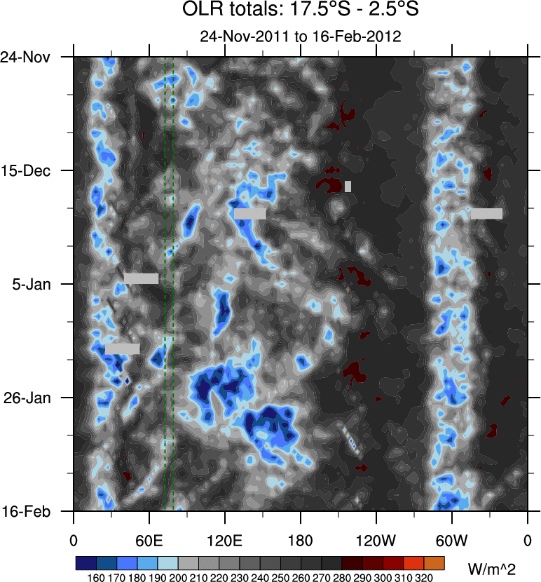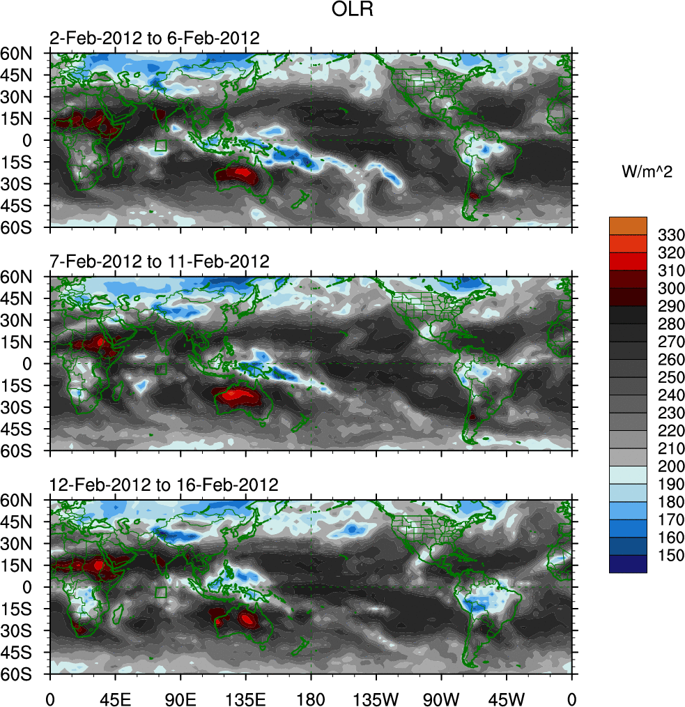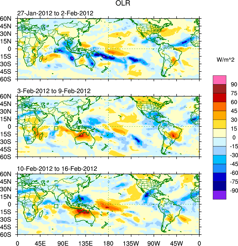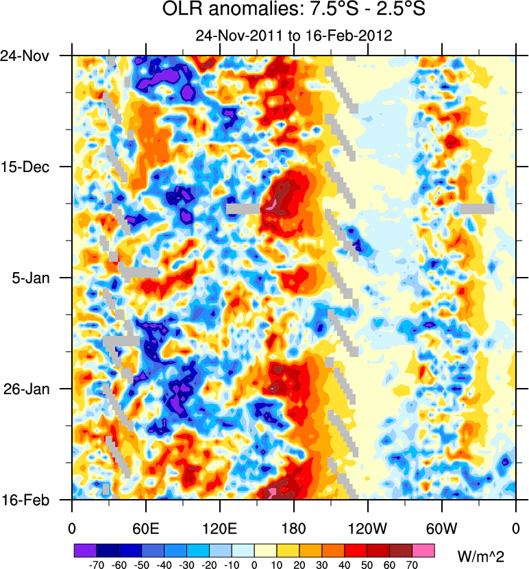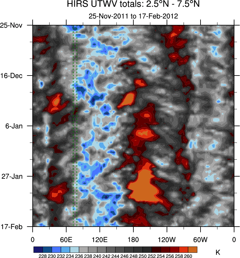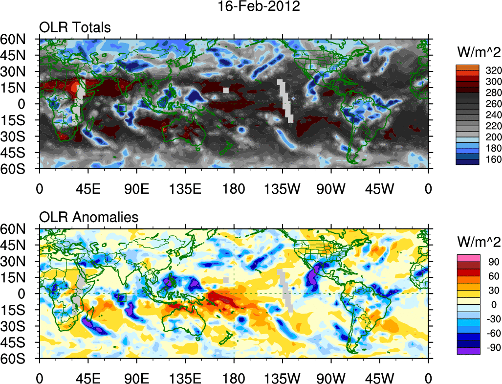 To identify tropical waves in near real-time, the OLR and UTWV data are filtered following Wheeler & Weickmann (2001 MWR). The daily anomalies are calculated using the first 3 harmonics of the seasonal cycle for 1979–2009. Missing values are then filled using linear interpolation in space and time. The most recent 365 days of anomalies are padded with 659 days of zeroes, and the result is filtered for each wave type.