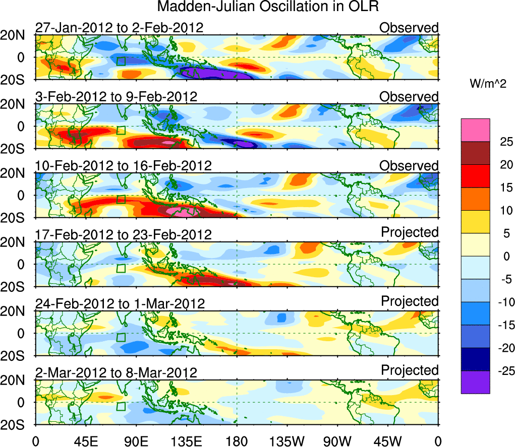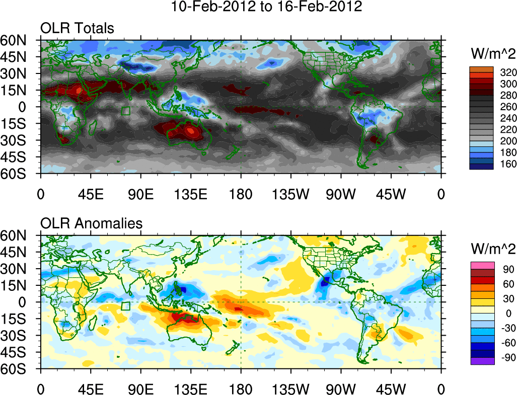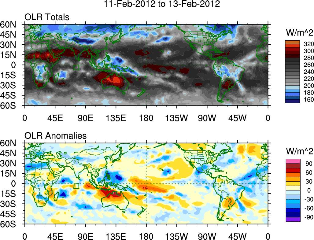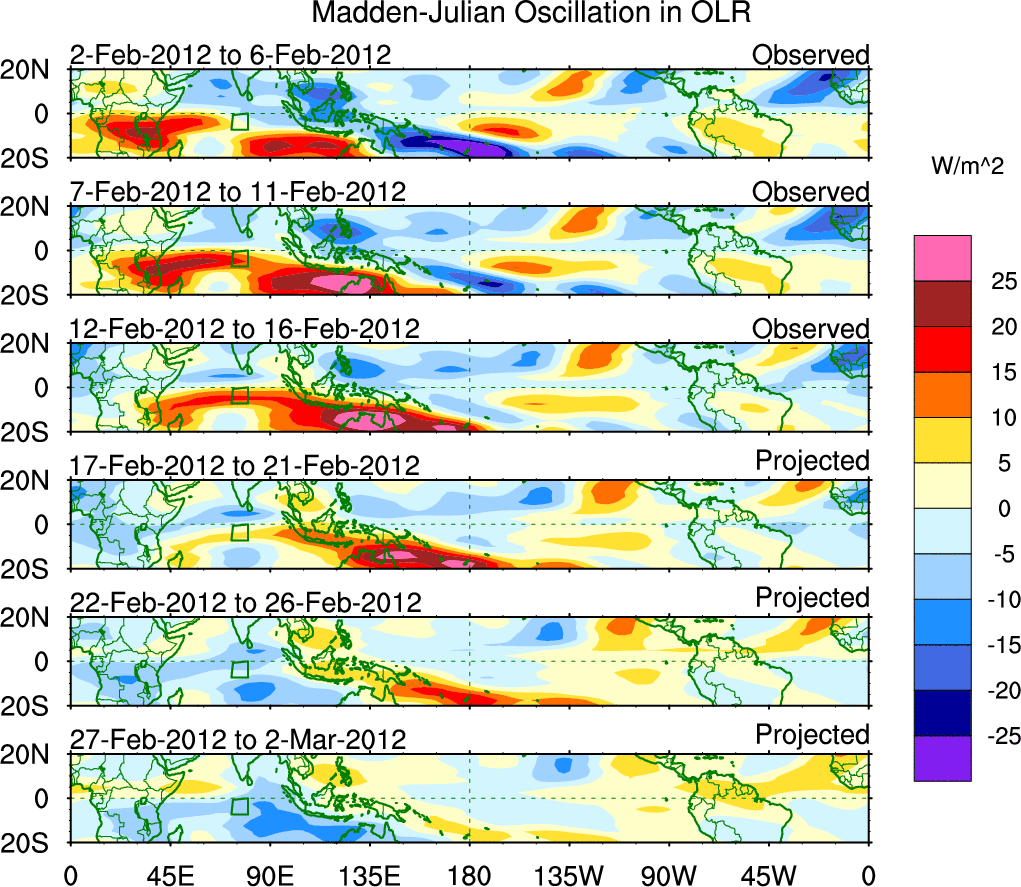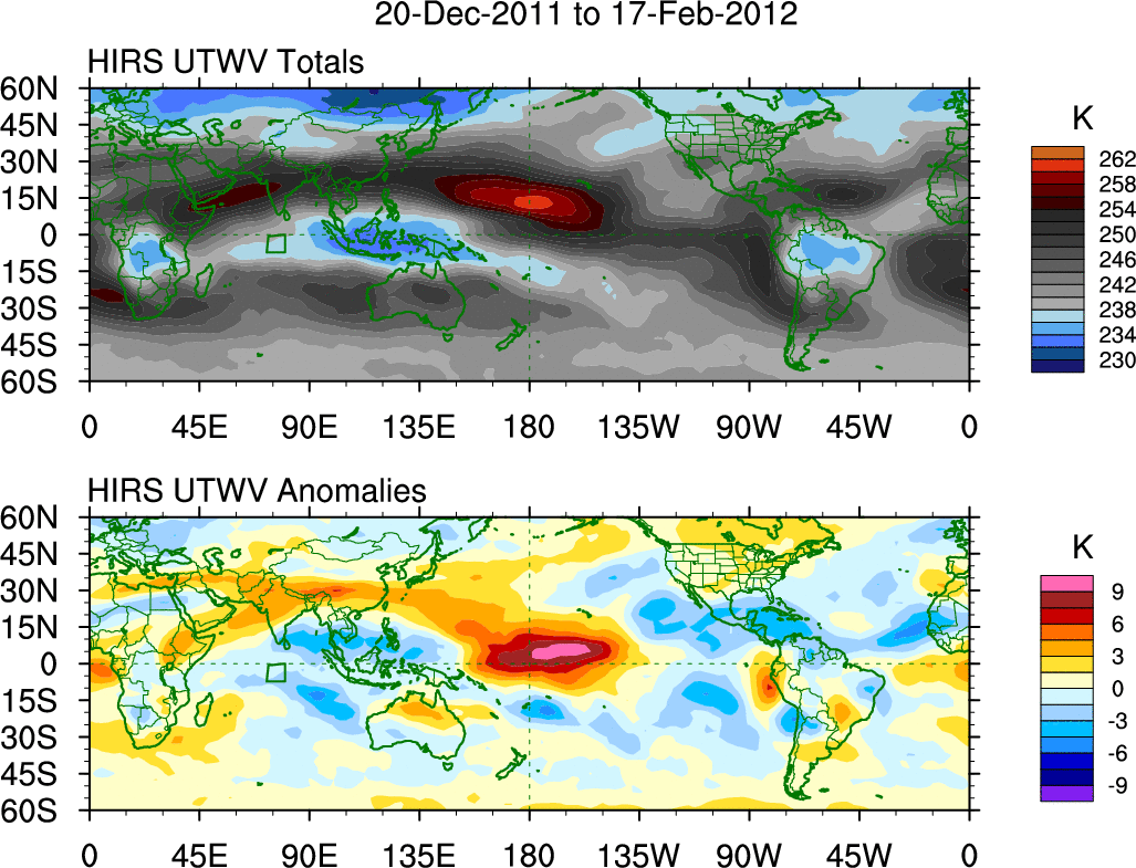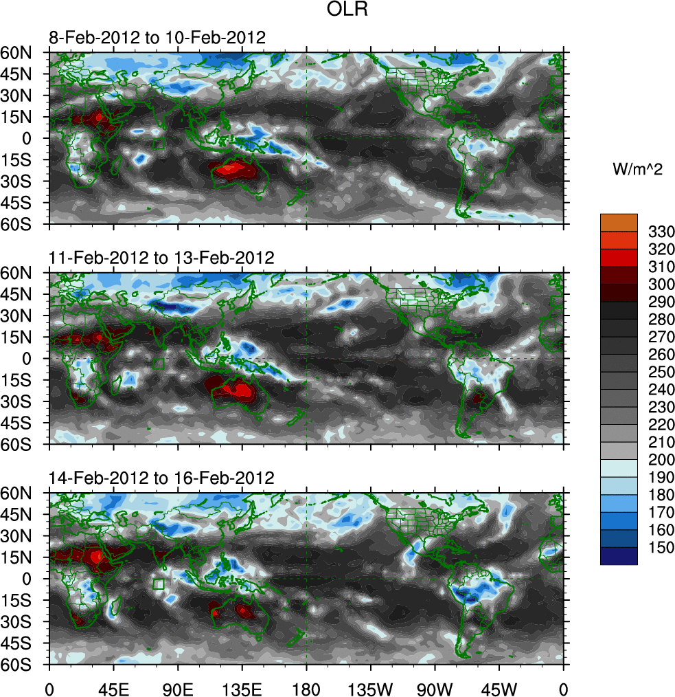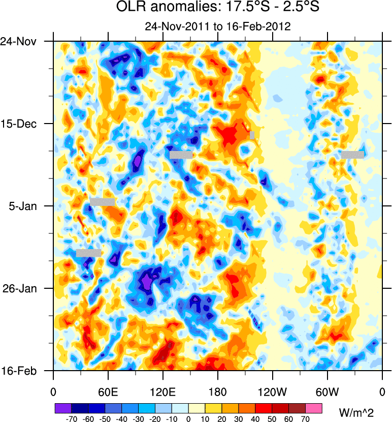 To identify tropical waves in near real-time, the OLR and UTWV data are filtered following Wheeler & Weickmann (2001 MWR). The daily anomalies are calculated using the first 3 harmonics of the seasonal cycle for 1979–2009. Missing values are then filled using linear interpolation in space and time. The most recent 365 days of anomalies are padded with 659 days of zeroes, and the result is filtered for each wave type.