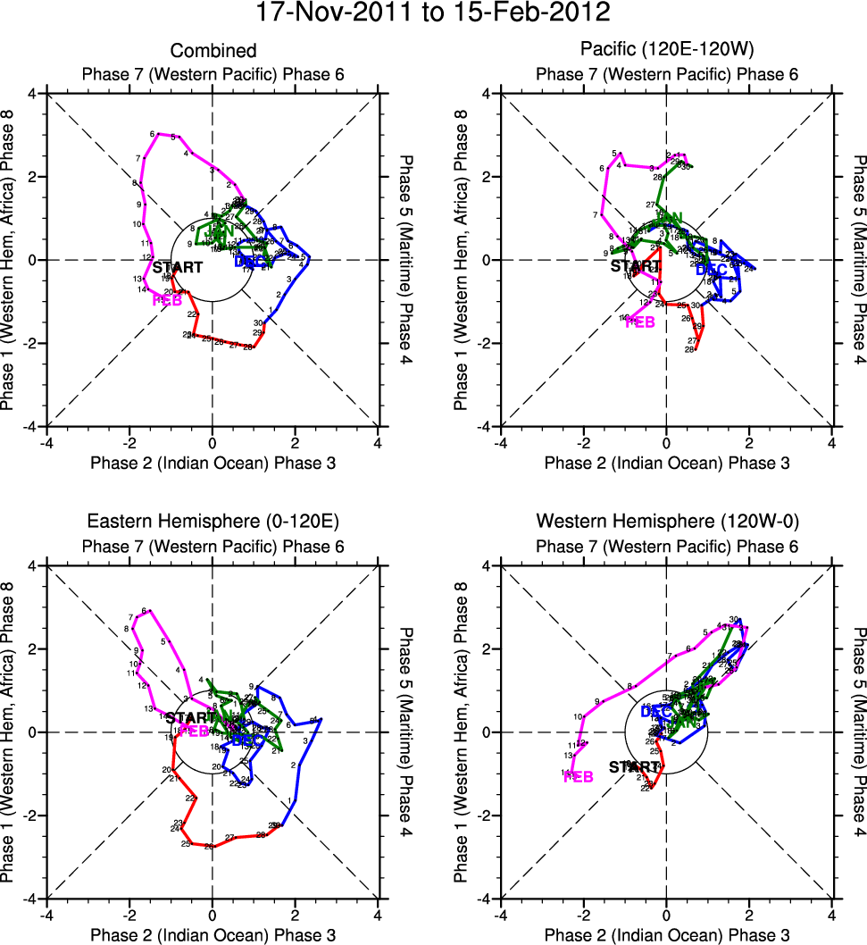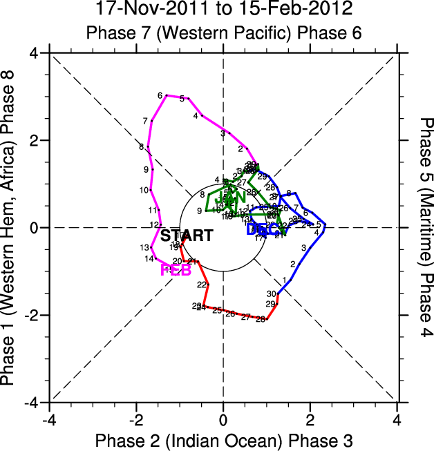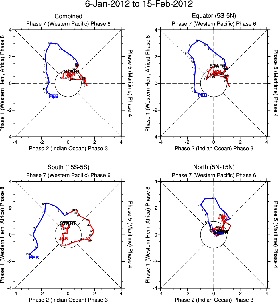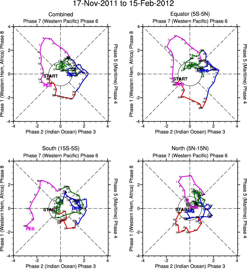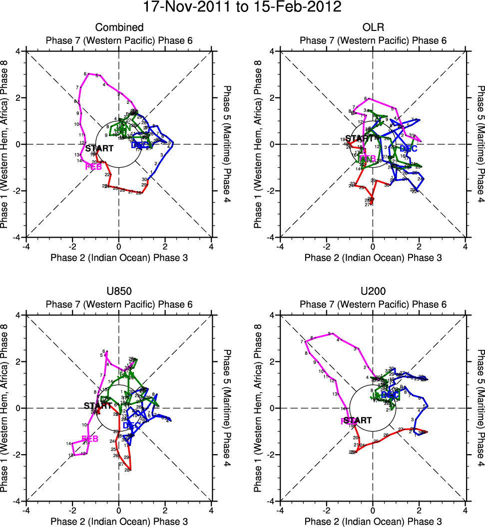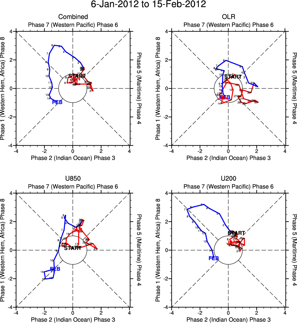 Wheeler and Hendon (2004) constructed the RMM index for monitoring the MJO. This index consists of the first two principal components (PCs) of OLR, 850-hPa zonal wind, and 200-hPa zonal wind averaged 15S-15N.