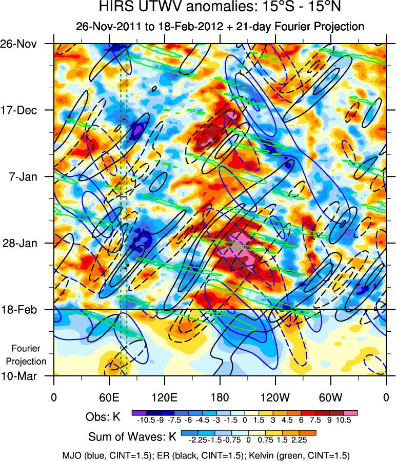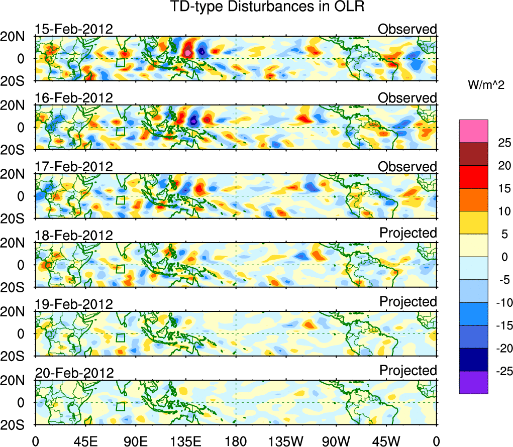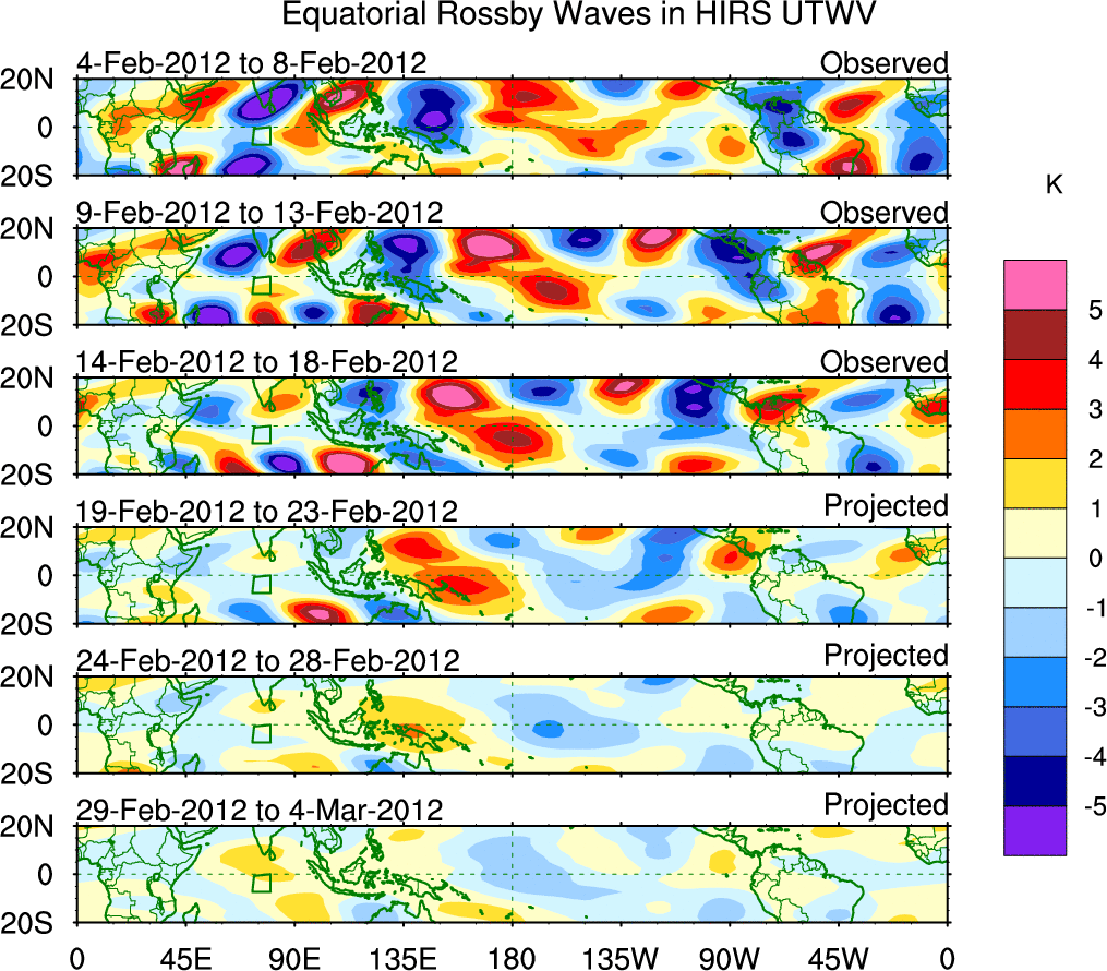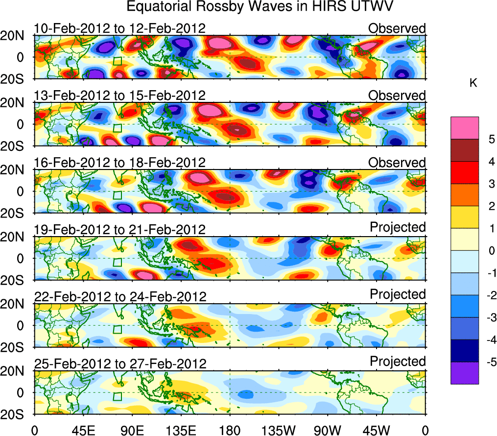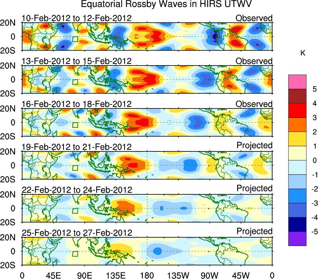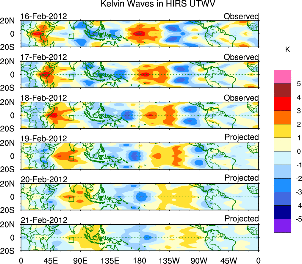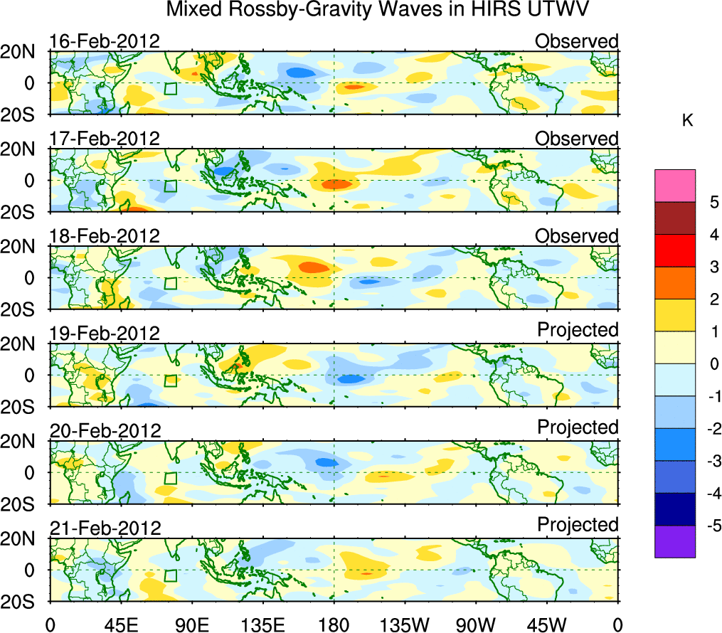 To identify tropical waves in near real-time, the OLR and UTWV data are filtered following Wheeler & Weickmann (2001 MWR). The daily anomalies are calculated using the first 3 harmonics of the seasonal cycle for 1979–2009. Missing values are then filled using linear interpolation in space and time. The most recent 365 days of anomalies are padded with 659 days of zeroes, and the result is filtered for each wave type.