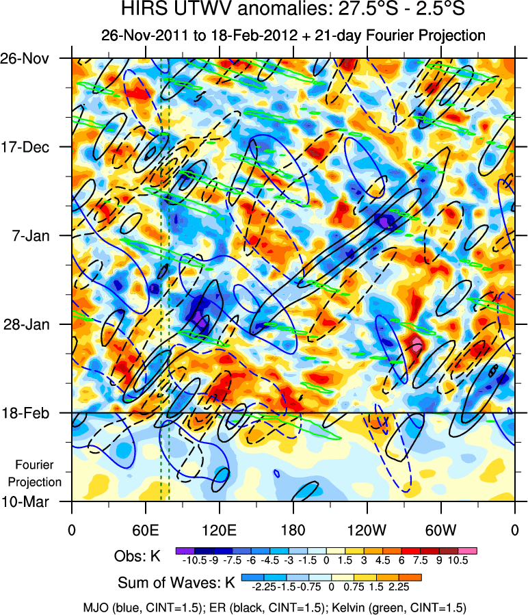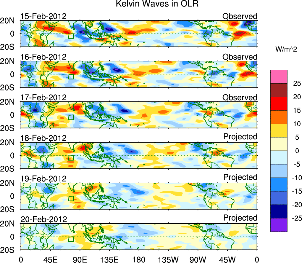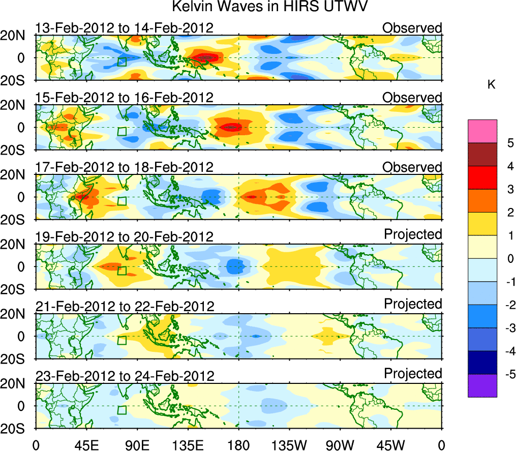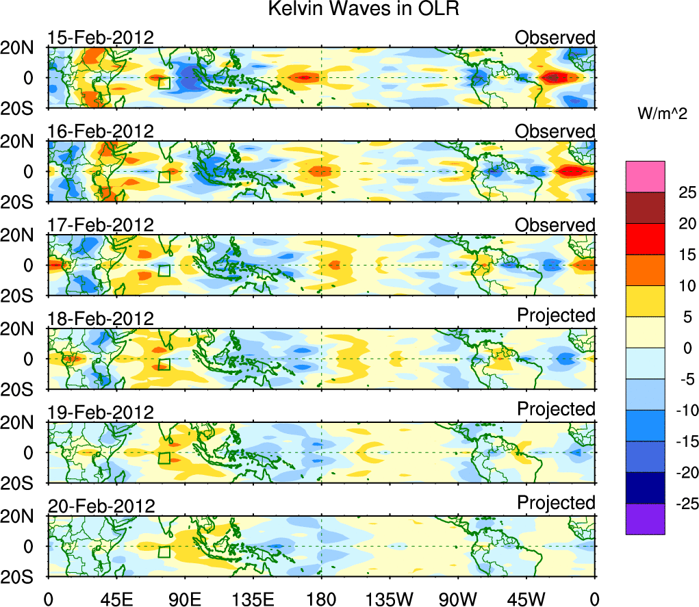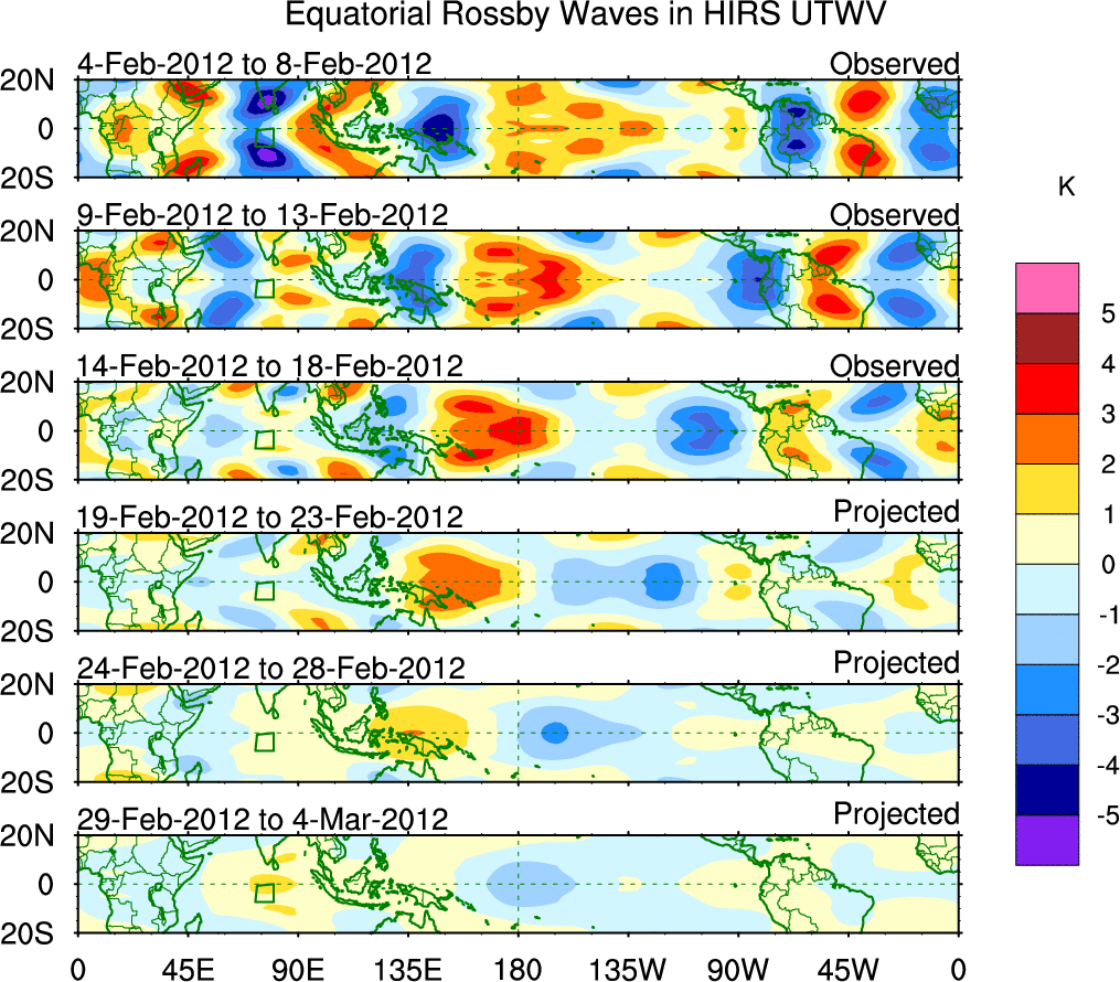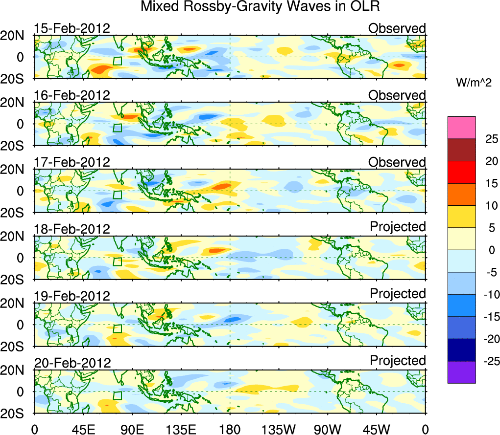 To identify tropical waves in near real-time, the OLR and UTWV data are filtered following Wheeler & Weickmann (2001 MWR). The daily anomalies are calculated using the first 3 harmonics of the seasonal cycle for 1979–2009. Missing values are then filled using linear interpolation in space and time. The most recent 365 days of anomalies are padded with 659 days of zeroes, and the result is filtered for each wave type.
