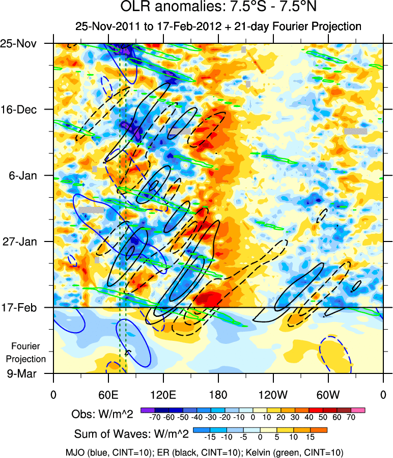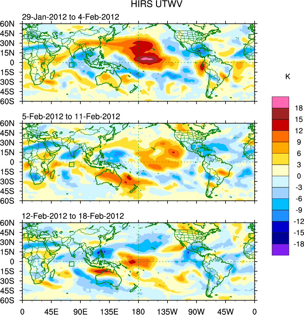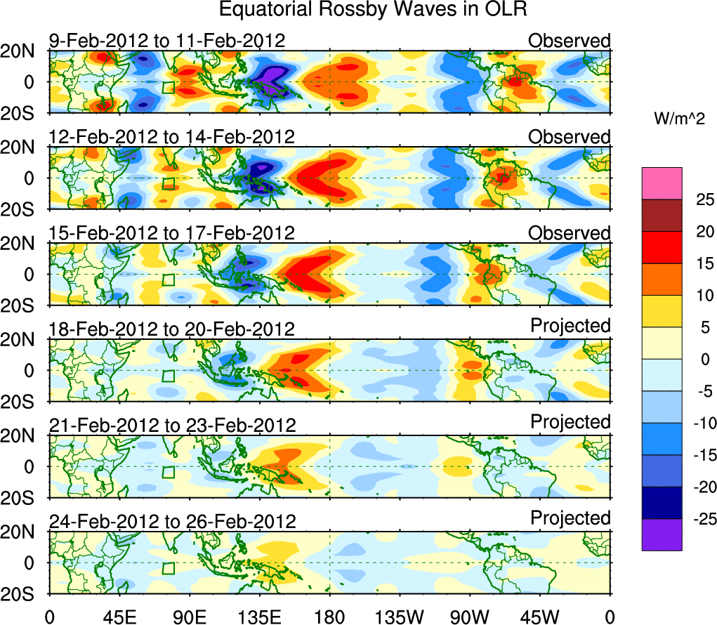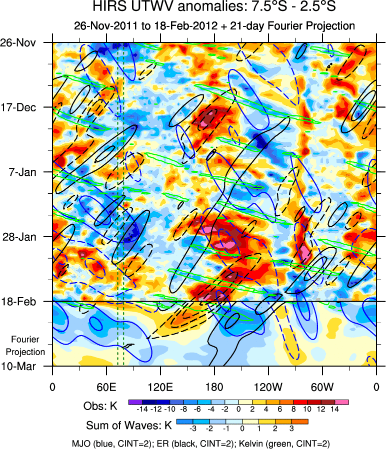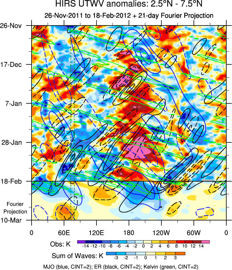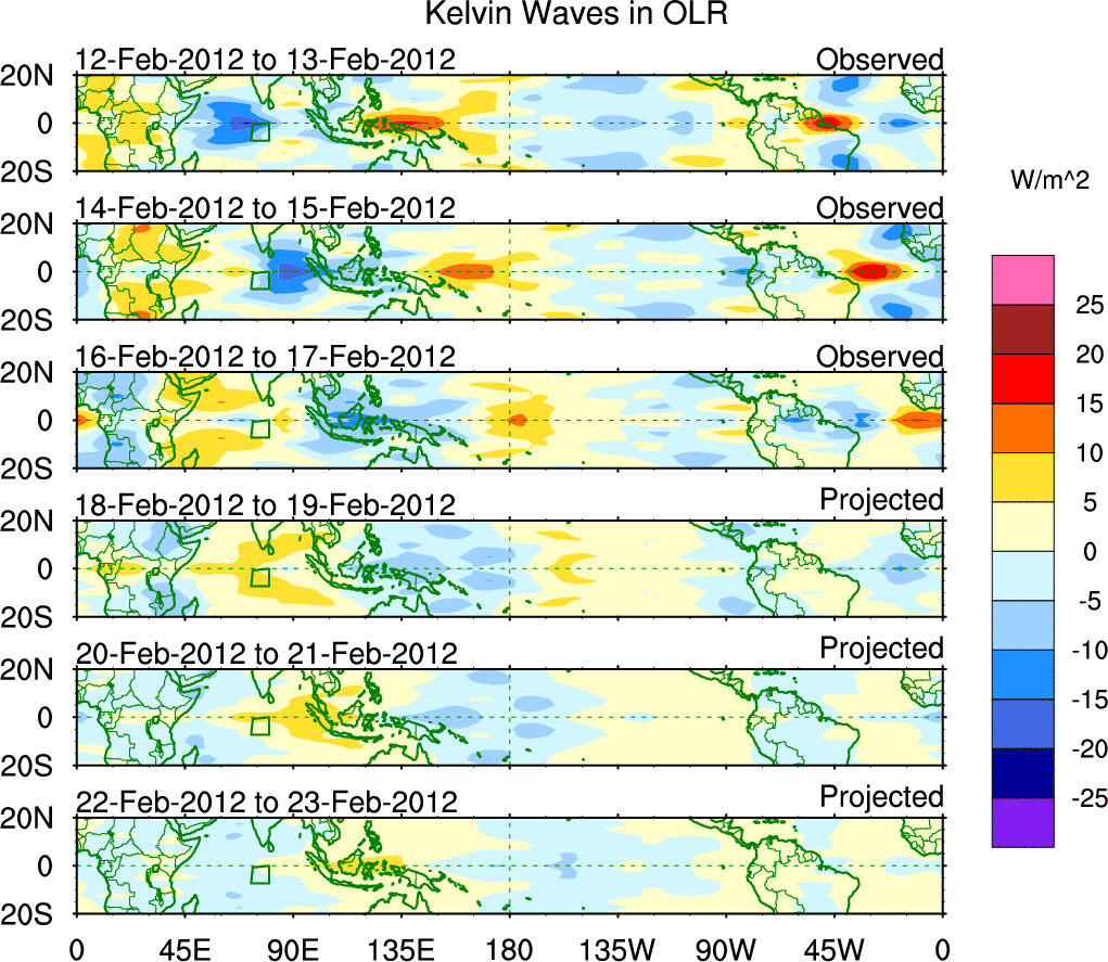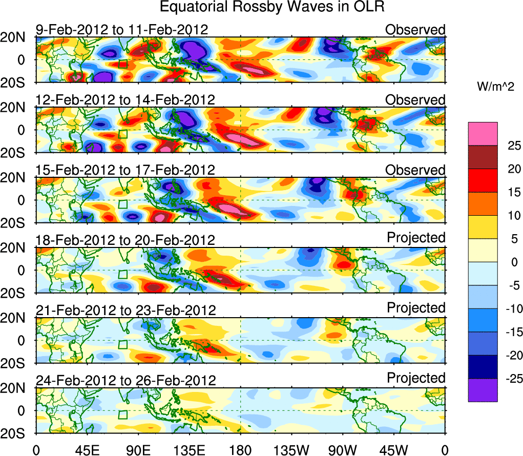 To identify tropical waves in near real-time, the OLR and UTWV data are filtered following Wheeler & Weickmann (2001 MWR). The daily anomalies are calculated using the first 3 harmonics of the seasonal cycle for 1979–2009. Missing values are then filled using linear interpolation in space and time. The most recent 365 days of anomalies are padded with 659 days of zeroes, and the result is filtered for each wave type.