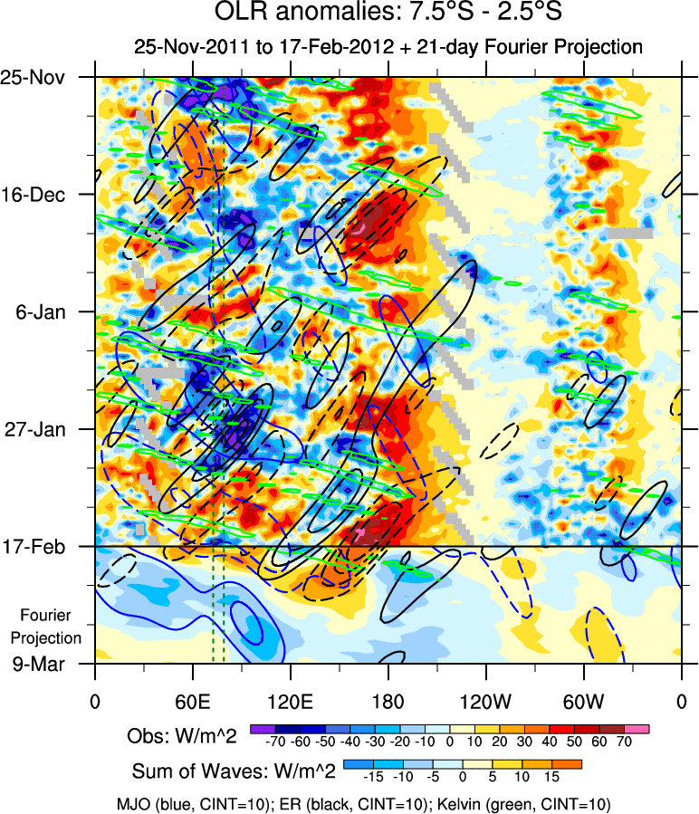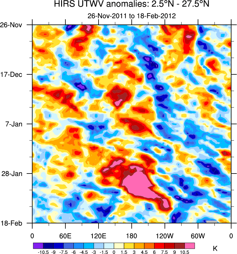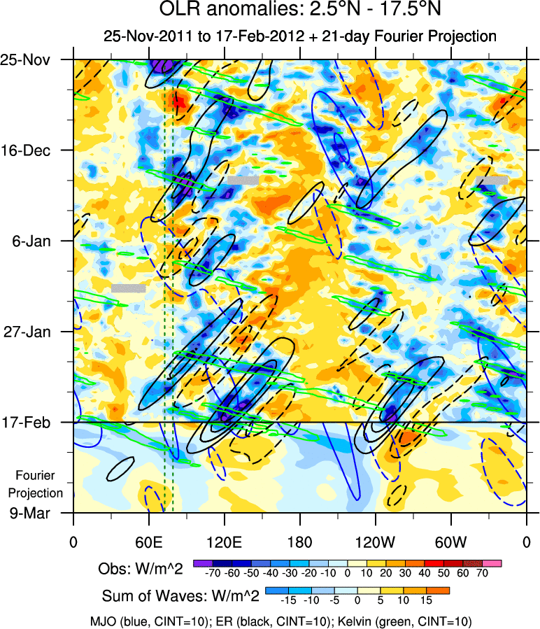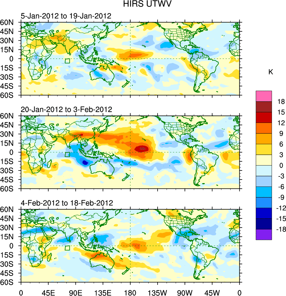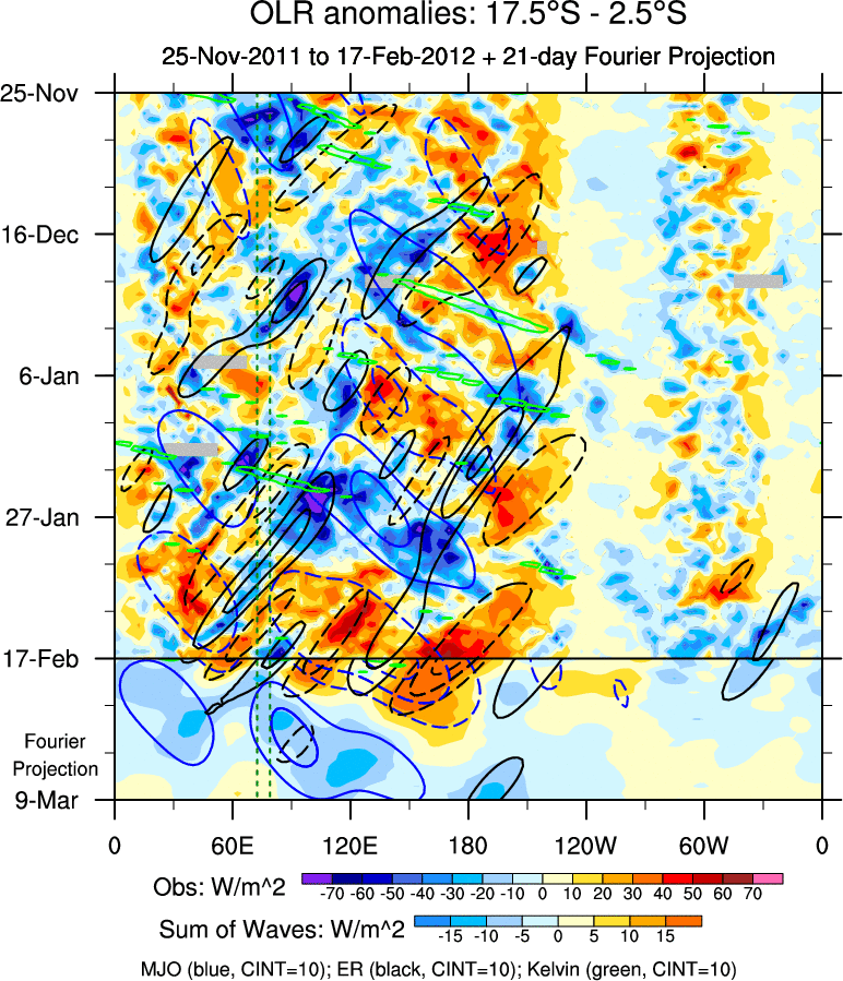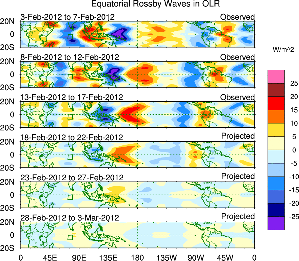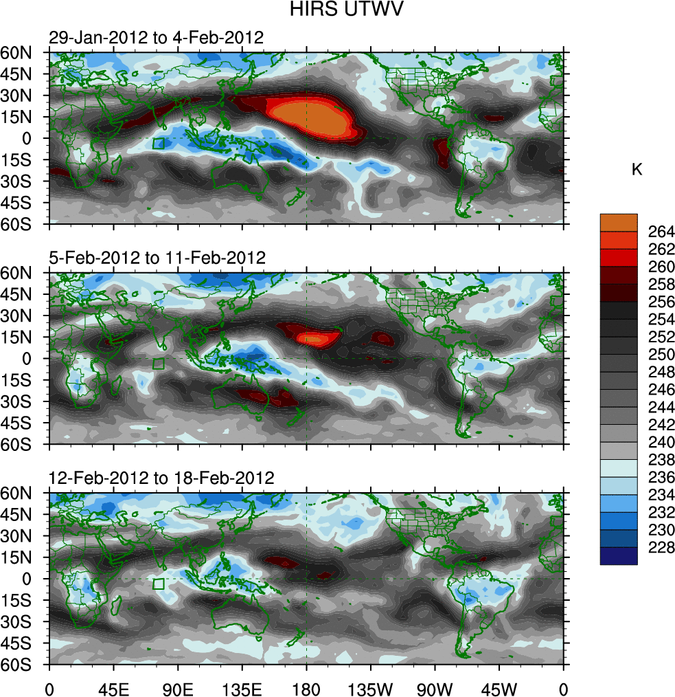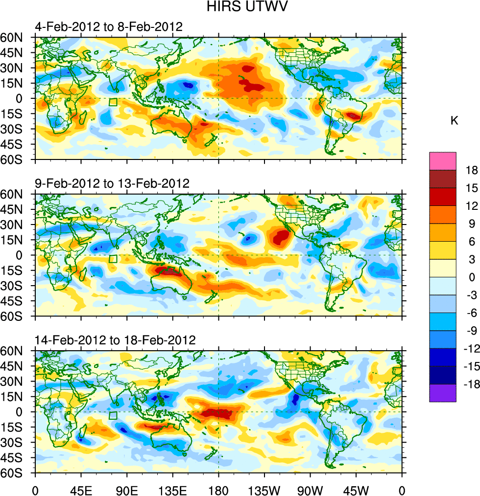 To identify tropical waves in near real-time, the OLR and UTWV data are filtered following Wheeler & Weickmann (2001 MWR). The daily anomalies are calculated using the first 3 harmonics of the seasonal cycle for 1979–2009. Missing values are then filled using linear interpolation in space and time. The most recent 365 days of anomalies are padded with 659 days of zeroes, and the result is filtered for each wave type.