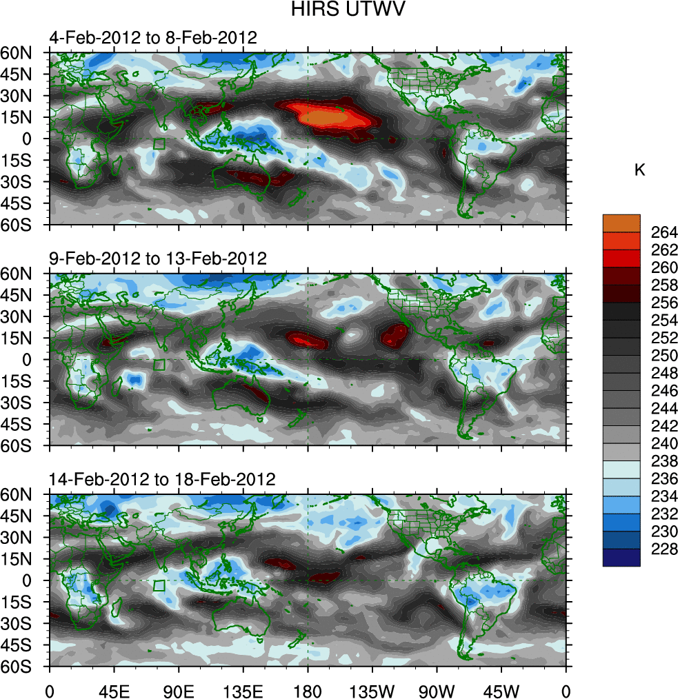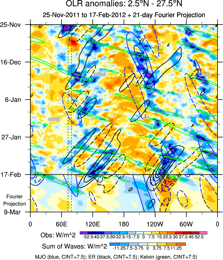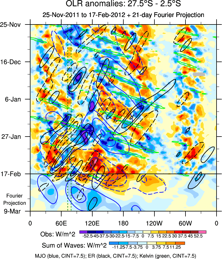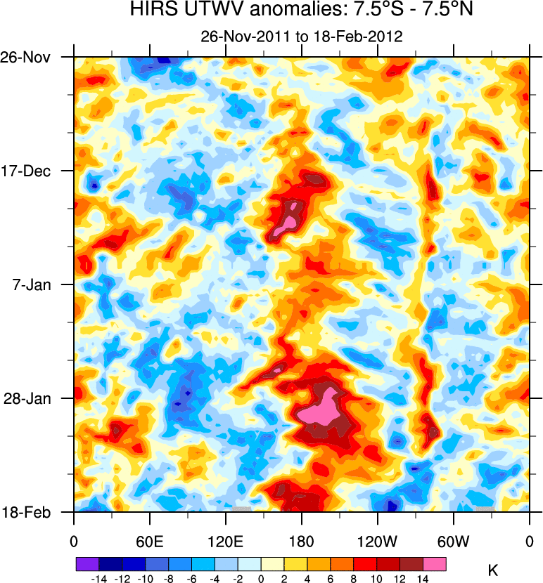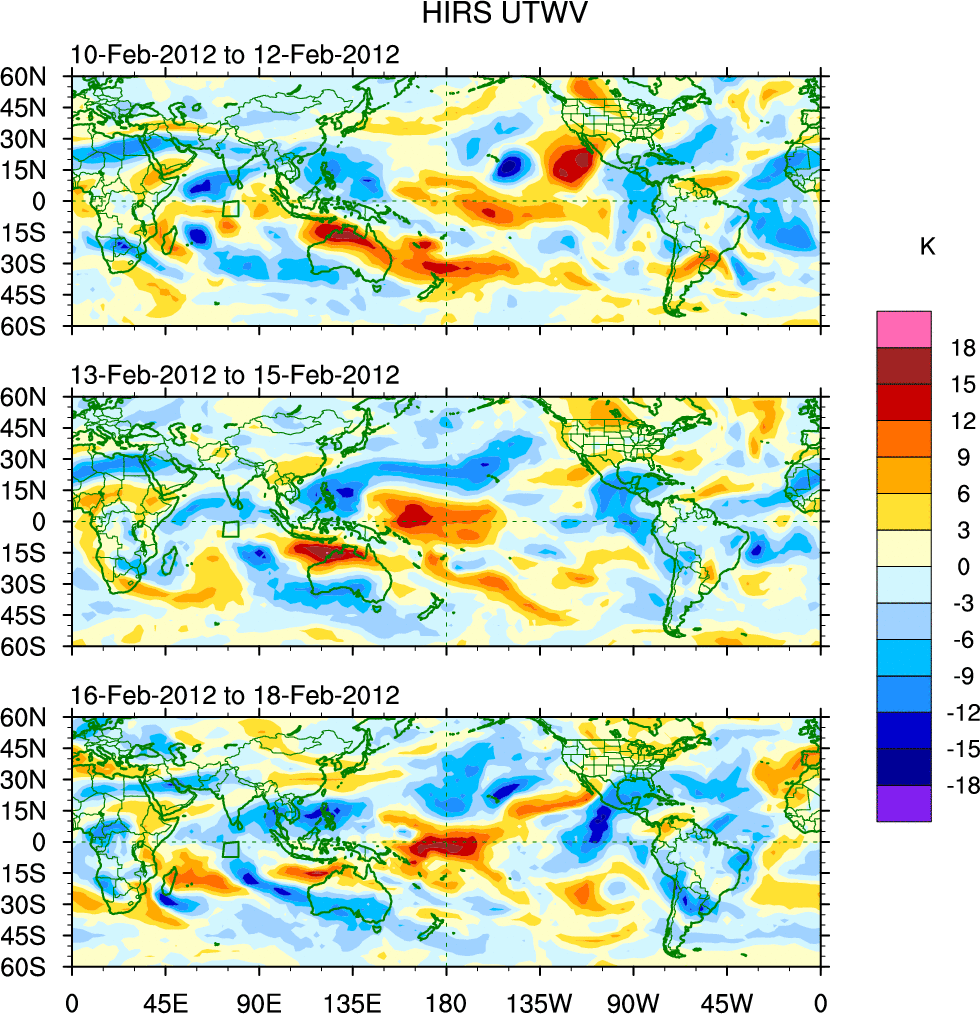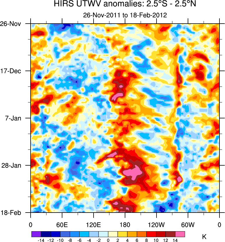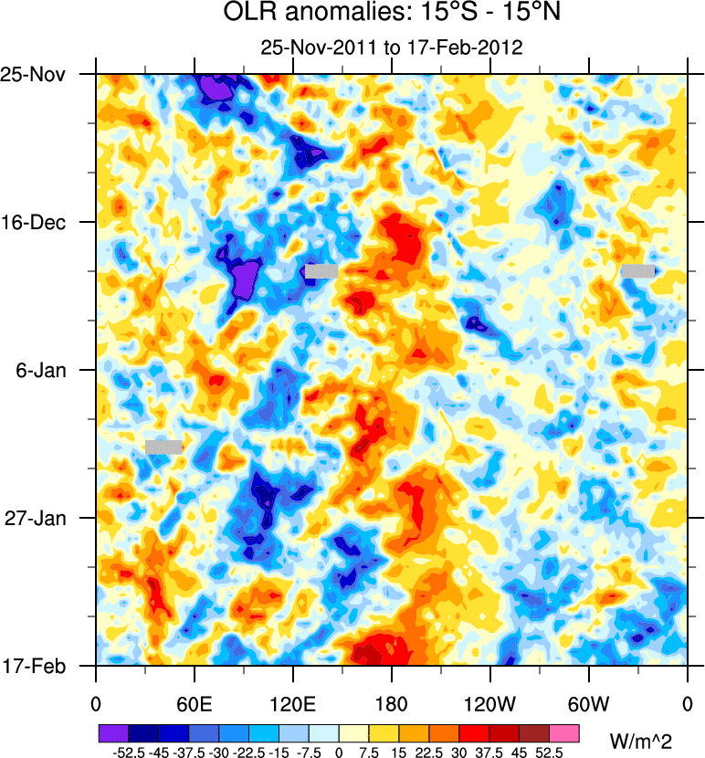 To identify tropical waves in near real-time, the OLR and UTWV data are filtered following Wheeler & Weickmann (2001 MWR). The daily anomalies are calculated using the first 3 harmonics of the seasonal cycle for 1979–2009. Missing values are then filled using linear interpolation in space and time. The most recent 365 days of anomalies are padded with 659 days of zeroes, and the result is filtered for each wave type.