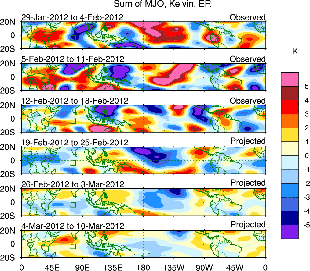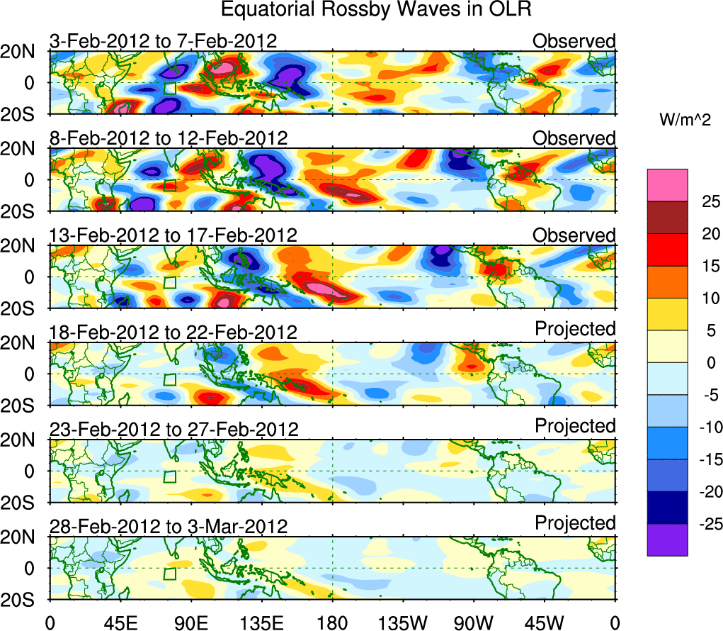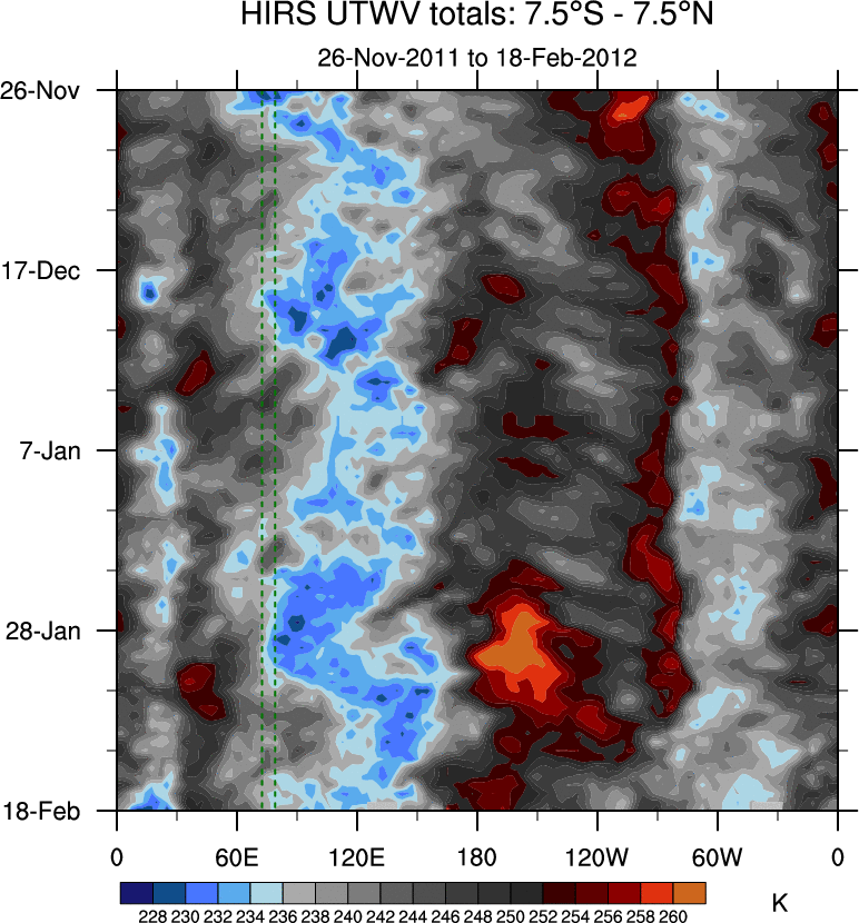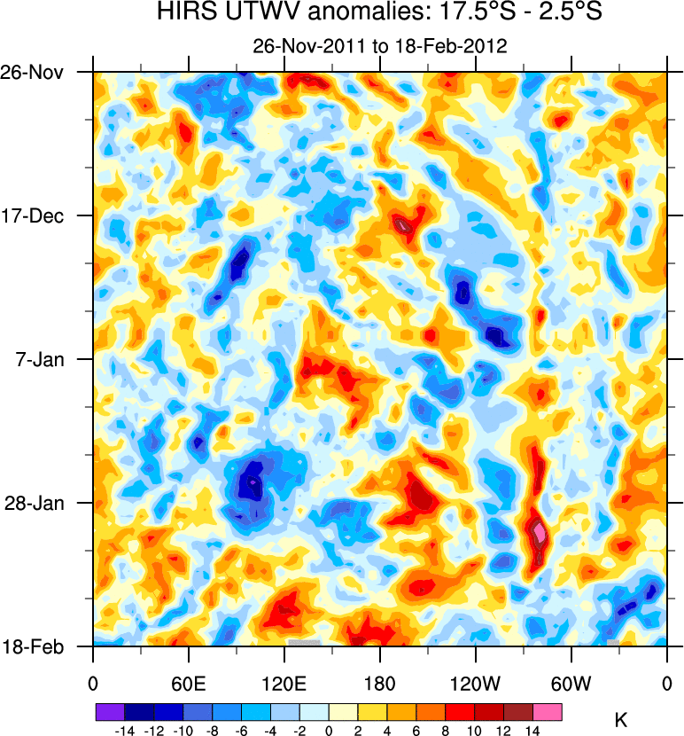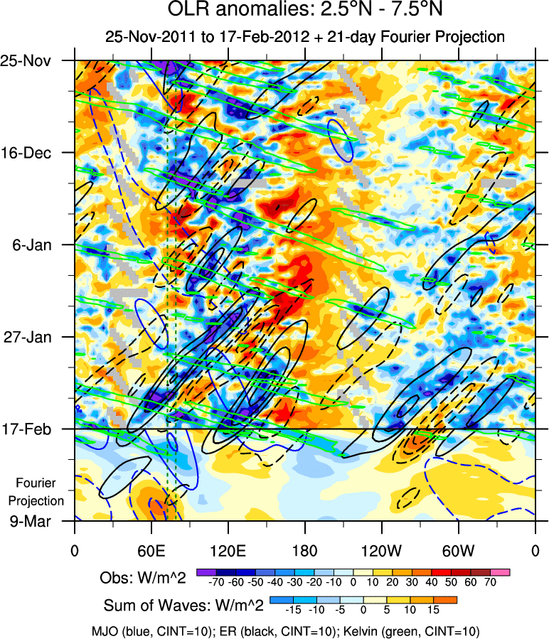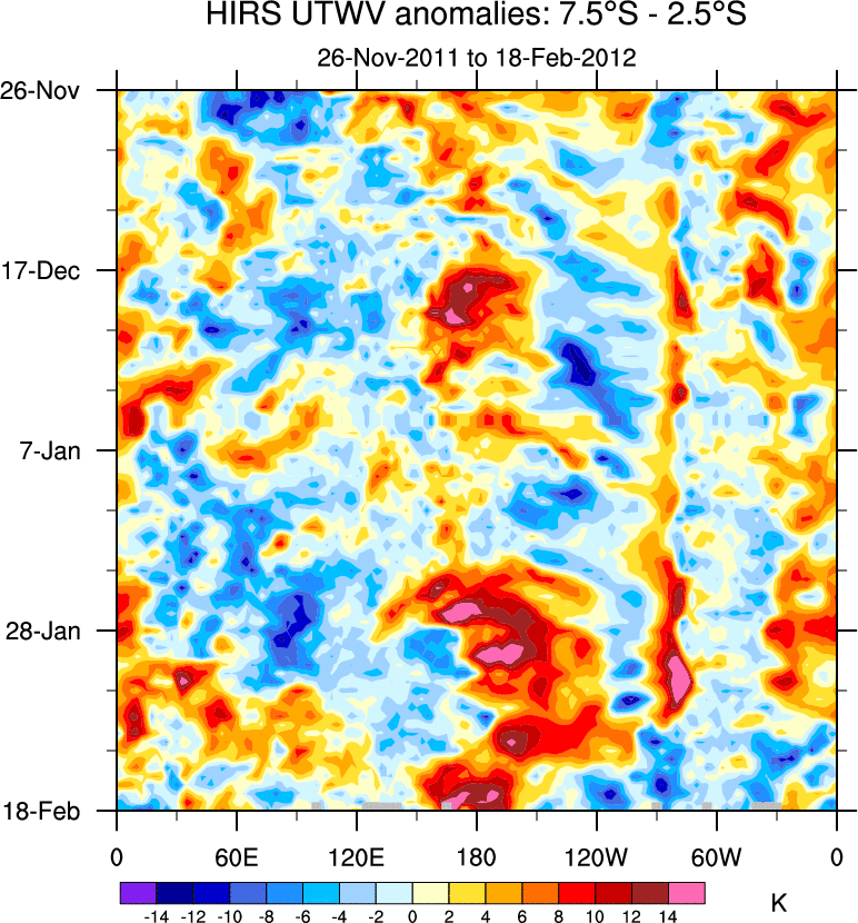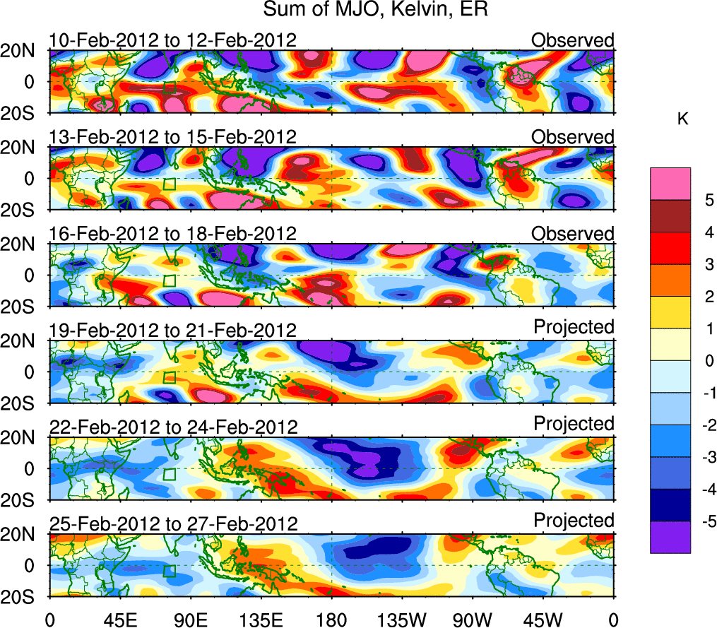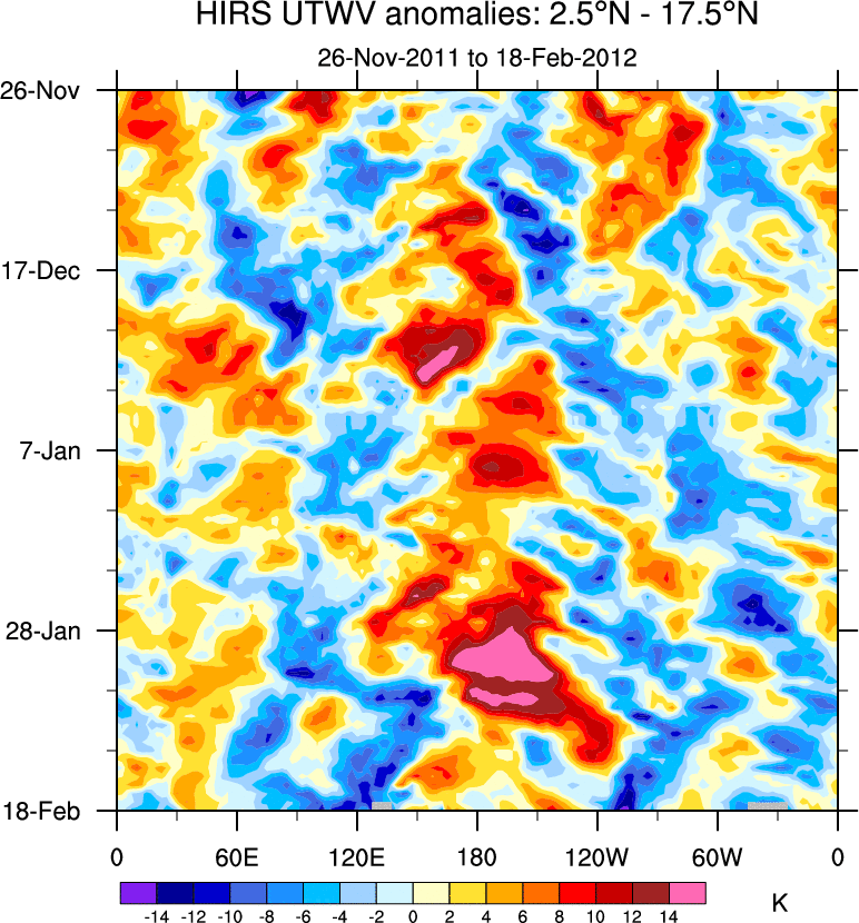To identify tropical waves in near real-time, the OLR and UTWV data are filtered following Wheeler & Weickmann (2001 MWR). The daily anomalies are calculated using the first 3 harmonics of the seasonal cycle for 1979–2009. Missing values are then filled using linear interpolation in space and time. The most recent 365 days of anomalies are padded with 659 days of zeroes, and the result is filtered for each wave type.