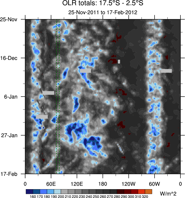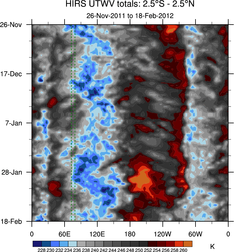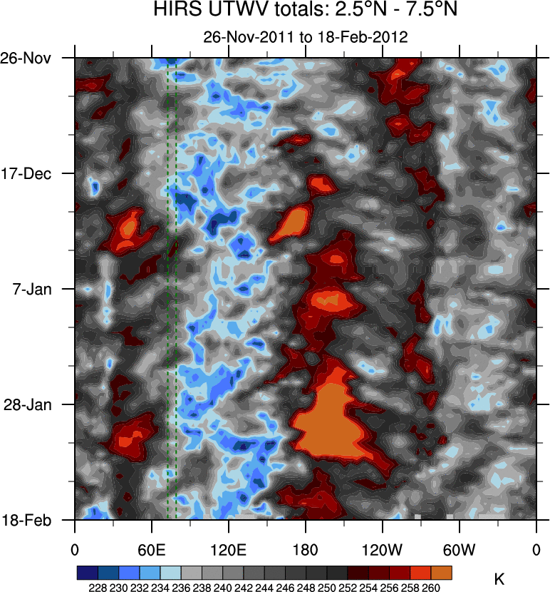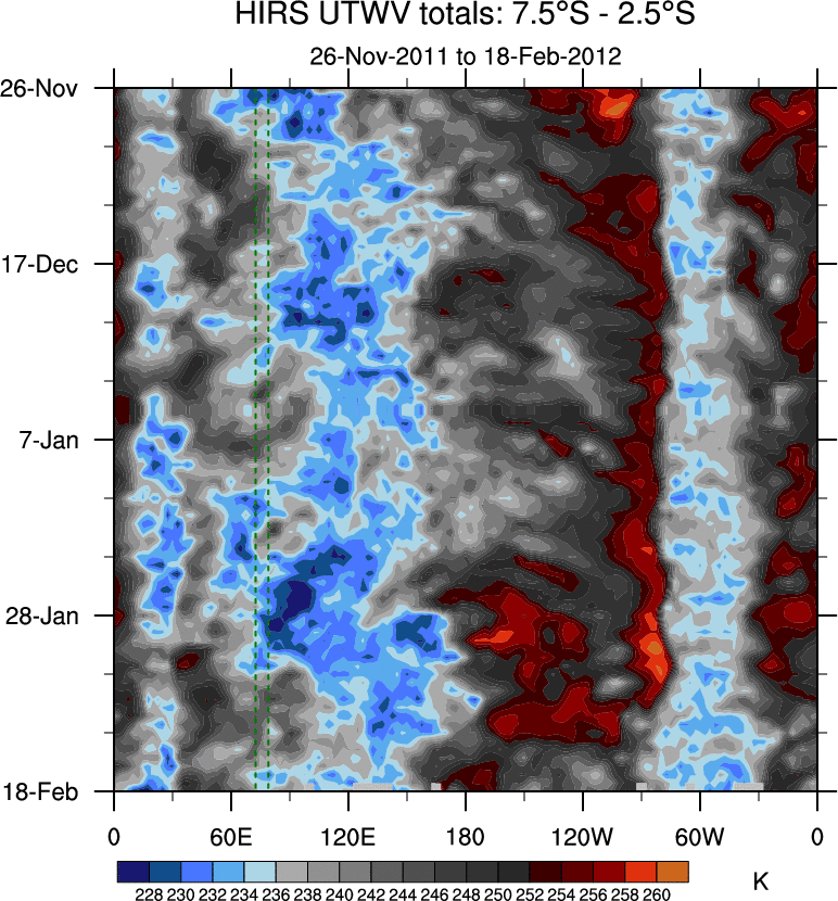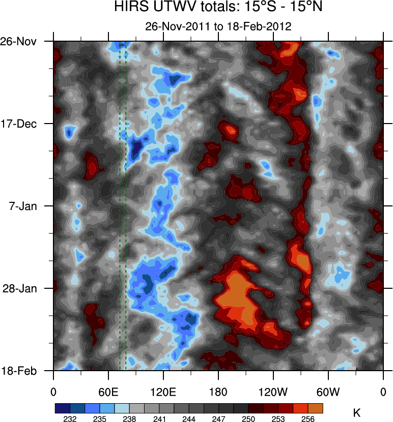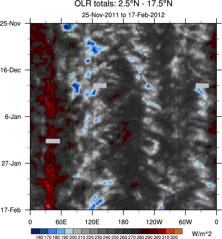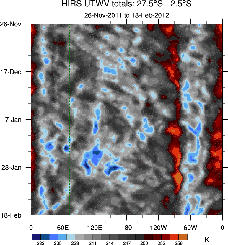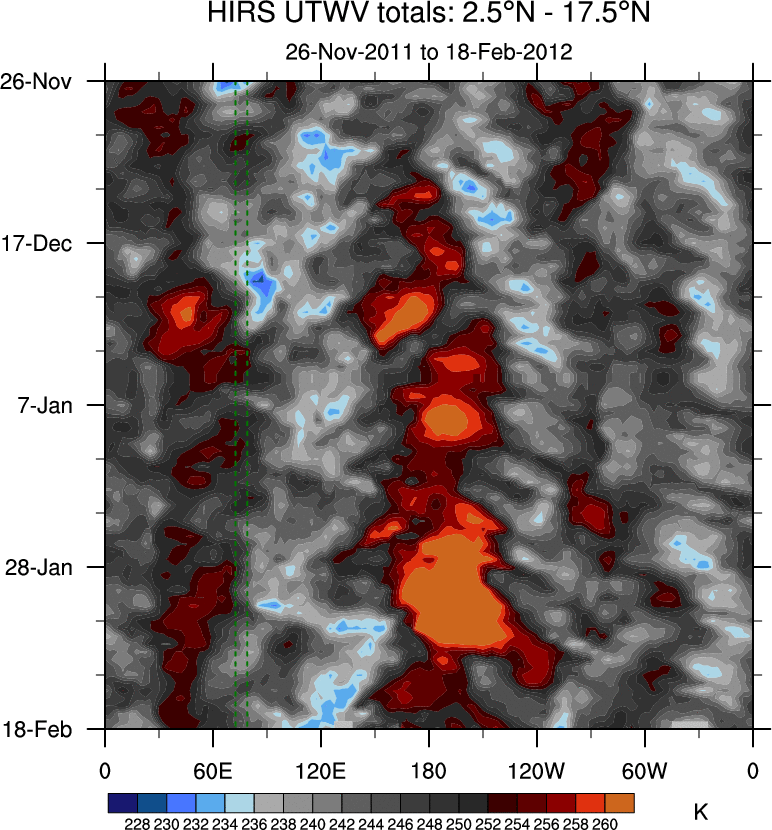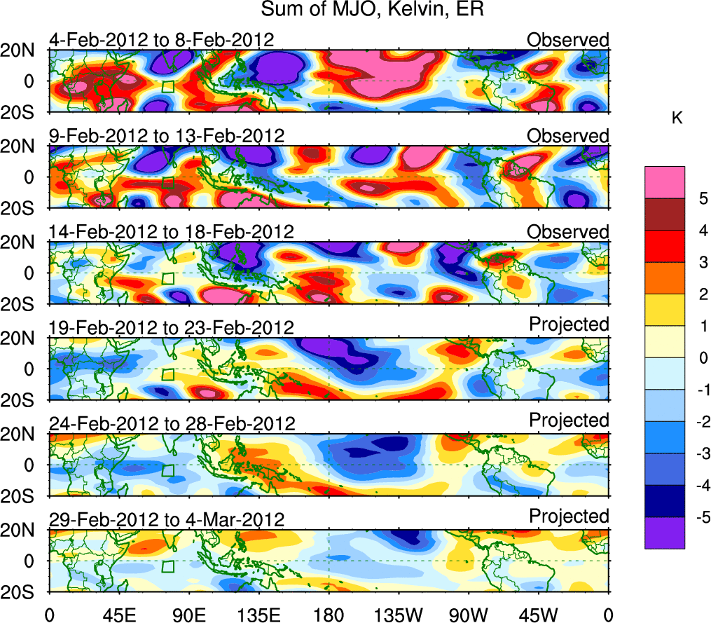 To identify tropical waves in near real-time, the OLR and UTWV data are filtered following Wheeler & Weickmann (2001 MWR). The daily anomalies are calculated using the first 3 harmonics of the seasonal cycle for 1979–2009. Missing values are then filled using linear interpolation in space and time. The most recent 365 days of anomalies are padded with 659 days of zeroes, and the result is filtered for each wave type.
