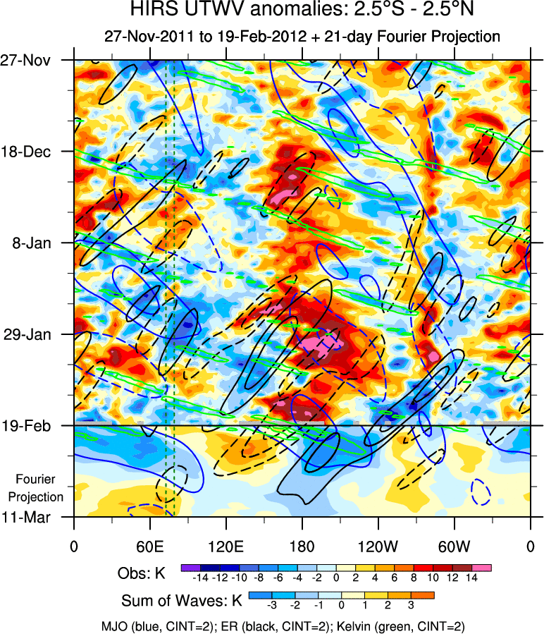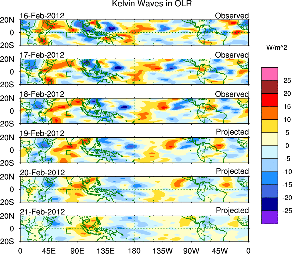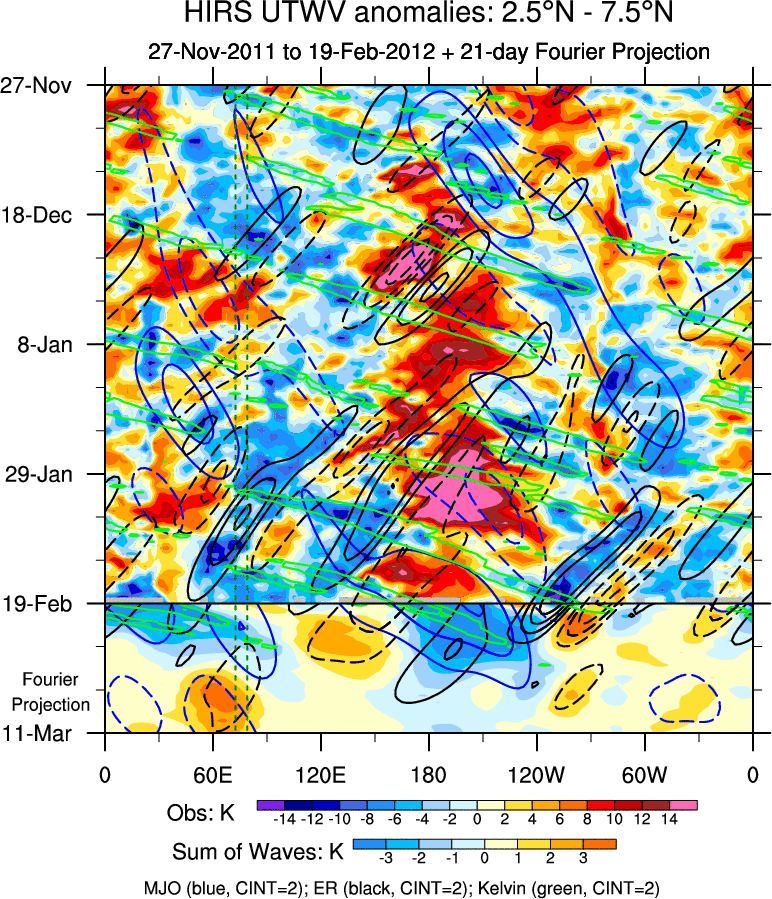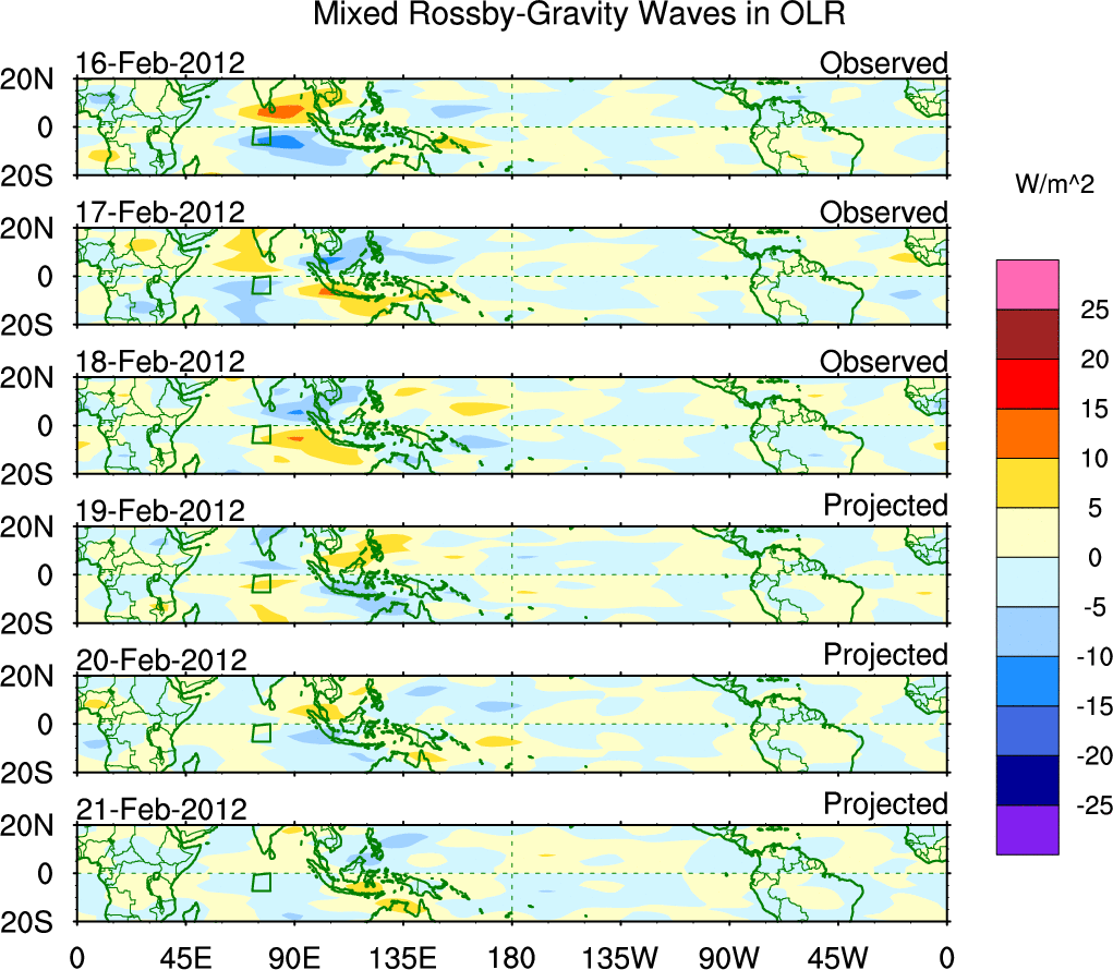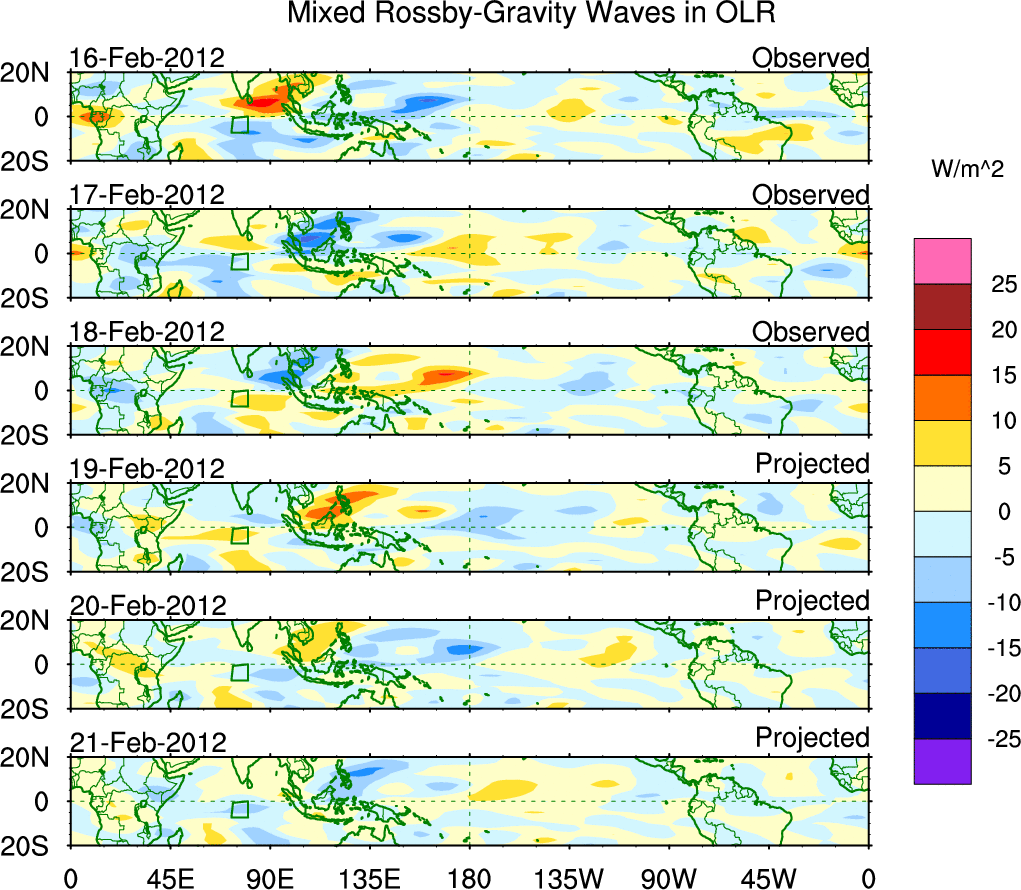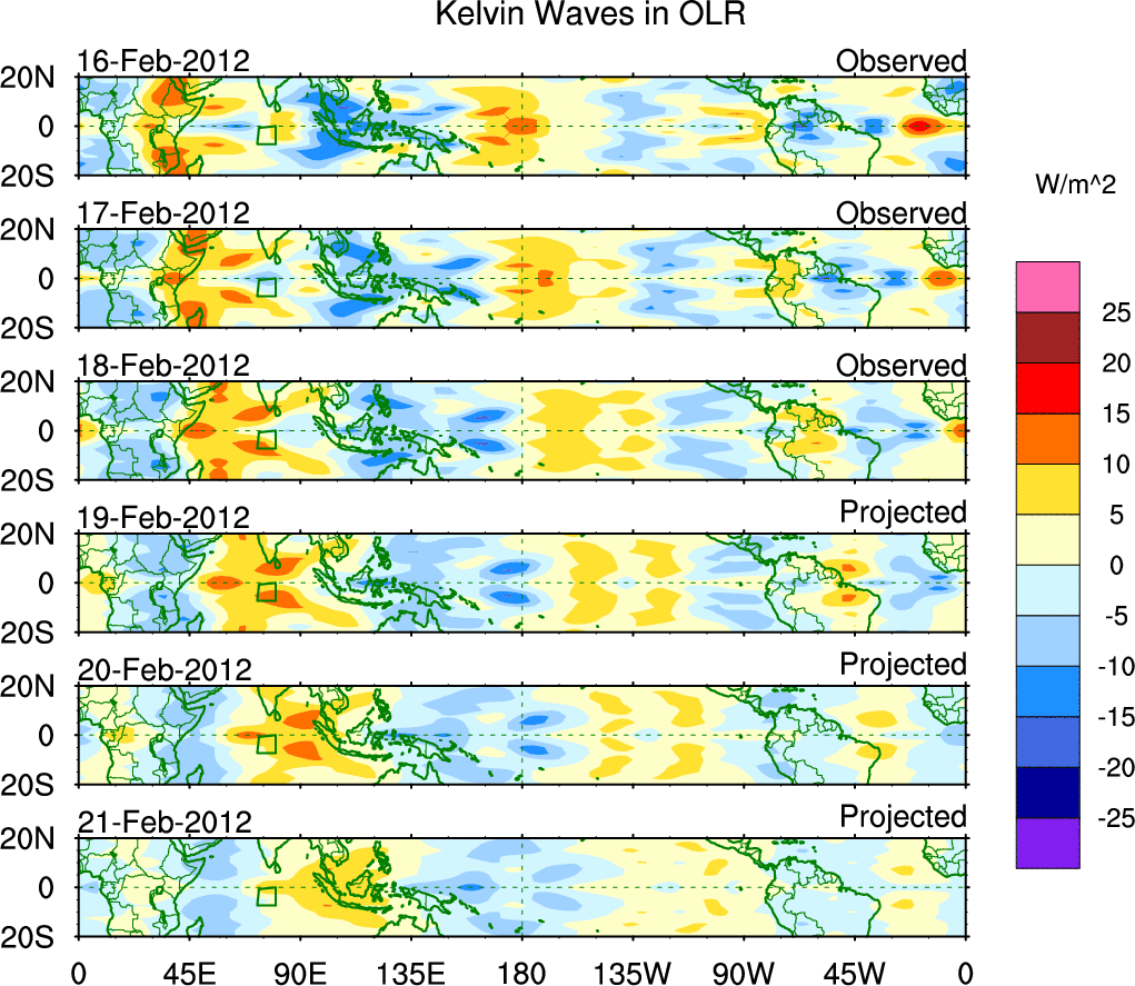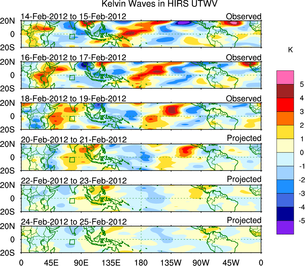 To identify tropical waves in near real-time, the OLR and UTWV data are filtered following Wheeler & Weickmann (2001 MWR). The daily anomalies are calculated using the first 3 harmonics of the seasonal cycle for 1979–2009. Missing values are then filled using linear interpolation in space and time. The most recent 365 days of anomalies are padded with 659 days of zeroes, and the result is filtered for each wave type.