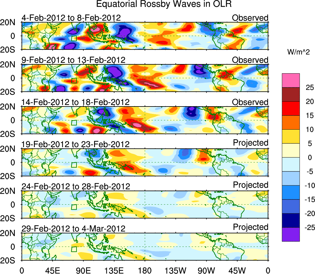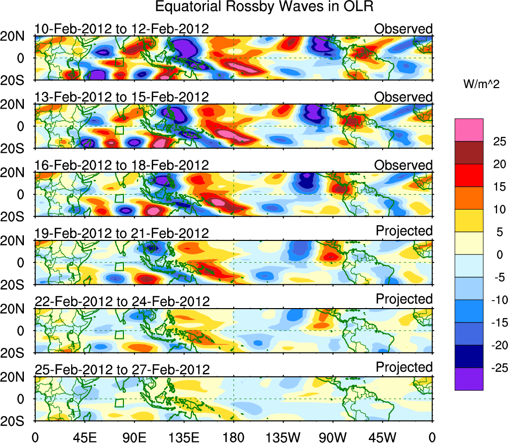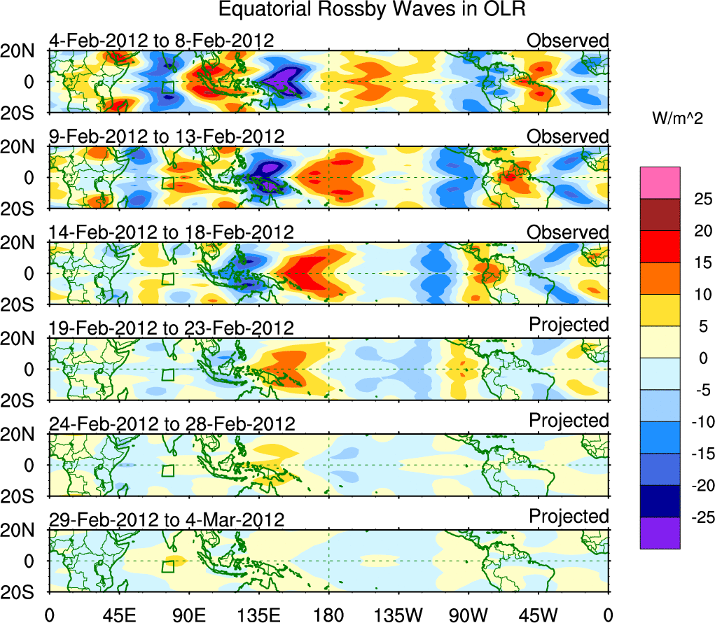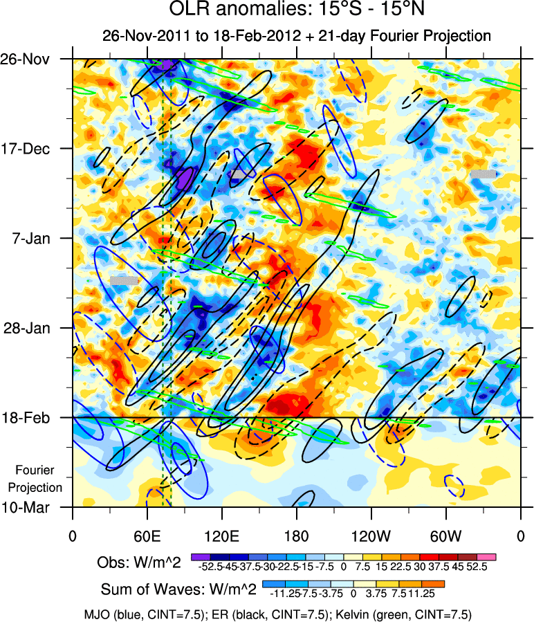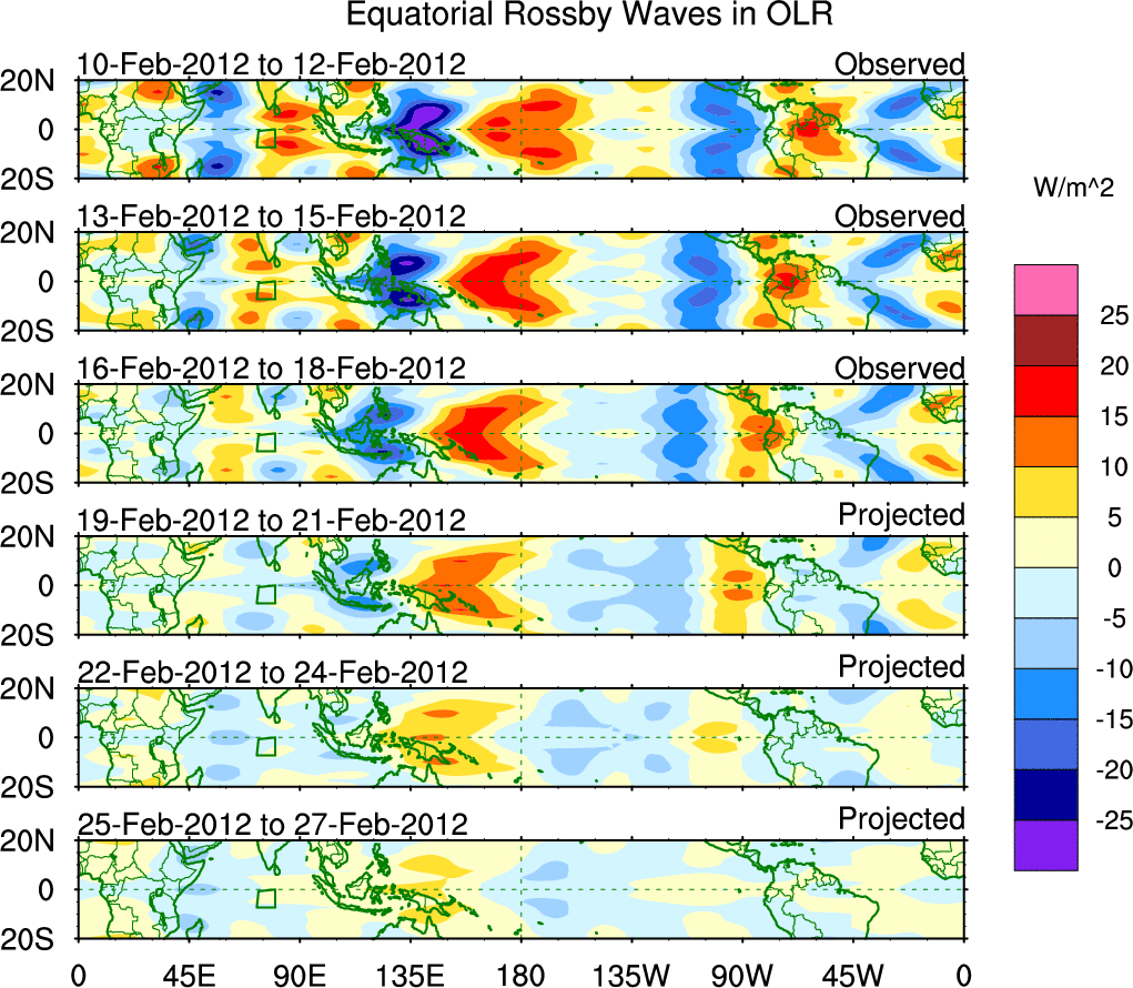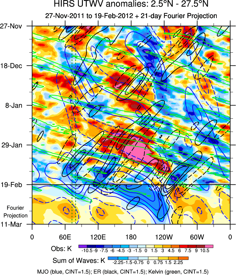 To identify tropical waves in near real-time, the OLR and UTWV data are filtered following Wheeler & Weickmann (2001 MWR). The daily anomalies are calculated using the first 3 harmonics of the seasonal cycle for 1979–2009. Missing values are then filled using linear interpolation in space and time. The most recent 365 days of anomalies are padded with 659 days of zeroes, and the result is filtered for each wave type.
