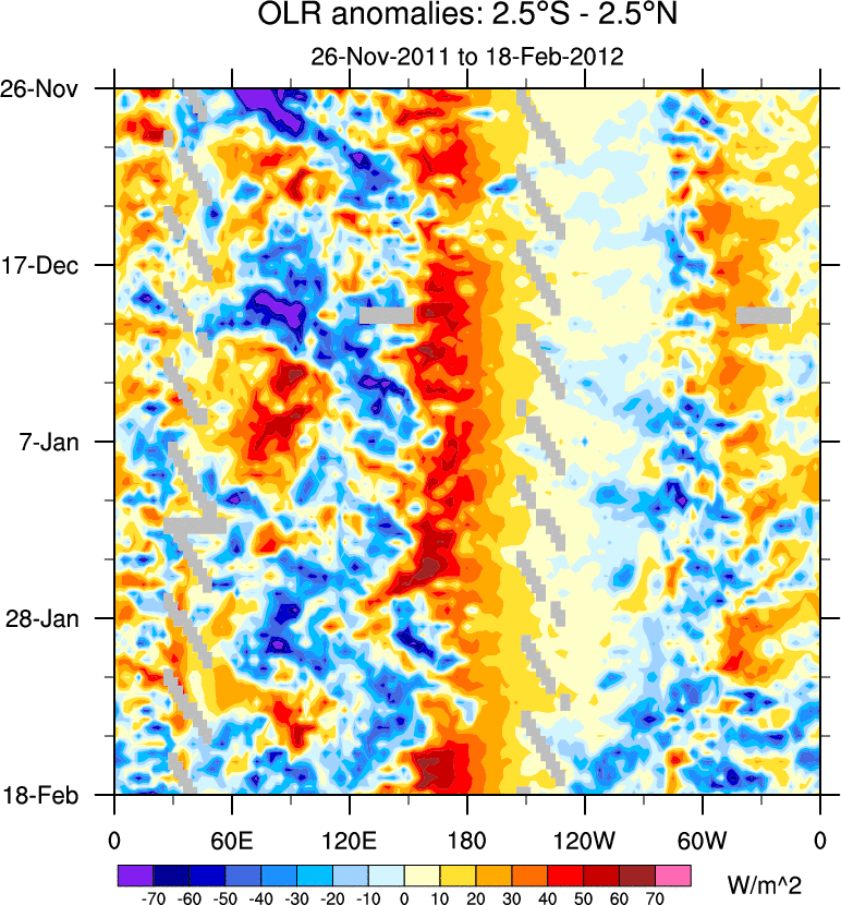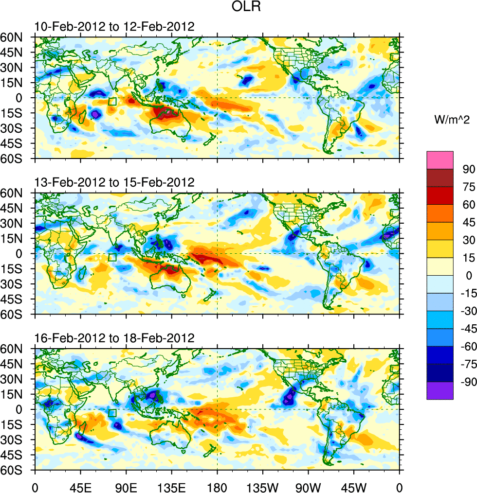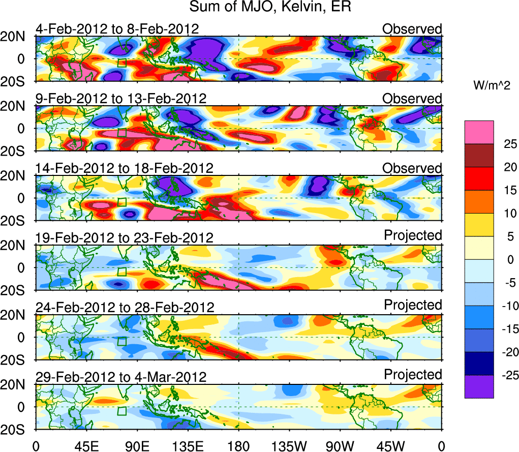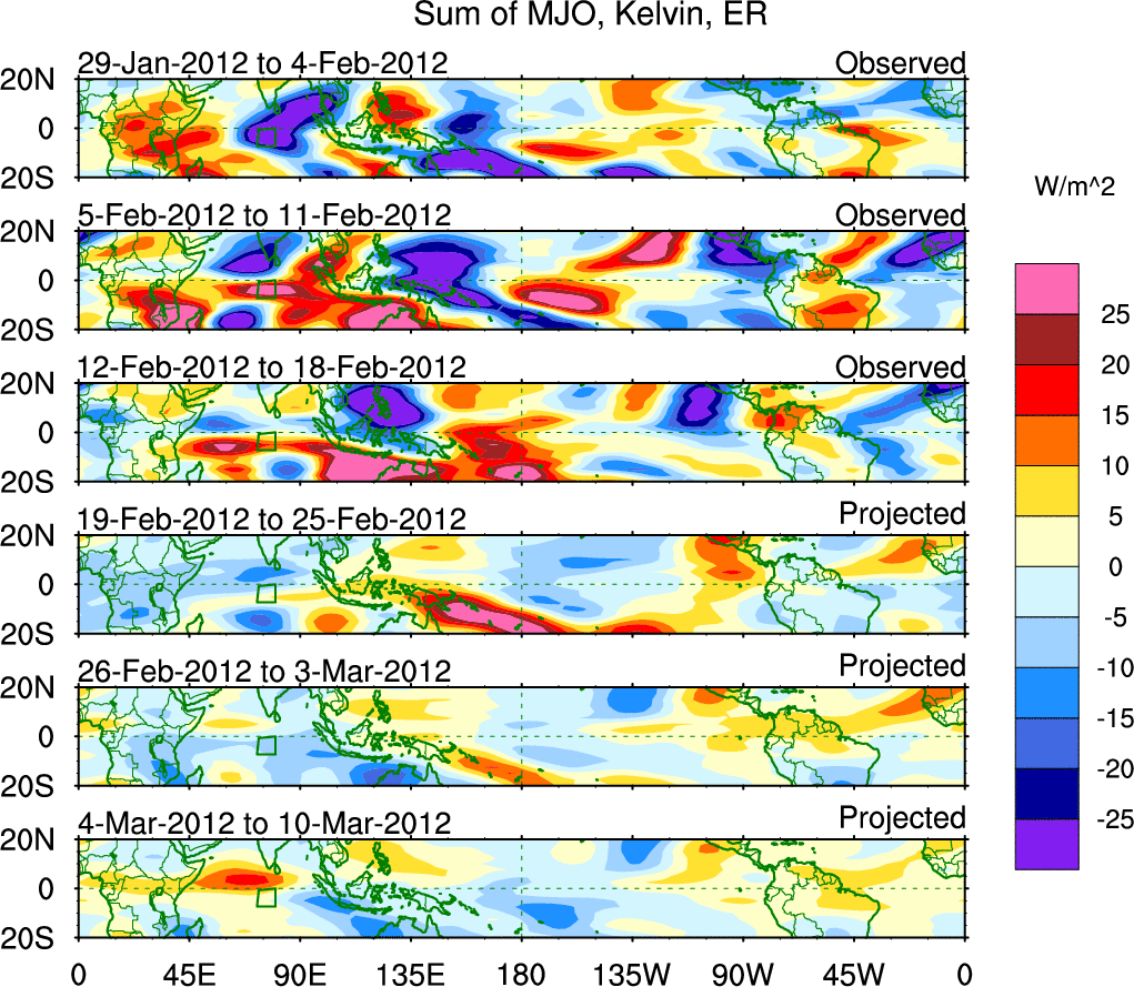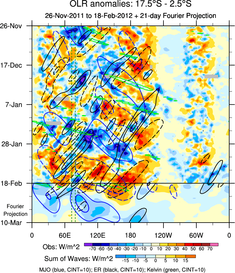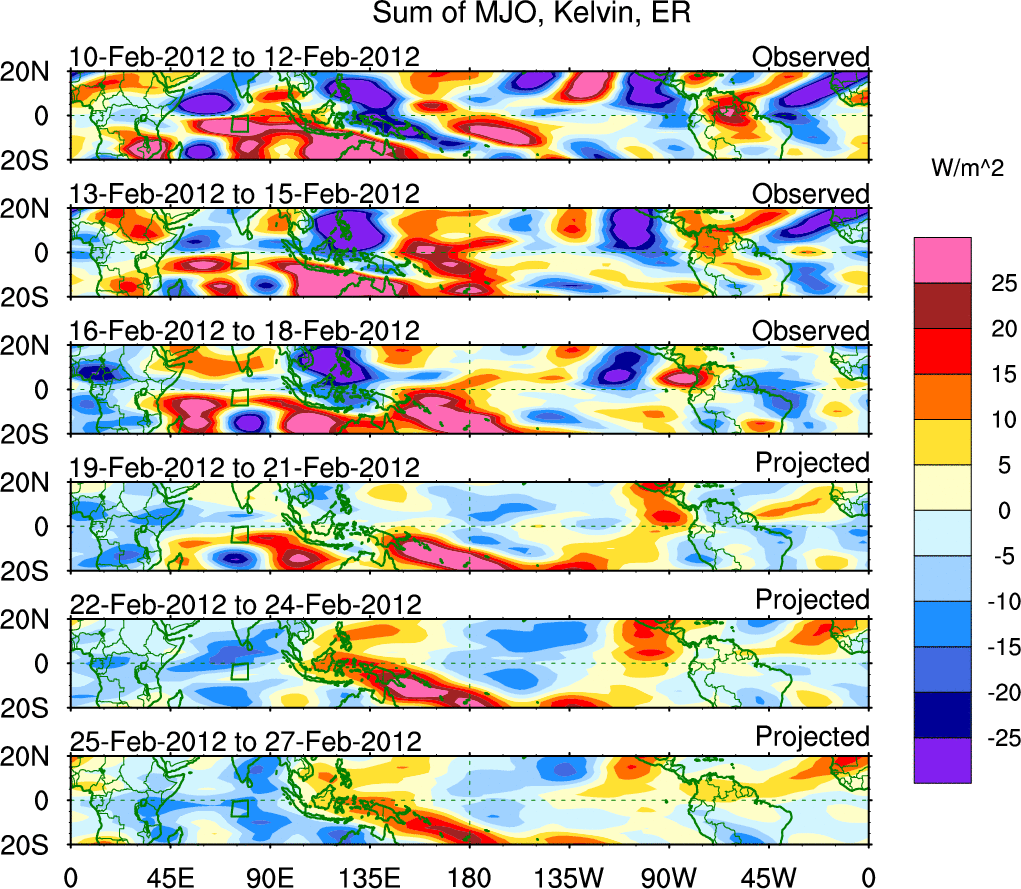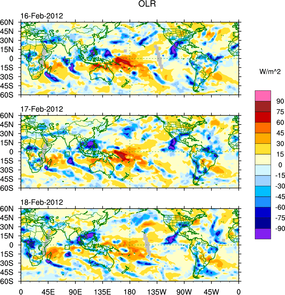 To identify tropical waves in near real-time, the OLR and UTWV data are filtered following Wheeler & Weickmann (2001 MWR). The daily anomalies are calculated using the first 3 harmonics of the seasonal cycle for 1979–2009. Missing values are then filled using linear interpolation in space and time. The most recent 365 days of anomalies are padded with 659 days of zeroes, and the result is filtered for each wave type.