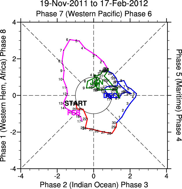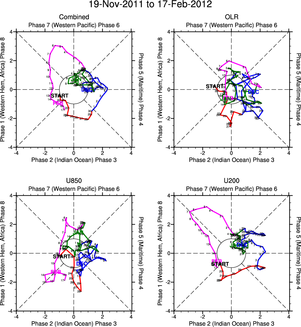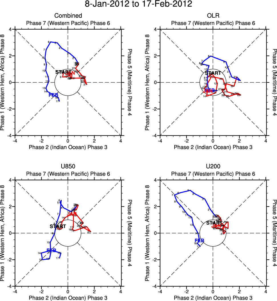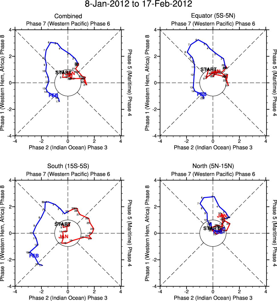 Wheeler and Hendon (2004) constructed the RMM index for monitoring the MJO. This index consists of the first two principal components (PCs) of OLR, 850-hPa zonal wind, and 200-hPa zonal wind averaged 15S-15N.