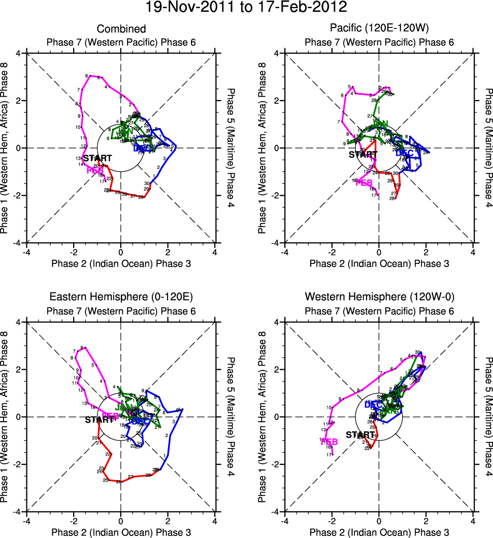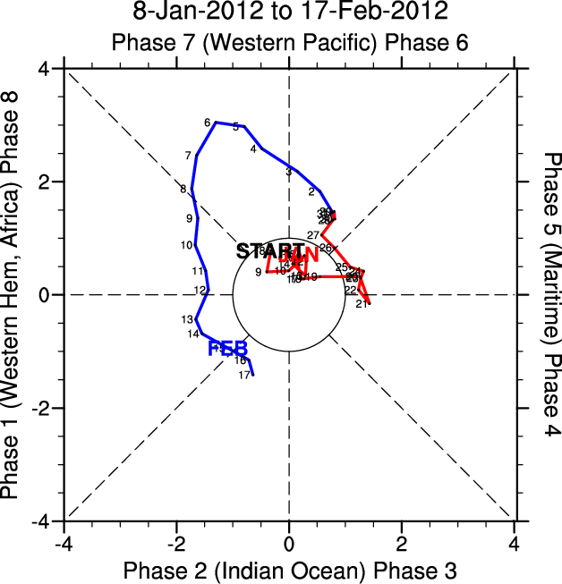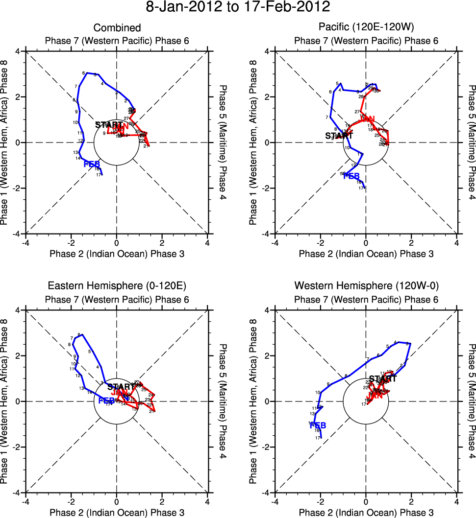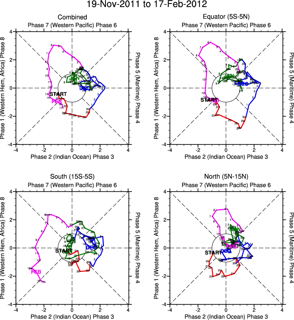 Wheeler and Hendon (2004) constructed the RMM index for monitoring the MJO. This index consists of the first two principal components (PCs) of OLR, 850-hPa zonal wind, and 200-hPa zonal wind averaged 15S-15N.