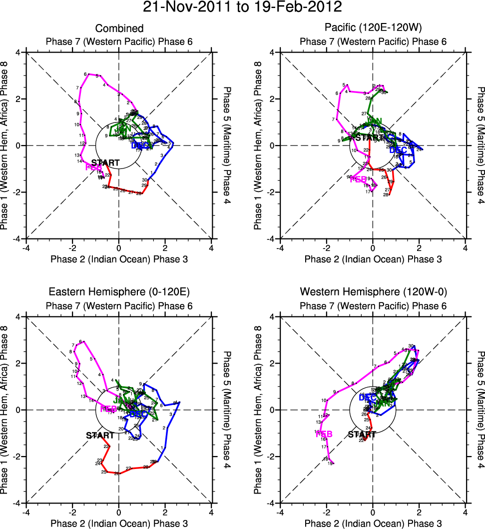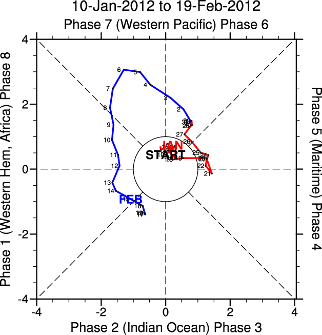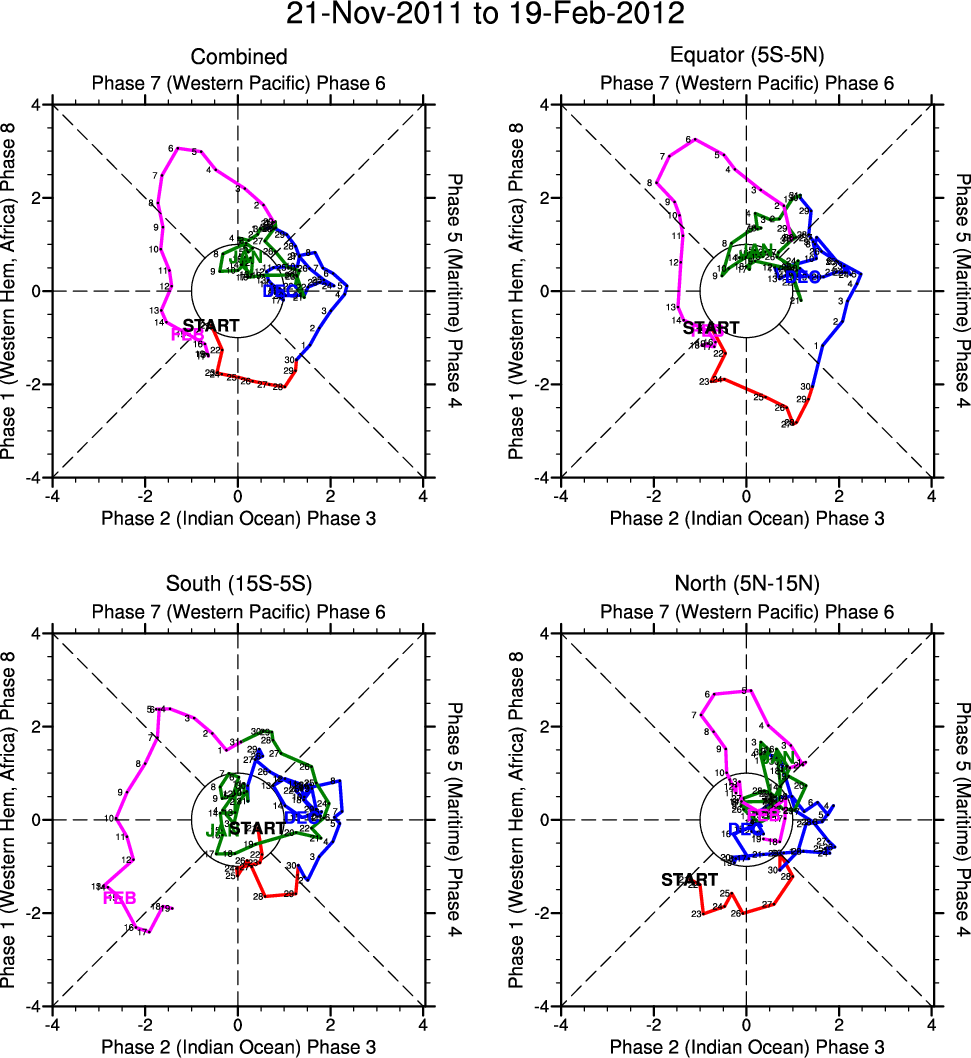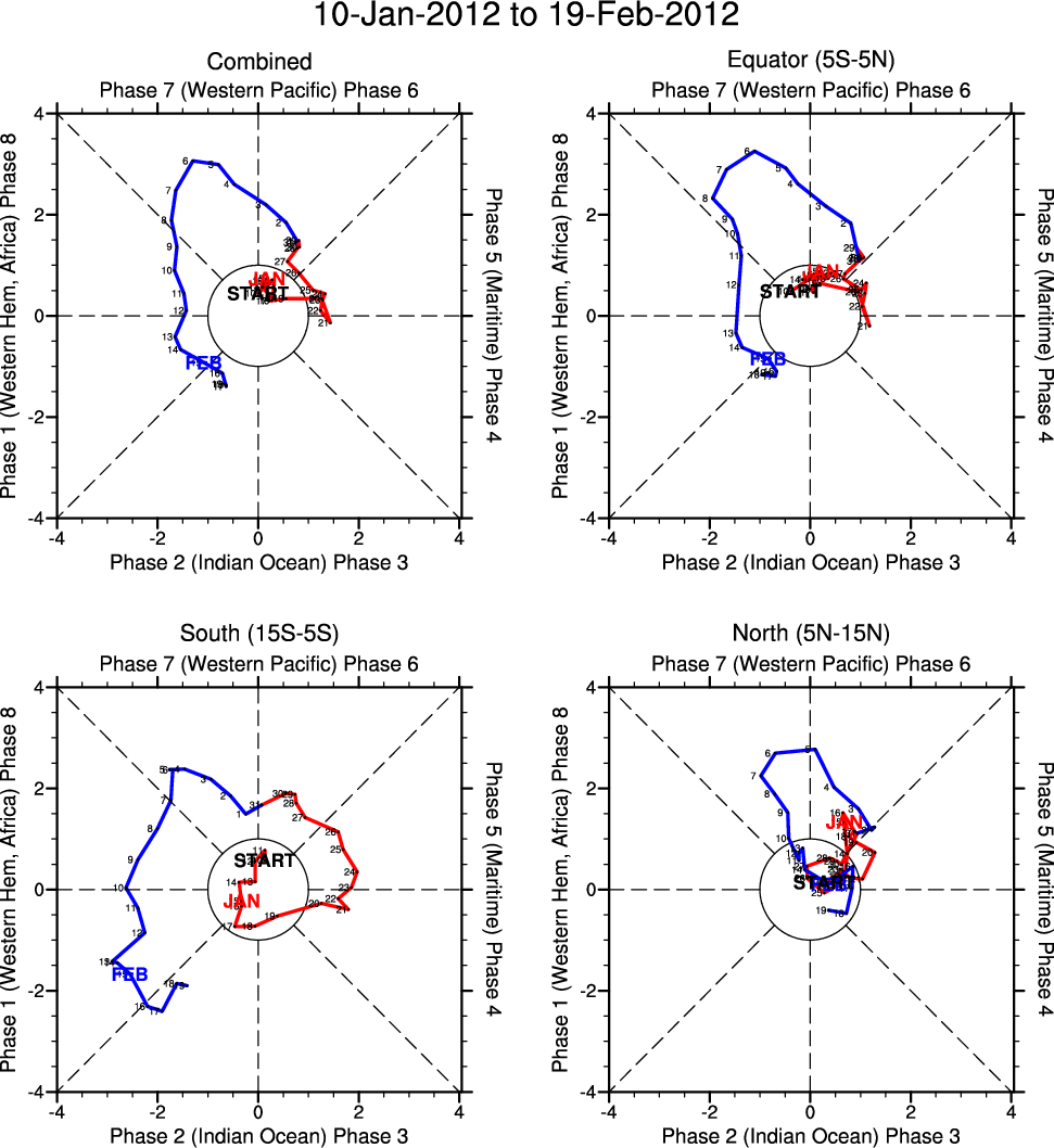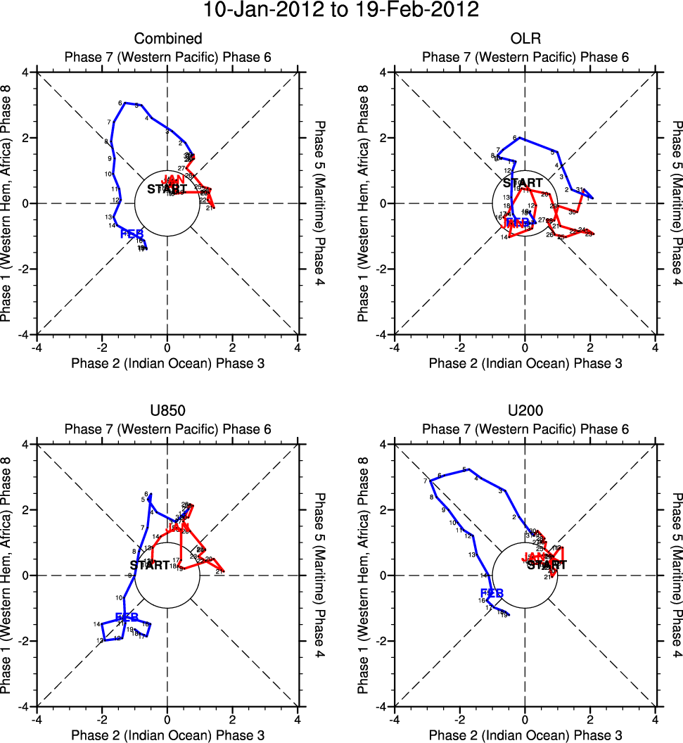 Wheeler and Hendon (2004) constructed the RMM index for monitoring the MJO. This index consists of the first two principal components (PCs) of OLR, 850-hPa zonal wind, and 200-hPa zonal wind averaged 15S-15N.